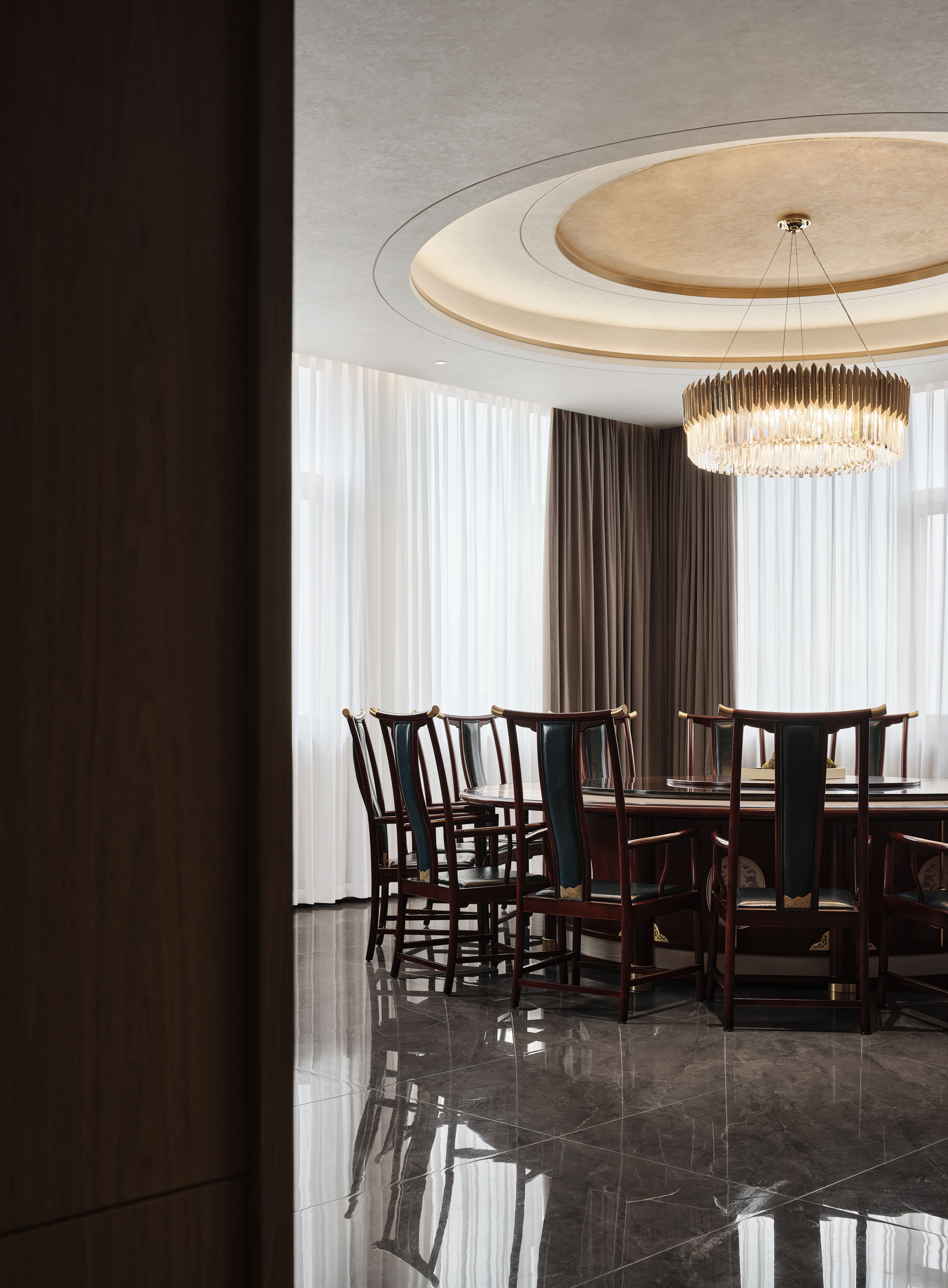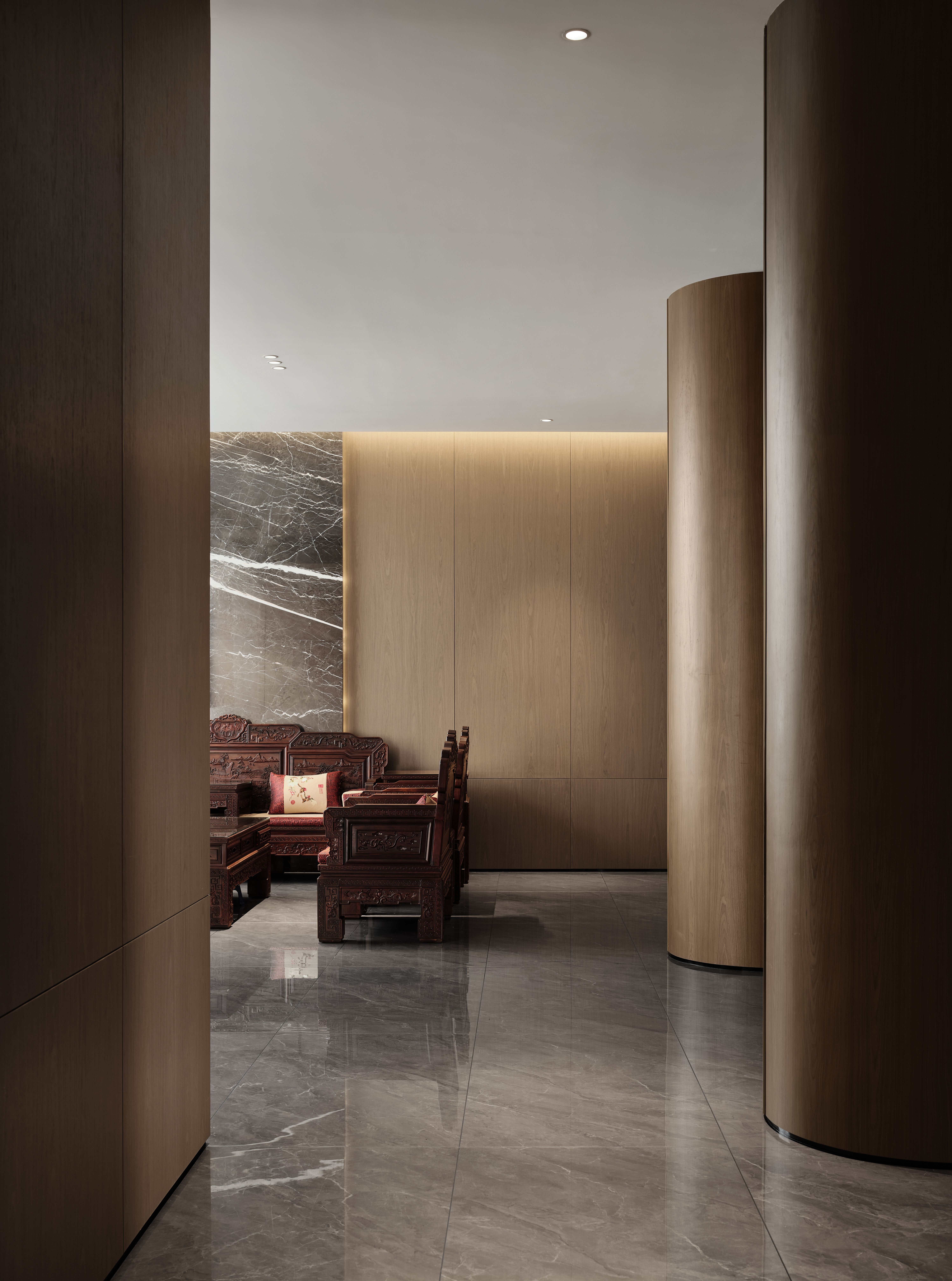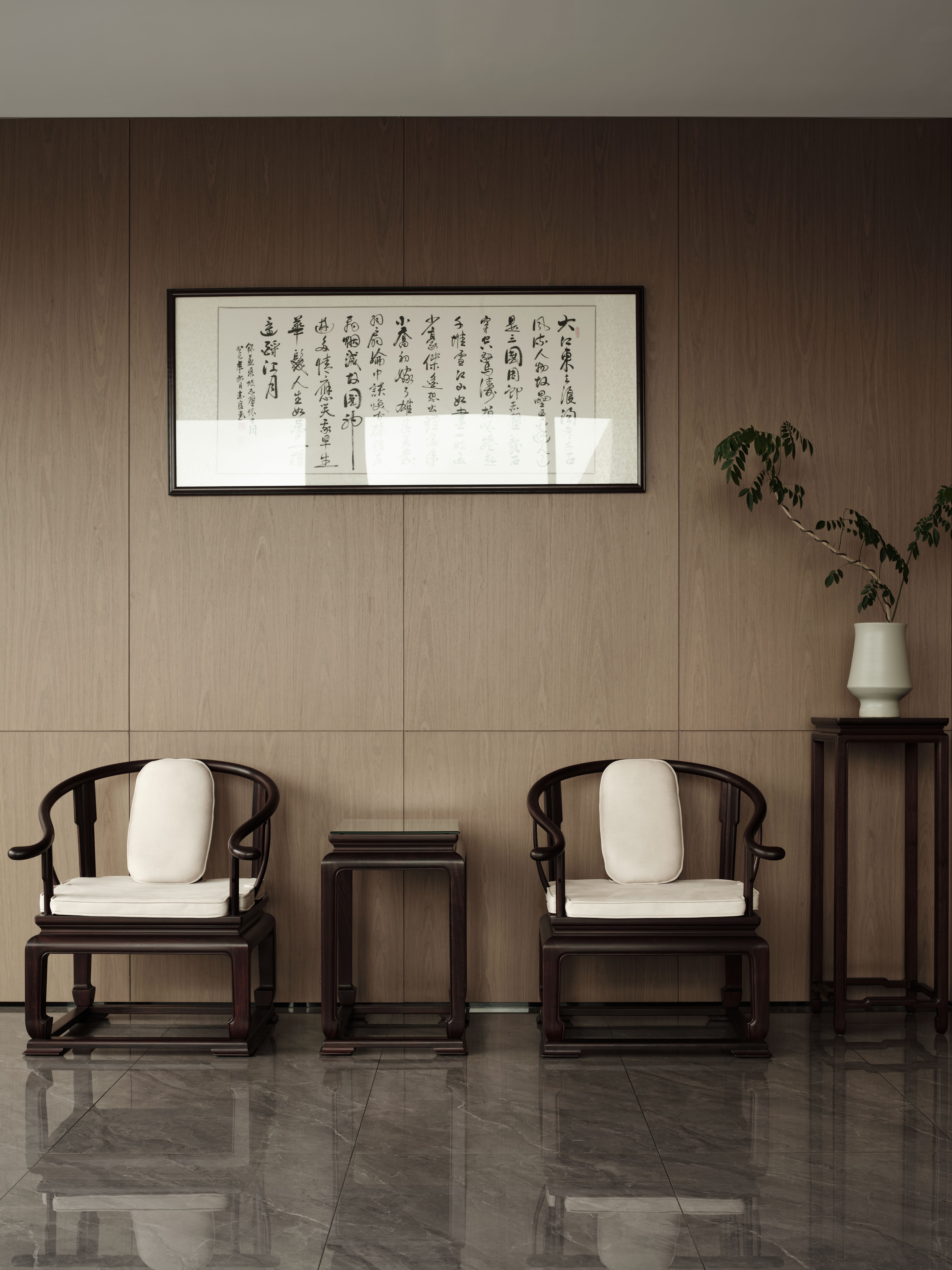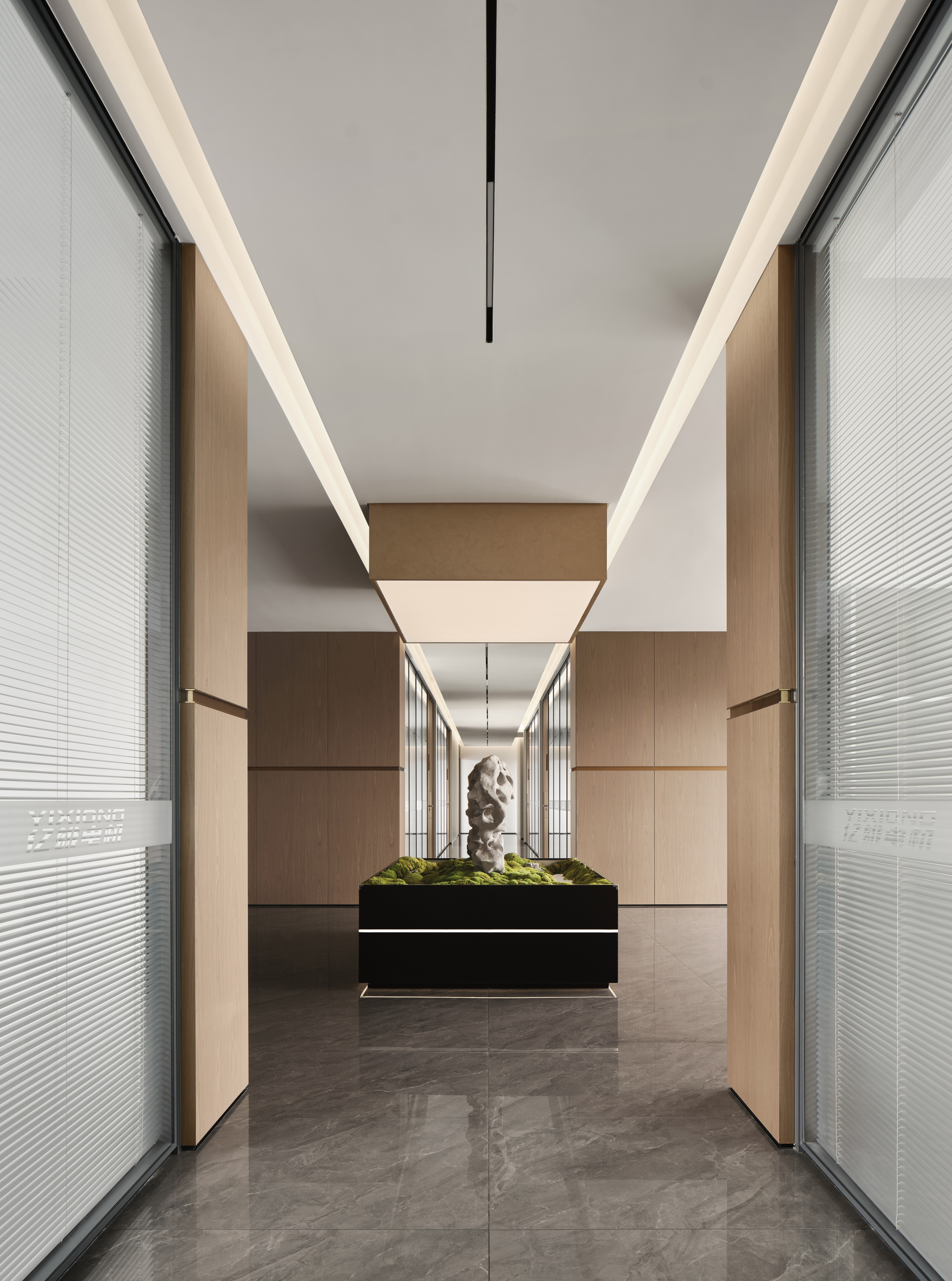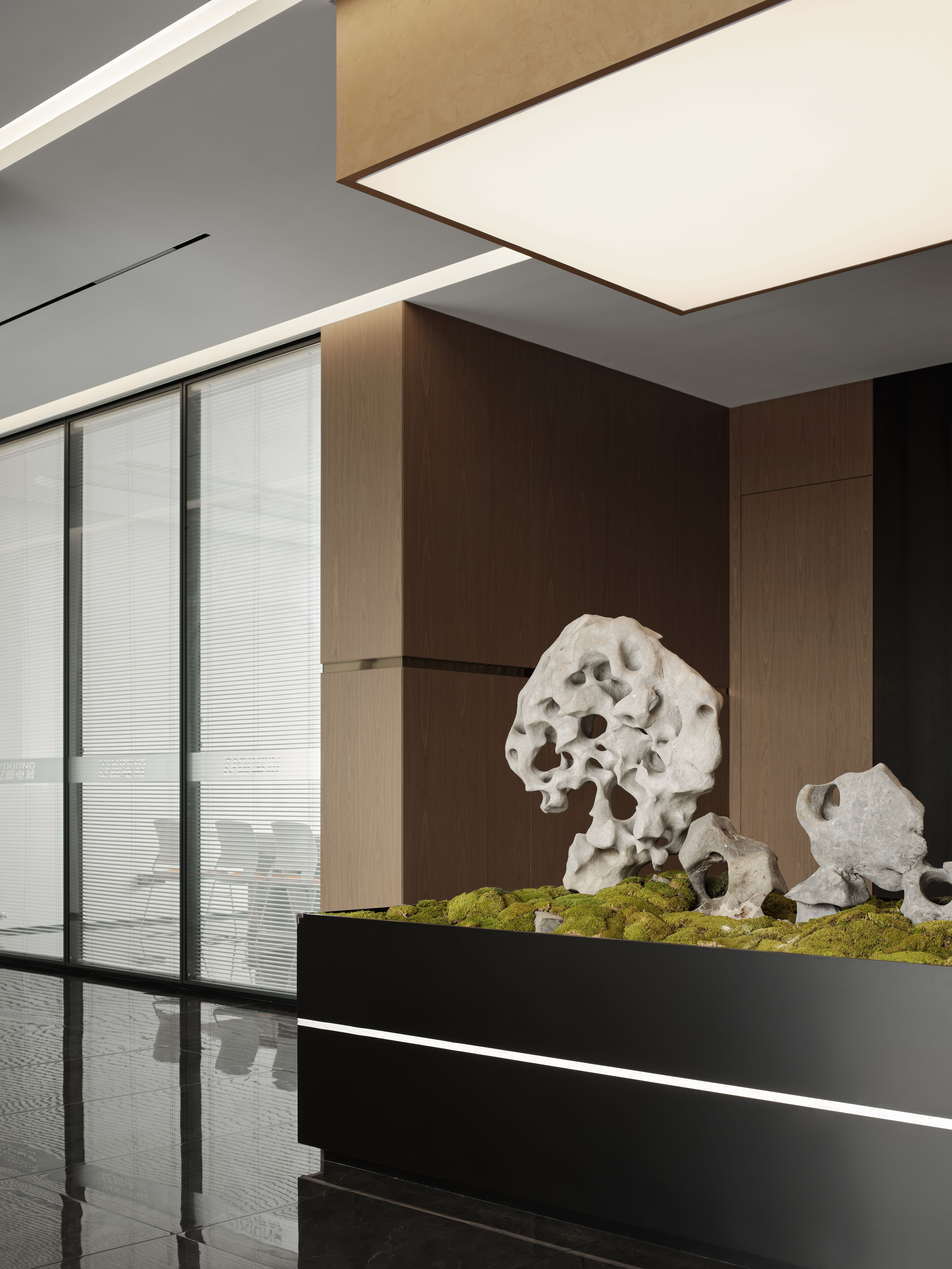 秉承中式美学的本真,对亿雄电机顶层的办公空间和会所进行设计,运用对称、移步、借景等手法,将本案打造成为企业社交聚集所以及房主的精神休憩首选地。穿过庭院,便到室内。设计师用大面积落地玻璃窗过滤光影,将空间内外进行分隔。同时,将中式园林中的对景和移步一景的视觉效果结合到室内,让人有种身在内里,眼望自然的意境。大堂的“石如意”正对水池,以细节取意山水秀雅,亦传递着和美平安的美好寓意。太师椅对称摆放,基于“阴阳平衡”的思想观念,端正肃穆。淡咖色原木材质的护墙随着视线延升,木合玉之温润,散发出内敛含蓄的东方情致。循迹入里,穿过员工的办公区域。在每个空间衔接处,安排对称小景进行自然过渡,为整体的空间景色增添了层次,也消融了边界。枯木花枝,灵境清幽,几笔勾勒,中式质朴之美油然而生。餐区的墙面使用红色涂料和大吊灯平衡些许沉闷感,包间同样使用成套的中式家具,细节呈现高规格的宴请标准,在飨宴中品味高雅和经典。主办公区域涵盖了茶室、接待等功能,厚重的沙发和轻盈的茶室,互为景致也互不打扰,完成不同情况下的接待洽谈功能。茶室临窗而设,薄薄的窗纱,半遮半掩;见天地,显山水,中式灵韵自在眼前。私人办公间的摆设陈列,干净利落且简约大方。背景的群山,呼之欲出,舍弃繁奢装饰,只留自然之美。简约天地中,坐拥阅尽浮沉背后的平静回归。