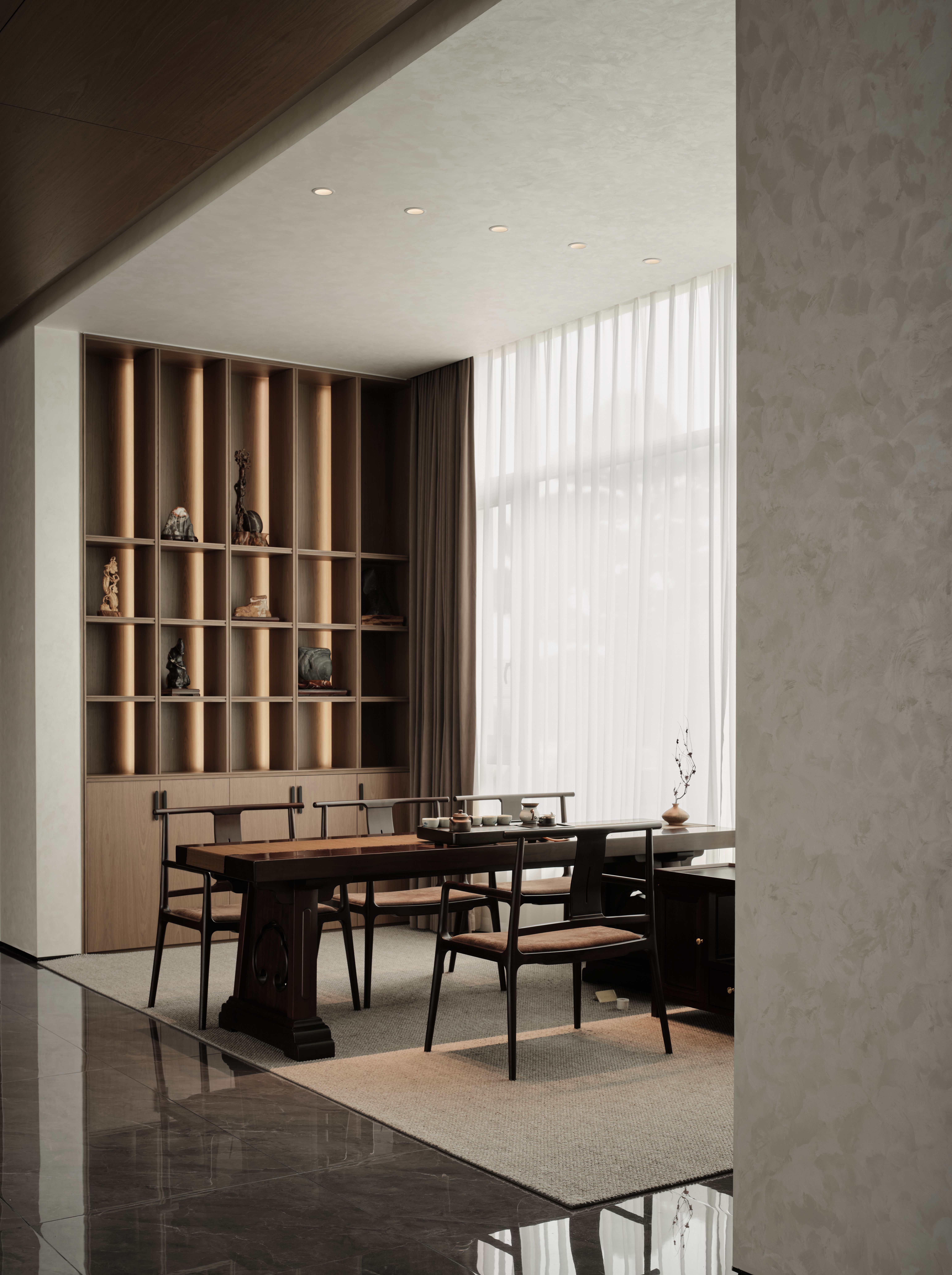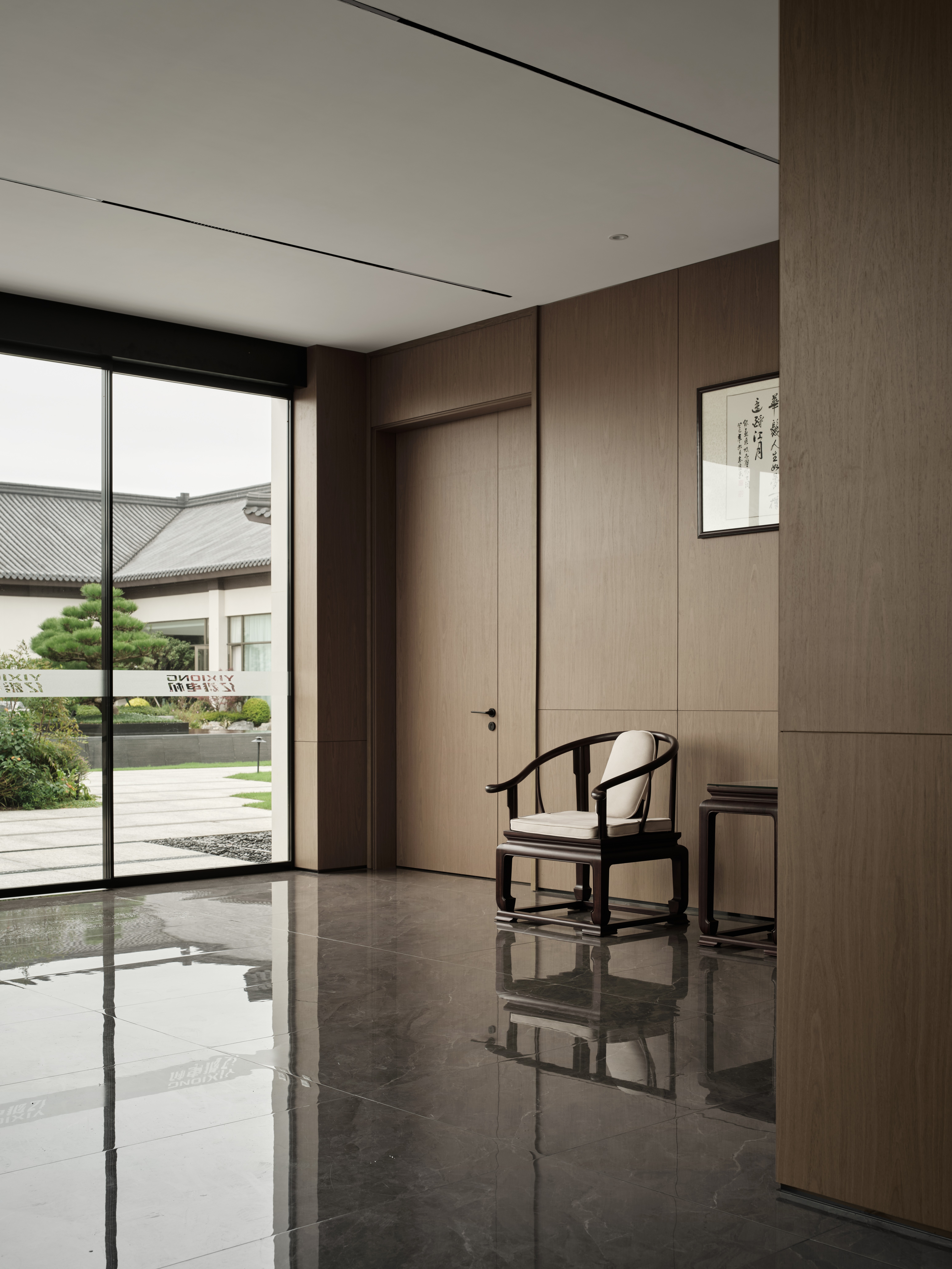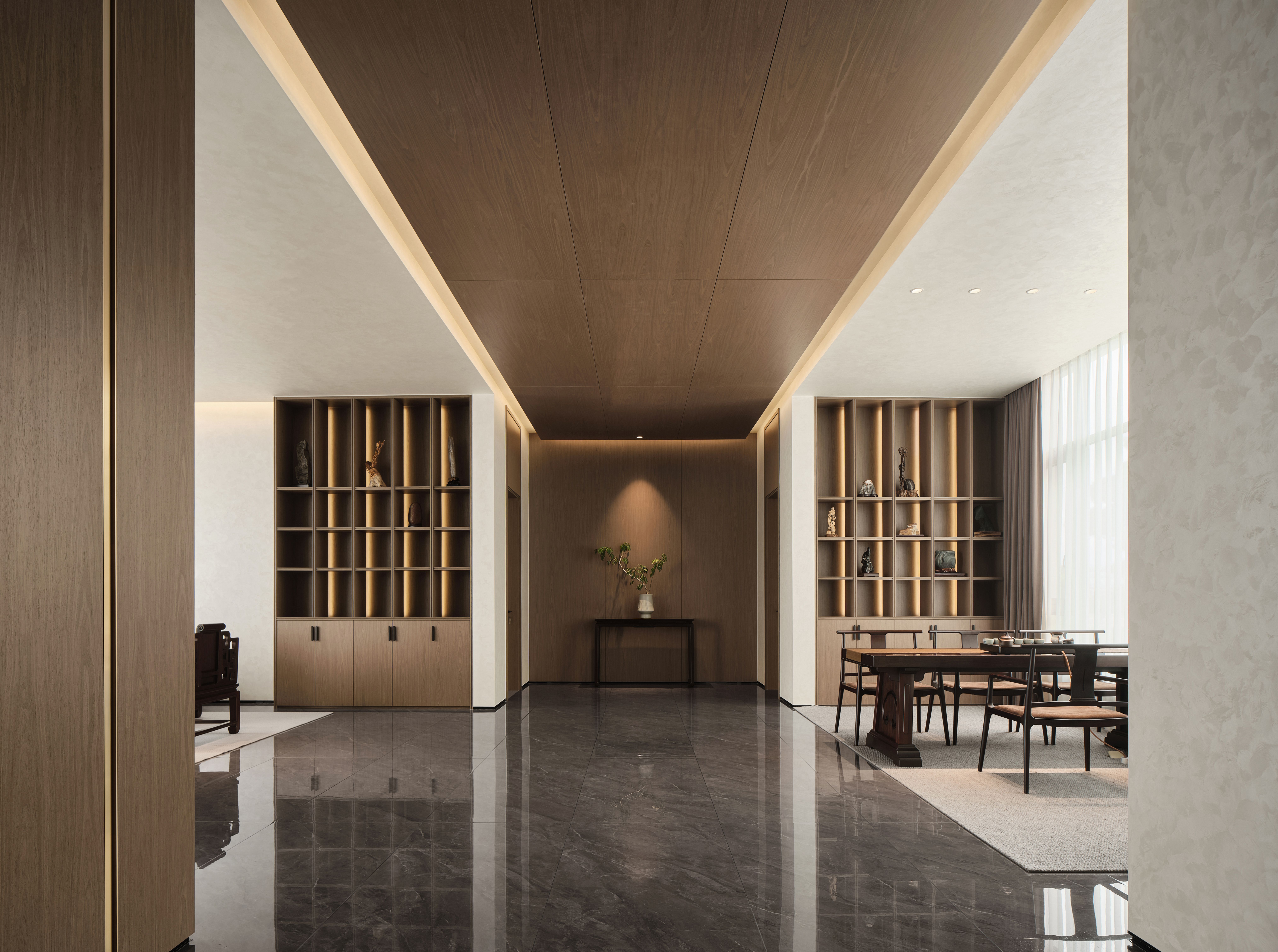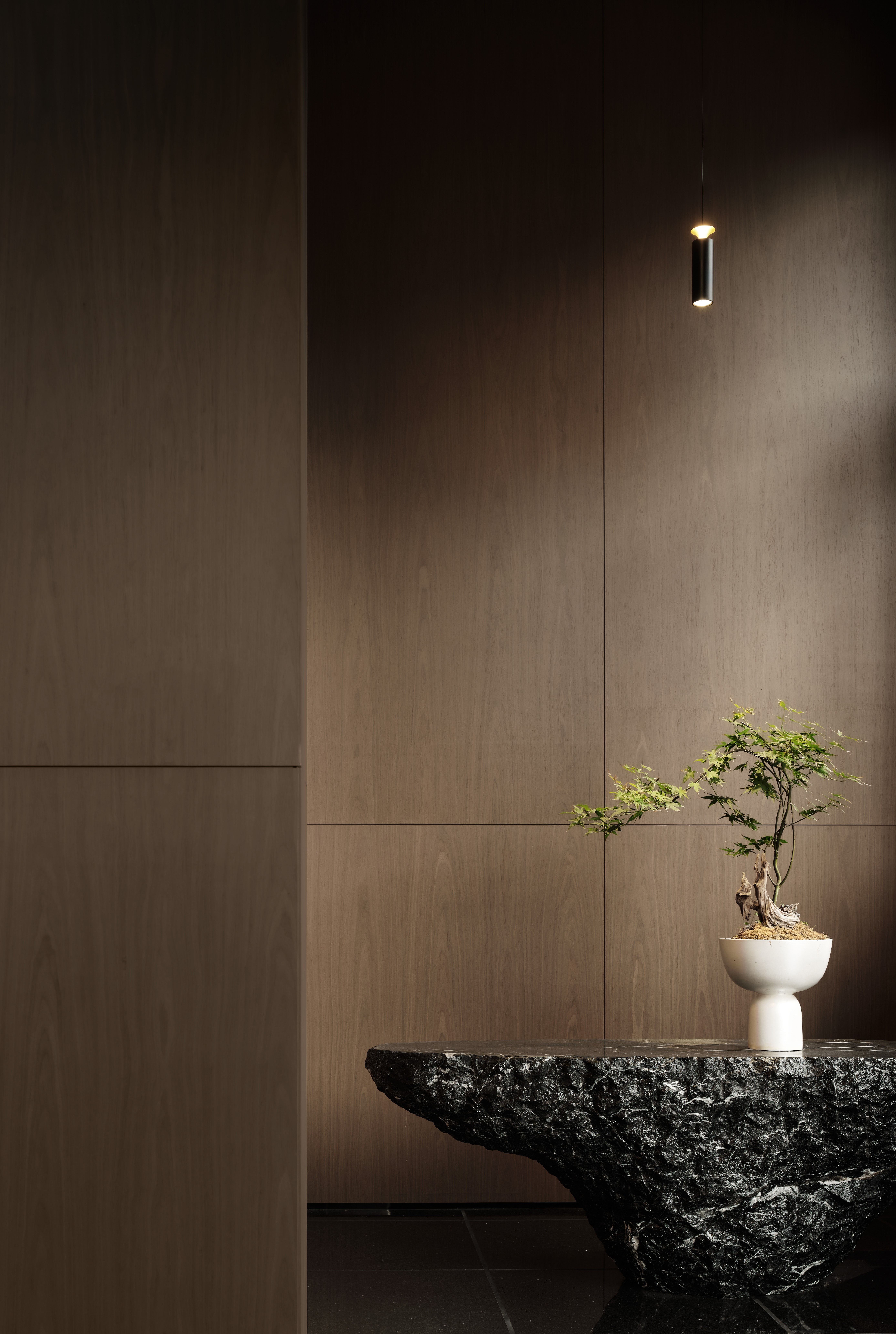 秉承中式美学的本真,对亿雄电机顶层的办公空间和会所进行设计,运用对称、移步、借景等手法,将本案打造成为企业社交聚集所以及房主的精神休憩首选地。穿过庭院,便到室内。设计师用大面积落地玻璃窗过滤光影,将空间内外进行分隔。同时,将中式园林中的对景和移步一景的视觉效果结合到室内,让人有种身在内里,眼望自然的意境。大堂的“石如意”正对水池,以细节取意山水秀雅,亦传递着和美平安的美好寓意。太师椅对称摆放,基于“阴阳平衡”的思想观念,端正肃穆。淡咖色原木材质的护墙随着视线延升,木合玉之温润,散发出内敛含蓄的东方情致。循迹入里,穿过员工的办公区域。在每个空间衔接处,安排对称小景进行自然过渡,为整体的空间景色增添了层次,也消融了边界。枯木花枝,灵境清幽,几笔勾勒,中式质朴之美油然而生。餐区的墙面使用红色涂料和大吊灯平衡些许沉闷感,包间同样使用成套的中式家具,细节呈现高规格的宴请标准,在飨宴中品味高雅和经典。主办公区域涵盖了茶室、接待等功能,厚重的沙发和轻盈的茶室,互为景致也互不打扰,完成不同情况下的接待洽谈功能。茶室临窗而设,薄薄的窗纱,半遮半掩;见天地,显山水,中式灵韵自在眼前。私人办公间的摆设陈列,干净利落且简约大方。背景的群山,呼之欲出,舍弃繁奢装饰,只留自然之美。简约天地中,坐拥阅尽浮沉背后的平静回归。