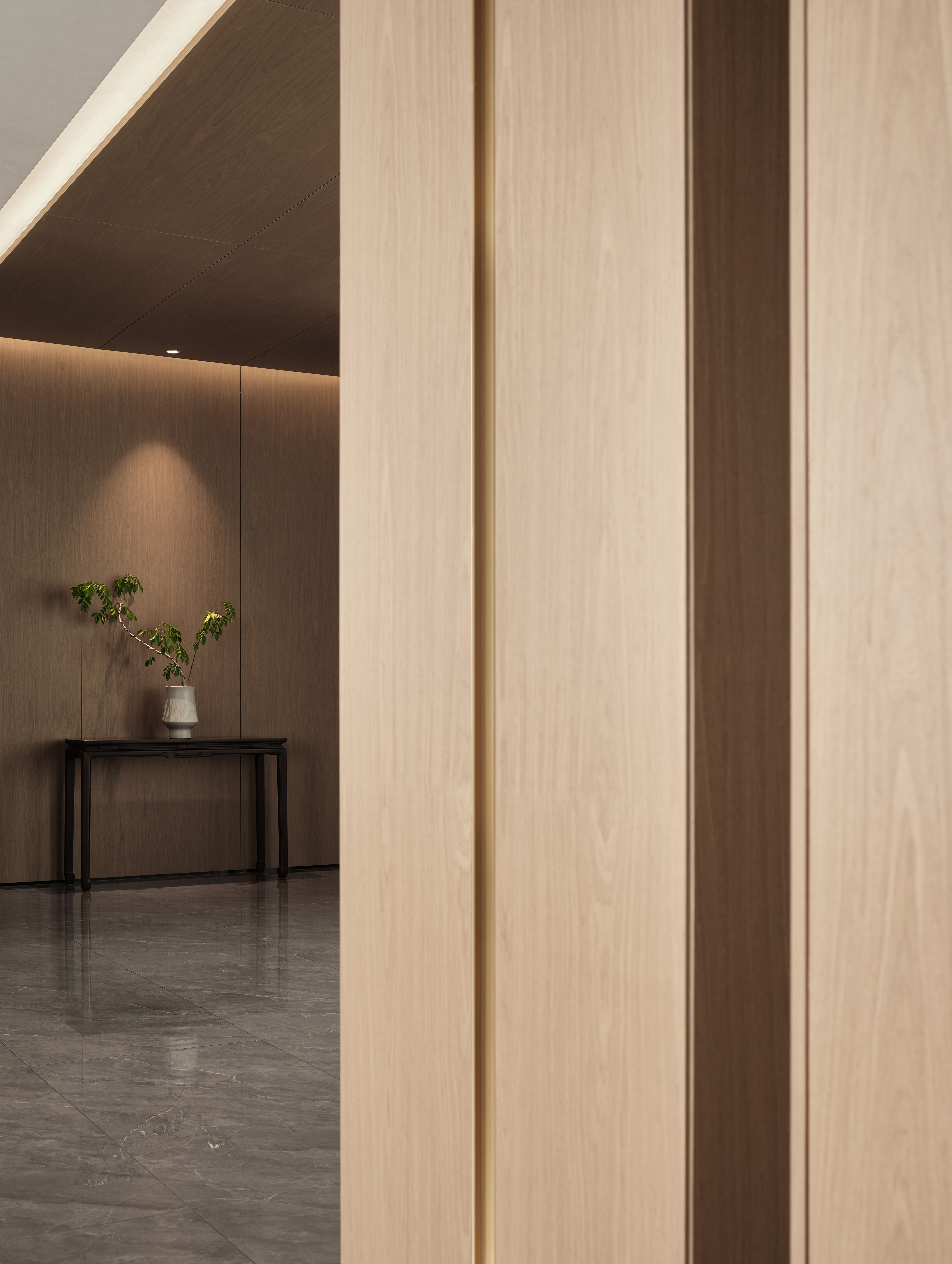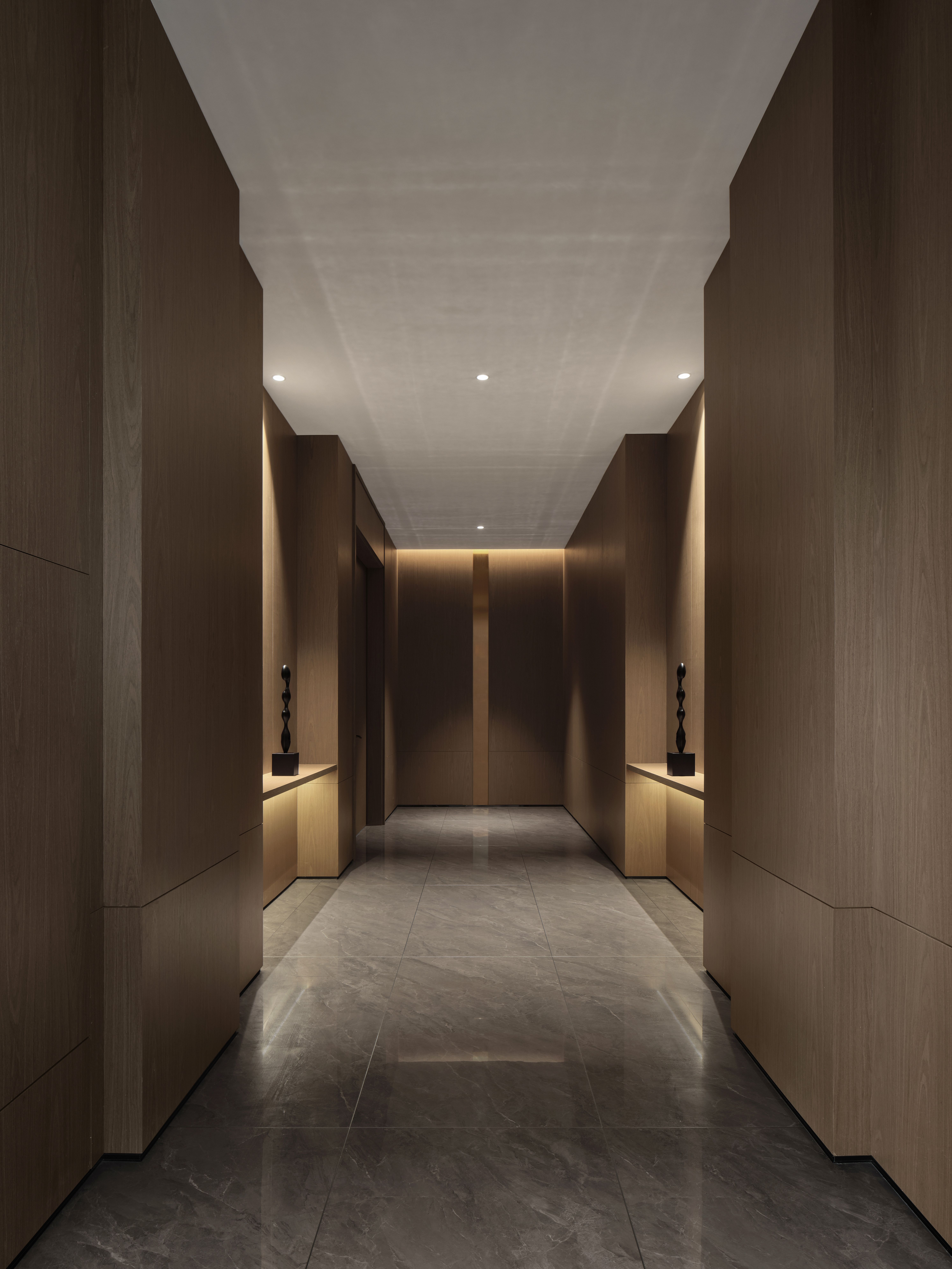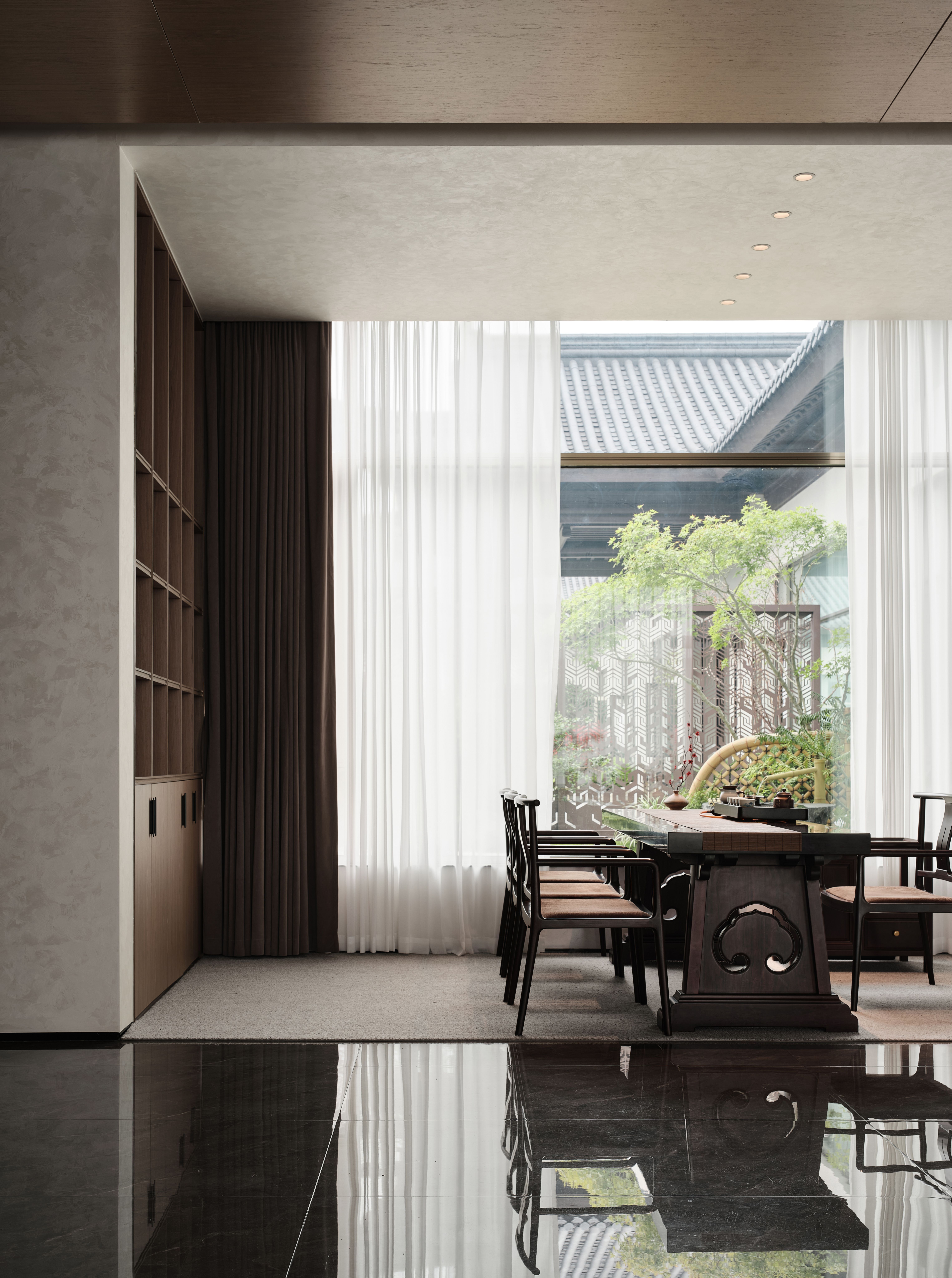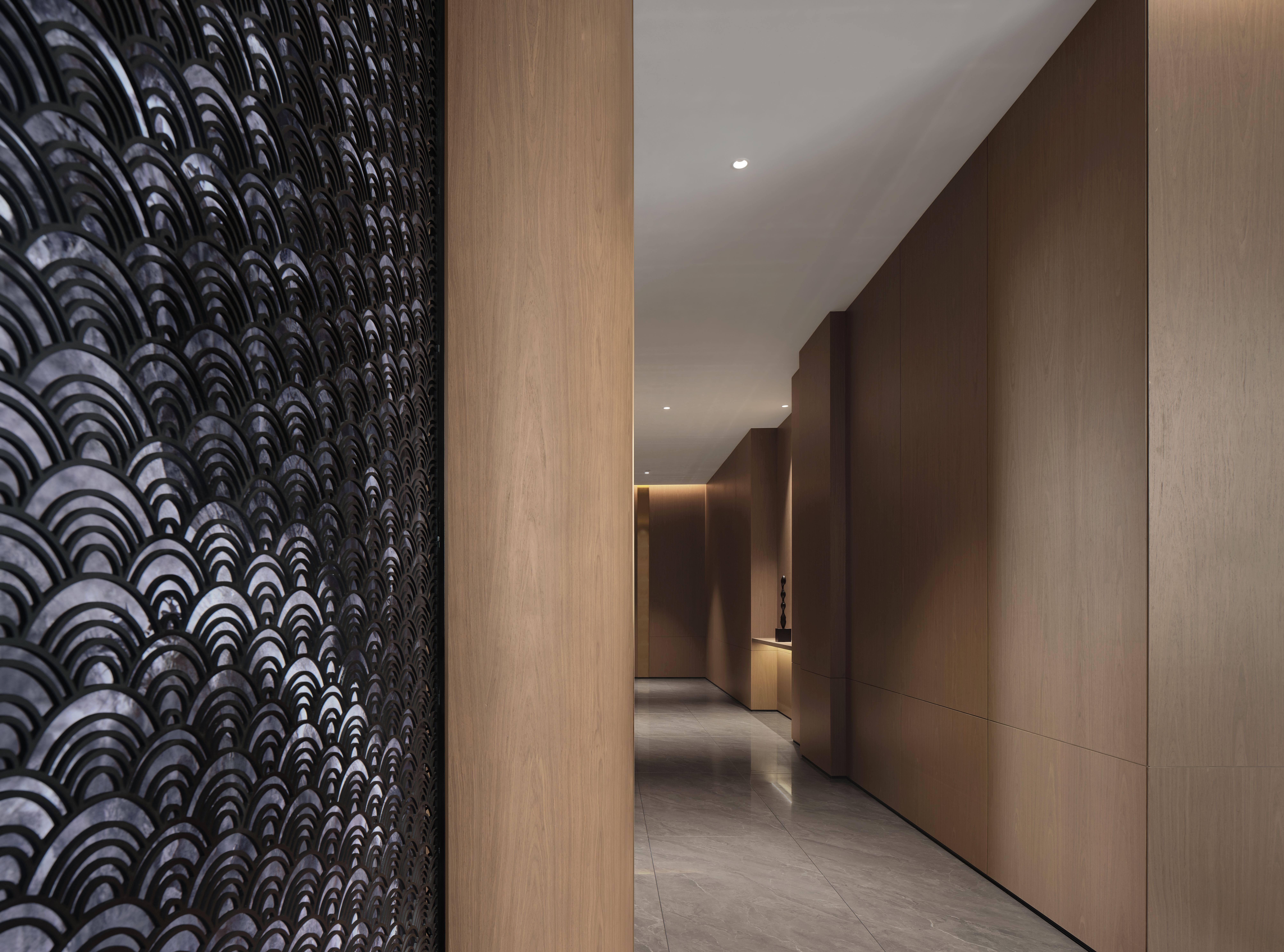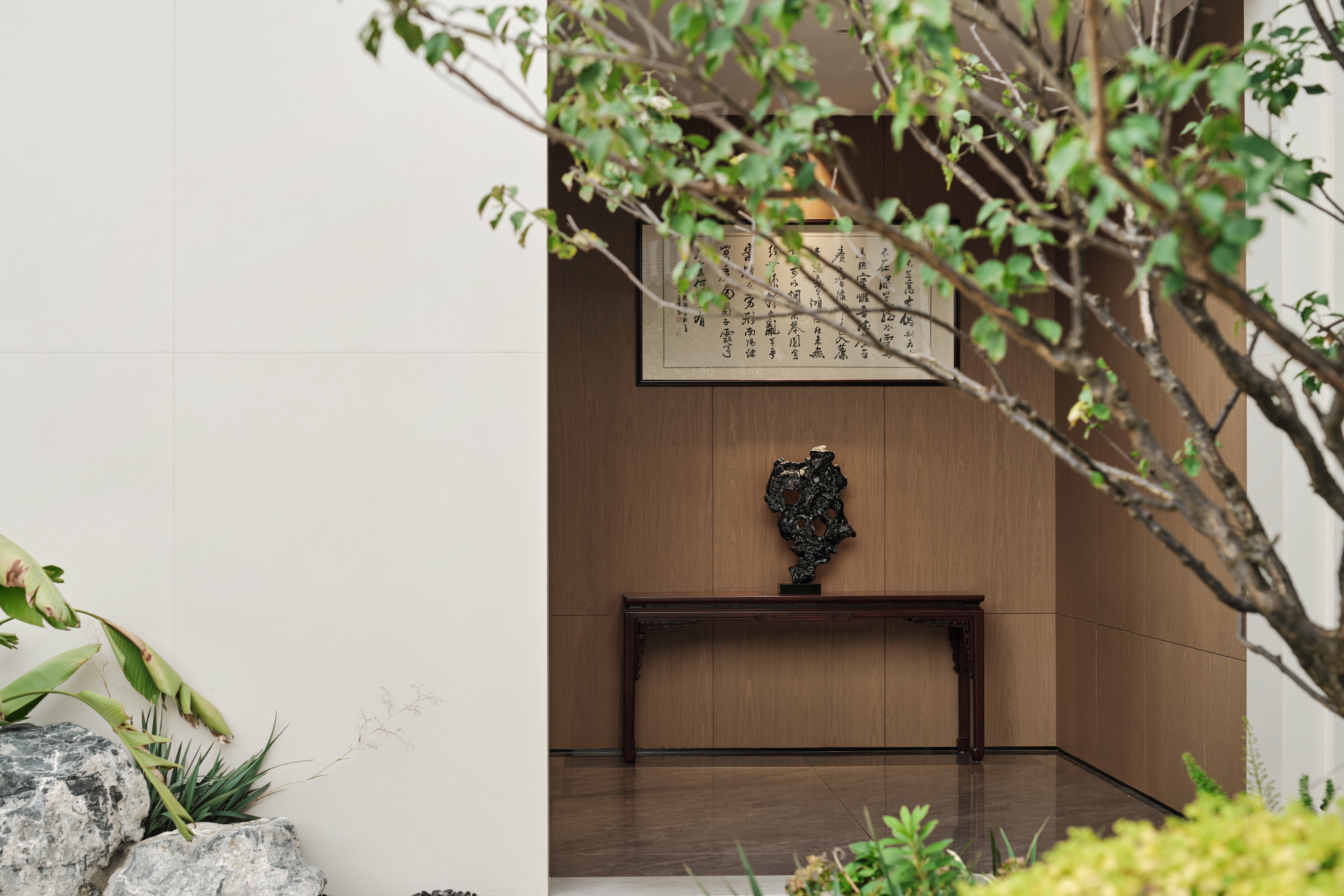 秉承中式美学的本真,对亿雄电机顶层的办公空间和会所进行设计,运用对称、移步、借景等手法,将本案打造成为企业社交聚集所以及房主的精神休憩首选地。穿过庭院,便到室内。设计师用大面积落地玻璃窗过滤光影,将空间内外进行分隔。同时,将中式园林中的对景和移步一景的视觉效果结合到室内,让人有种身在内里,眼望自然的意境。大堂的“石如意”正对水池,以细节取意山水秀雅,亦传递着和美平安的美好寓意。太师椅对称摆放,基于“阴阳平衡”的思想观念,端正肃穆。淡咖色原木材质的护墙随着视线延升,木合玉之温润,散发出内敛含蓄的东方情致。循迹入里,穿过员工的办公区域。在每个空间衔接处,安排对称小景进行自然过渡,为整体的空间景色增添了层次,也消融了边界。枯木花枝,灵境清幽,几笔勾勒,中式质朴之美油然而生。餐区的墙面使用红色涂料和大吊灯平衡些许沉闷感,包间同样使用成套的中式家具,细节呈现高规格的宴请标准,在飨宴中品味高雅和经典。主办公区域涵盖了茶室、接待等功能,厚重的沙发和轻盈的茶室,互为景致也互不打扰,完成不同情况下的接待洽谈功能。茶室临窗而设,薄薄的窗纱,半遮半掩;见天地,显山水,中式灵韵自在眼前。私人办公间的摆设陈列,干净利落且简约大方。背景的群山,呼之欲出,舍弃繁奢装饰,只留自然之美。简约天地中,坐拥阅尽浮沉背后的平静回归。