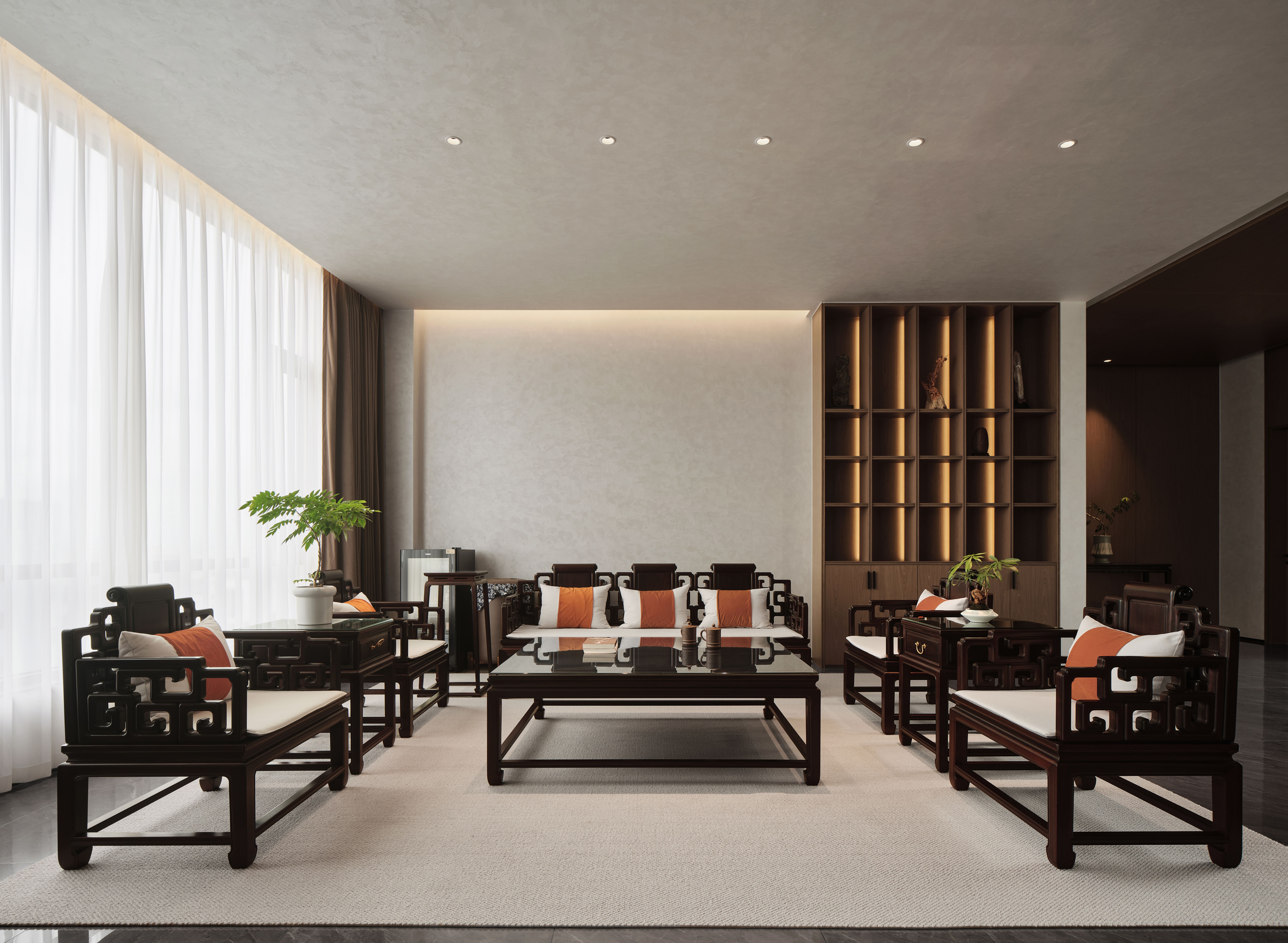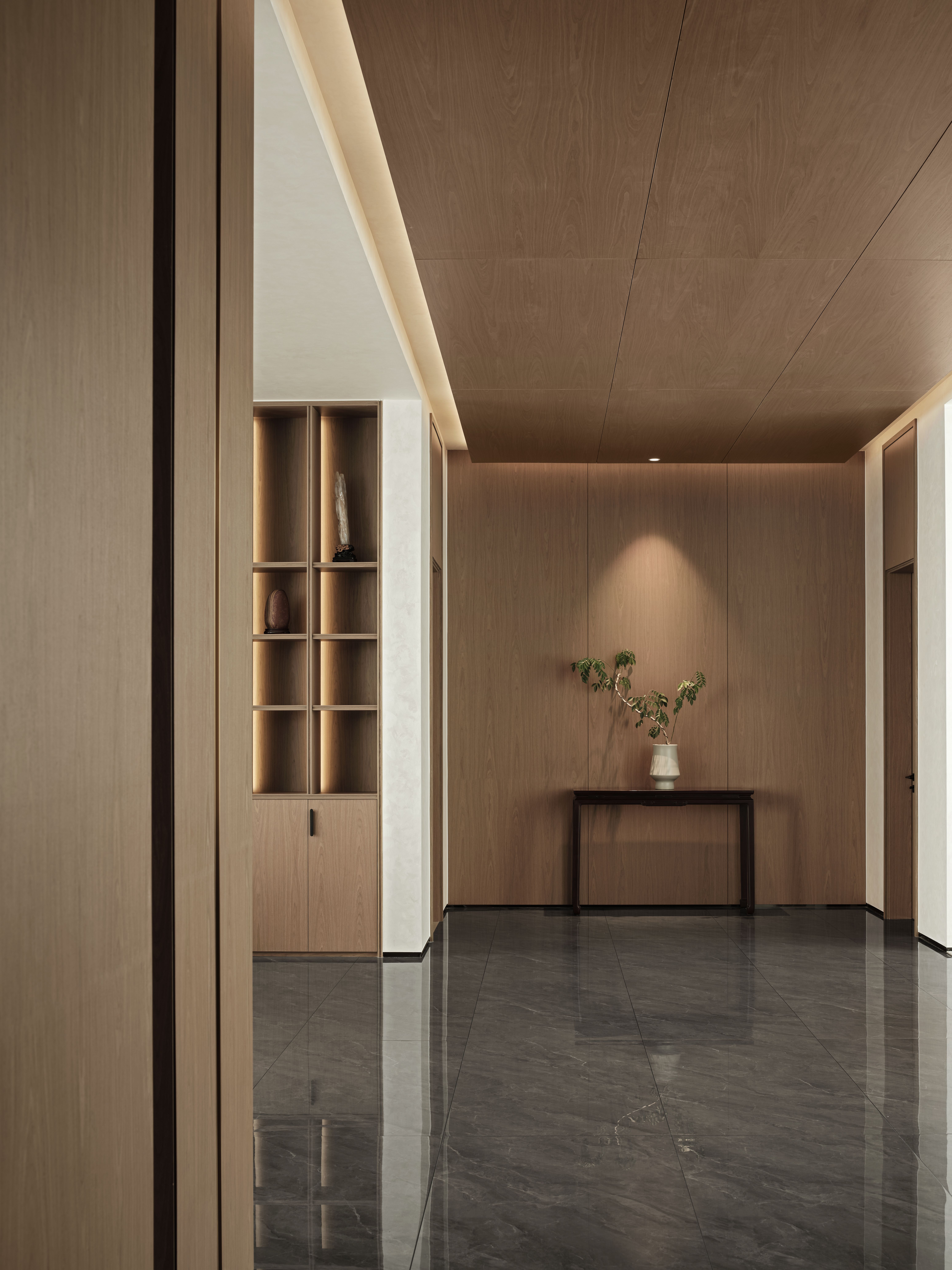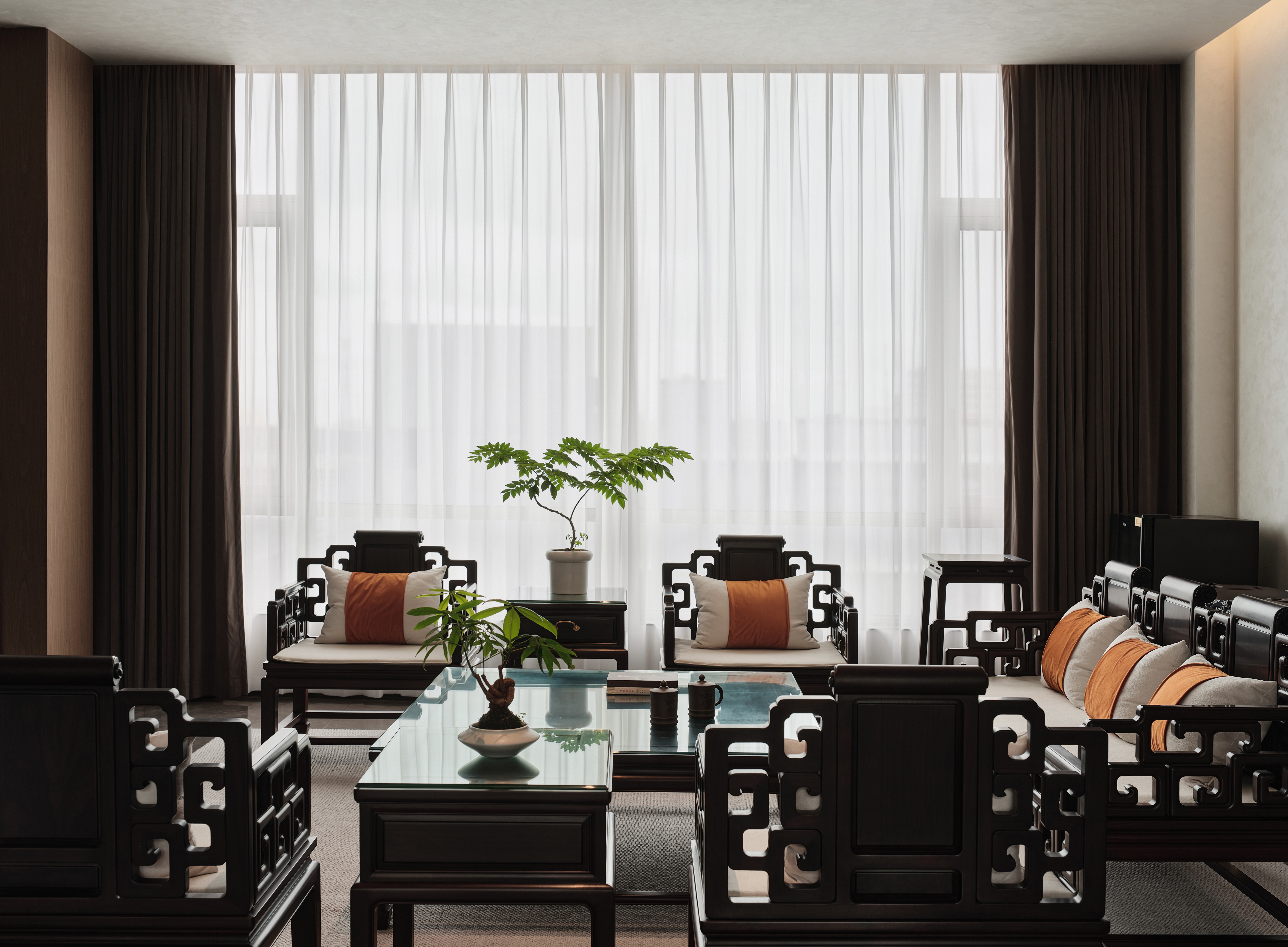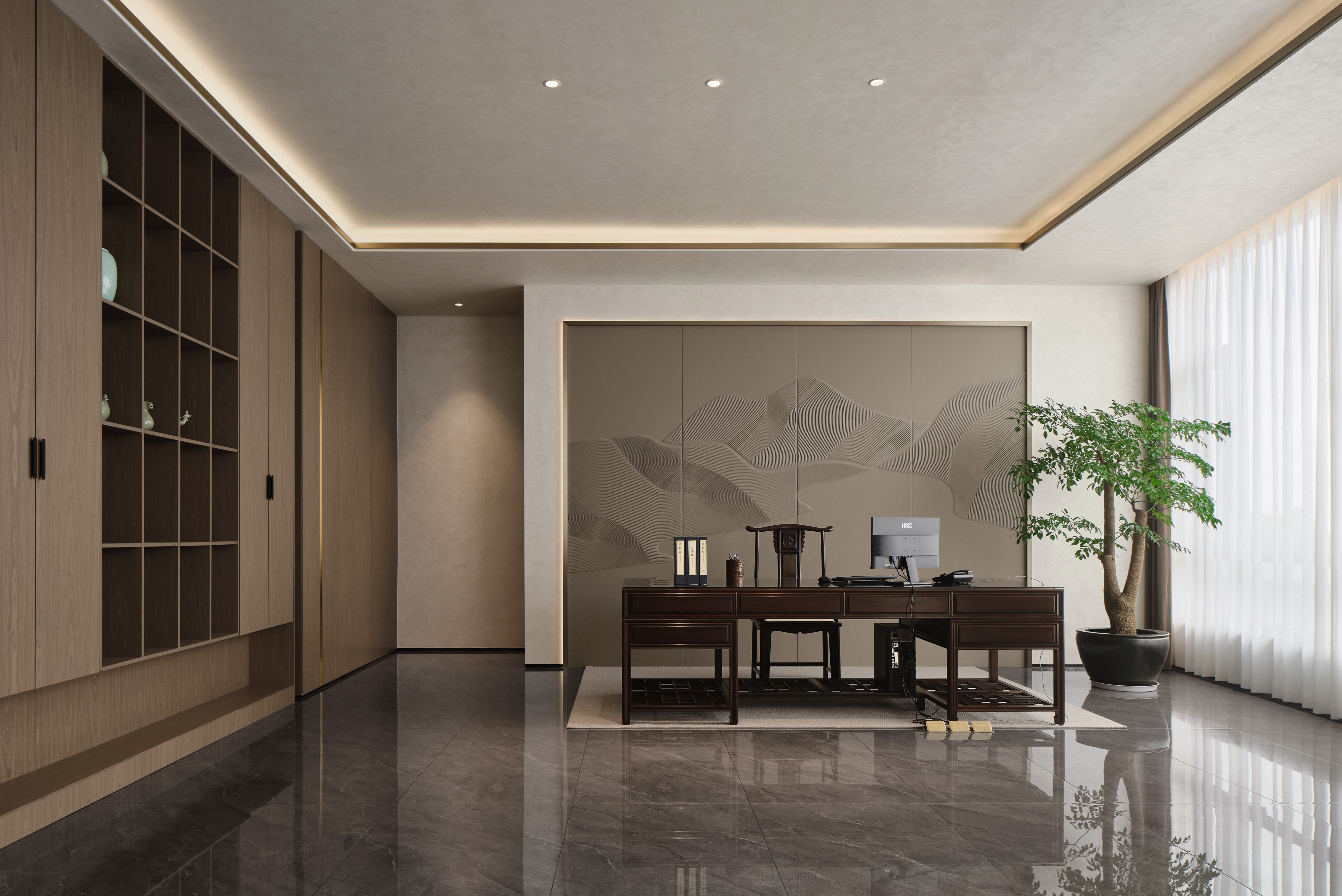 秉承中式美学的本真,对亿雄电机顶层的办公空间和会所进行设计,运用对称、移步、借景等手法,将本案打造成为企业社交聚集所以及房主的精神休憩首选地。穿过庭院,便到室内。设计师用大面积落地玻璃窗过滤光影,将空间内外进行分隔。同时,将中式园林中的对景和移步一景的视觉效果结合到室内,让人有种身在内里,眼望自然的意境。大堂的“石如意”正对水池,以细节取意山水秀雅,亦传递着和美平安的美好寓意。太师椅对称摆放,基于“阴阳平衡”的思想观念,端正肃穆。淡咖色原木材质的护墙随着视线延升,木合玉之温润,散发出内敛含蓄的东方情致。循迹入里,穿过员工的办公区域。在每个空间衔接处,安排对称小景进行自然过渡,为整体的空间景色增添了层次,也消融了边界。枯木花枝,灵境清幽,几笔勾勒,中式质朴之美油然而生。餐区的墙面使用红色涂料和大吊灯平衡些许沉闷感,包间同样使用成套的中式家具,细节呈现高规格的宴请标准,在飨宴中品味高雅和经典。主办公区域涵盖了茶室、接待等功能,厚重的沙发和轻盈的茶室,互为景致也互不打扰,完成不同情况下的接待洽谈功能。茶室临窗而设,薄薄的窗纱,半遮半掩;见天地,显山水,中式灵韵自在眼前。私人办公间的摆设陈列,干净利落且简约大方。背景的群山,呼之欲出,舍弃繁奢装饰,只留自然之美。简约天地中,坐拥阅尽浮沉背后的平静回归。