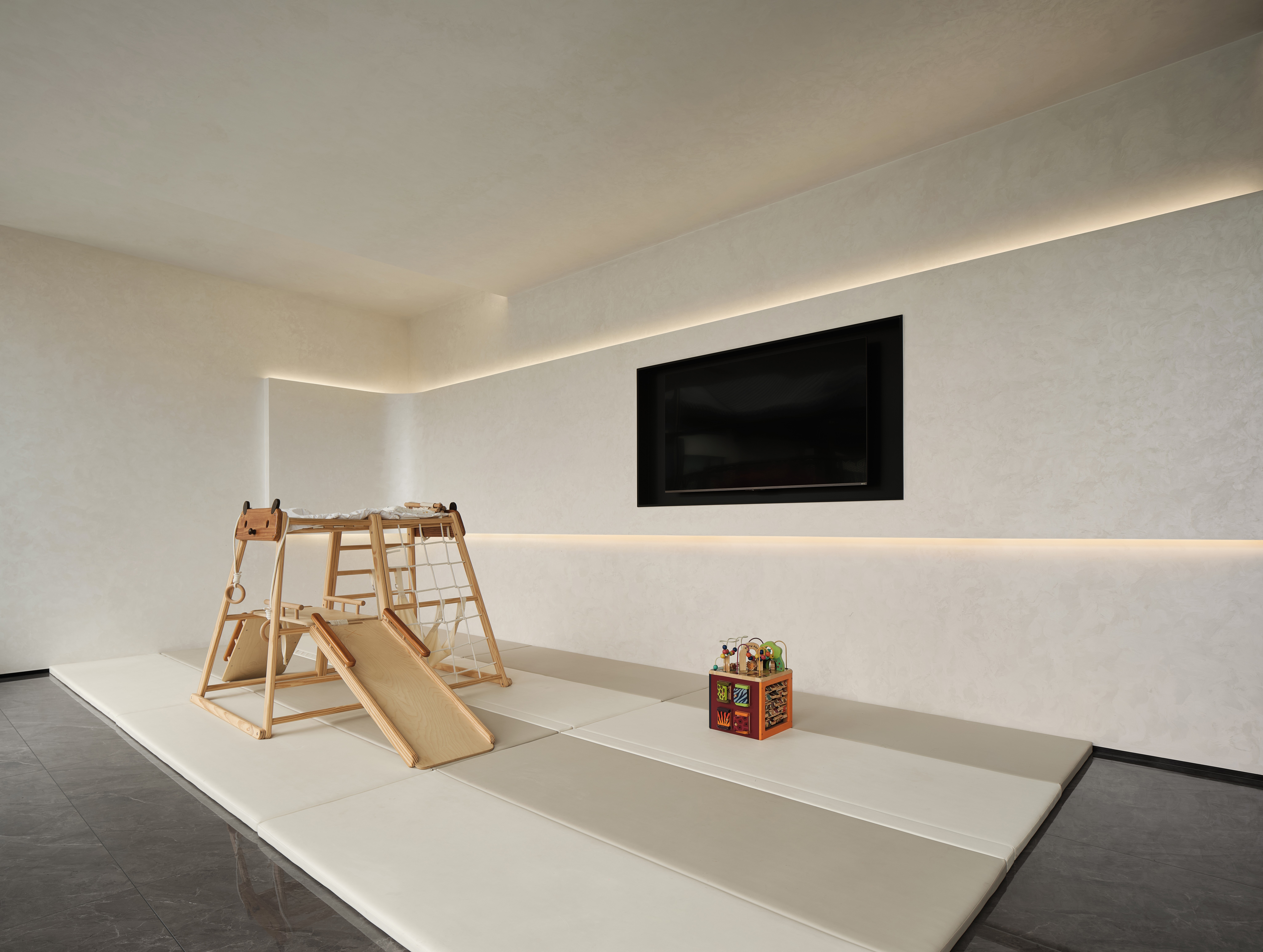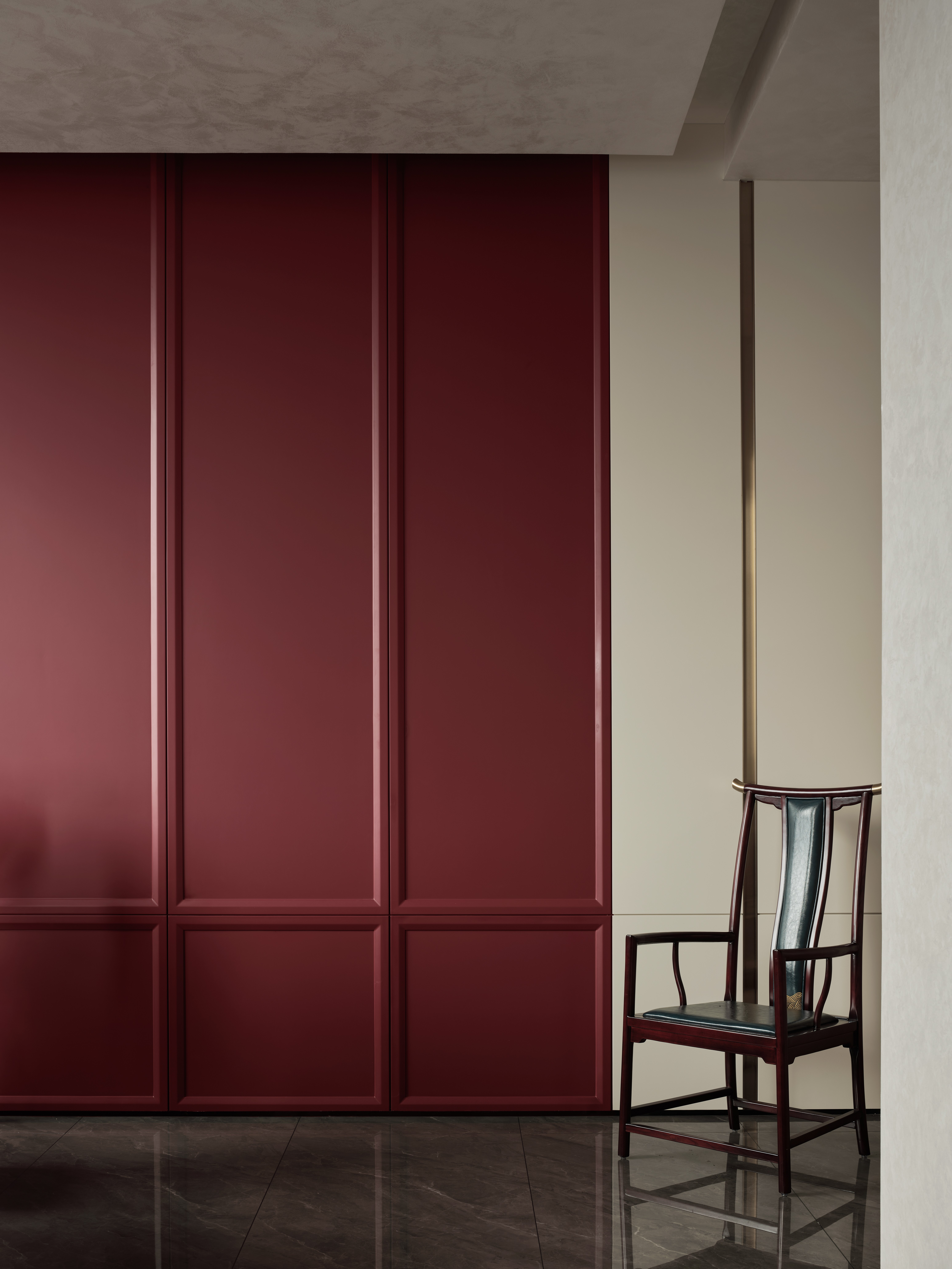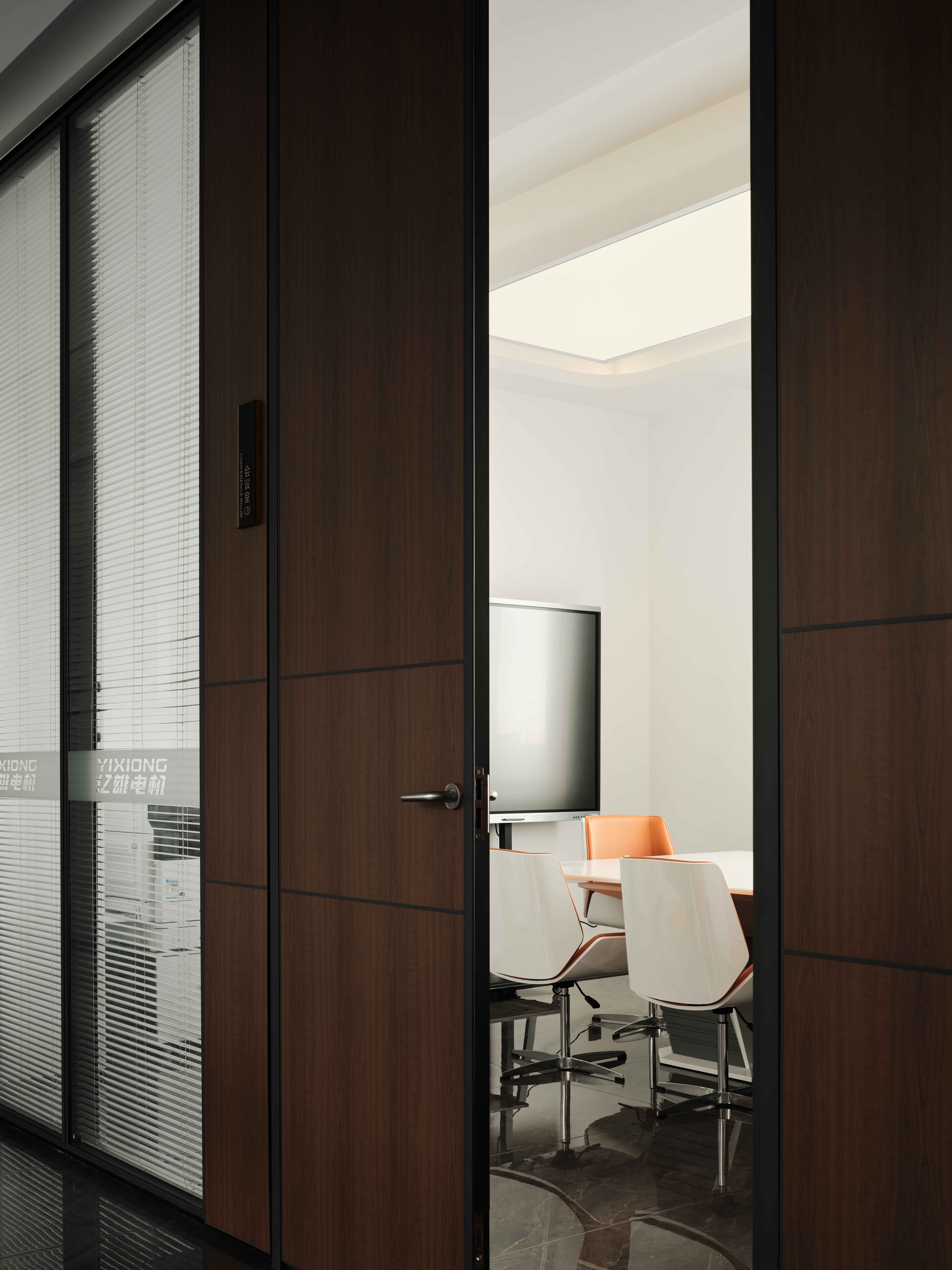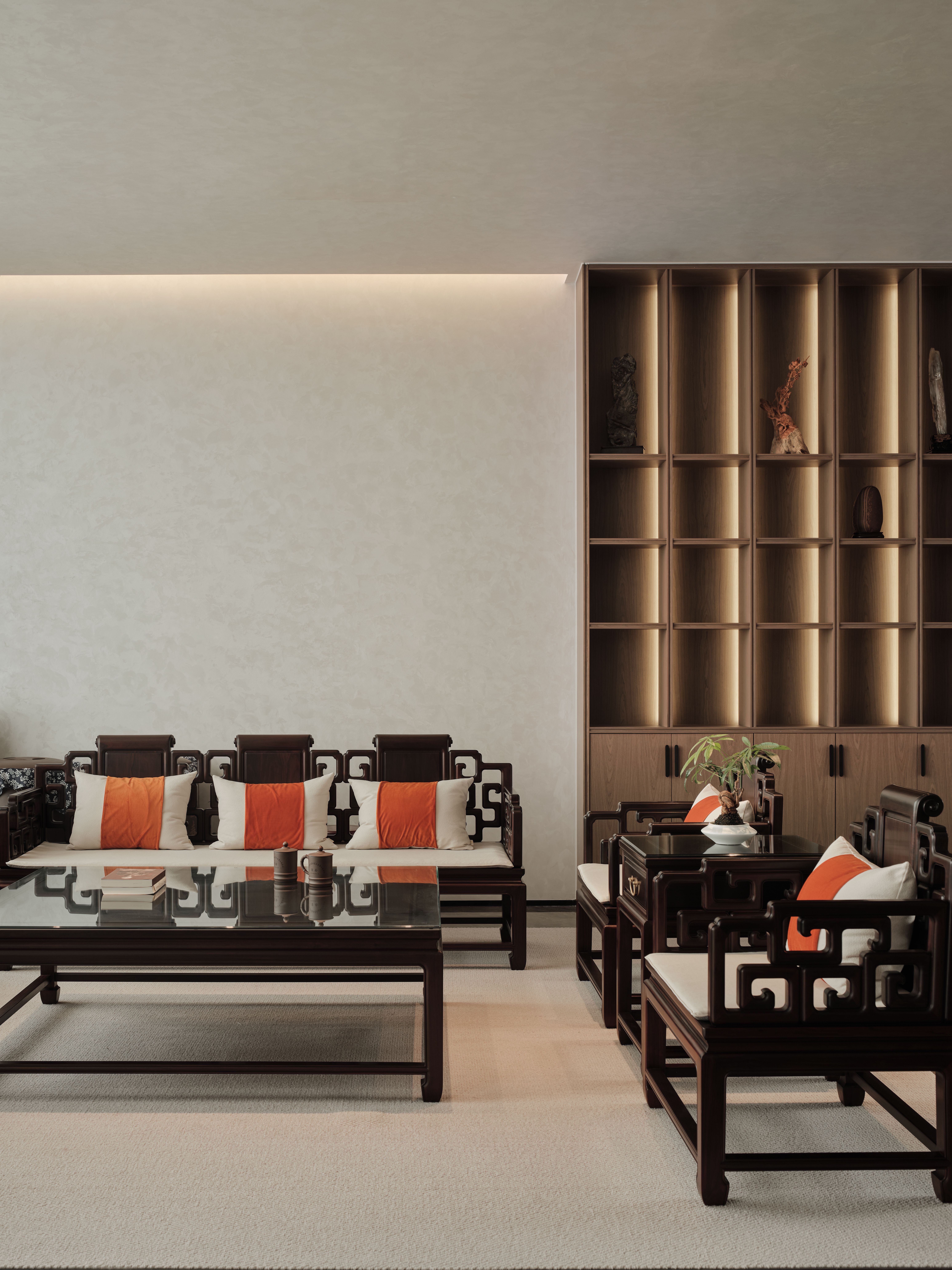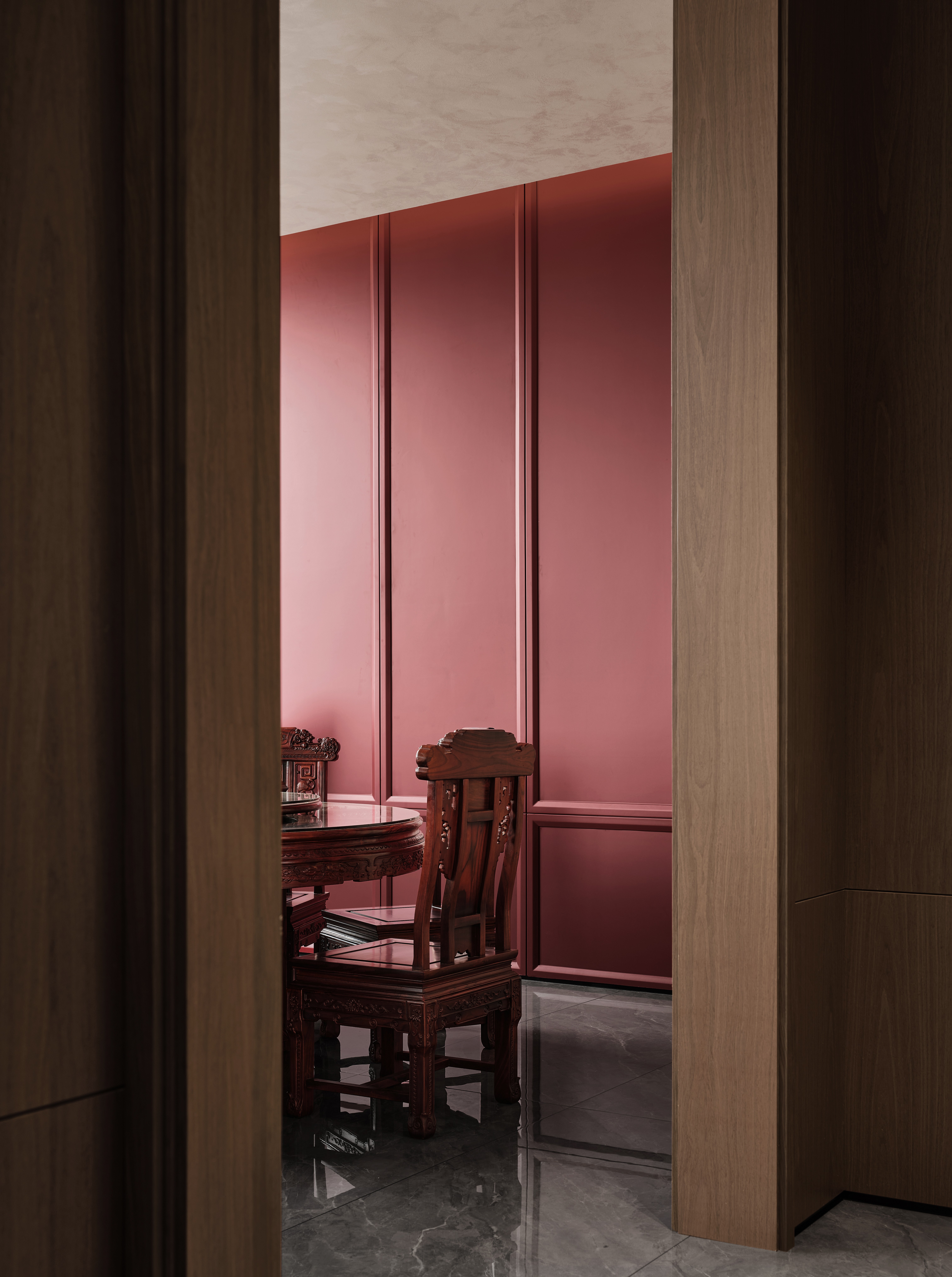 秉承中式美学的本真,对亿雄电机顶层的办公空间和会所进行设计,运用对称、移步、借景等手法,将本案打造成为企业社交聚集所以及房主的精神休憩首选地。穿过庭院,便到室内。设计师用大面积落地玻璃窗过滤光影,将空间内外进行分隔。同时,将中式园林中的对景和移步一景的视觉效果结合到室内,让人有种身在内里,眼望自然的意境。大堂的“石如意”正对水池,以细节取意山水秀雅,亦传递着和美平安的美好寓意。太师椅对称摆放,基于“阴阳平衡”的思想观念,端正肃穆。淡咖色原木材质的护墙随着视线延升,木合玉之温润,散发出内敛含蓄的东方情致。循迹入里,穿过员工的办公区域。在每个空间衔接处,安排对称小景进行自然过渡,为整体的空间景色增添了层次,也消融了边界。枯木花枝,灵境清幽,几笔勾勒,中式质朴之美油然而生。餐区的墙面使用红色涂料和大吊灯平衡些许沉闷感,包间同样使用成套的中式家具,细节呈现高规格的宴请标准,在飨宴中品味高雅和经典。主办公区域涵盖了茶室、接待等功能,厚重的沙发和轻盈的茶室,互为景致也互不打扰,完成不同情况下的接待洽谈功能。茶室临窗而设,薄薄的窗纱,半遮半掩;见天地,显山水,中式灵韵自在眼前。私人办公间的摆设陈列,干净利落且简约大方。背景的群山,呼之欲出,舍弃繁奢装饰,只留自然之美。简约天地中,坐拥阅尽浮沉背后的平静回归。