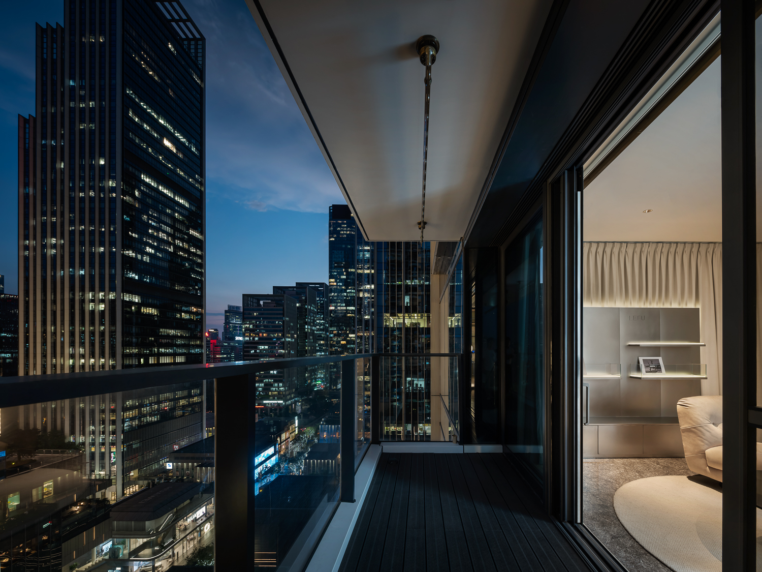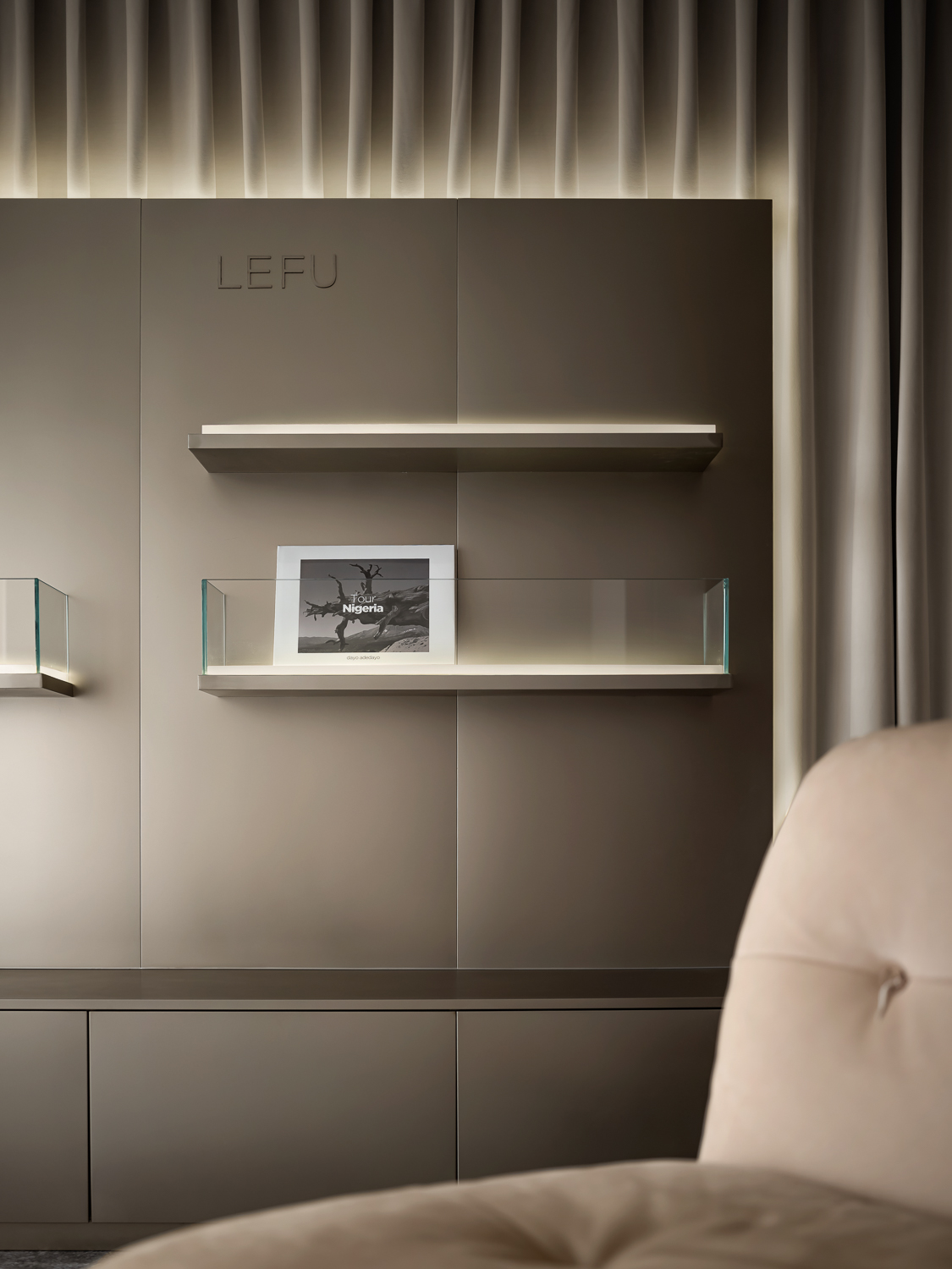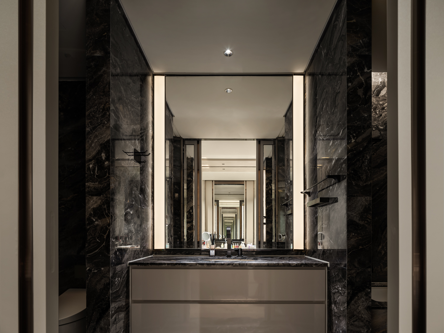 空间中采用温柔肤感艺术漆加上金属硬朗增加风格的深度,天然石材的肌理与色泽呈现自然宁静的空间的氛围。
