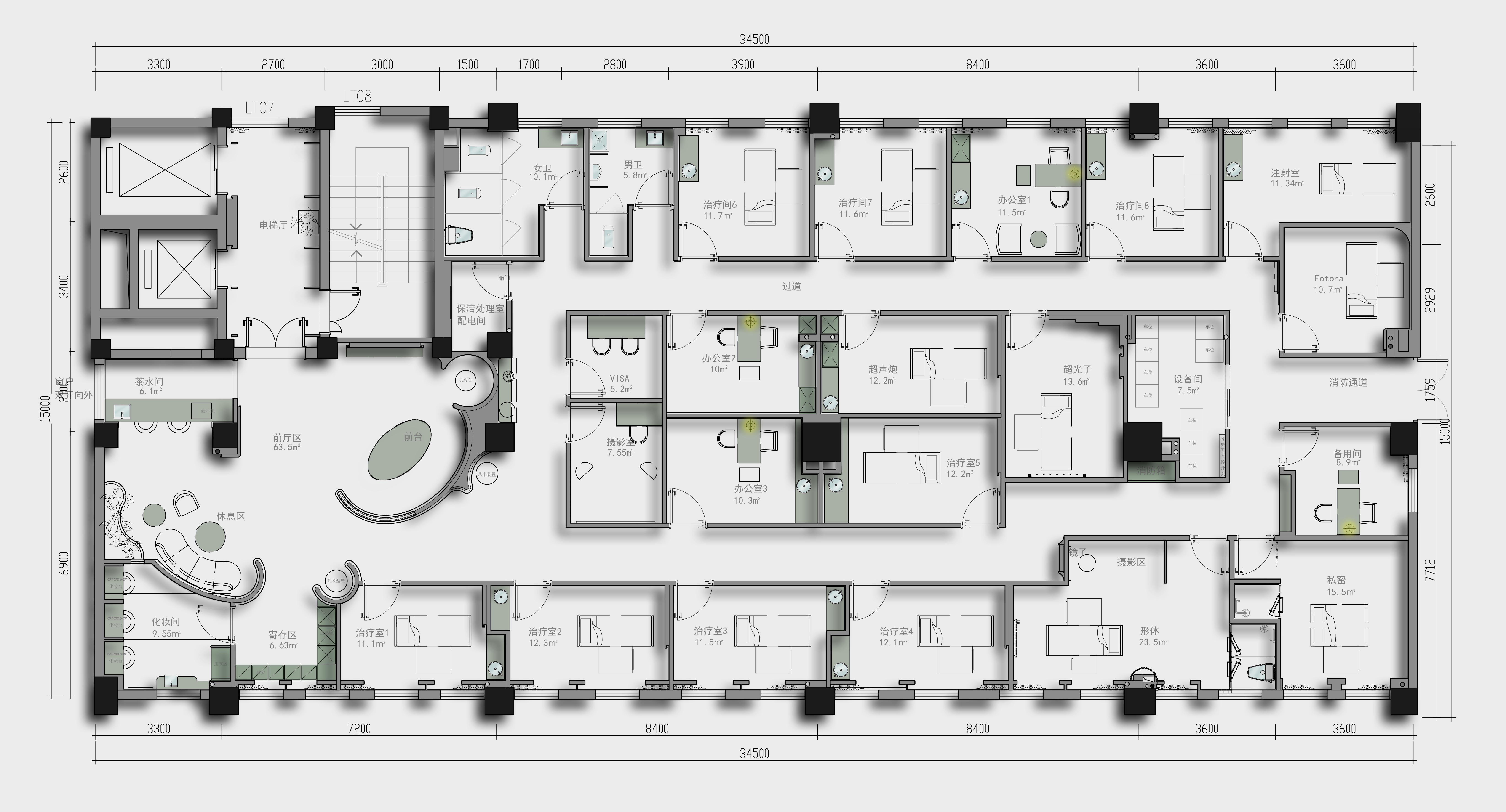 为了给客户提供更好的服务 设计师几乎对每个治疗间 都进行了量身定制