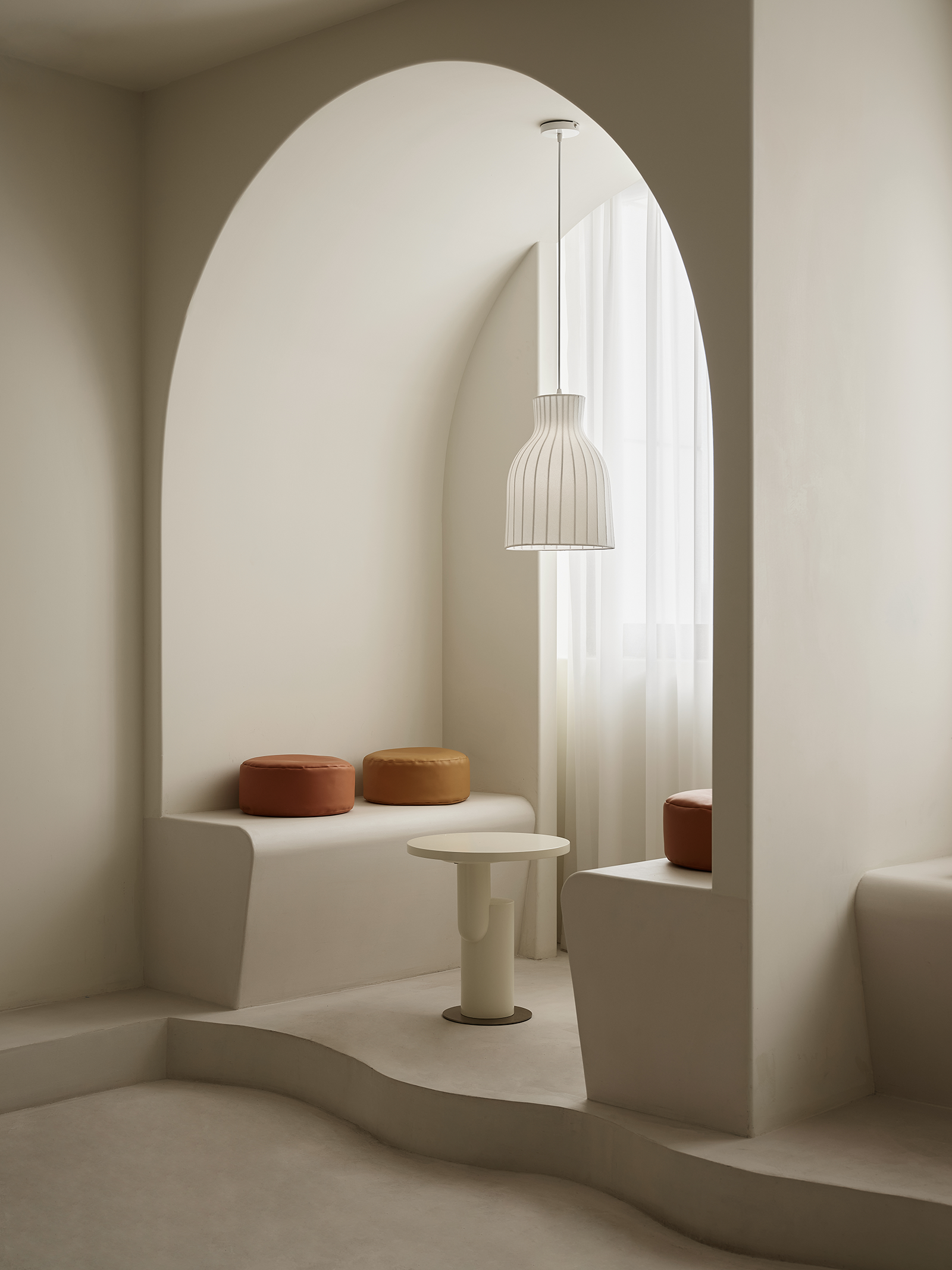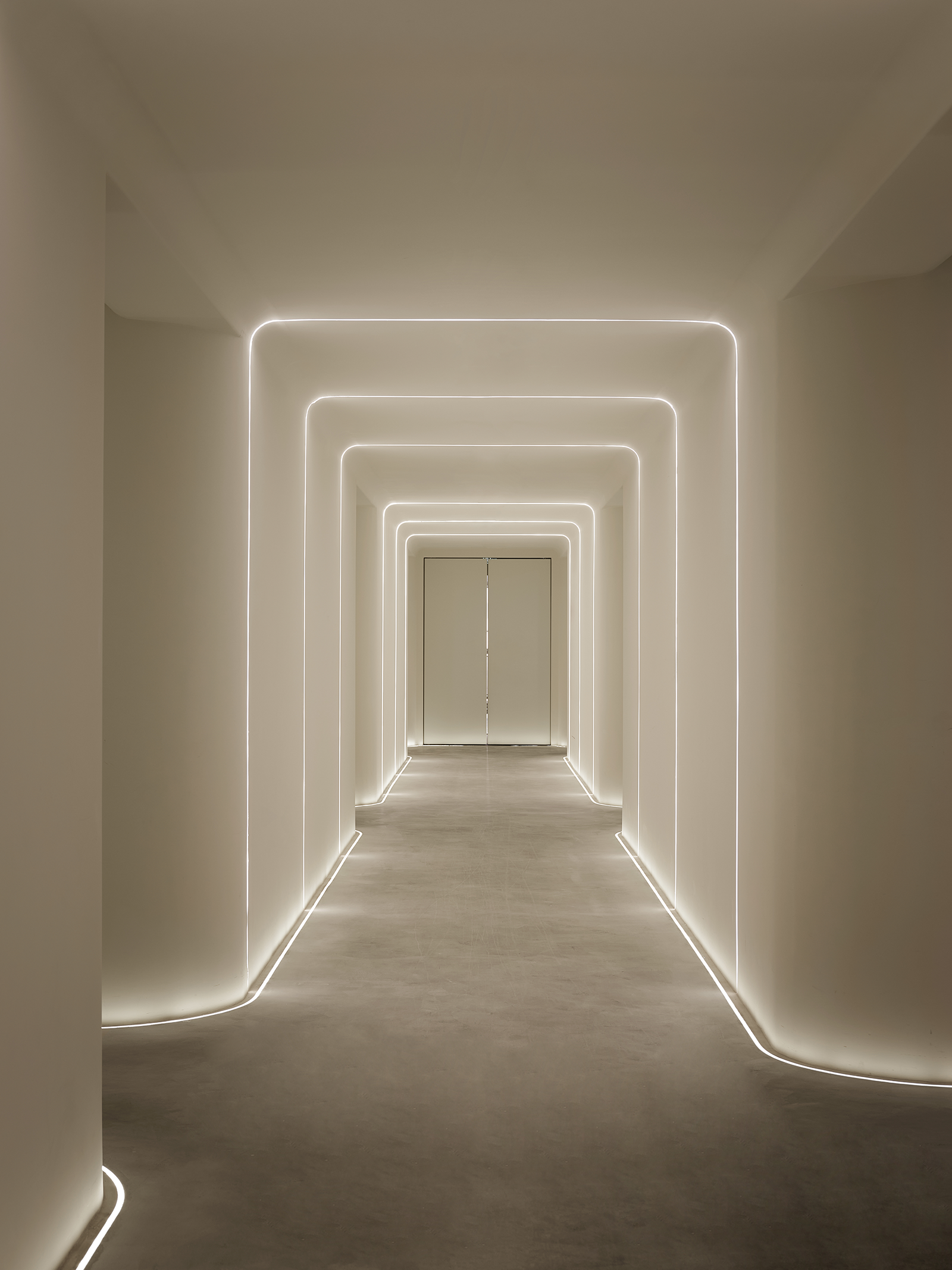 顶面的弧线灯生动神秘 仿佛可以探索更多的秘密 用最纯粹的元素 通过大量立体构成 表达“传承绵延”的空间礼序