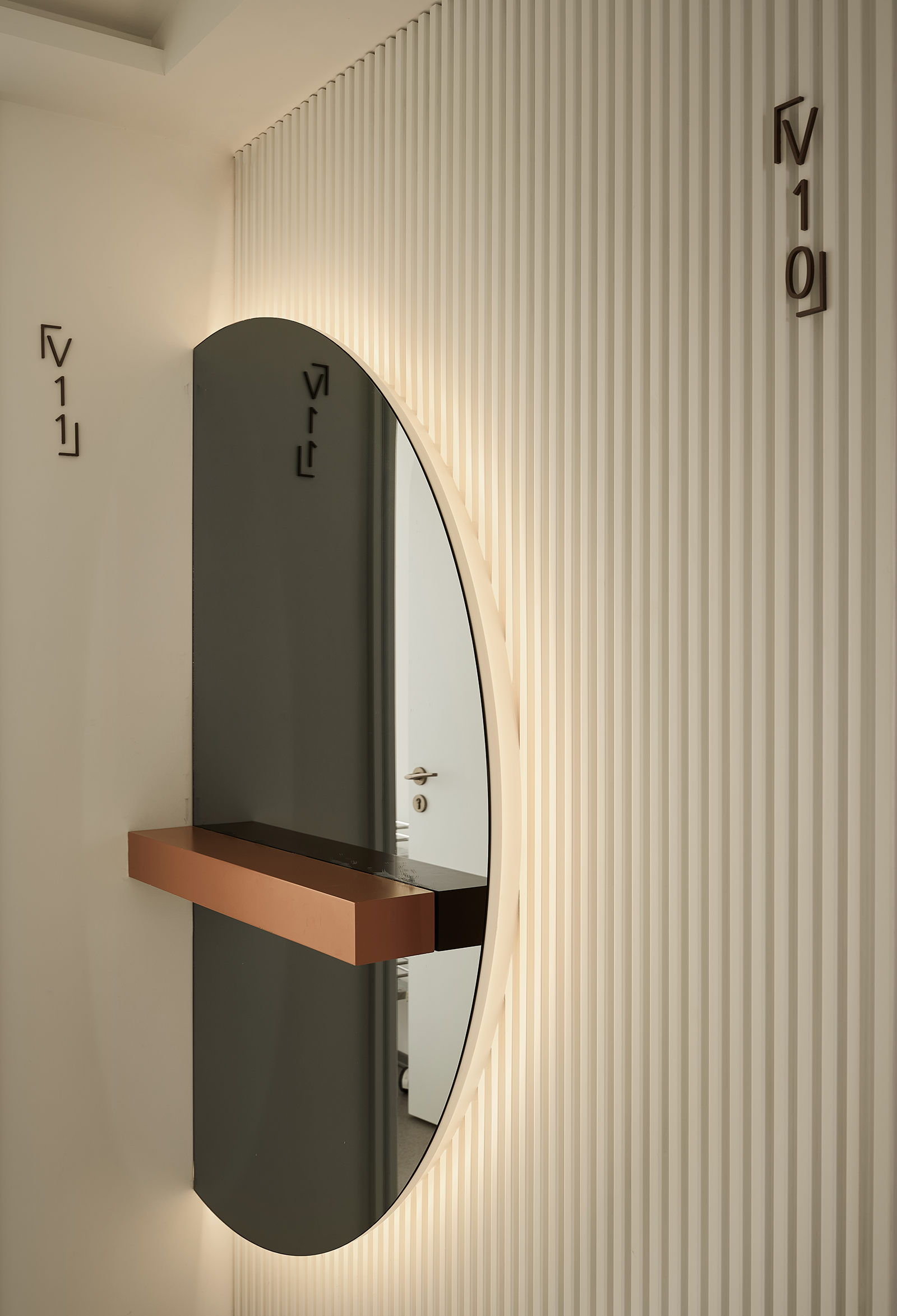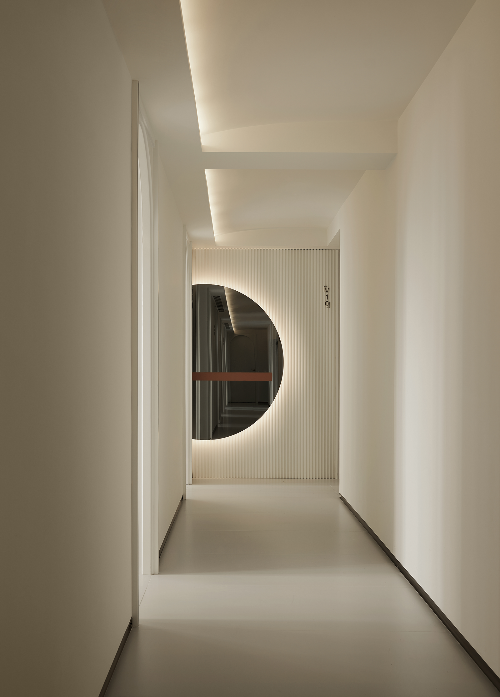电梯厅面对着墙 建筑先天结构 令原本并不大的空间显得比较凌乱 设计师借鉴户外连廊设计的原理 对此进行视觉上的分割 再引入线灯,弱化消防门栓 使电梯厅增加了纵深感