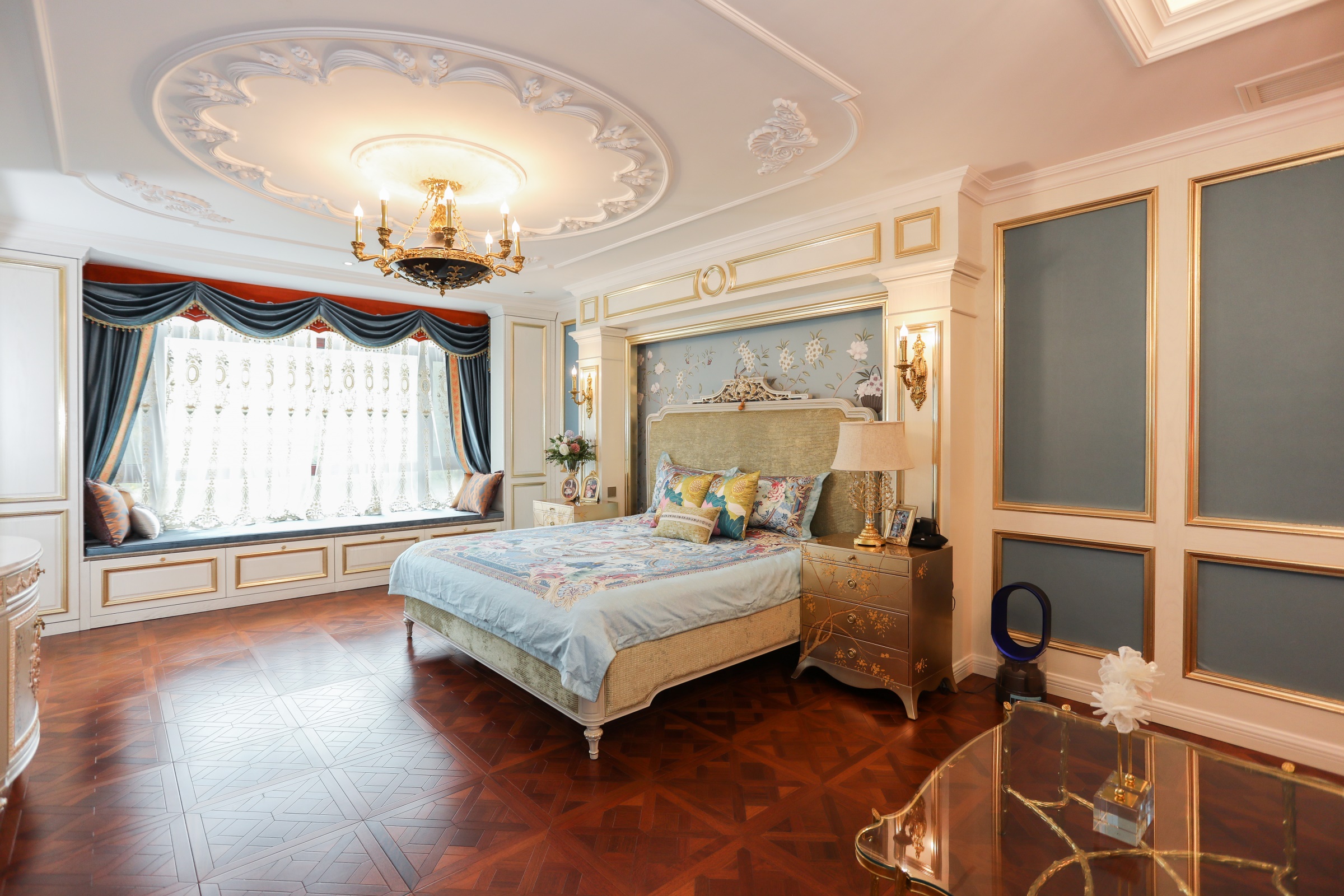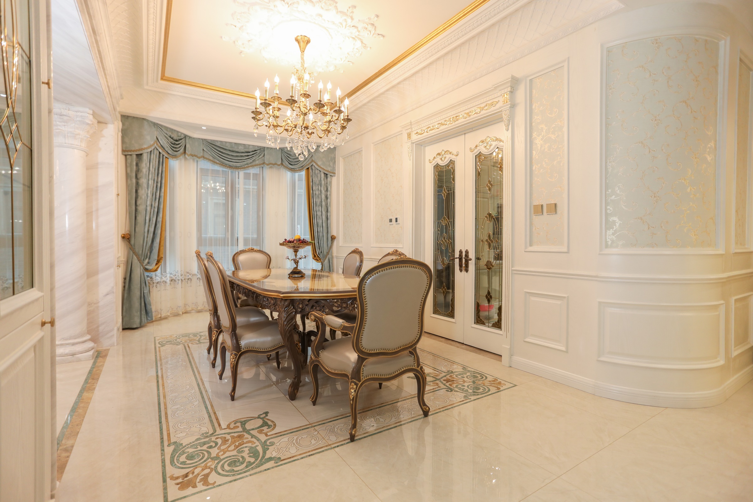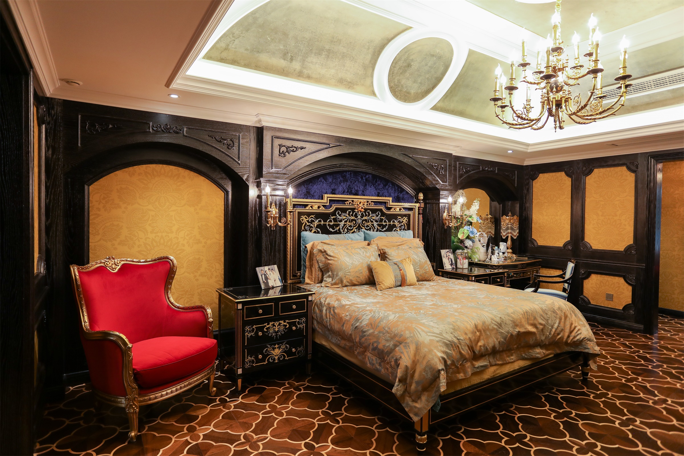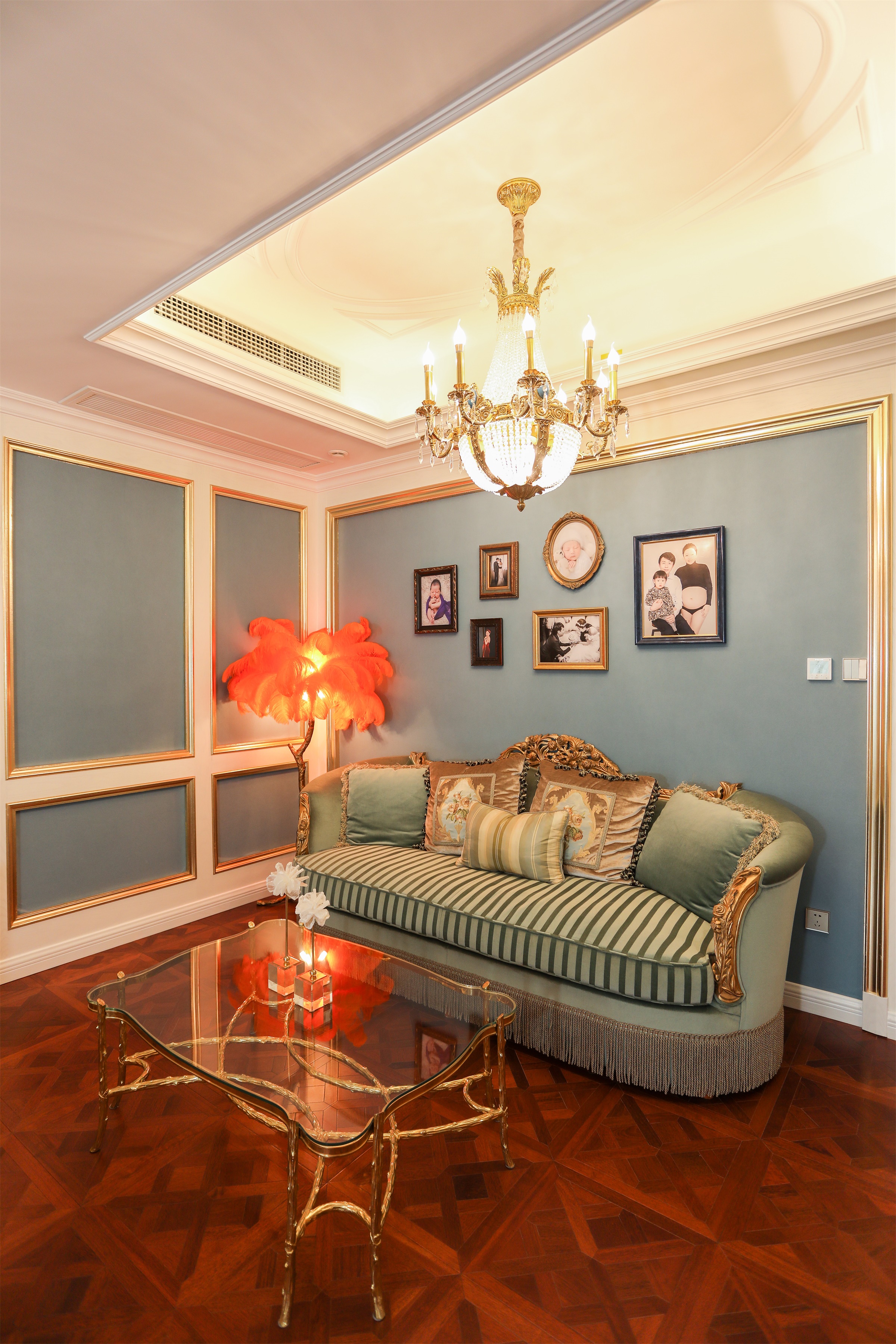 客厅、餐厅是每天踏上征途前振作精神的深呼吸,也是每天脱下伪装后松开领带的伸懒腰。这地方就该是个港湾,同时又是个堡垒。我们选择大面积的使用石材元素搭配轻奢系的质感家具突出一分让人心、踏实的厚重感。软装如窗帘等,佐以与主人职业应和的海洋色系,再将法式宫廷风格的明亮金色投射于墙面和天花板,赋予整个空间统一的风格与美感。从主卧开始,是更轻柔的暖,灵感有点像美丽的玛丽安托内特,渲染些洛可可的元素,在海蓝色系与象牙白、玫瑰金的轮舞协奏中,试图给主人一种文艺又慵懒的舒适感。老人家对华贵、大气的波旁王朝宫廷风格颇为青睐,于是他们的卧室我便以此为主旨描画,配色上,藏了一点心机,选择了国人的正色——玄色,与银杏黄、檀木色为主的变化。儿童房尽管仍然是古典主义宫廷风的支形吊灯,但色彩与质感更清新活泼,主题动物壁纸、与上下铺原木床,是希望孩子即使成长在钢筋水泥的都市丛林,但依然可以在自己的房间里想象一个只属于自己的“秘密花园”。