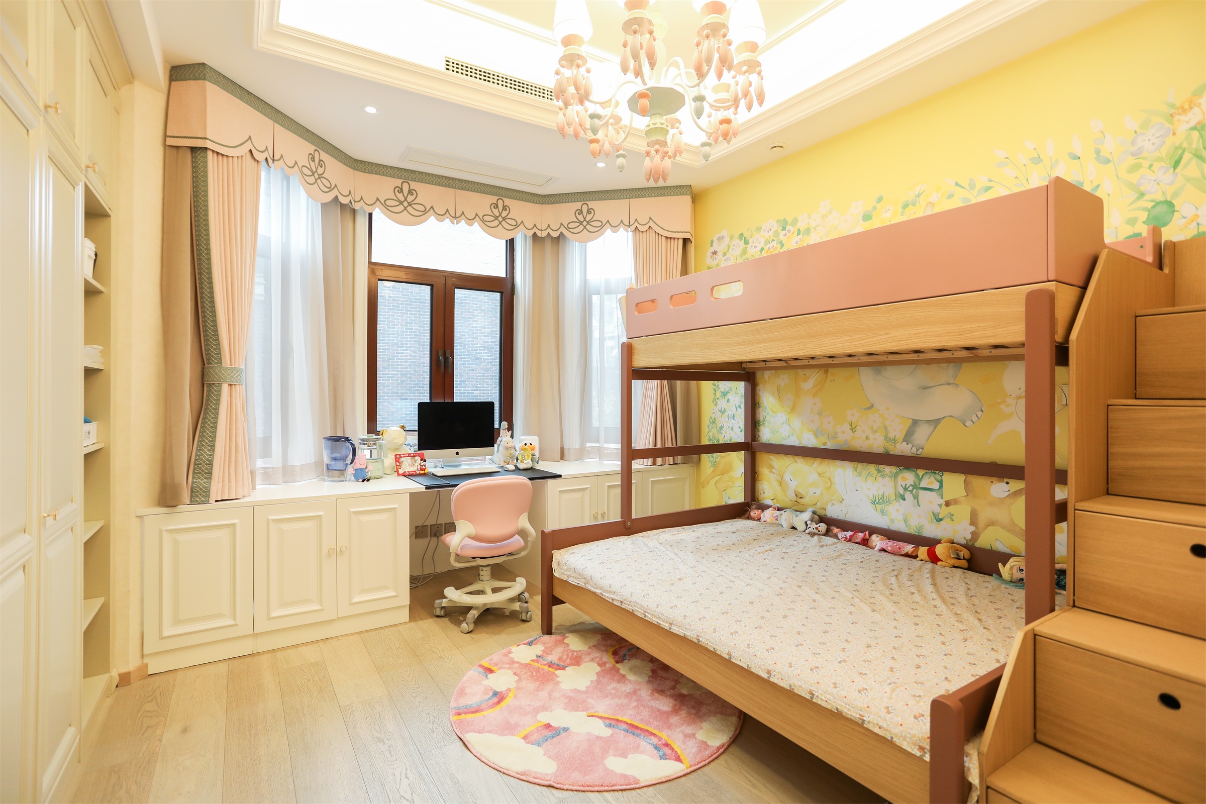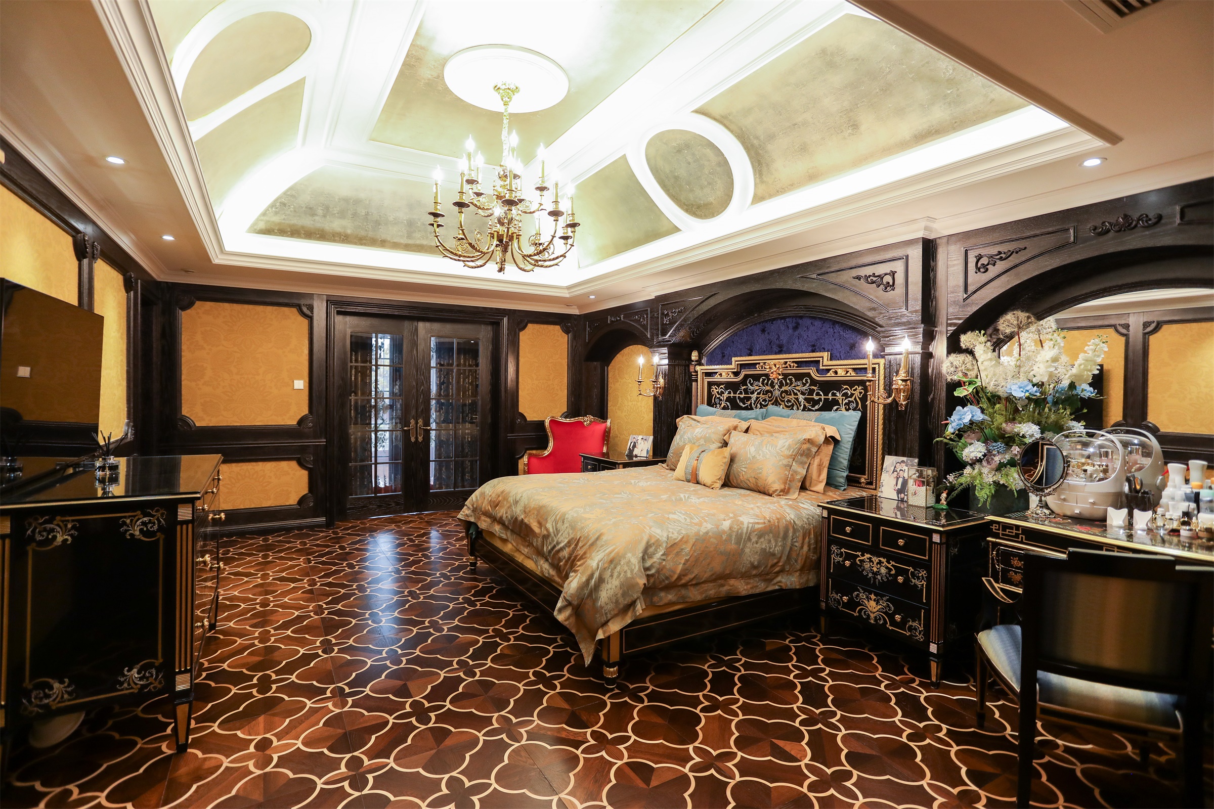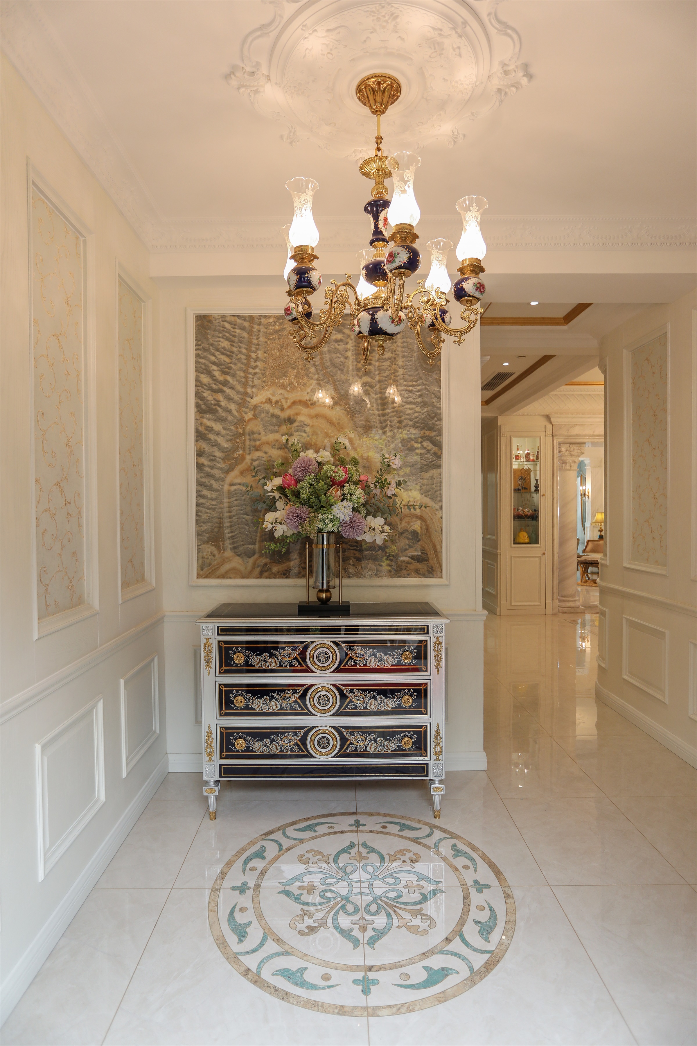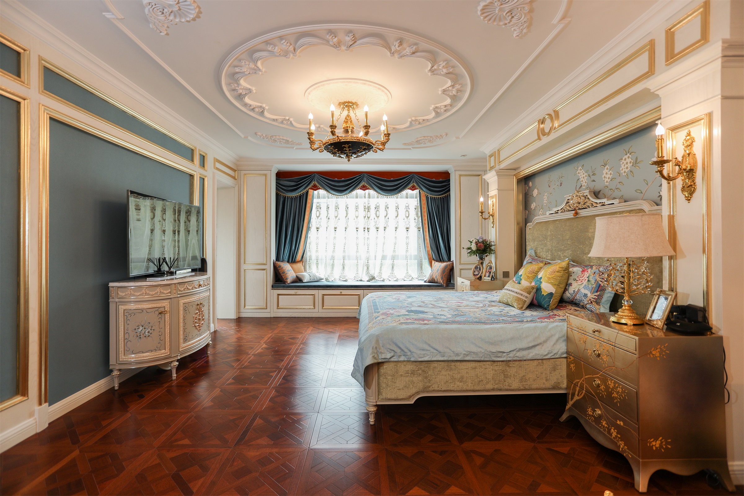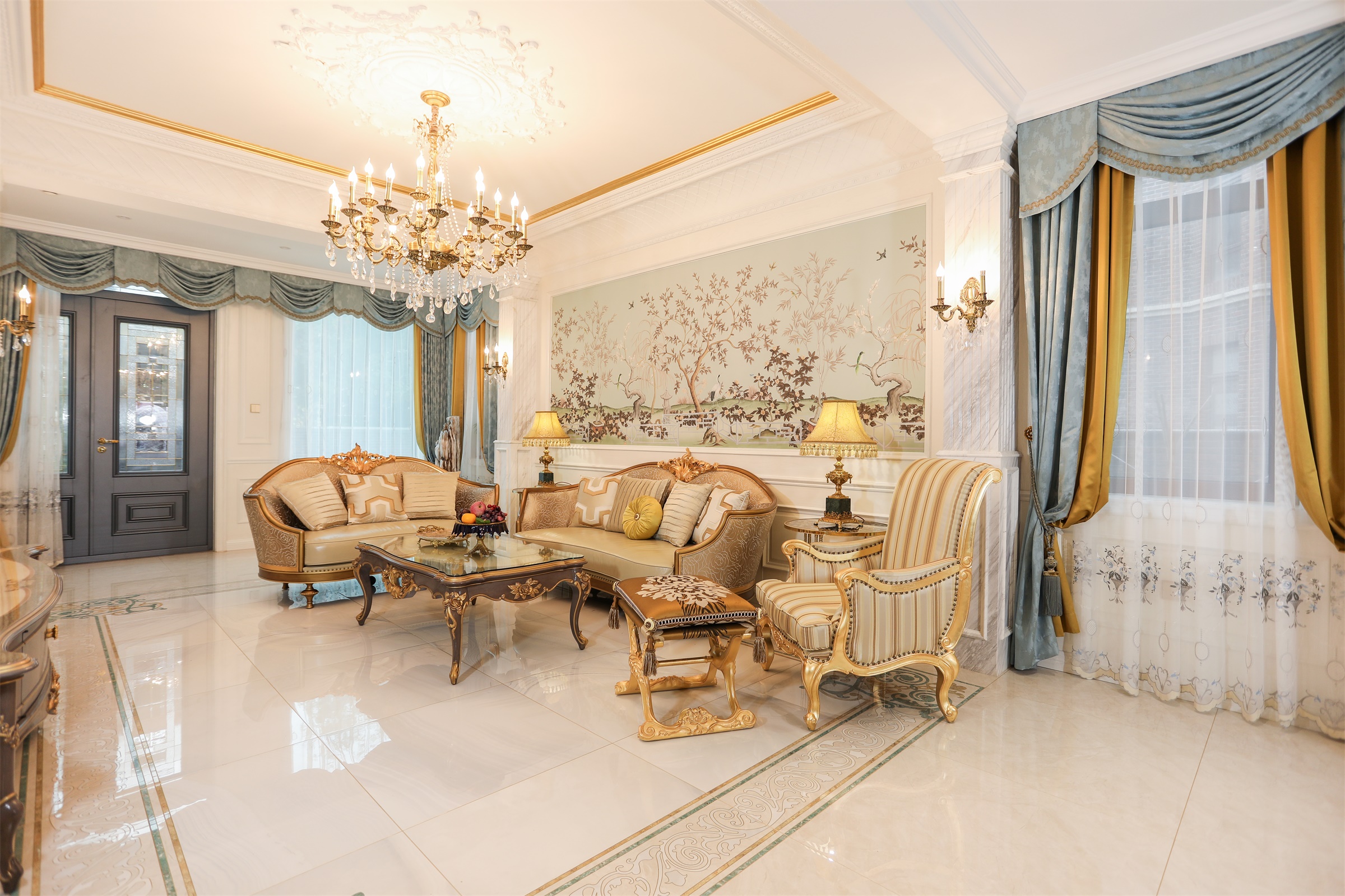 客厅、餐厅是每天踏上征途前振作精神的深呼吸,也是每天脱下伪装后松开领带的伸懒腰。这地方就该是个港湾,同时又是个堡垒。我们选择大面积的使用石材元素搭配轻奢系的质感家具突出一分让人心、踏实的厚重感。软装如窗帘等,佐以与主人职业应和的海洋色系,再将法式宫廷风格的明亮金色投射于墙面和天花板,赋予整个空间统一的风格与美感。从主卧开始,是更轻柔的暖,灵感有点像美丽的玛丽安托内特,渲染些洛可可的元素,在海蓝色系与象牙白、玫瑰金的轮舞协奏中,试图给主人一种文艺又慵懒的舒适感。老人家对华贵、大气的波旁王朝宫廷风格颇为青睐,于是他们的卧室我便以此为主旨描画,配色上,藏了一点心机,选择了国人的正色——玄色,与银杏黄、檀木色为主的变化。儿童房尽管仍然是古典主义宫廷风的支形吊灯,但色彩与质感更清新活泼,主题动物壁纸、与上下铺原木床,是希望孩子即使成长在钢筋水泥的都市丛林,但依然可以在自己的房间里想象一个只属于自己的“秘密花园”。