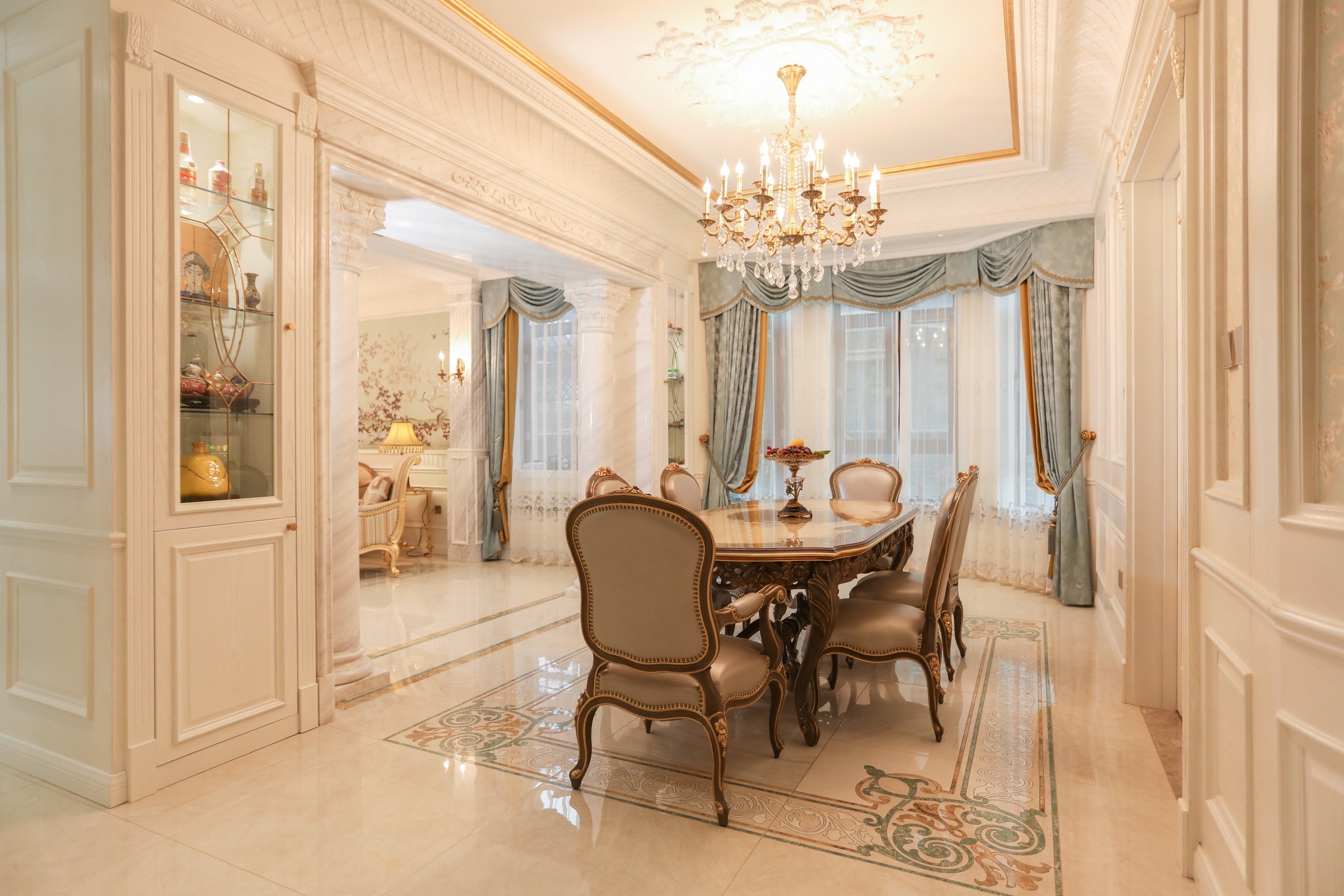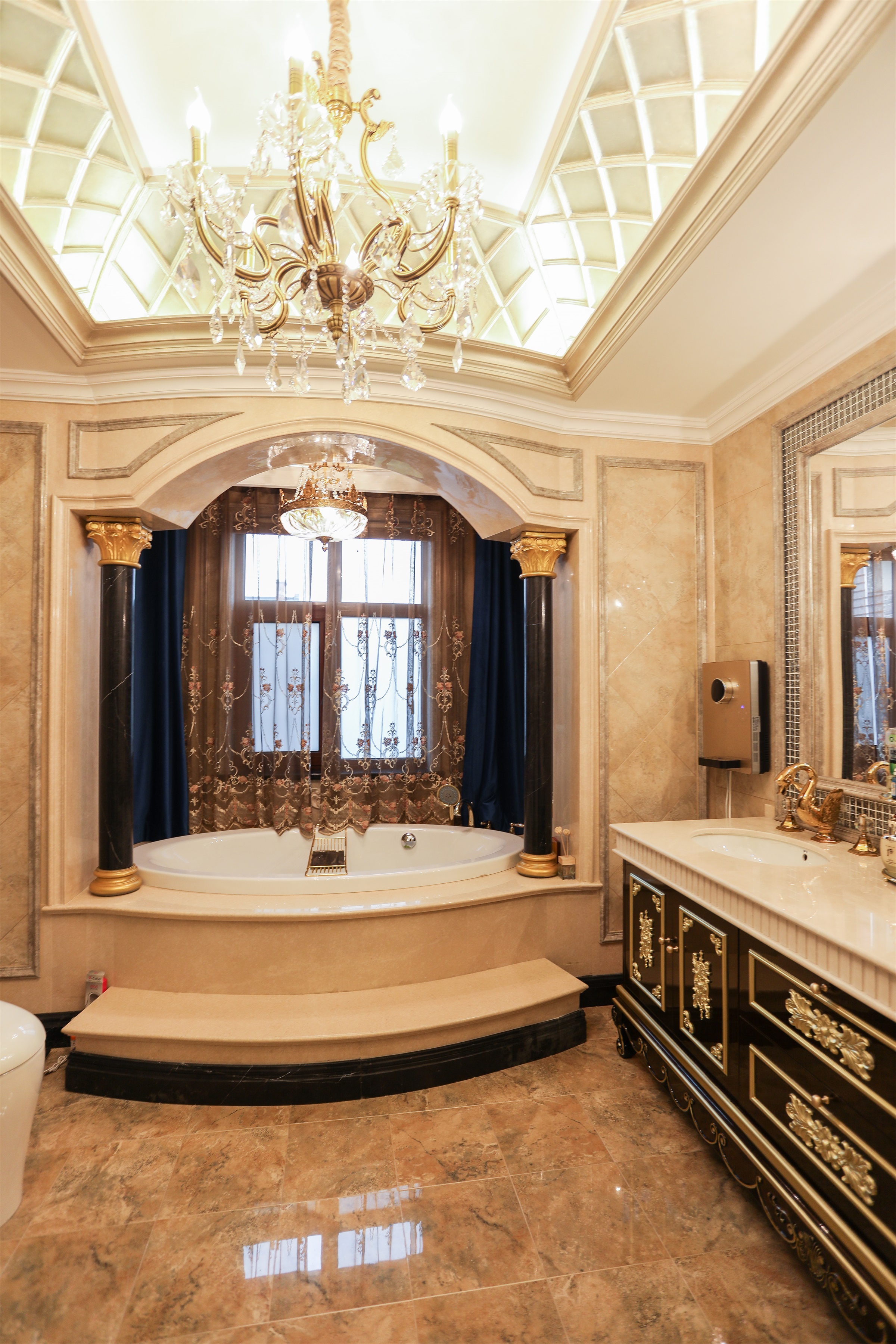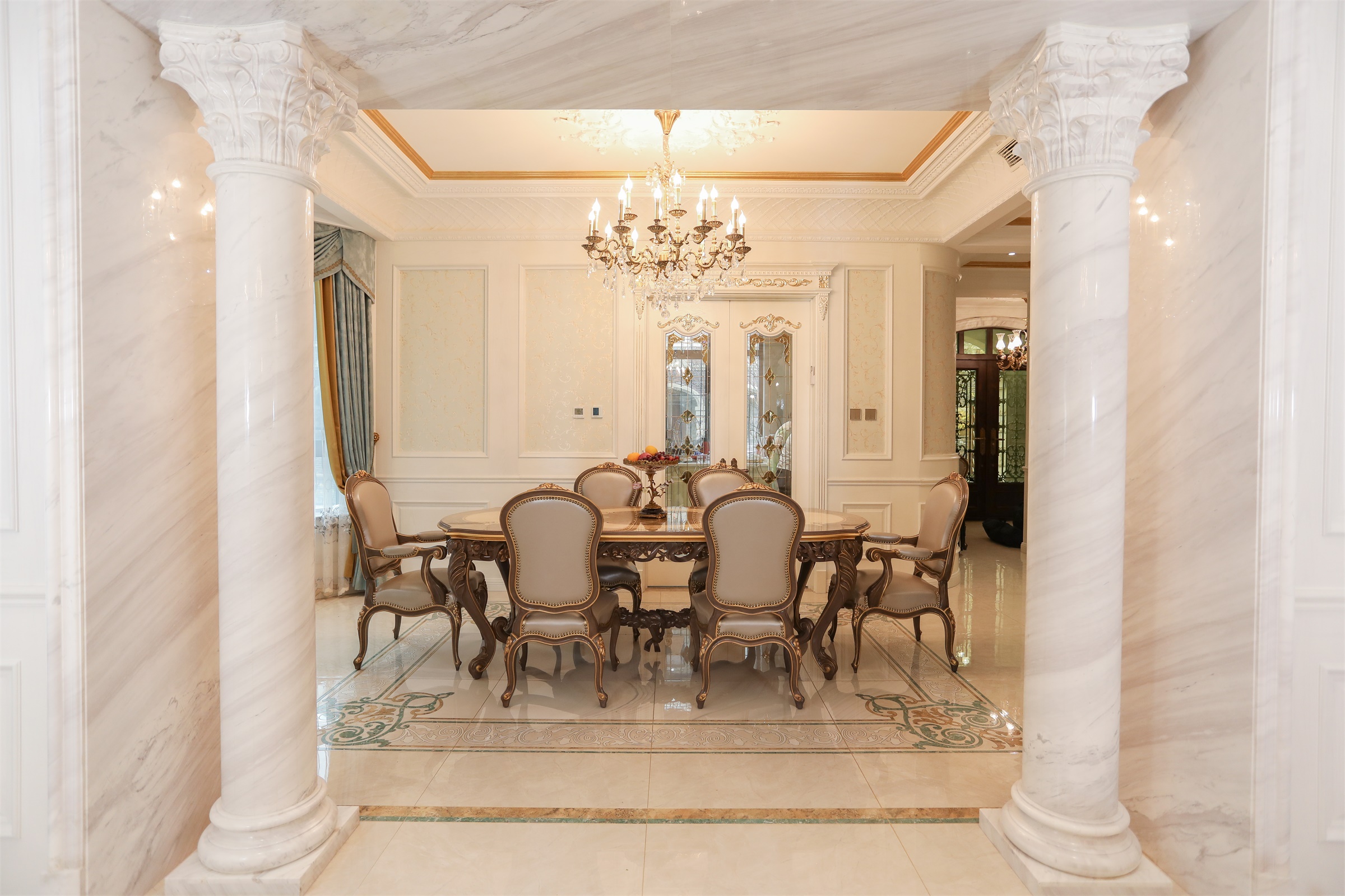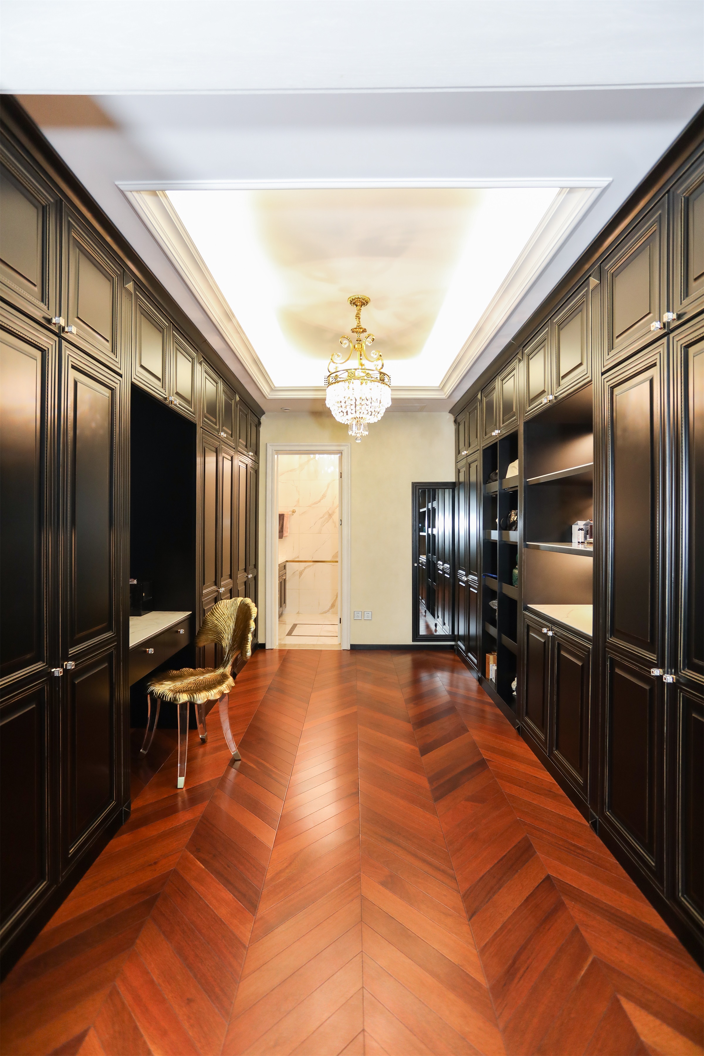 客厅、餐厅是每天踏上征途前振作精神的深呼吸,也是每天脱下伪装后松开领带的伸懒腰。这地方就该是个港湾,同时又是个堡垒。我们选择大面积的使用石材元素搭配轻奢系的质感家具突出一分让人心、踏实的厚重感。软装如窗帘等,佐以与主人职业应和的海洋色系,再将法式宫廷风格的明亮金色投射于墙面和天花板,赋予整个空间统一的风格与美感。从主卧开始,是更轻柔的暖,灵感有点像美丽的玛丽安托内特,渲染些洛可可的元素,在海蓝色系与象牙白、玫瑰金的轮舞协奏中,试图给主人一种文艺又慵懒的舒适感。老人家对华贵、大气的波旁王朝宫廷风格颇为青睐,于是他们的卧室我便以此为主旨描画,配色上,藏了一点心机,选择了国人的正色——玄色,与银杏黄、檀木色为主的变化。儿童房尽管仍然是古典主义宫廷风的支形吊灯,但色彩与质感更清新活泼,主题动物壁纸、与上下铺原木床,是希望孩子即使成长在钢筋水泥的都市丛林,但依然可以在自己的房间里想象一个只属于自己的“秘密花园”。