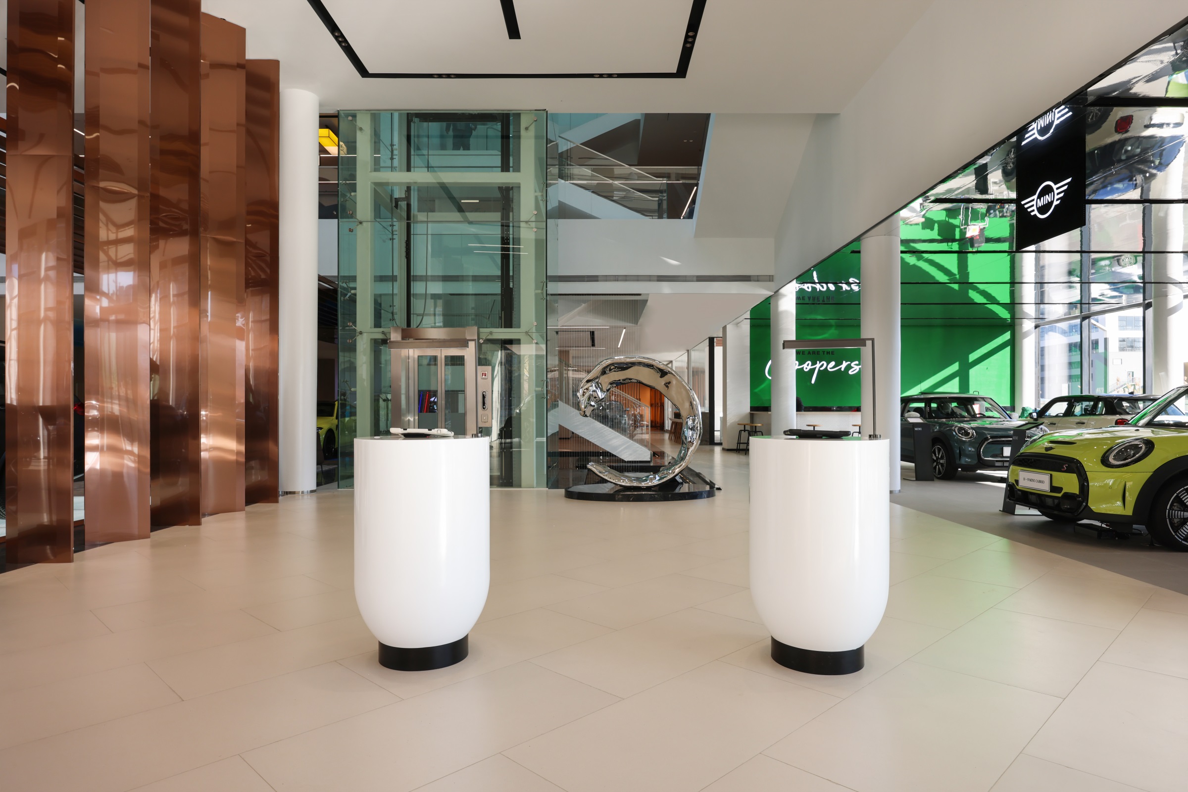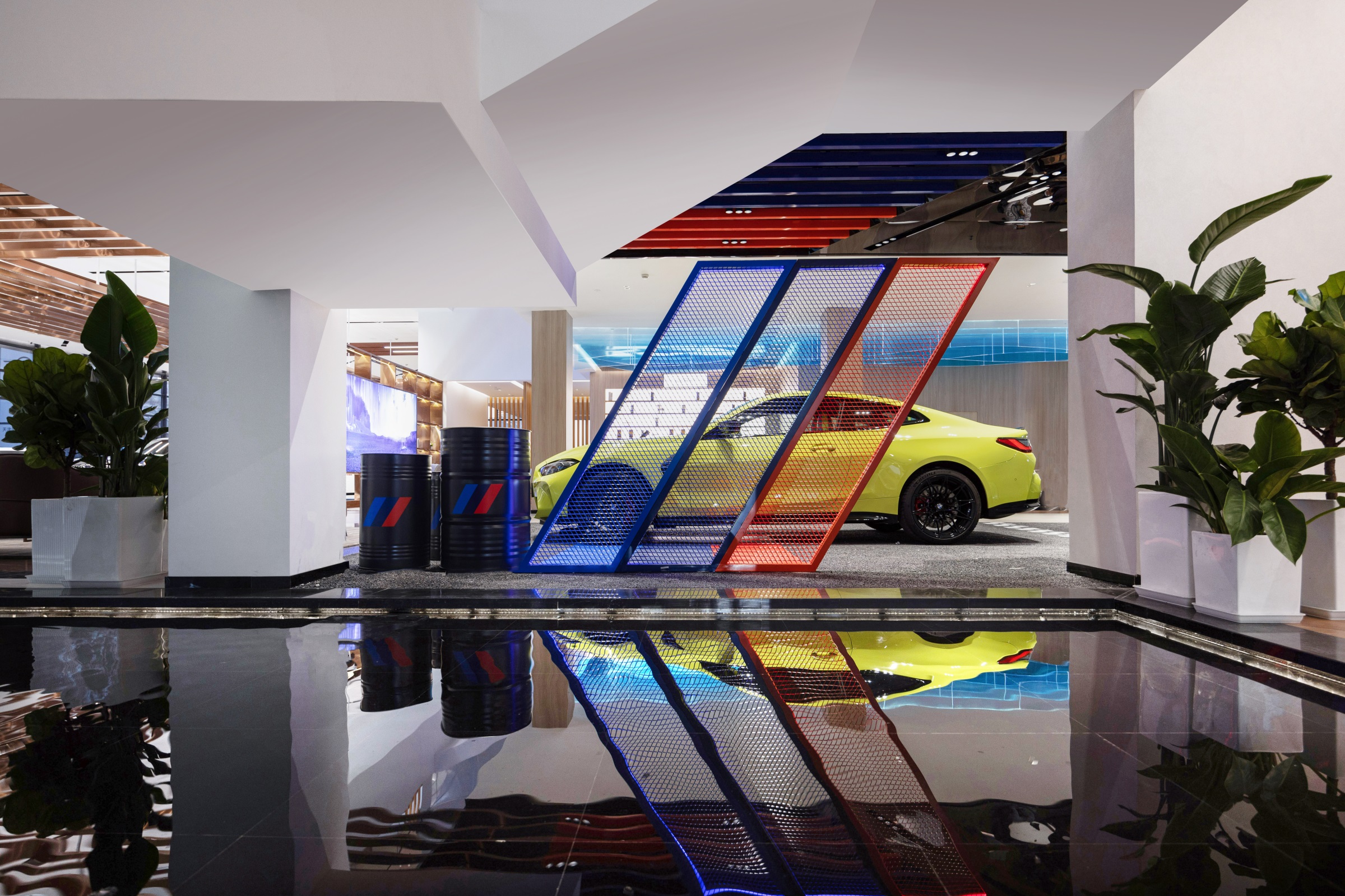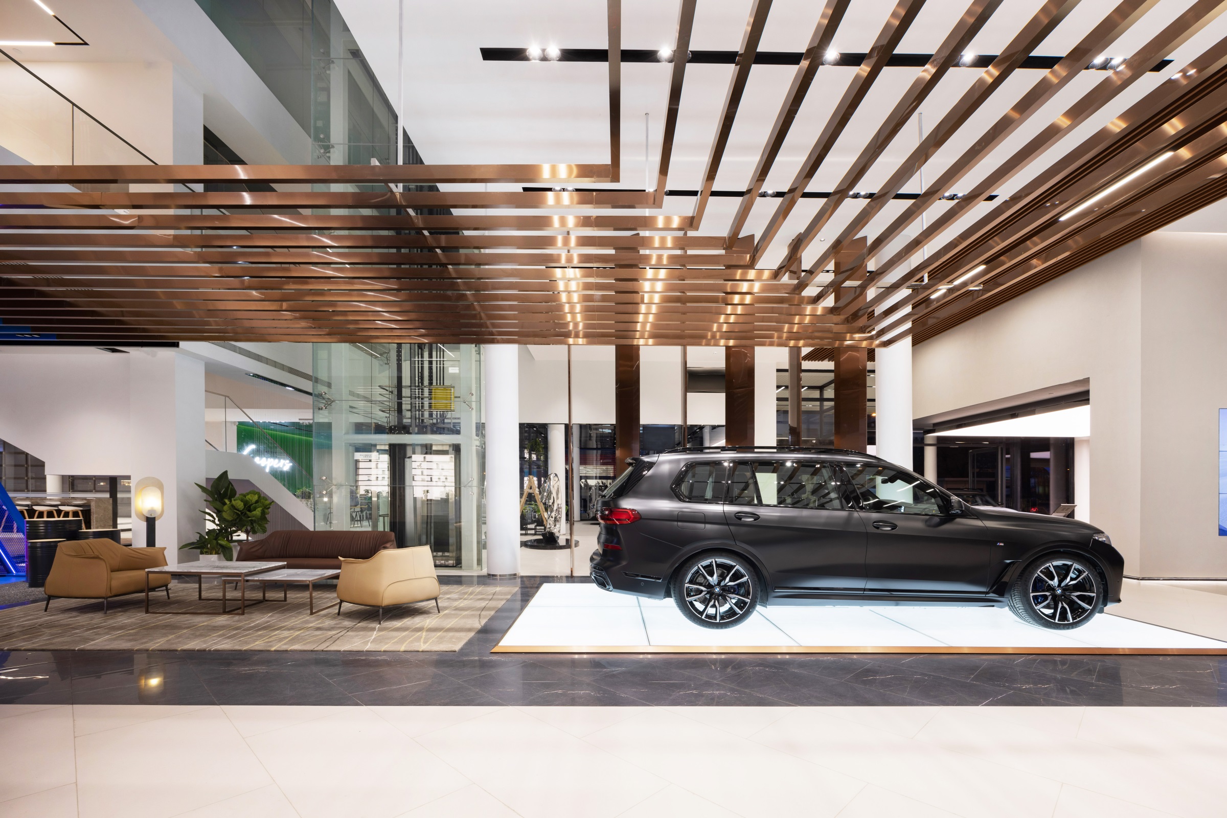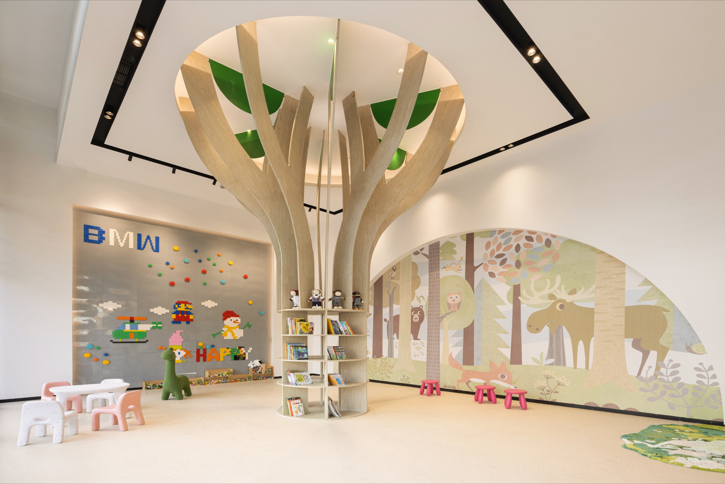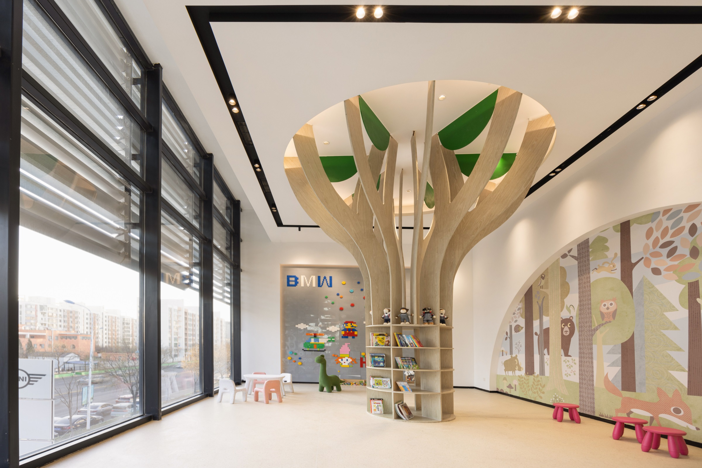 随着玻璃感应门的开启,硬朗的金属线条印入眼帘,辅以柔和的暖光氛围营造,赋予来客宾至如归的舒适体验。Hero展区进一步将未来科技的临场感推至极致。与之对应的GKL+展区,以凌厉的墨金色金属格栅切分出空间层次与区域界限,暗喻品牌踏过历史的烟尘却不褪锋芒。轻触壁龛前的按钮,随着暗门的打开,新车交付车间露出真容,戏剧张力十足。设计师选择以简释繁的形式打造内墙与软装,使空间的焦点回归到产品本身,同时,仪式感的营造也为消费者提供了充足的情绪价值。宝马Minicooper展区明亮的光线与镜面式吊顶,汲取了电影《The Italian Job》的元素,打造出既摩登又科技的沉浸式互动氛围。儿童娱乐区采用木制架构搭建参天大树,象征着生命力,也隐喻着成长意义。墙面绘出一片暖色调的墙画森林,童真尽显,生趣盎然。