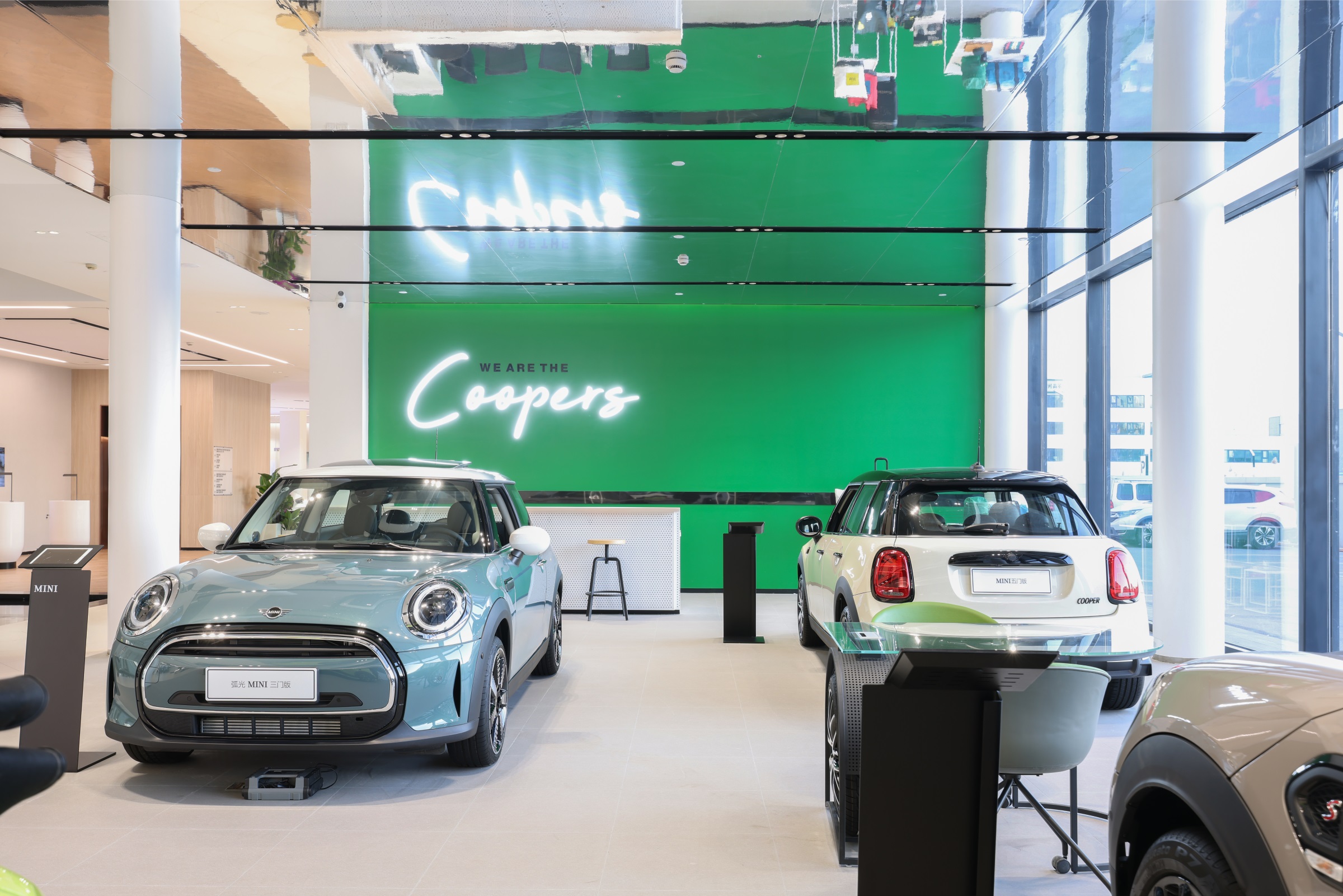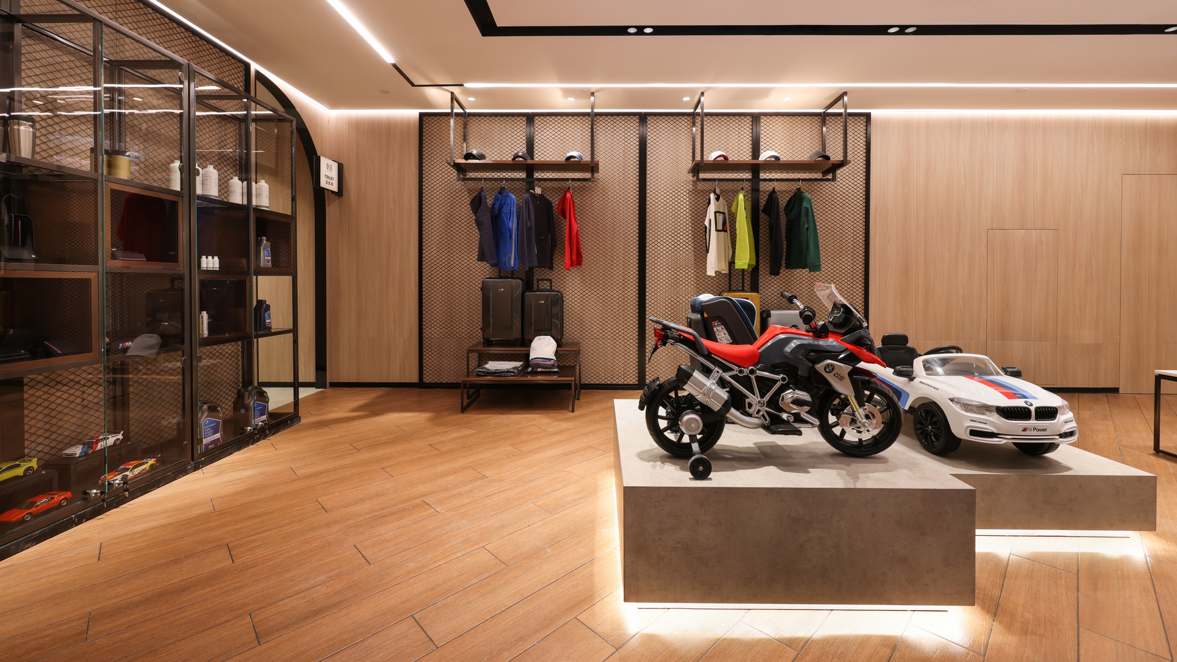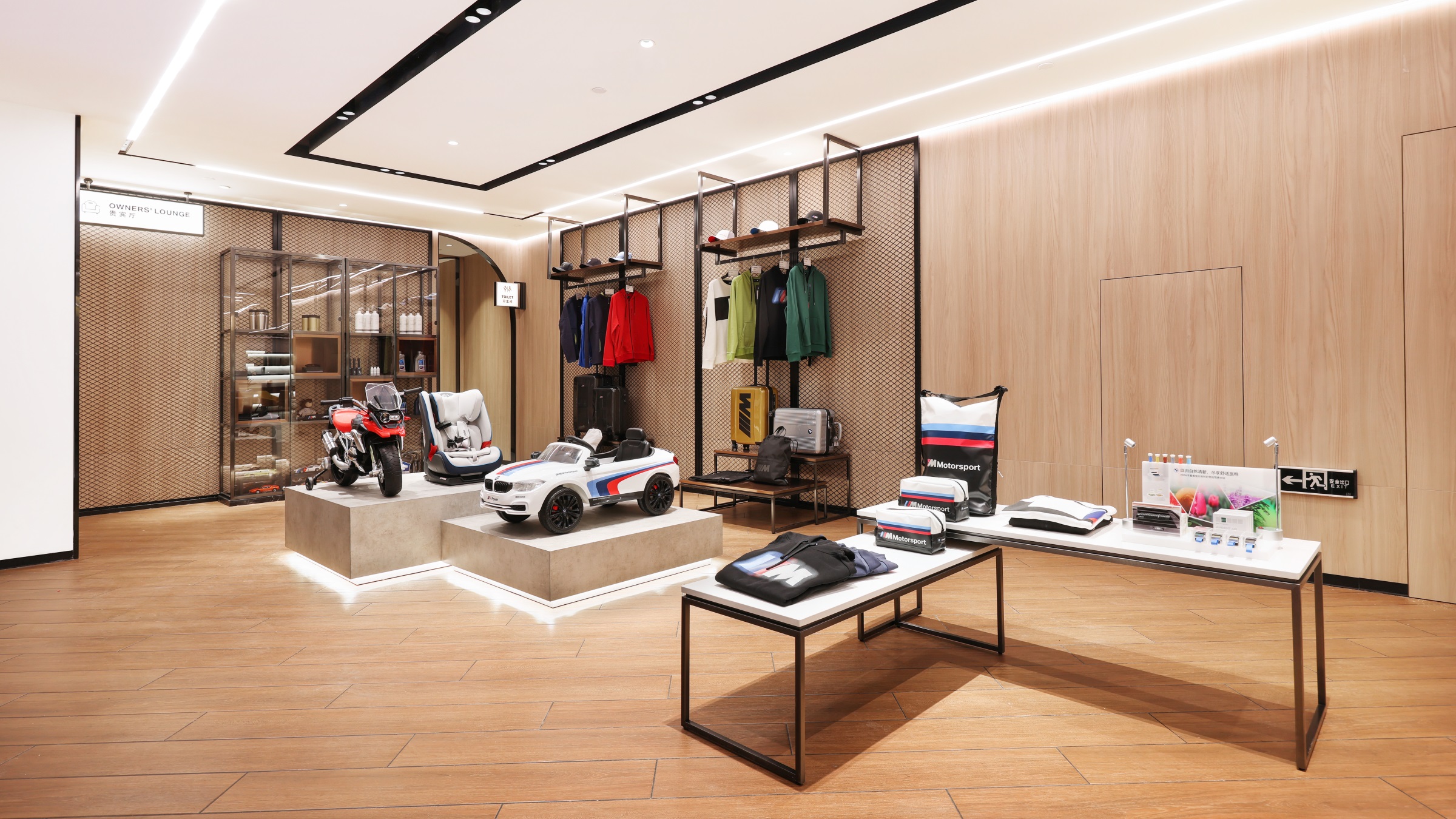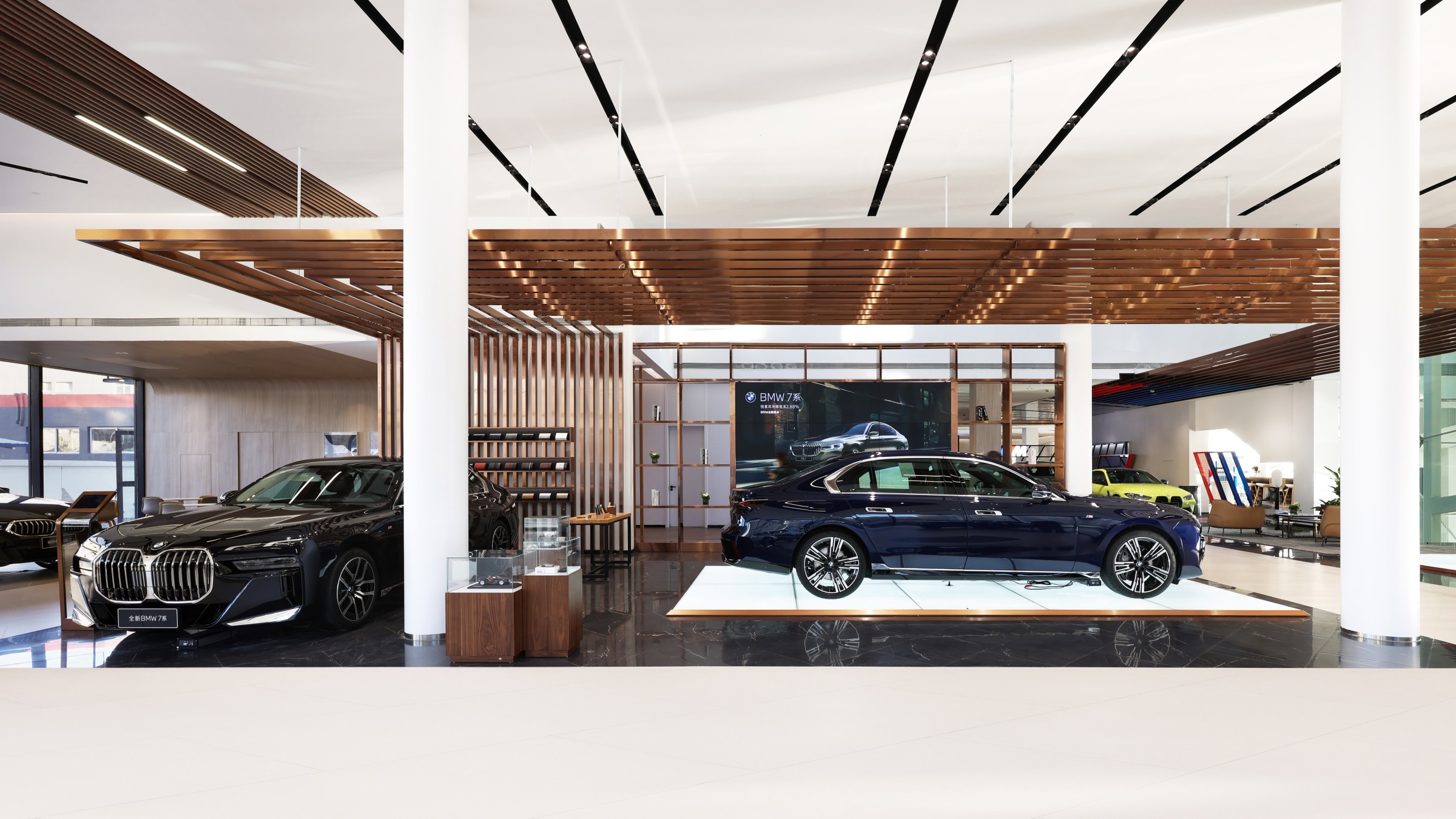随着玻璃感应门的开启,硬朗的金属线条印入眼帘,辅以柔和的暖光氛围营造,赋予来客宾至如归的舒适体验。Hero展区进一步将未来科技的临场感推至极致。与之对应的GKL+展区,以凌厉的墨金色金属格栅切分出空间层次与区域界限,暗喻品牌踏过历史的烟尘却不褪锋芒。轻触壁龛前的按钮,随着暗门的打开,新车交付车间露出真容,戏剧张力十足。设计师选择以简释繁的形式打造内墙与软装,使空间的焦点回归到产品本身,同时,仪式感的营造也为消费者提供了充足的情绪价值。宝马Minicooper展区明亮的光线与镜面式吊顶,汲取了电影《The Italian Job》的元素,打造出既摩登又科技的沉浸式互动氛围。儿童娱乐区采用木制架构搭建参天大树,象征着生命力,也隐喻着成长意义。墙面绘出一片暖色调的墙画森林,童真尽显,生趣盎然。