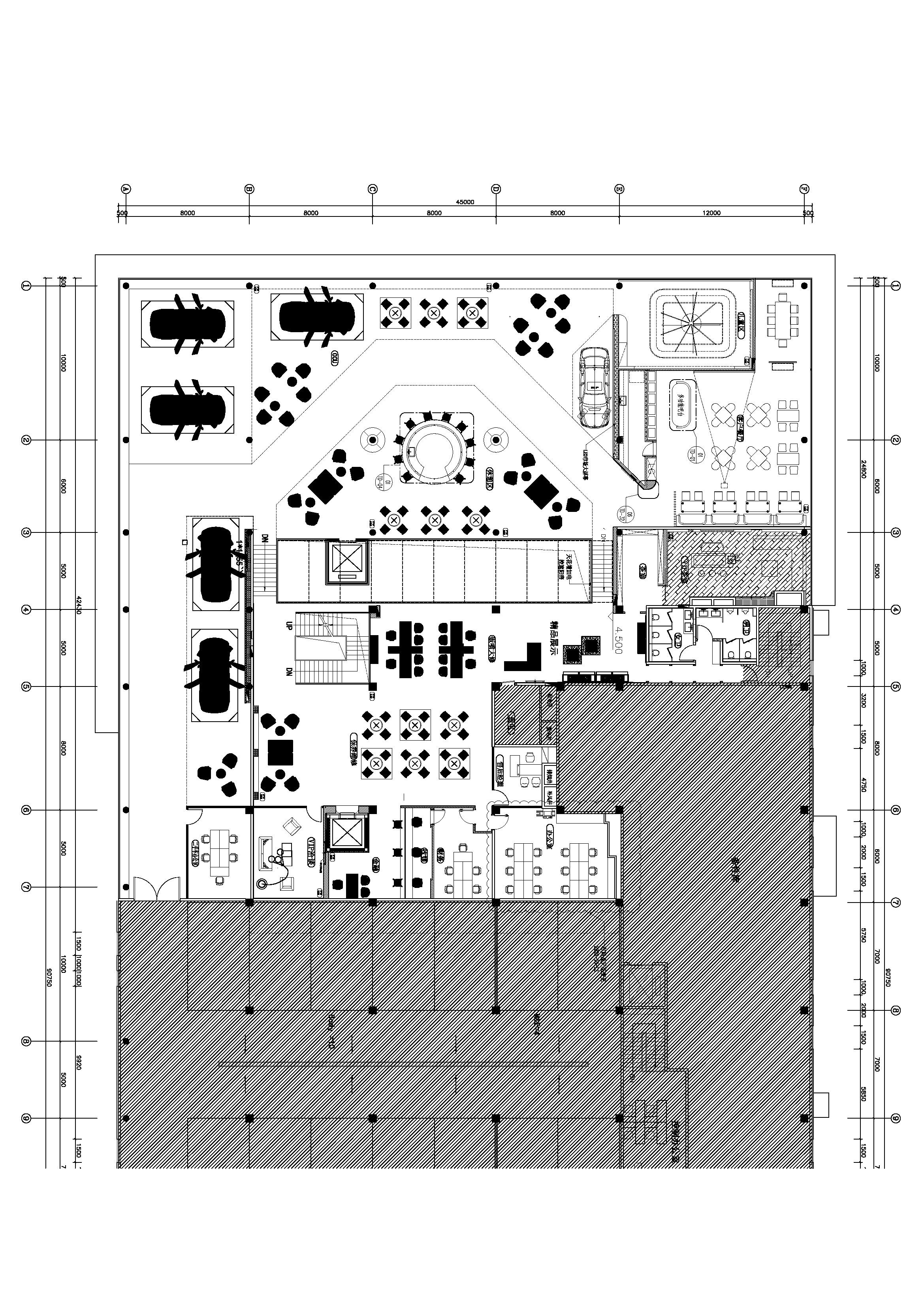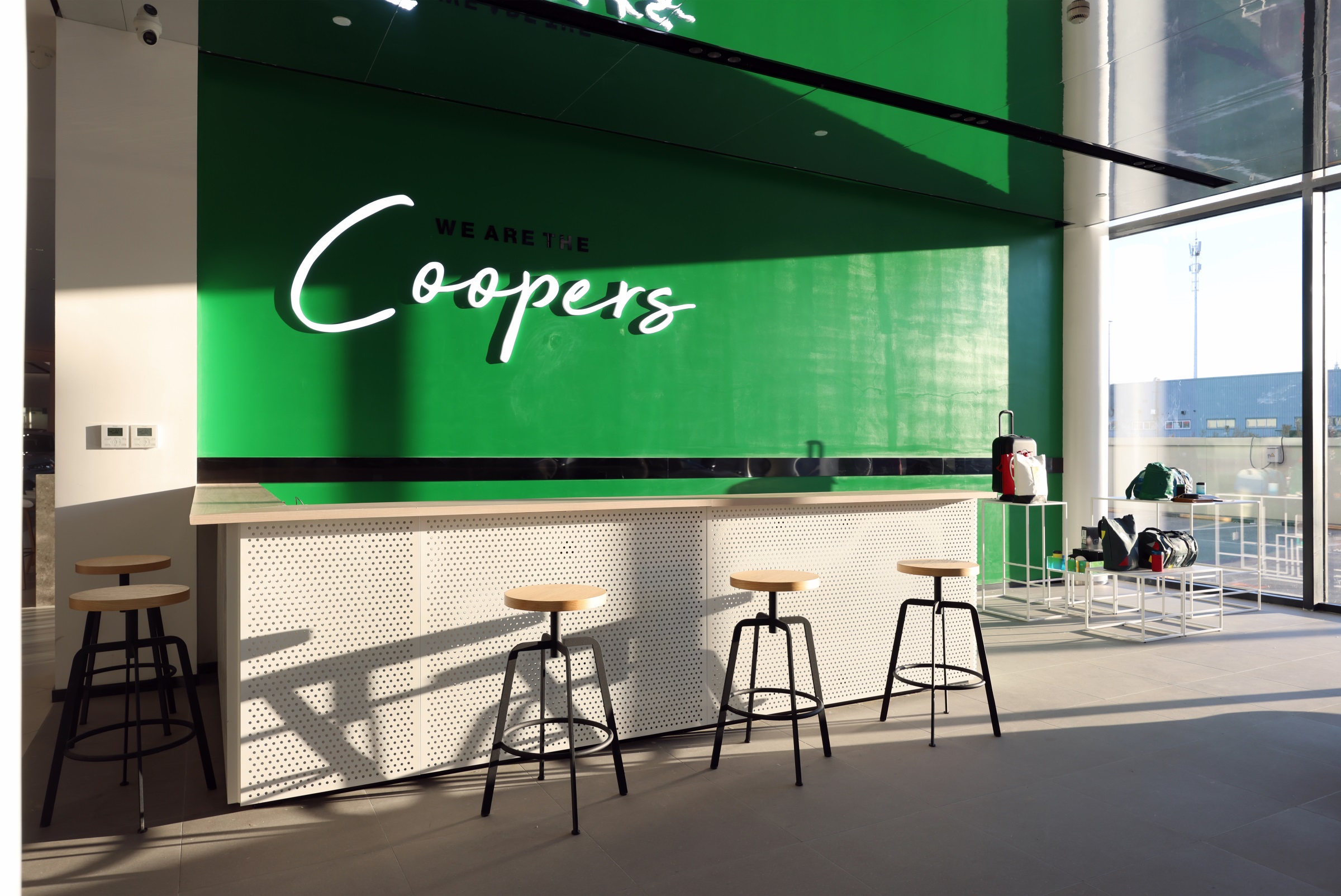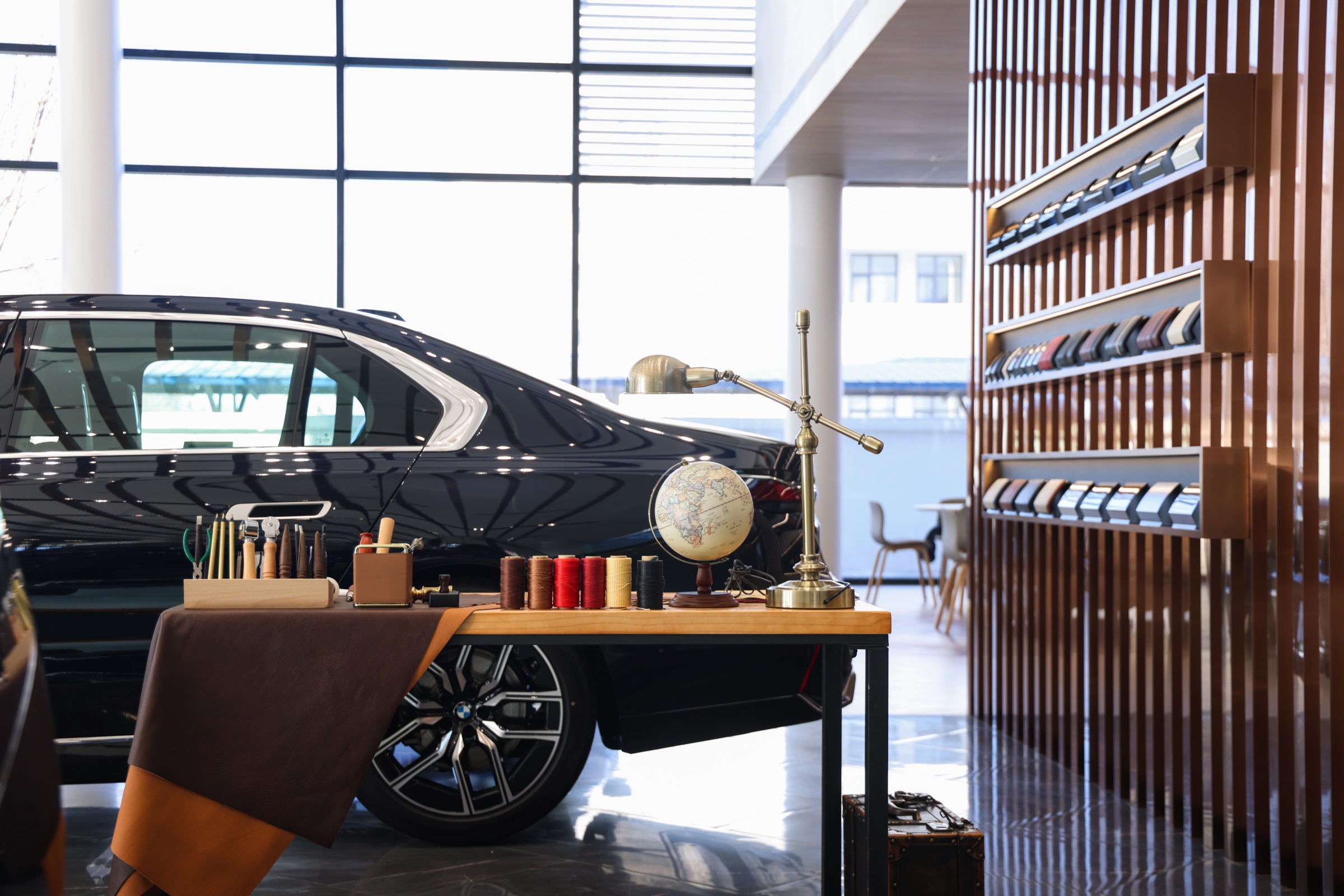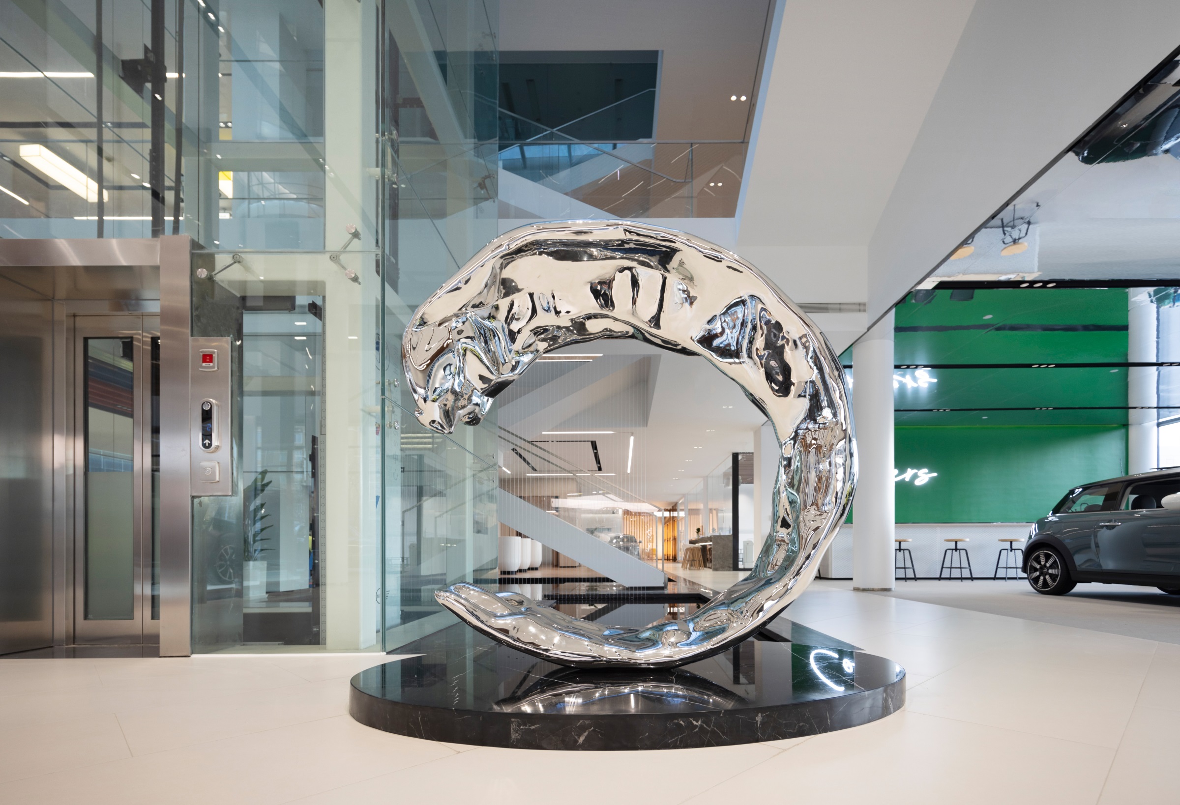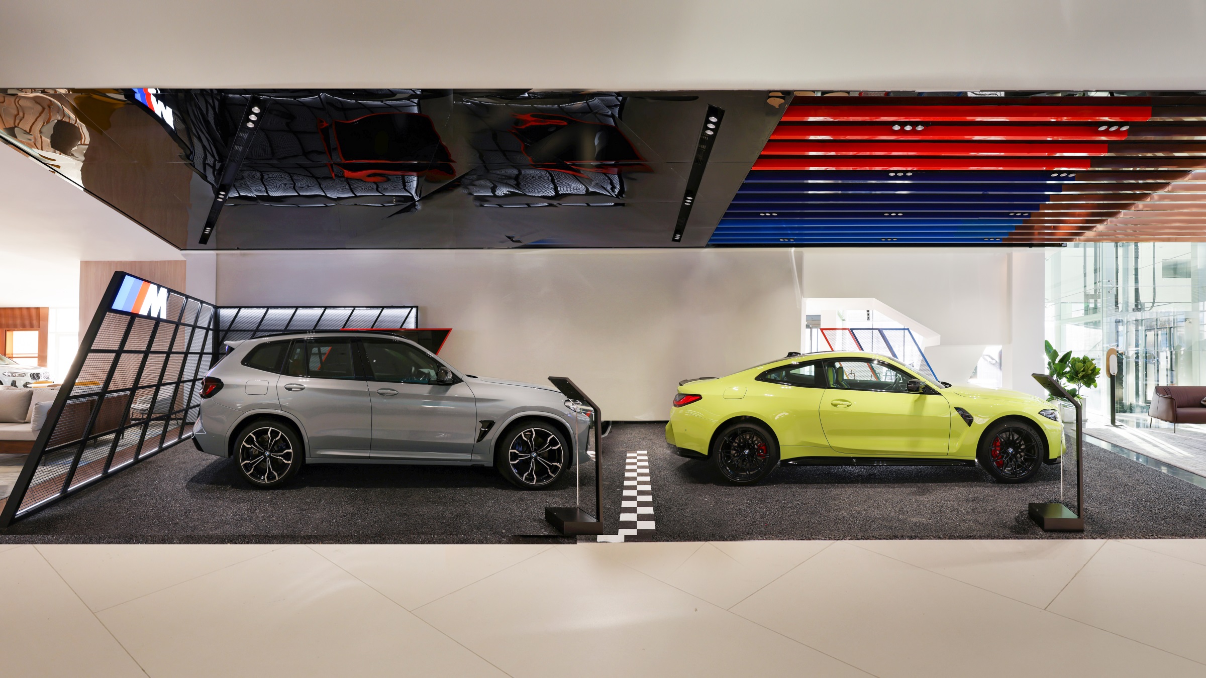 随着玻璃感应门的开启,硬朗的金属线条印入眼帘,辅以柔和的暖光氛围营造,赋予来客宾至如归的舒适体验。Hero展区进一步将未来科技的临场感推至极致。与之对应的GKL+展区,以凌厉的墨金色金属格栅切分出空间层次与区域界限,暗喻品牌踏过历史的烟尘却不褪锋芒。轻触壁龛前的按钮,随着暗门的打开,新车交付车间露出真容,戏剧张力十足。设计师选择以简释繁的形式打造内墙与软装,使空间的焦点回归到产品本身,同时,仪式感的营造也为消费者提供了充足的情绪价值。宝马Minicooper展区明亮的光线与镜面式吊顶,汲取了电影《The Italian Job》的元素,打造出既摩登又科技的沉浸式互动氛围。儿童娱乐区采用木制架构搭建参天大树,象征着生命力,也隐喻着成长意义。墙面绘出一片暖色调的墙画森林,童真尽显,生趣盎然。