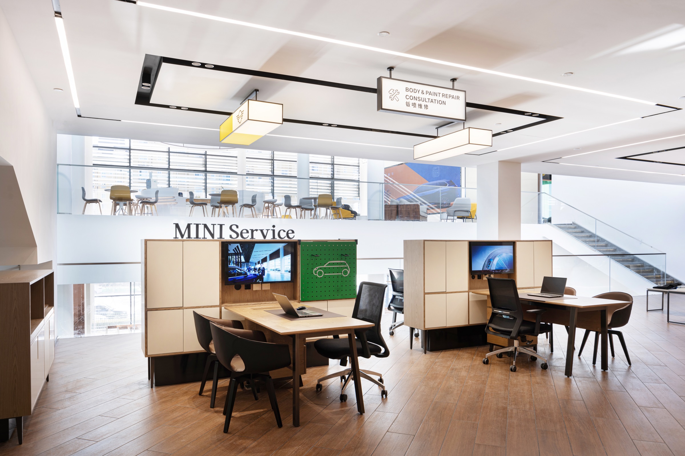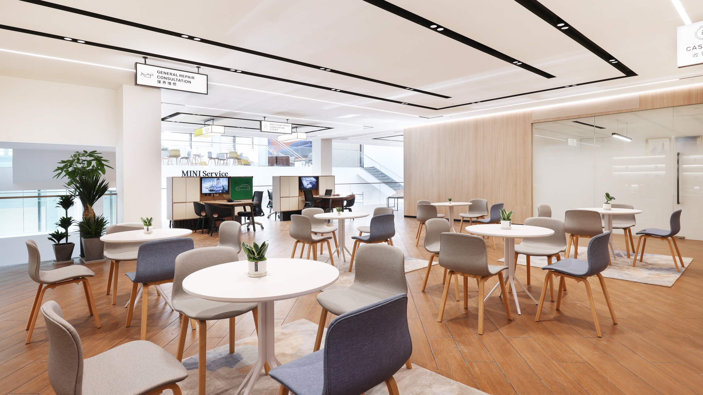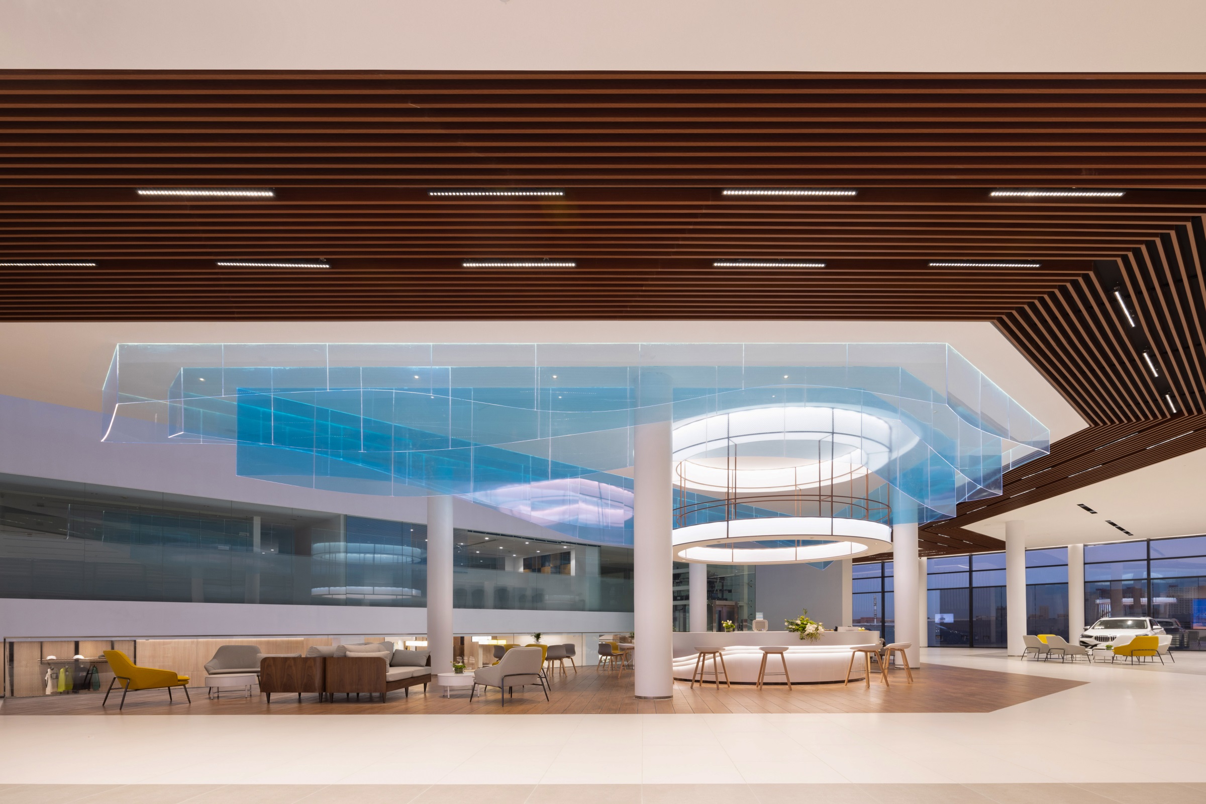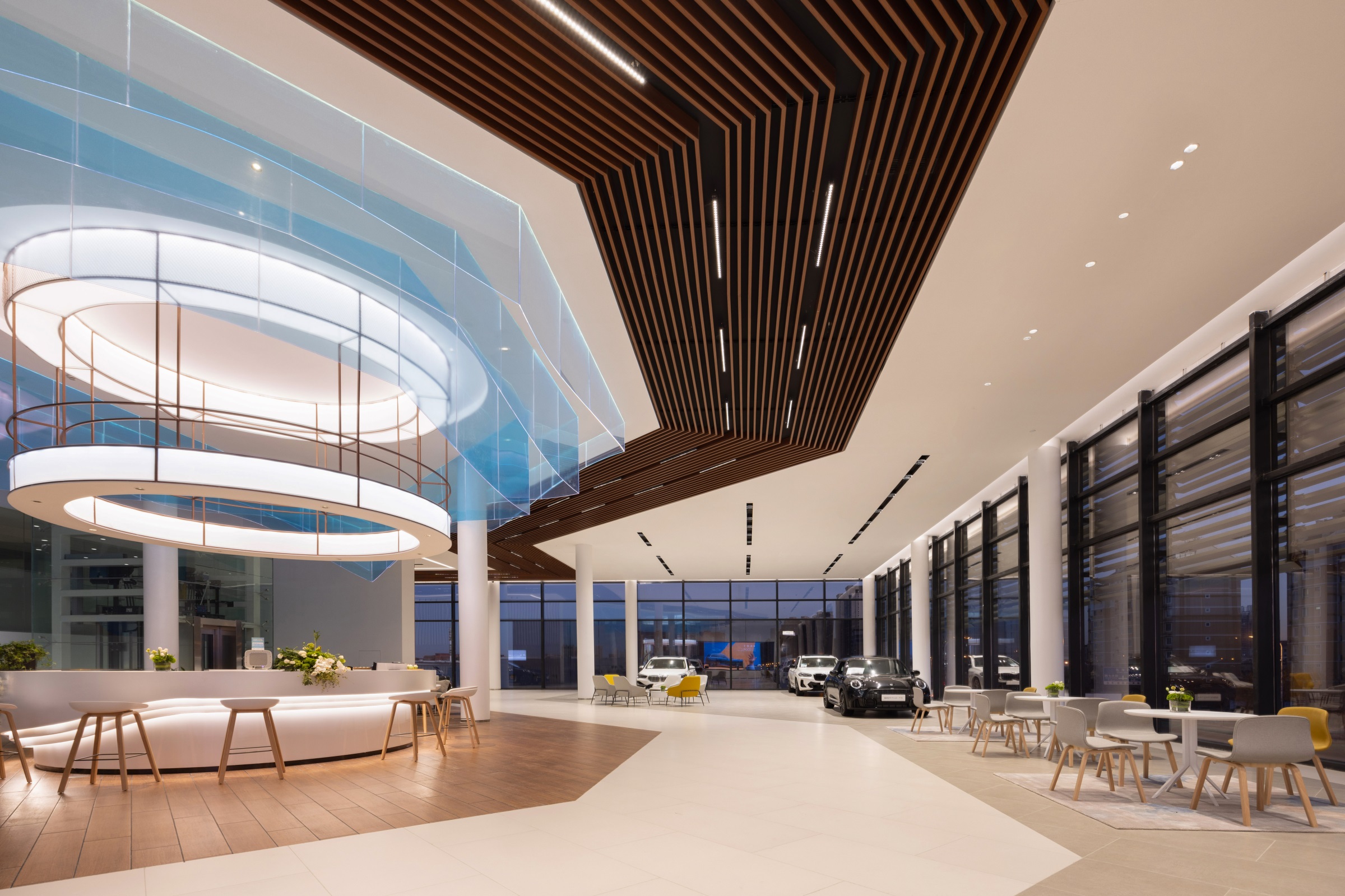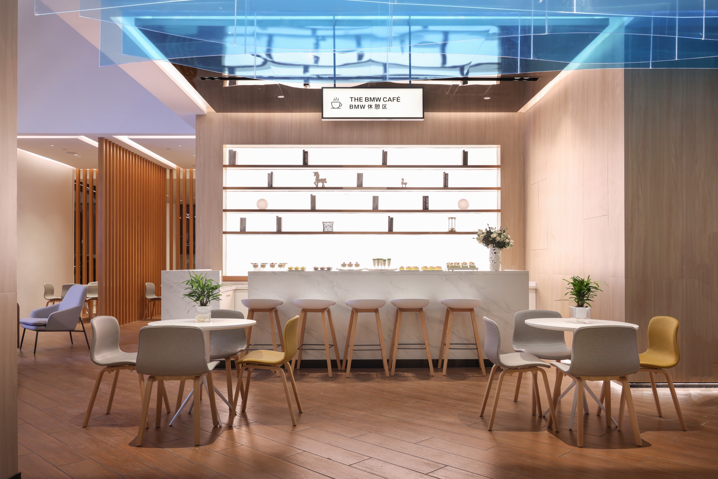 整个项目围绕一种独特的、贯穿式的环形动线而设计,一二层的天花板吊顶采用蓝色亚克力透光板覆膜,其造型既象征BMW赛车的动态行驶轨迹,又寓意流动的水波纹,呼应由水幕与水池组成的水系景观,BMW标志性的三色斜杠化身隔断傲立水畔,本体与镜像相映成趣,于静态中体会动感。步入二层,极具质感的原木风客休区先声夺人,轻松的基调油然而生。莫兰迪色系的桌椅有致摆放,设计师透过纯粹的材质、多元的布局、雅致的陈设,创造一个充满自然与愉悦的场所。 拾阶而上,二层半的位置设有餐厅及功能展示空间,大幅的落地飘窗既让柔和的光线倾斜洒入,也让客人得以将室外美景一览无余。以不同材质、形式的隔断巧妙分区,即使多人的用餐环境,仍能确保客人的私密性和舒适性。