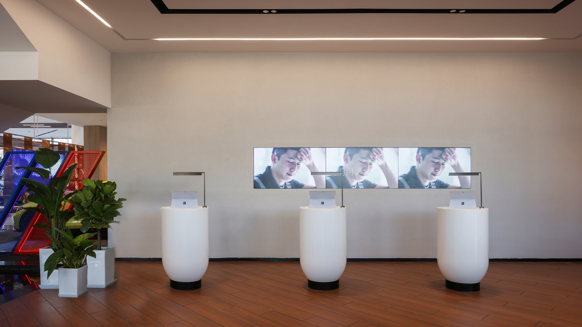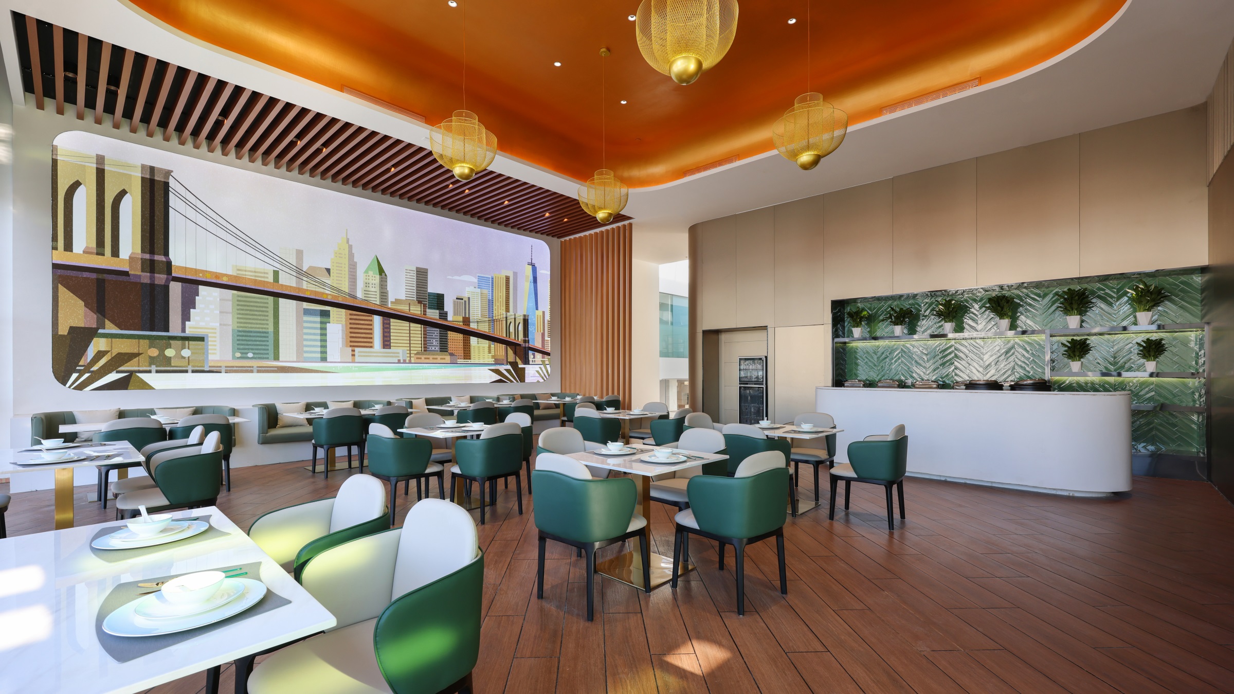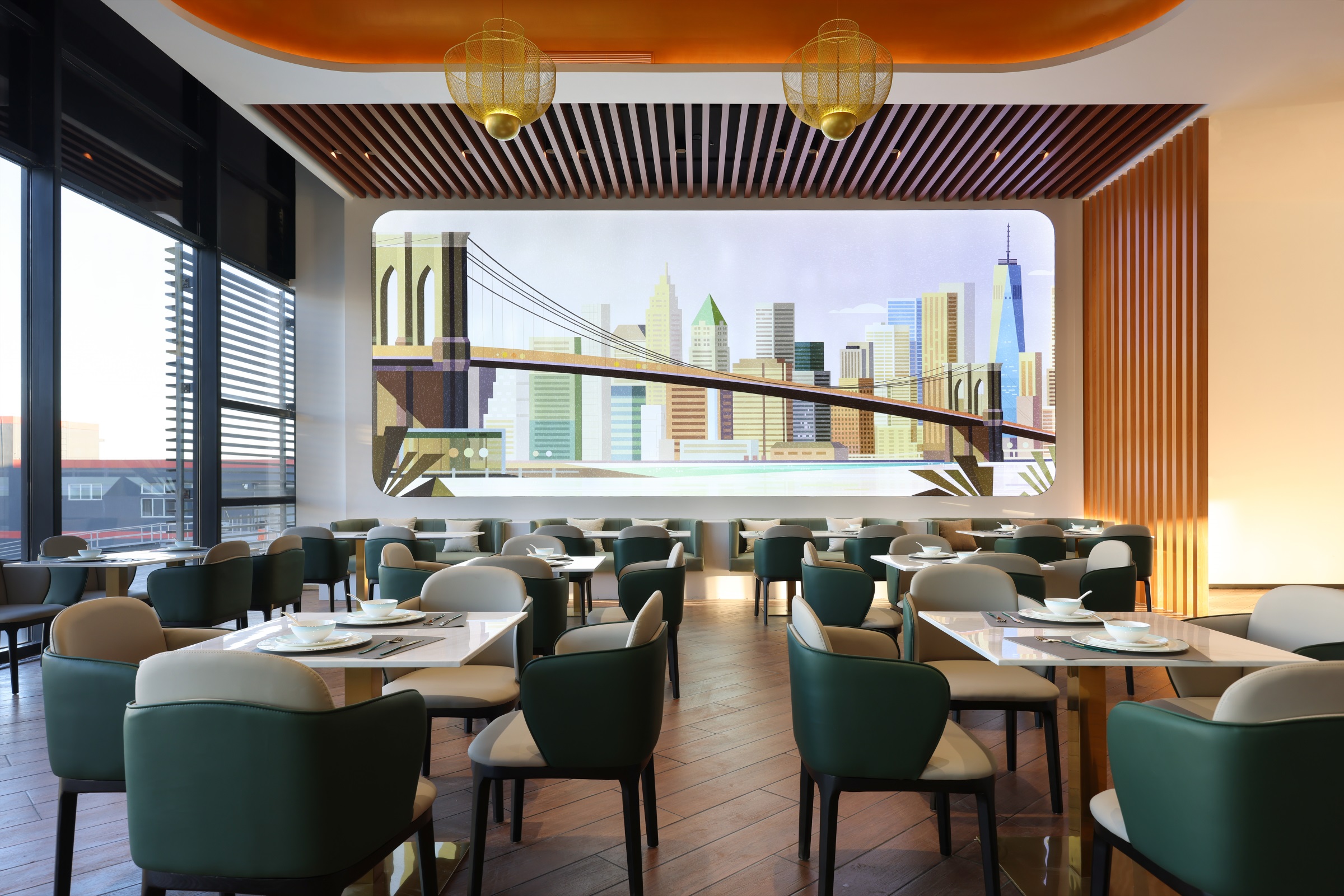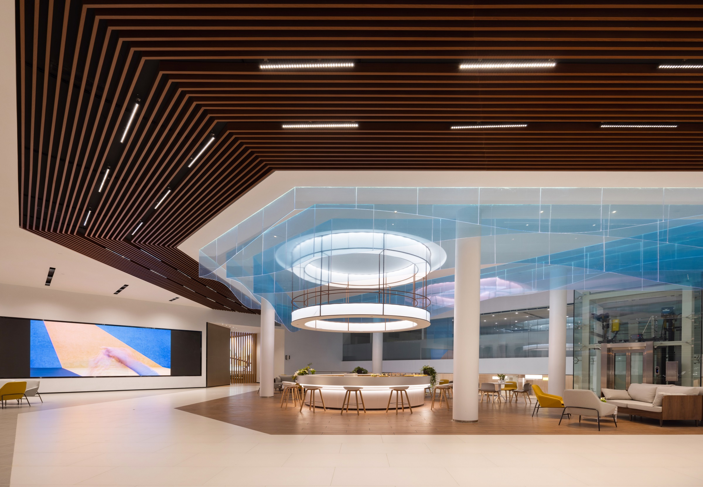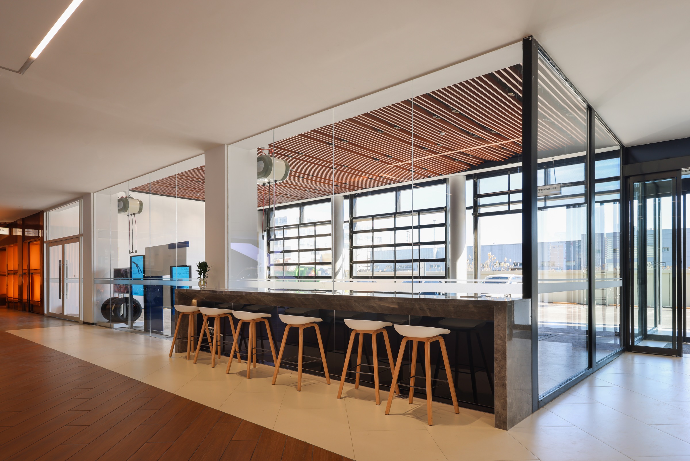 整个项目围绕一种独特的、贯穿式的环形动线而设计,一二层的天花板吊顶采用蓝色亚克力透光板覆膜,其造型既象征BMW赛车的动态行驶轨迹,又寓意流动的水波纹,呼应由水幕与水池组成的水系景观,BMW标志性的三色斜杠化身隔断傲立水畔,本体与镜像相映成趣,于静态中体会动感。步入二层,极具质感的原木风客休区先声夺人,轻松的基调油然而生。莫兰迪色系的桌椅有致摆放,设计师透过纯粹的材质、多元的布局、雅致的陈设,创造一个充满自然与愉悦的场所。 拾阶而上,二层半的位置设有餐厅及功能展示空间,大幅的落地飘窗既让柔和的光线倾斜洒入,也让客人得以将室外美景一览无余。以不同材质、形式的隔断巧妙分区,即使多人的用餐环境,仍能确保客人的私密性和舒适性。