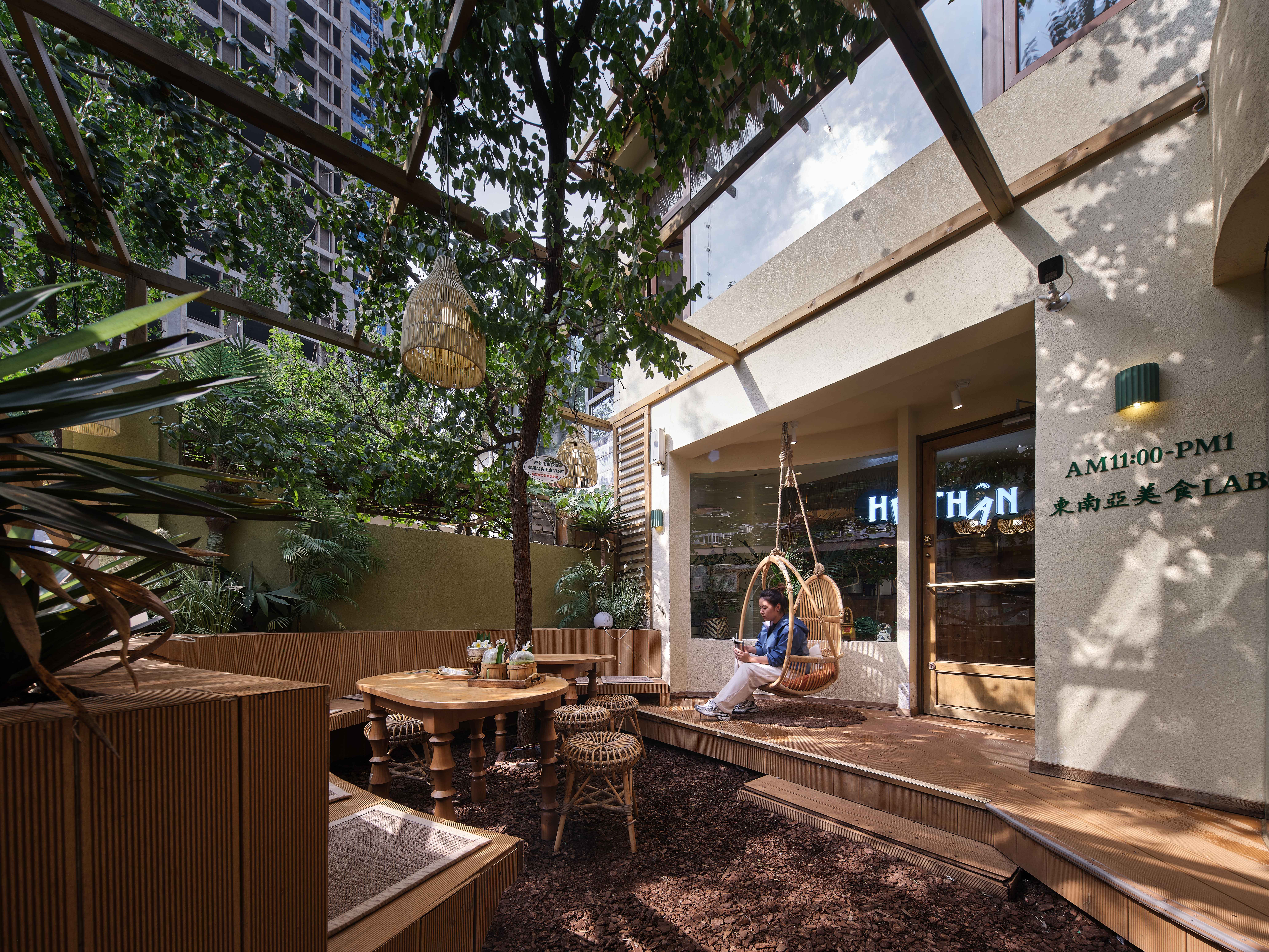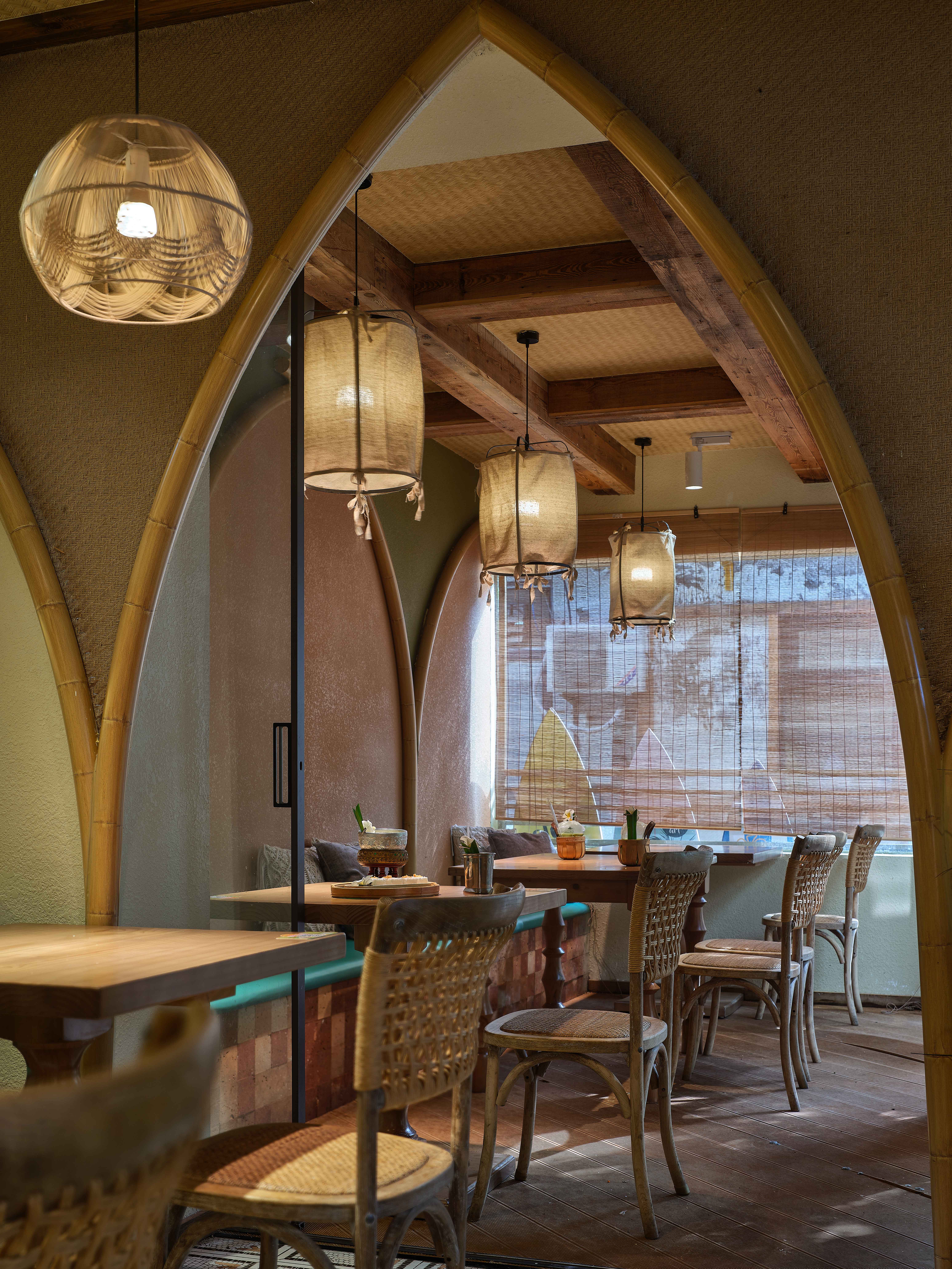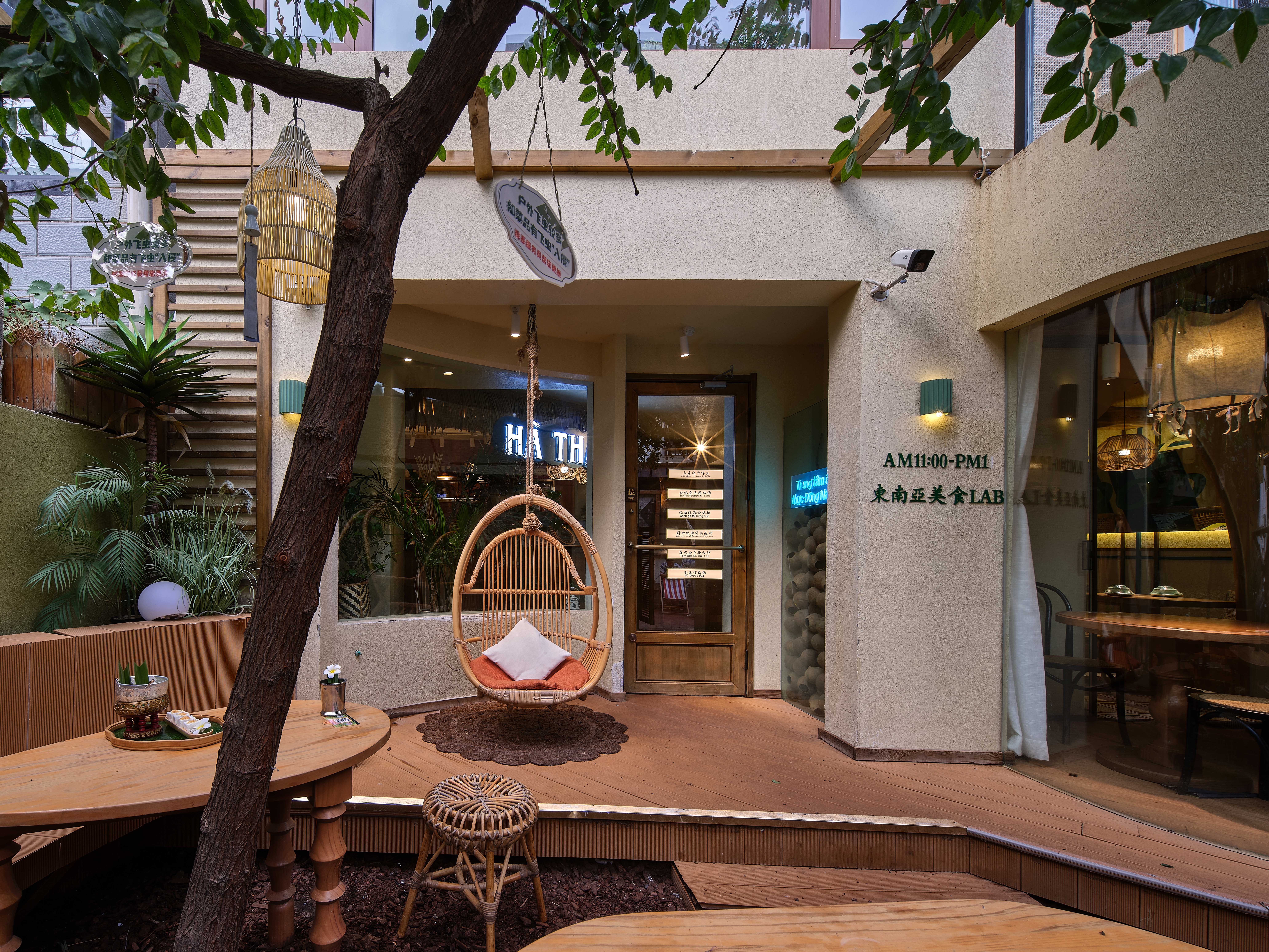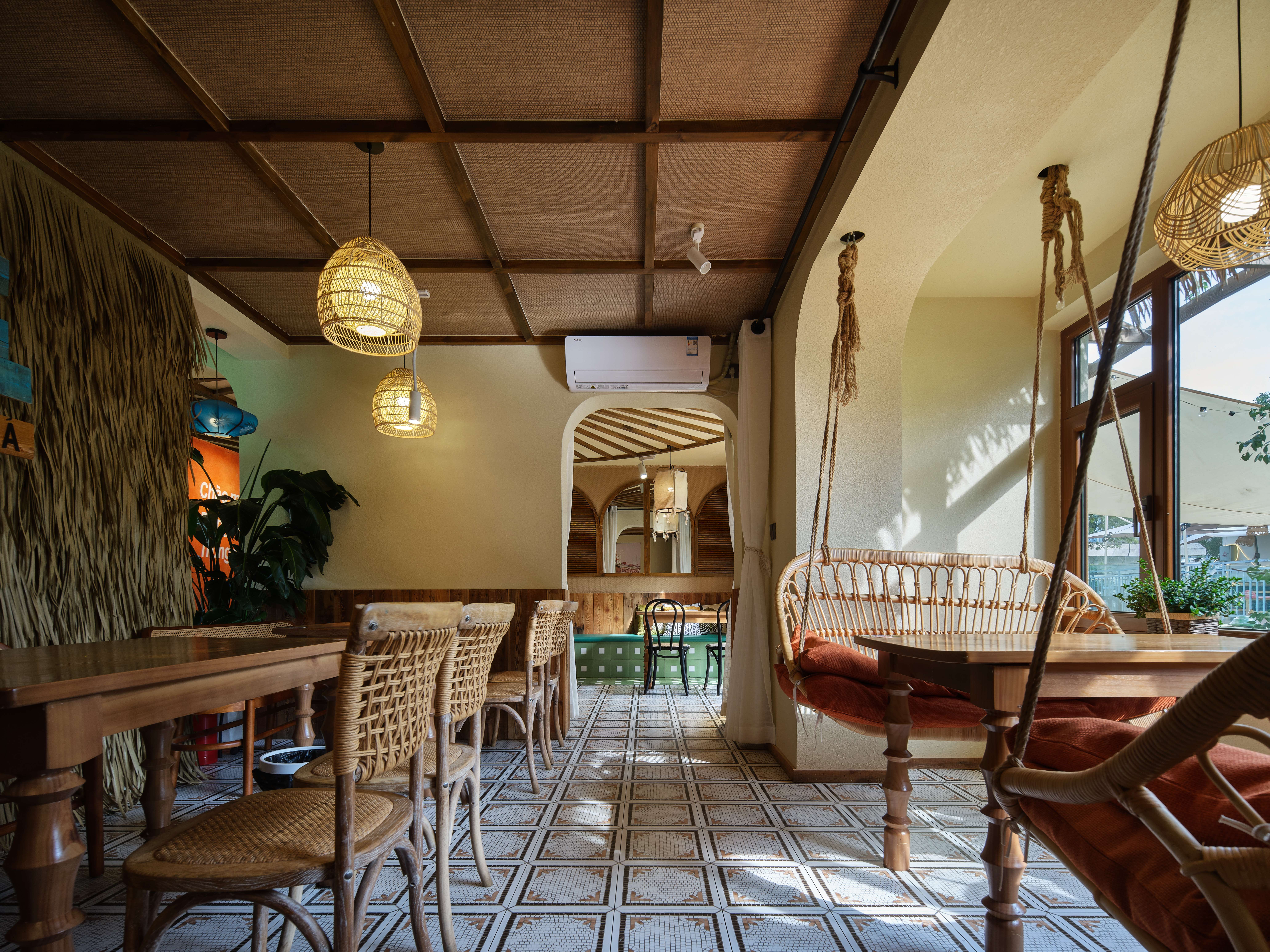 从原建筑到内部空间布局,我们把室内外的体验感做了更多元的变化。从庭院到室内,再从开敞空间到分隔空间,最后来到户外露台。空间的节奏变化,满足了不同需求的同时,也让项目本身更加具有独特性。 在庭院内,可以感受到光从枝叶洒落,微风轻拂空中的纱幔;在露台,当户外的视线被升高,松弛与静谧也得到了加持,扶栏遥望或者感受头顶的月光,自然带来的放松感会让人更加沉浸。 也许走进这里的片刻,可以让你恍然间感受到轻度的热带度假体验与和自然相处的松弛感。