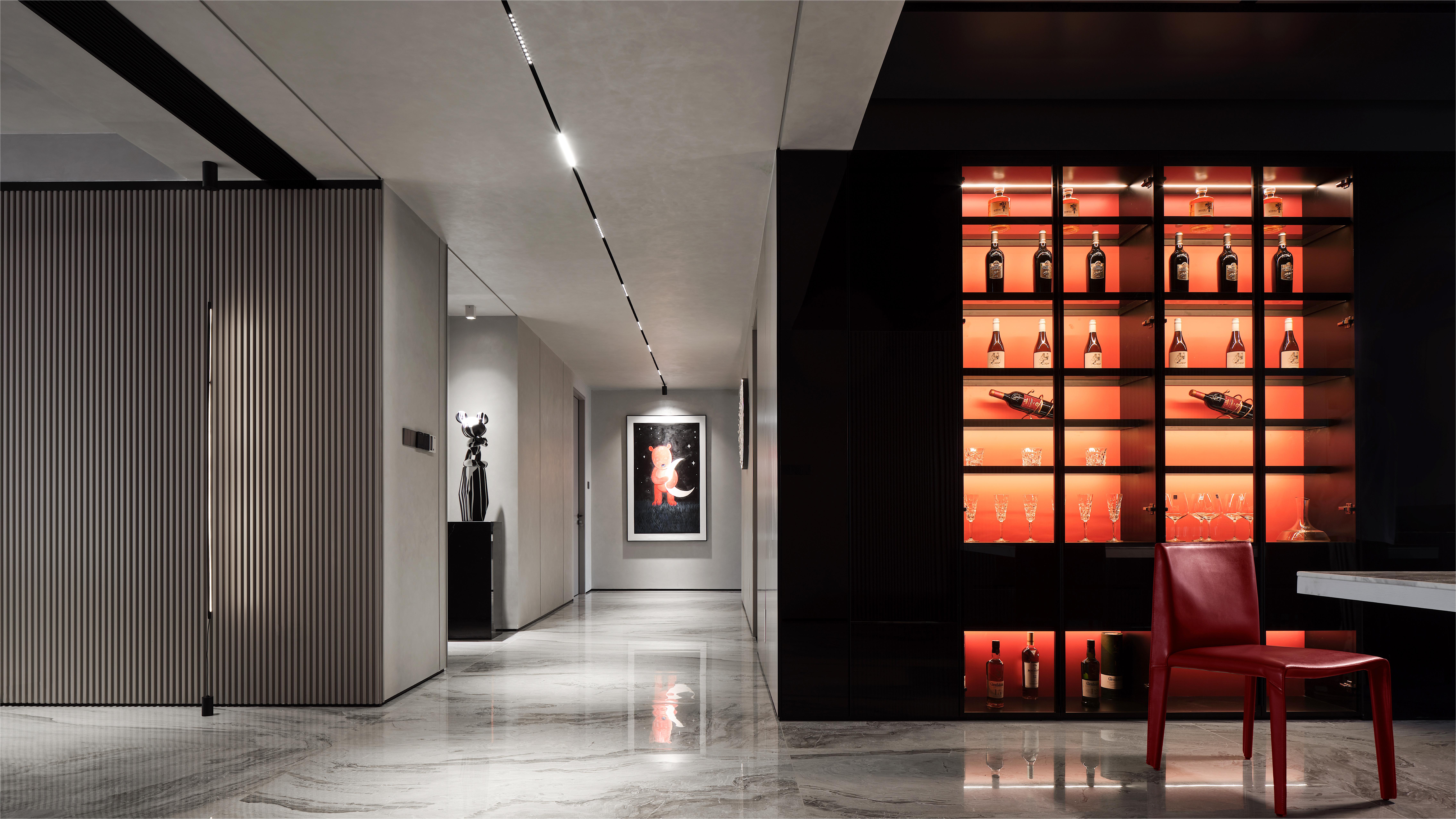从入户玄关开始便能深切的感受到,这个家是有灵魂的。屋顶多个小小的射灯,排列组合成大大的“G”,这是业主姓氏的首字母,独特的标志,赋予这个家极强的私宅属性。