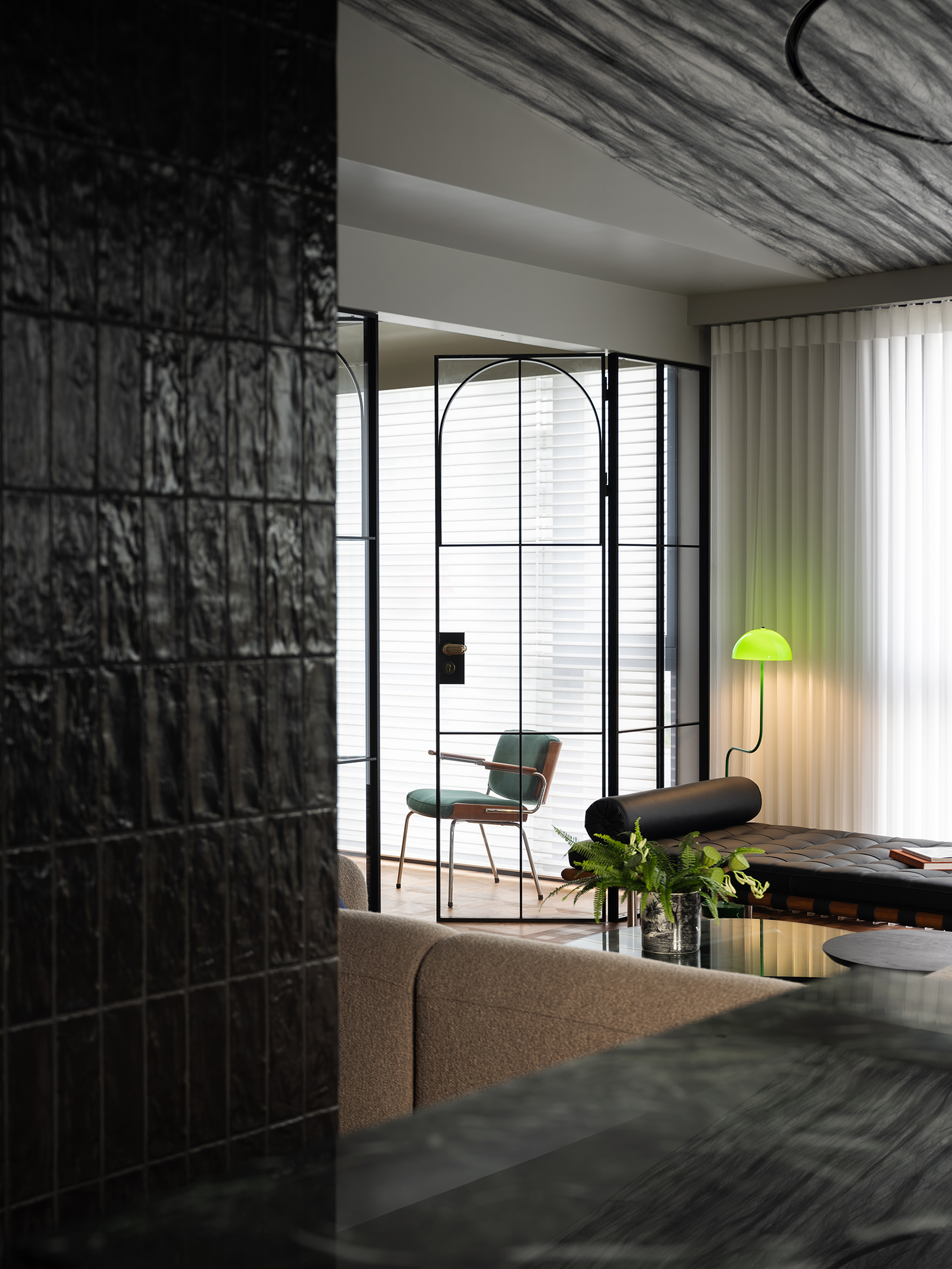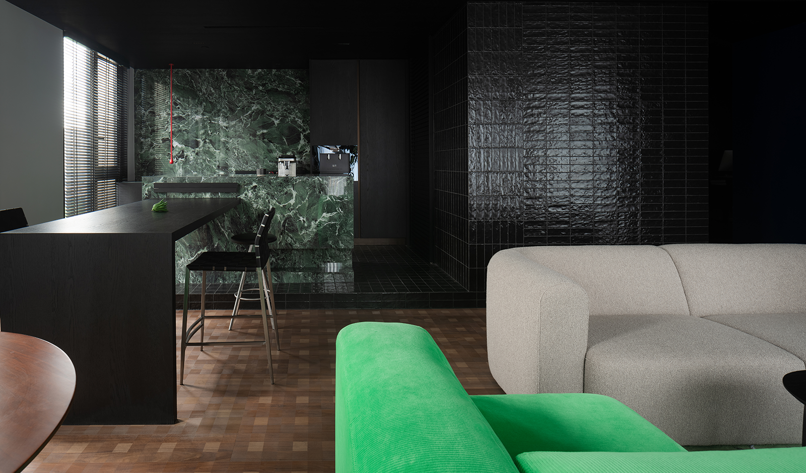 水吧区选用幽山黛绿岩板做台面和背景,红色龙头点缀恰到好处地平衡视觉,带来空间的另一种丰富感。