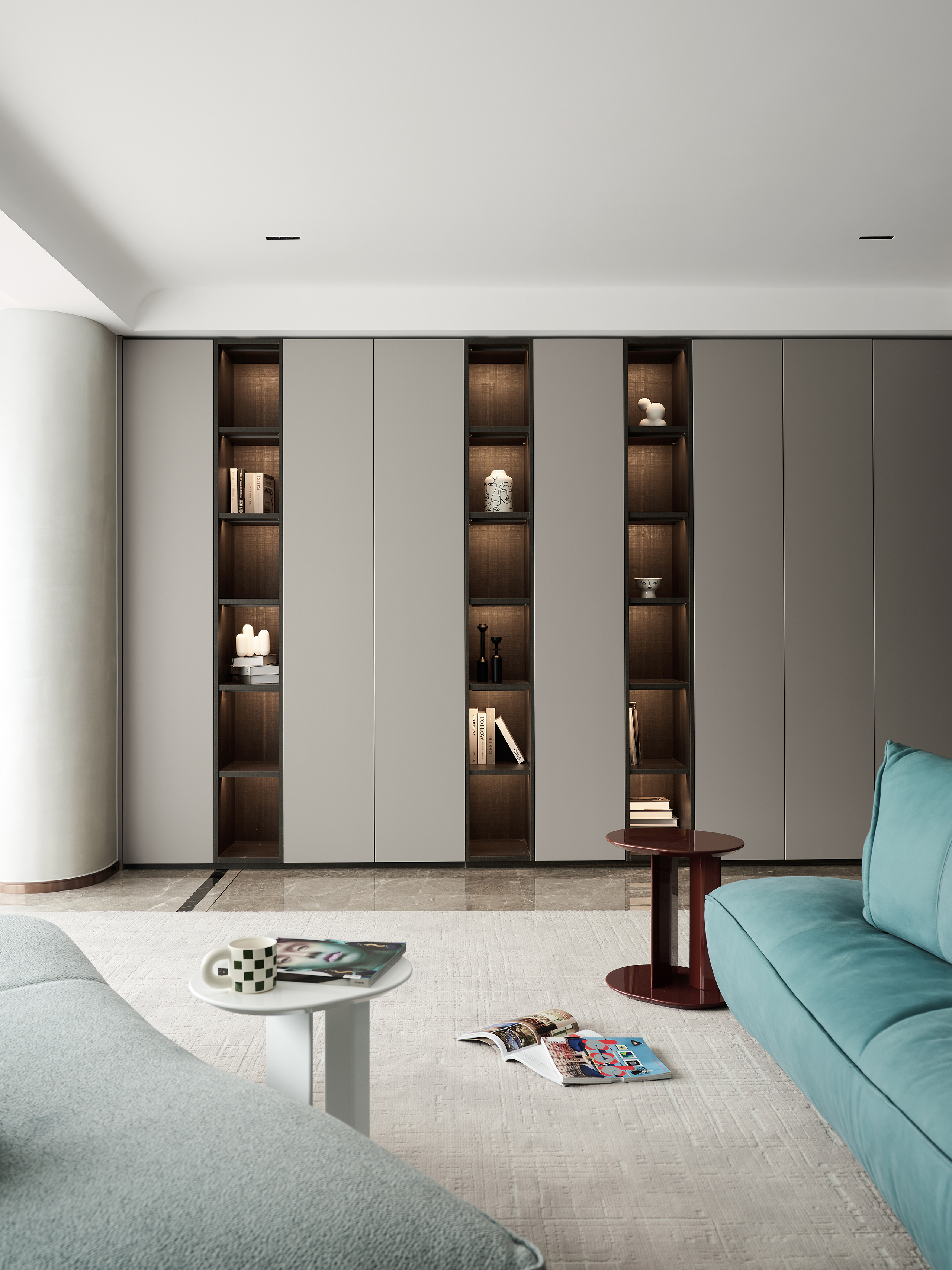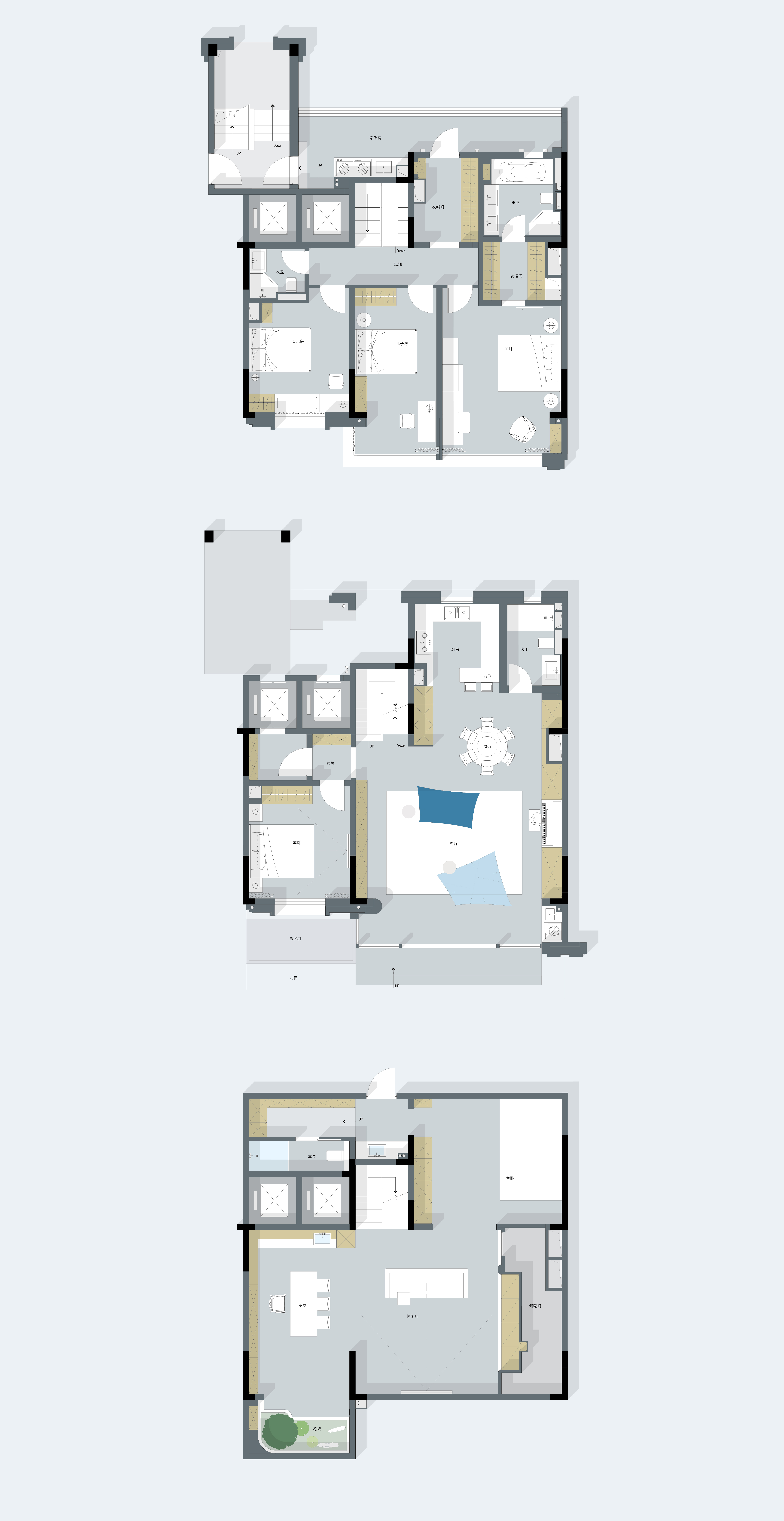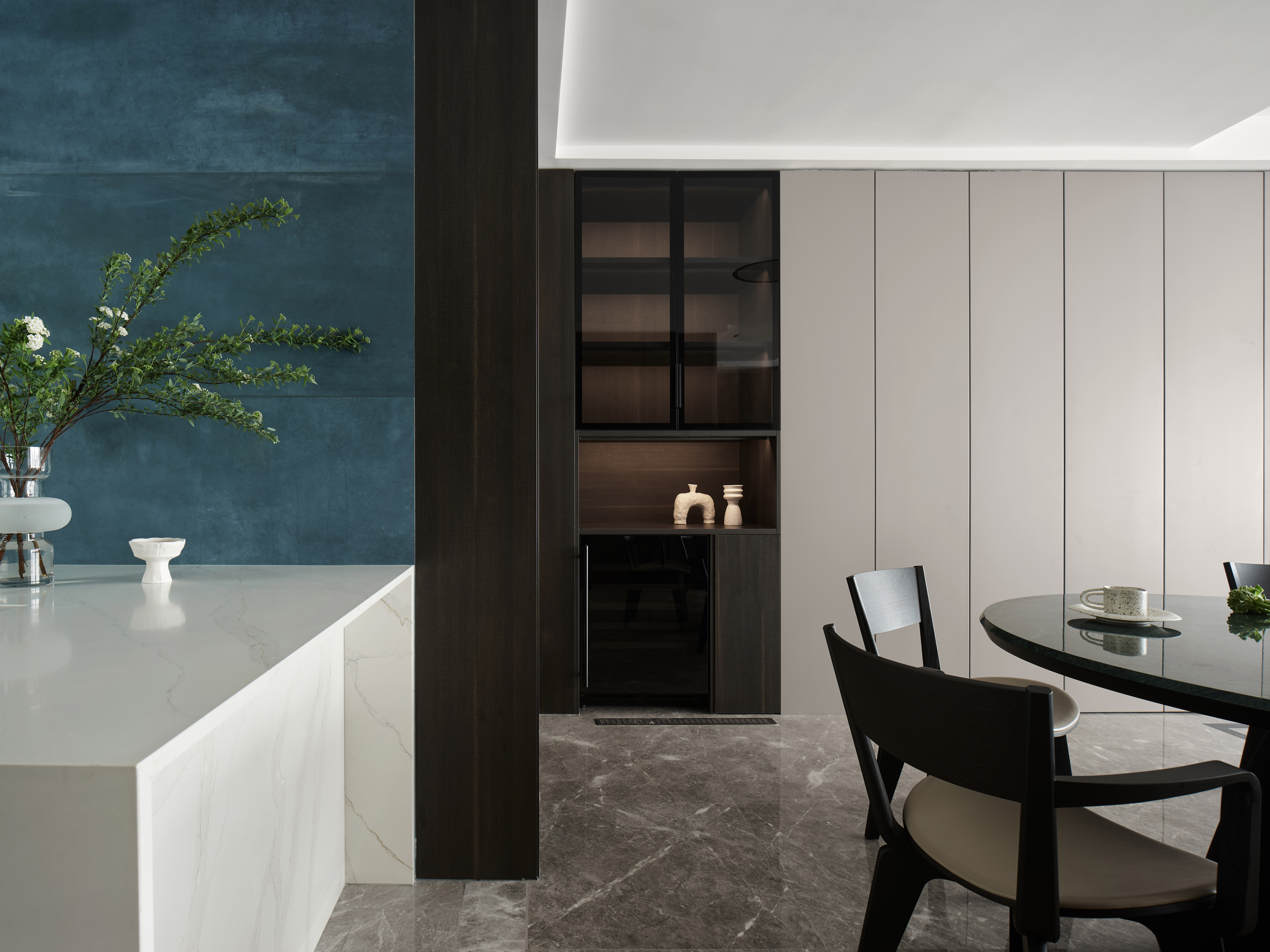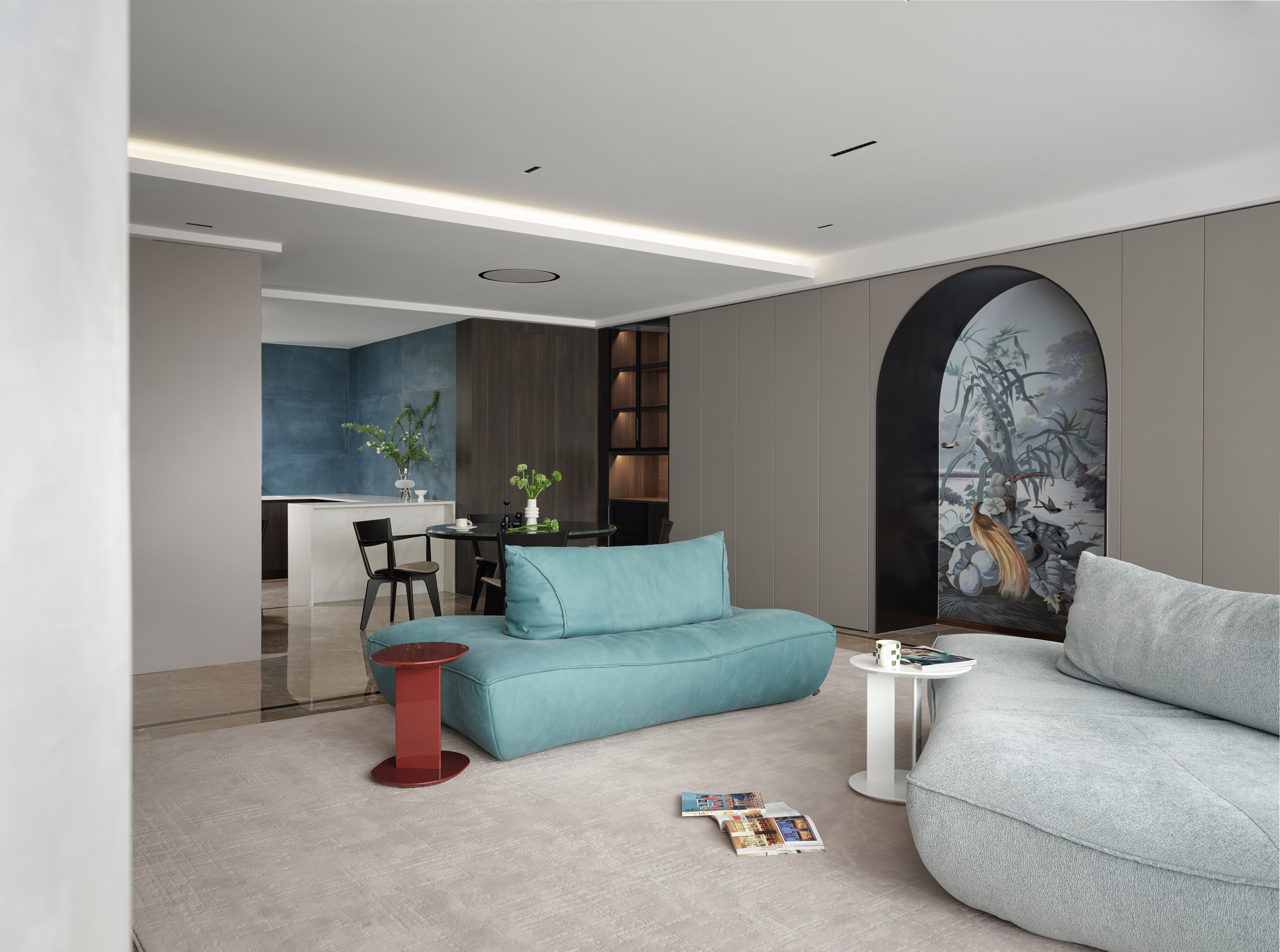 一楼客餐厅,意式简约打底,蓝灰使人平静,在沙发上随意找个姿势,倏忽之间,一个下午已然不见。沉浸在独立空间中,找到一刻世俗的远离,再推门而出时,已是个不一样的自己。
