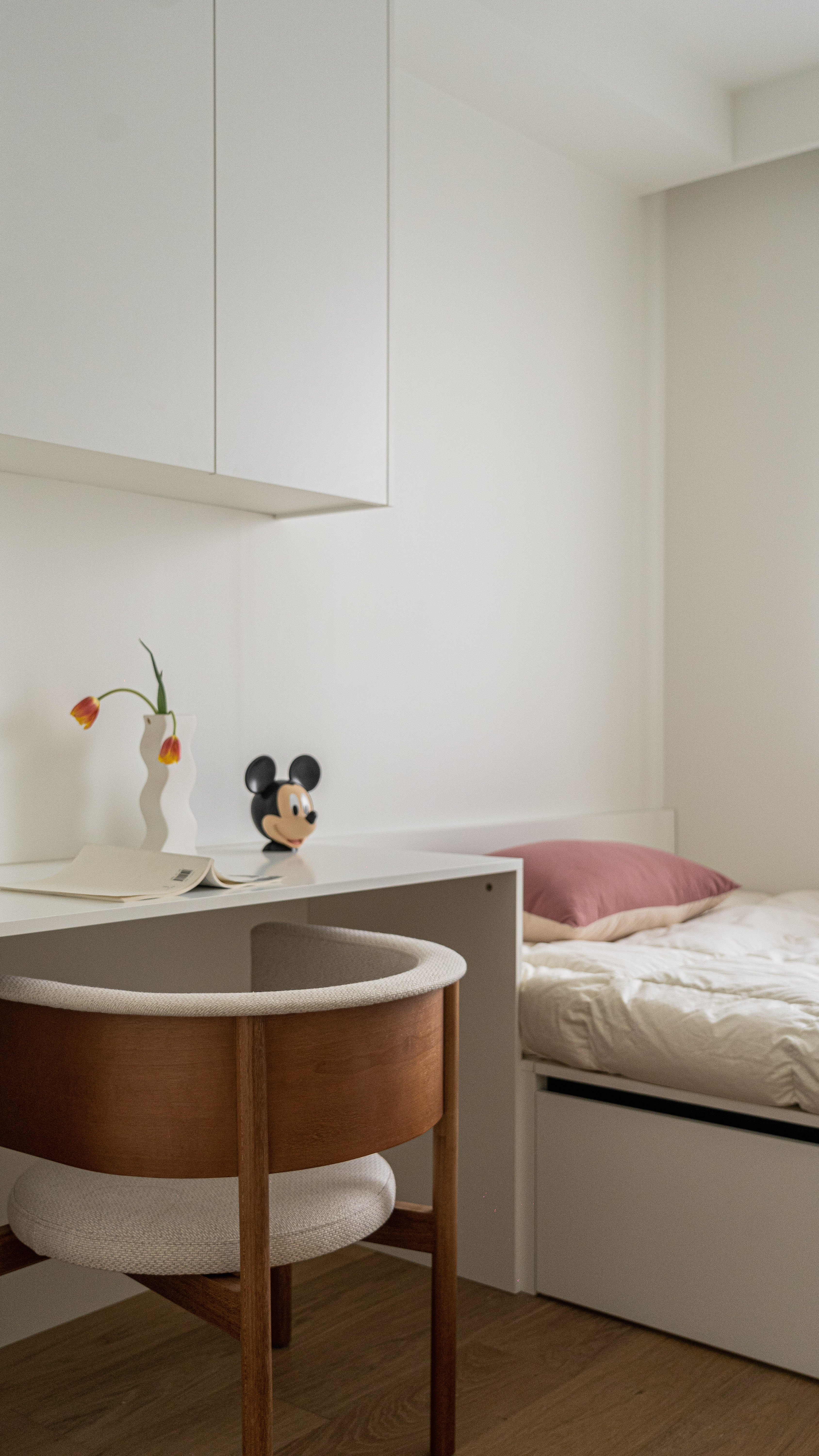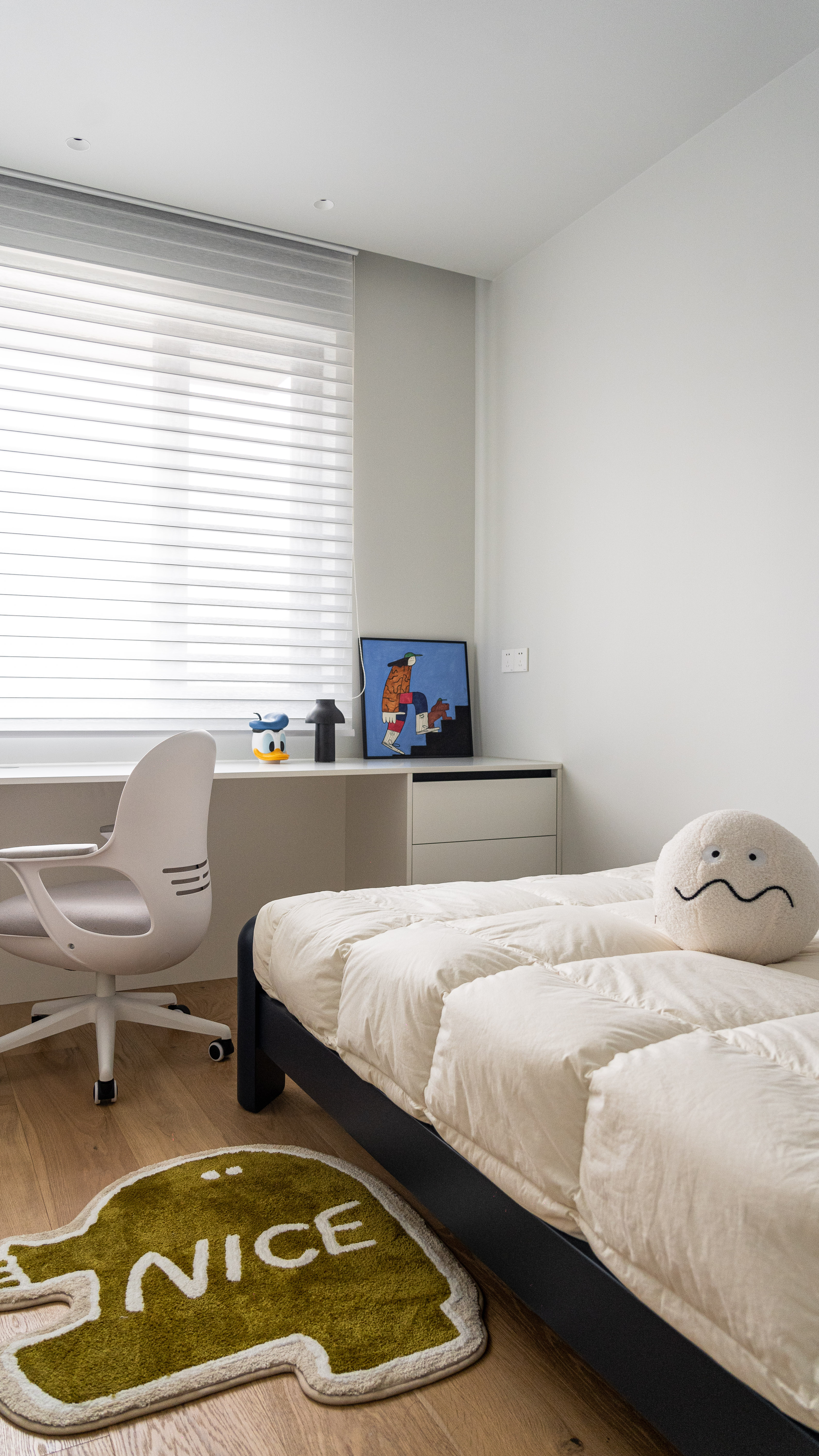 9.两个孩子房相邻,设计师进行墙面改造,将原始的直墙改成S墙面,凹进去的部分成为两个儿童房各自的衣柜空间,女儿房以榻榻米的形式呈现,定制的学习台和书柜与之相连。 -