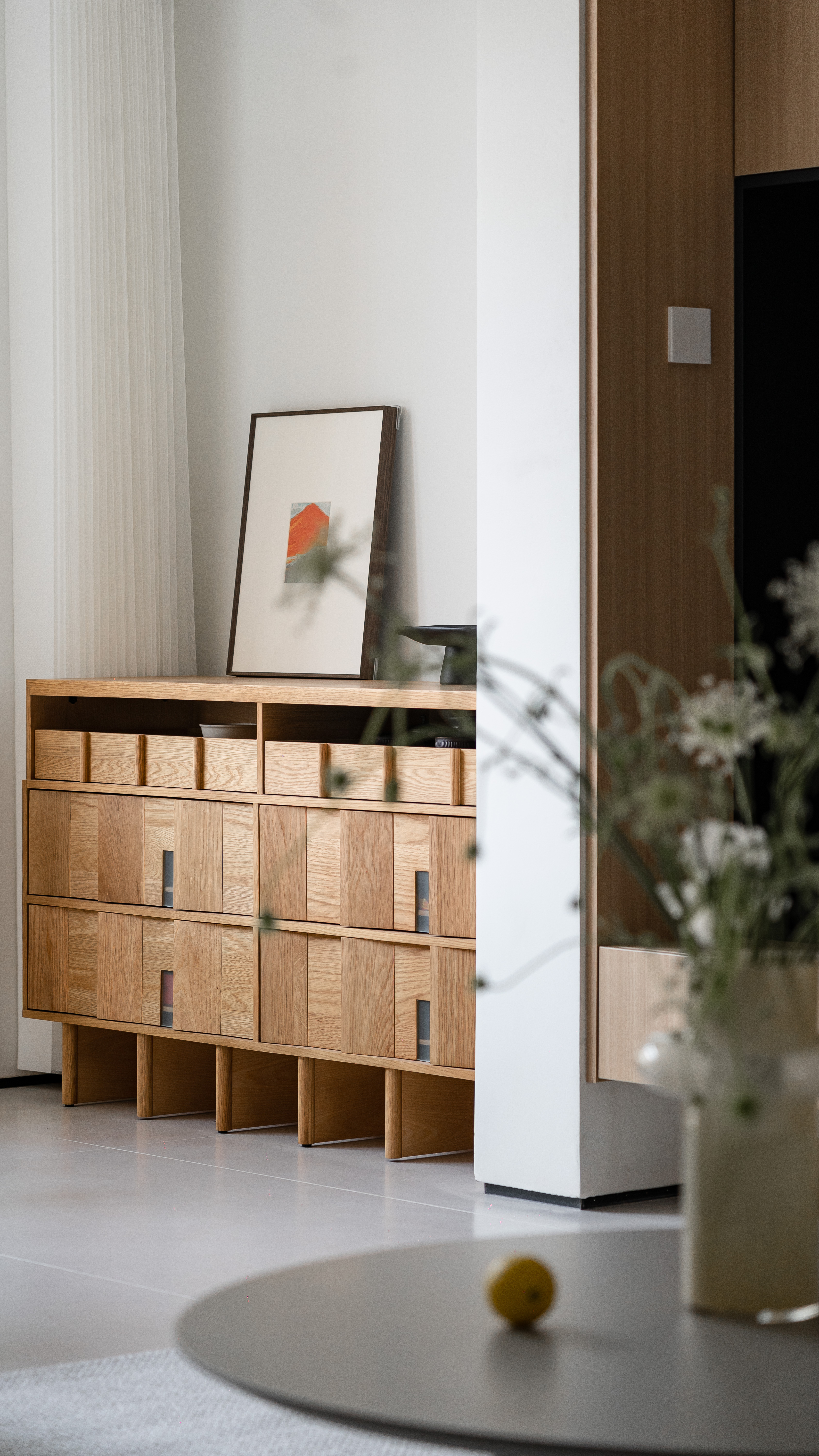 3.在客厅的公区做颠覆性的改造,空间的储纳和整体的美观度是双重标准,齐平消隐阳台门垛,老人房入户门做小尺寸平移,结合电视背景墙做隐形门,拉长整个墙面的储纳范围,腾出的空间让入户有了储物柜,电视墙融合储物柜定制,造型和储物都充分满足。