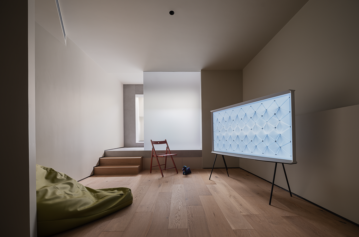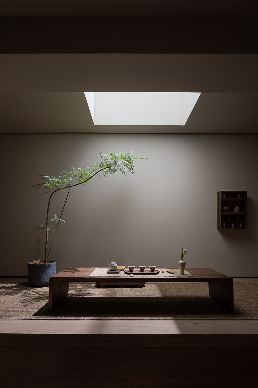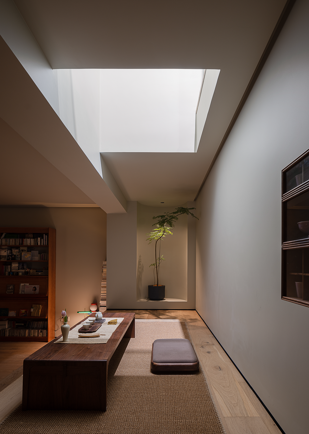 1.不做绝对的空间属性分离,来满足生活和工作的需要一体化空间的弹性洽接。原始狭长的阳台被破立重组,一部分给了儿童房,一部分用作增加采光井。这个特别的采光井,既关联楼上的生活,又成为采光的主体。利用地台、加饮池,一个古香雅致的茶区呈现了,也可随意切换任何状态和活动。