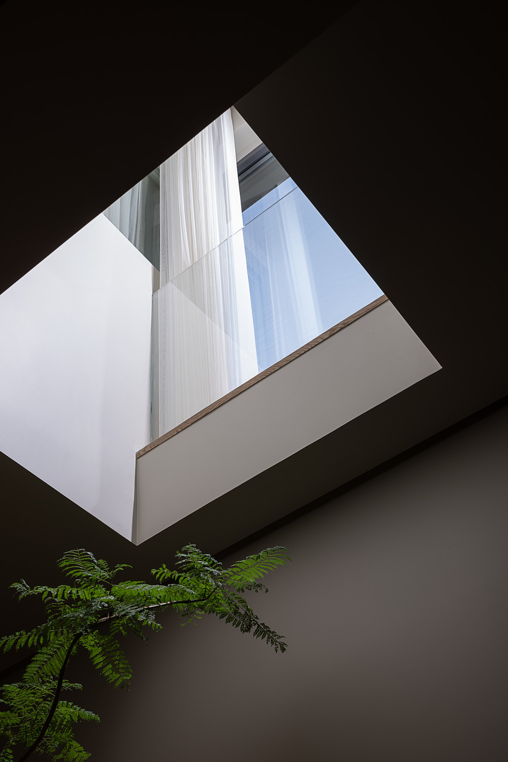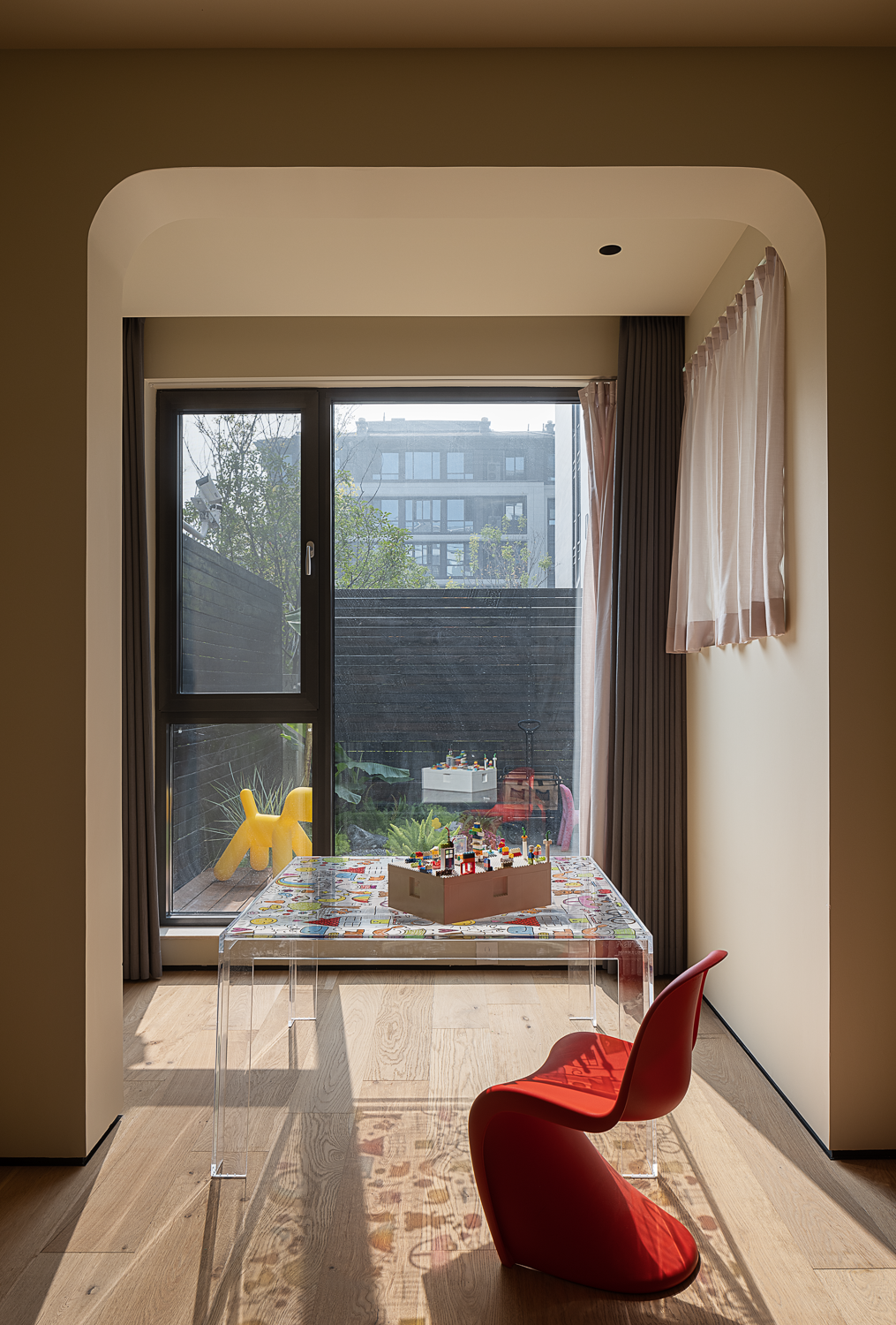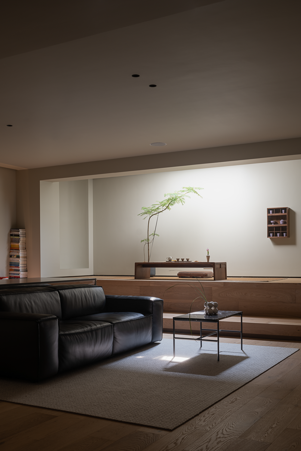 1.不做绝对的空间属性分离,来满足生活和工作的需要一体化空间的弹性洽接。原始狭长的阳台被破立重组,一部分给了儿童房,一部分用作增加采光井。这个特别的采光井,既关联楼上的生活,又成为采光的主体。利用地台、加饮池,一个古香雅致的茶区呈现了,也可随意切换任何状态和活动。