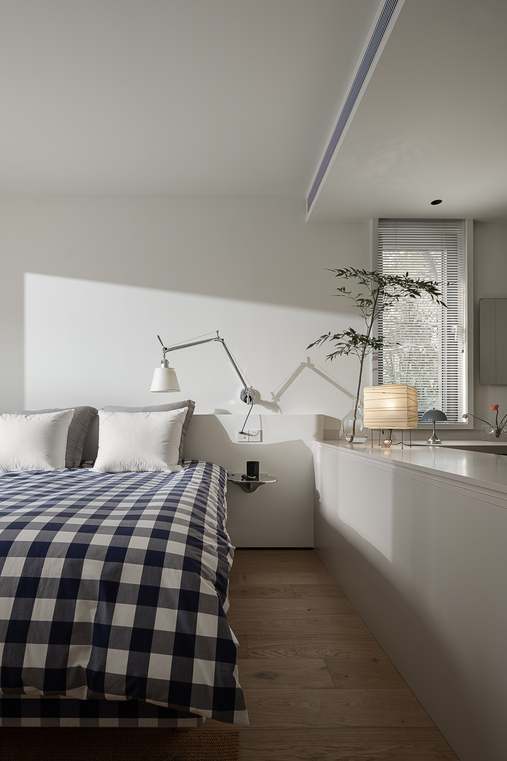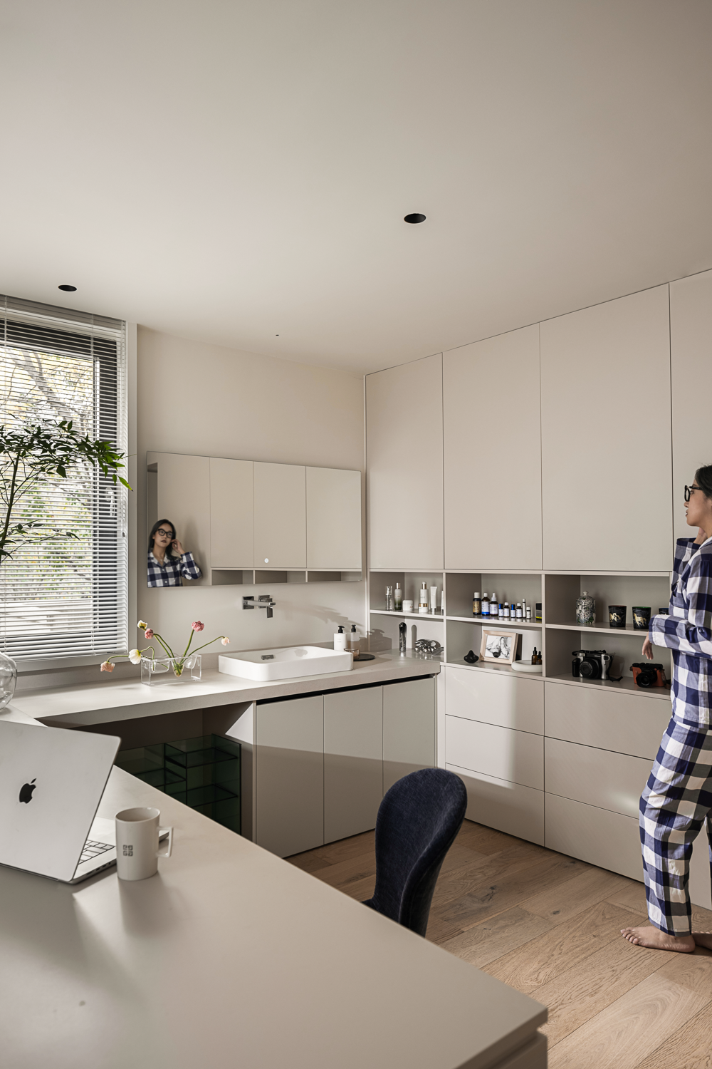 4.更加现代舒适的生活习惯,并不是绝对的空间属性分离,作为美妆博主和电商达人的年轻屋主,需要一体化空间来满足生活和工作的弹性洽接,原始细碎的卧室被打开,L型的岛台与睡卧区关联,写博文、上商品、梳妆台、日常护理、储物都统统被考虑,空间的松弛感才让人紧密相关。