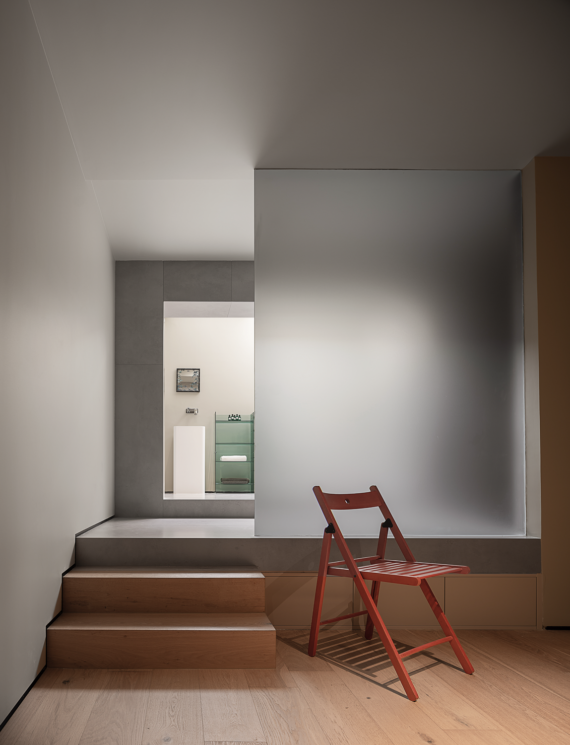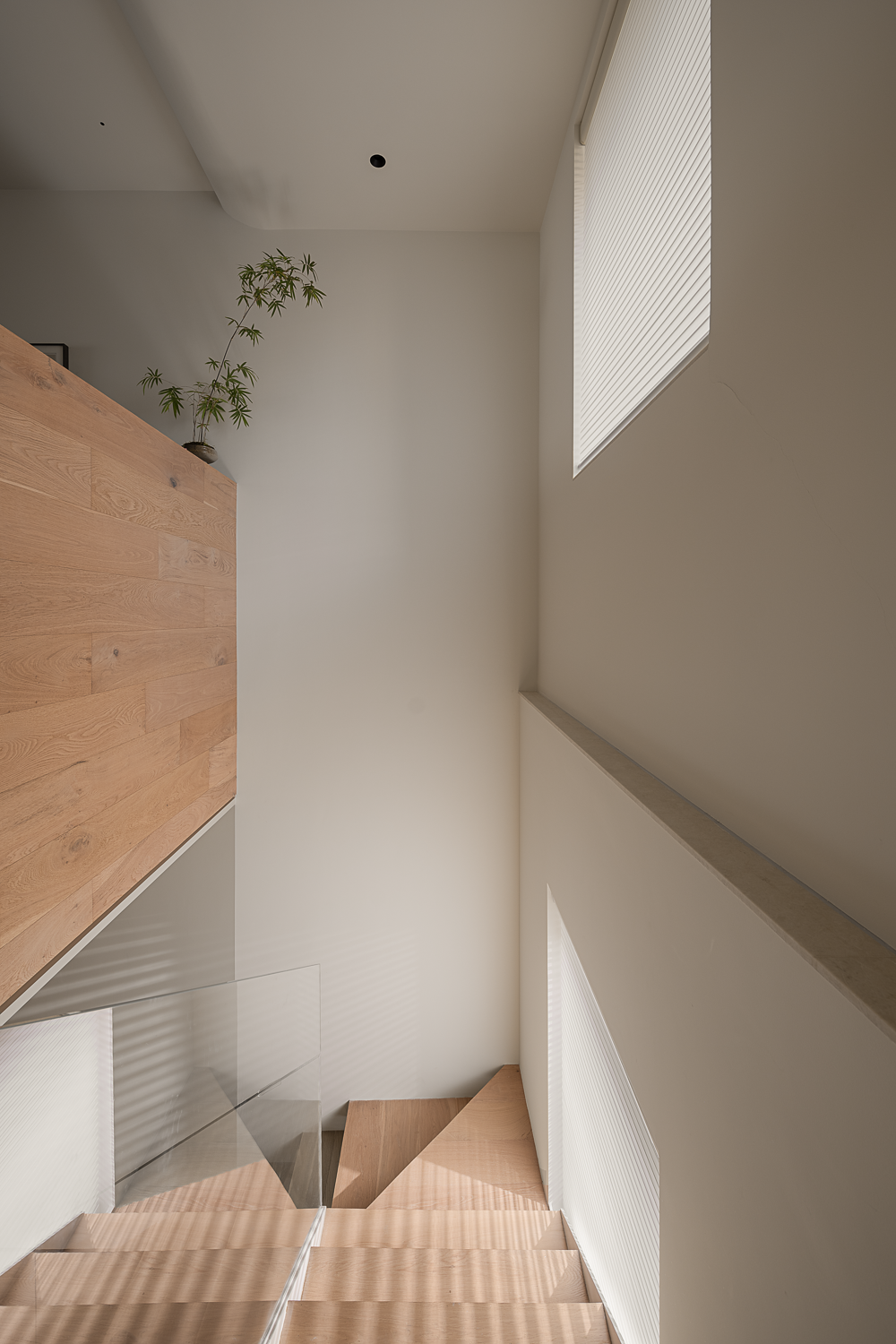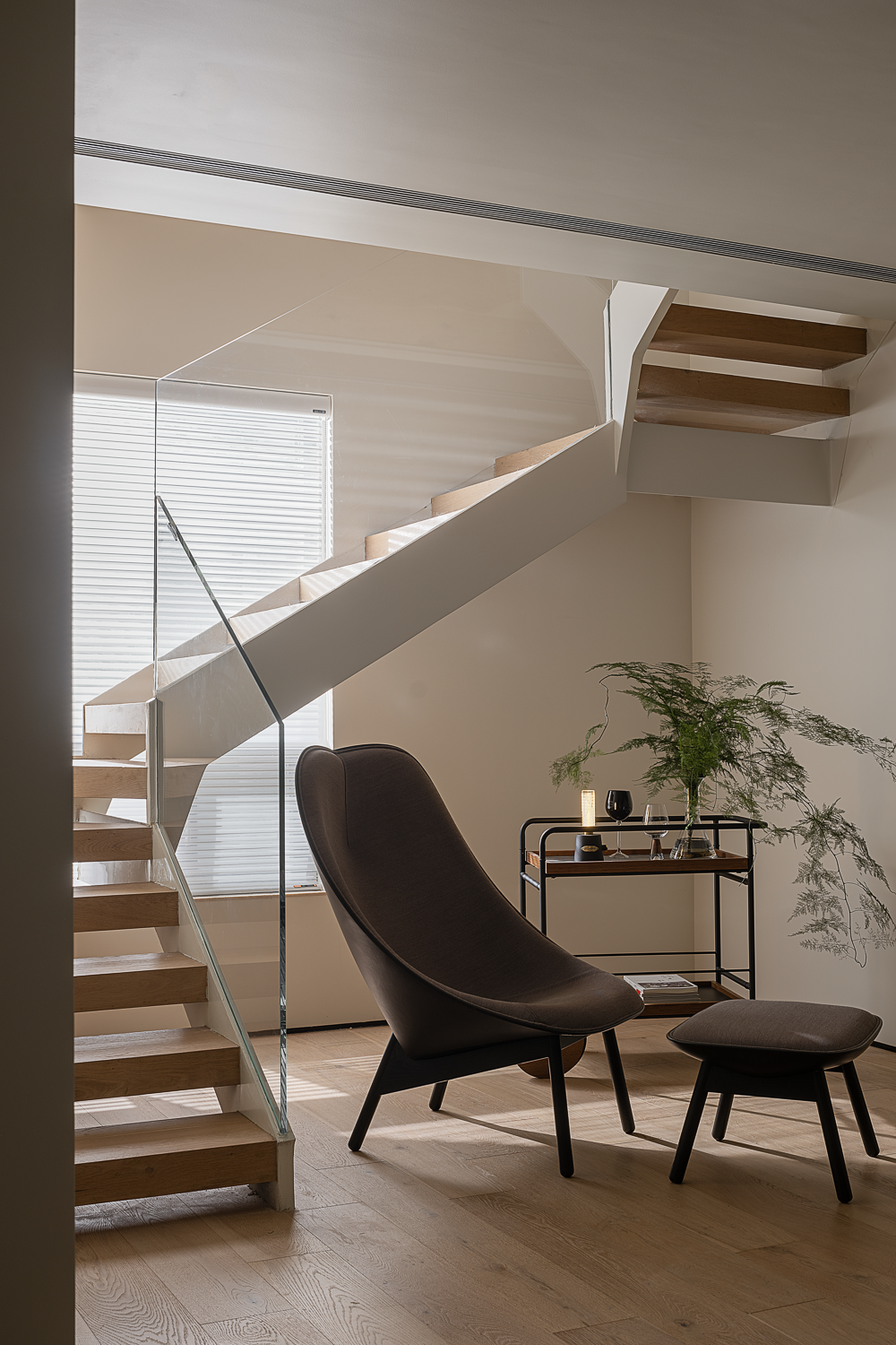 6.我一直觉得楼梯是“介质” 空间,链接不同楼层的情绪,无论自上而下还是自下而上,这短暂的时光是该有仪式感的,舒适和光影,干净和质感被设计糅合,通透的玻璃扶手保证安全又拉近上下关系。