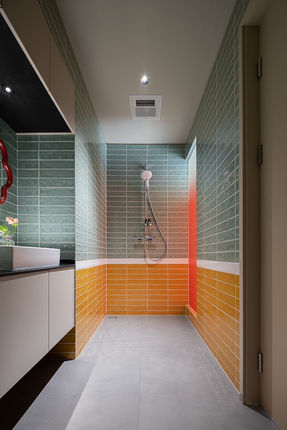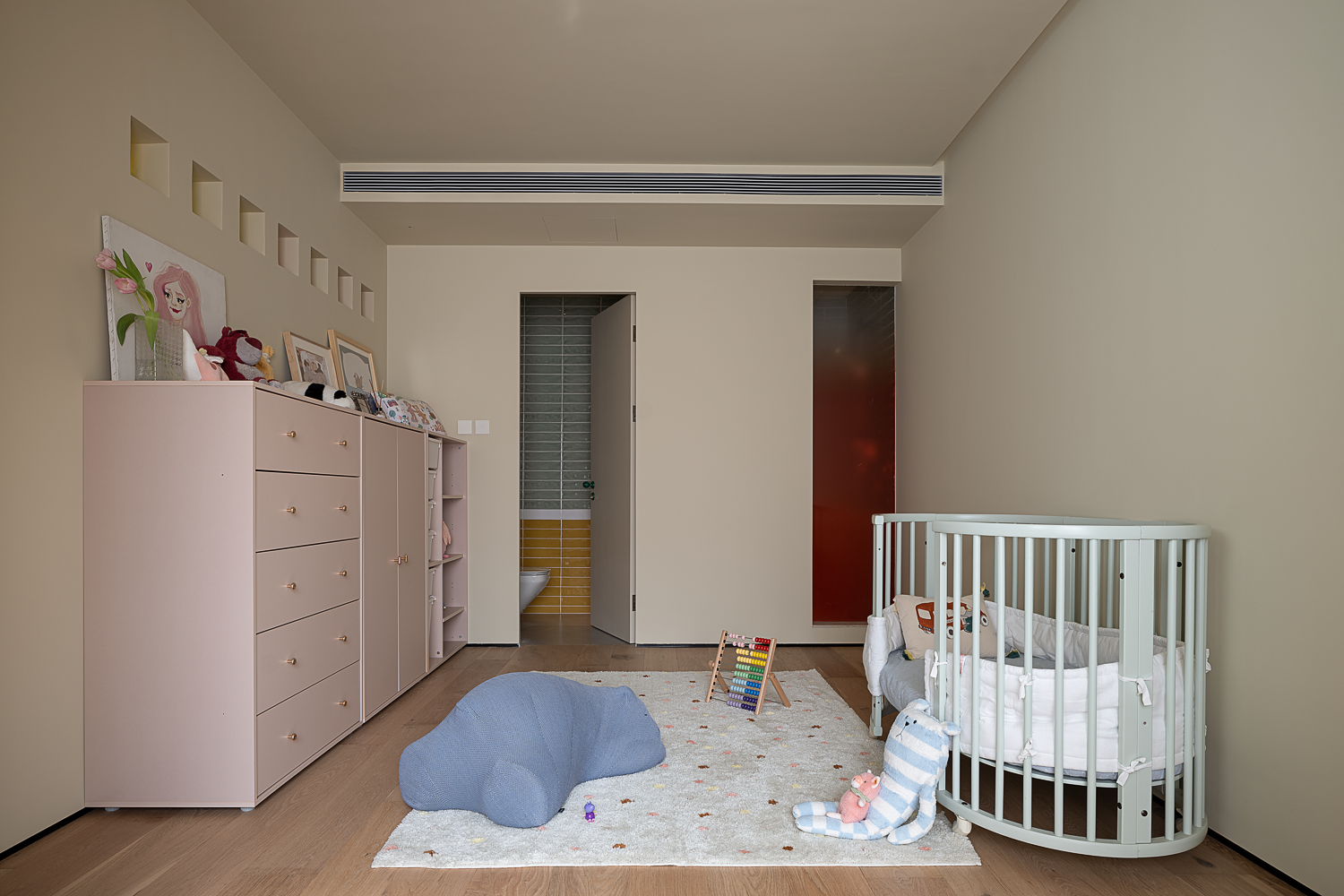 5.在彩色玻璃砖的另一面,是宝贝的房间,安全和童趣,把最好的都给她,原始空间儿童房没有卫浴间,抢出来的空间盥洗区和入户玄关背靠背,色彩是童年的丰富。