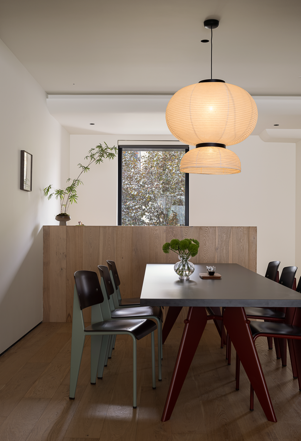 3.设计将人的主体位置都趋光,开一扇足够艺术的窗,把餐厅挨着楼梯,动静之间是热气腾腾的生活常态,地面一直延展到栏杆,半高的栏杆地板包满,又发挥了餐厅的矮墙“倚靠”,顶面的设备管道用圆润的体块包裹丰富,空间有了物质和精神的互动;