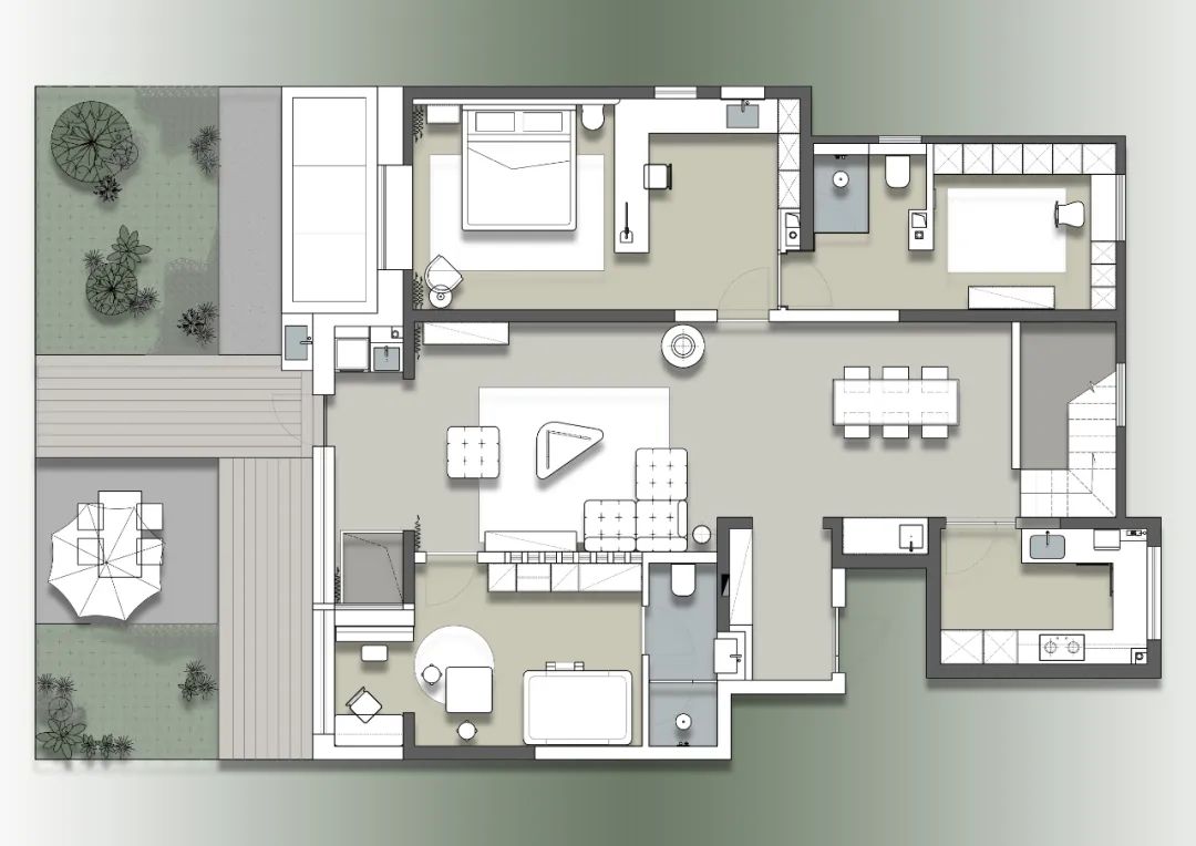 空间布局:△ 原始空间的墙体关系不能大动,只能尽量整合零碎空间。在厅的布局上,b&b的体块沙发圈地,可坐或可卧可靠,这里是自由交流的“岛”,留白幻化可能,设计师有节奏的将狭长的墙面和厅做了多维的安排,关注点不同,生活场景需求不同时,立体空间每个面都可以是场景主角,感应上空间被多场景扩展。