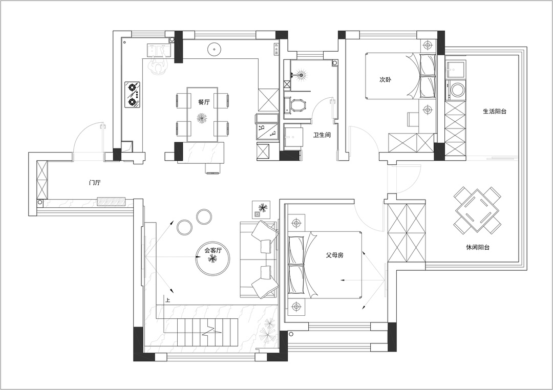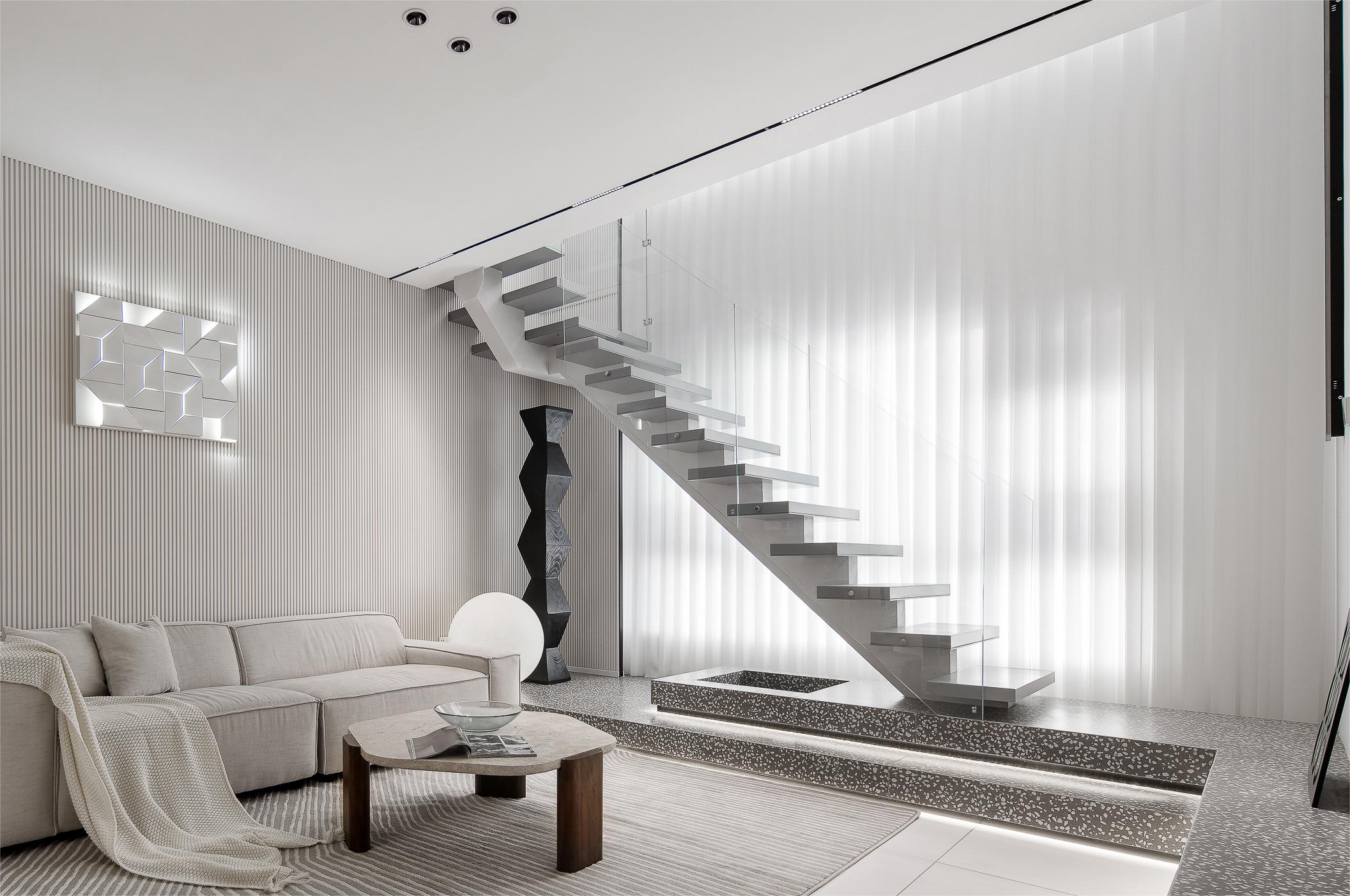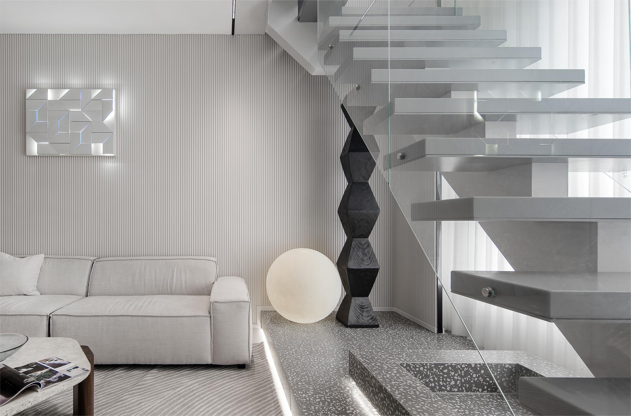 本案是顶层复式,空间上楼梯原结构影响餐厅使用,设计师为了保证楼梯功能,并把空间利用度提升,将楼梯移到客厅窗户位置,开出楼梯洞,将楼梯镂空艺术化,变成客厅的设计亮点。