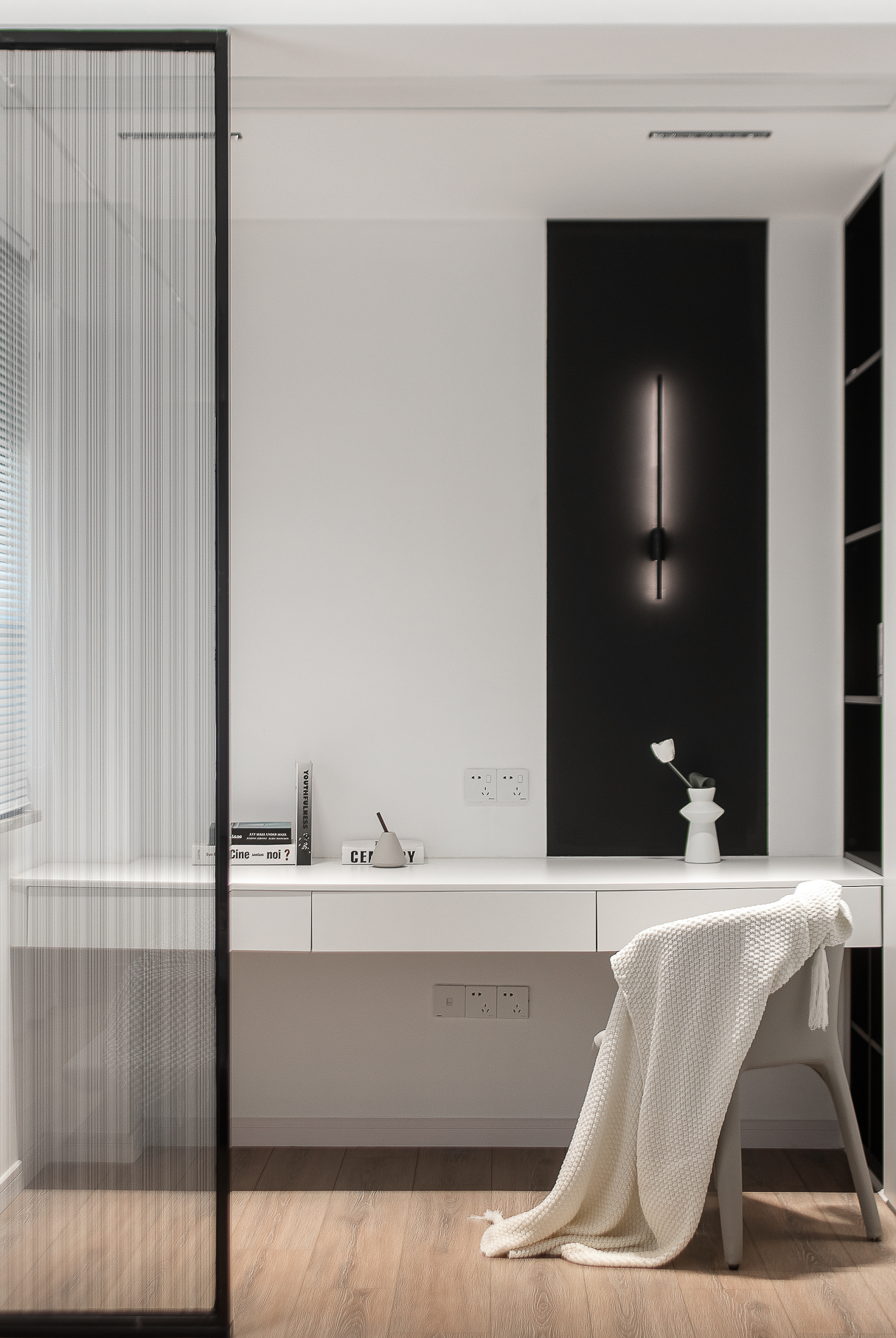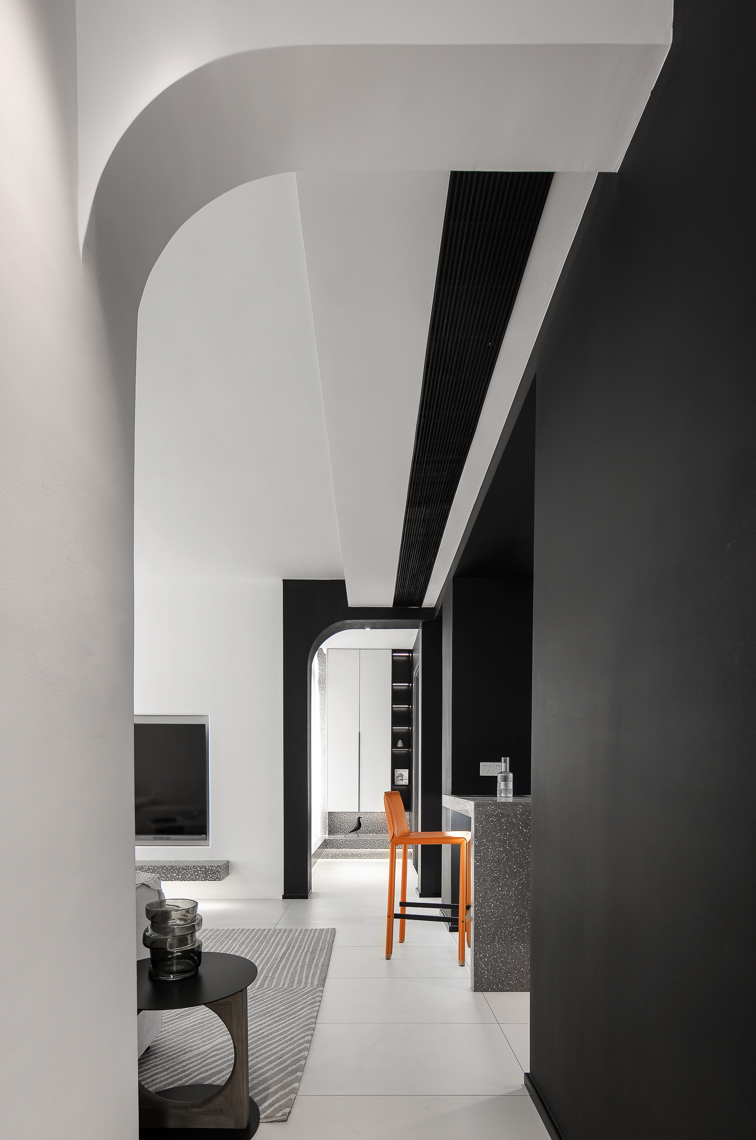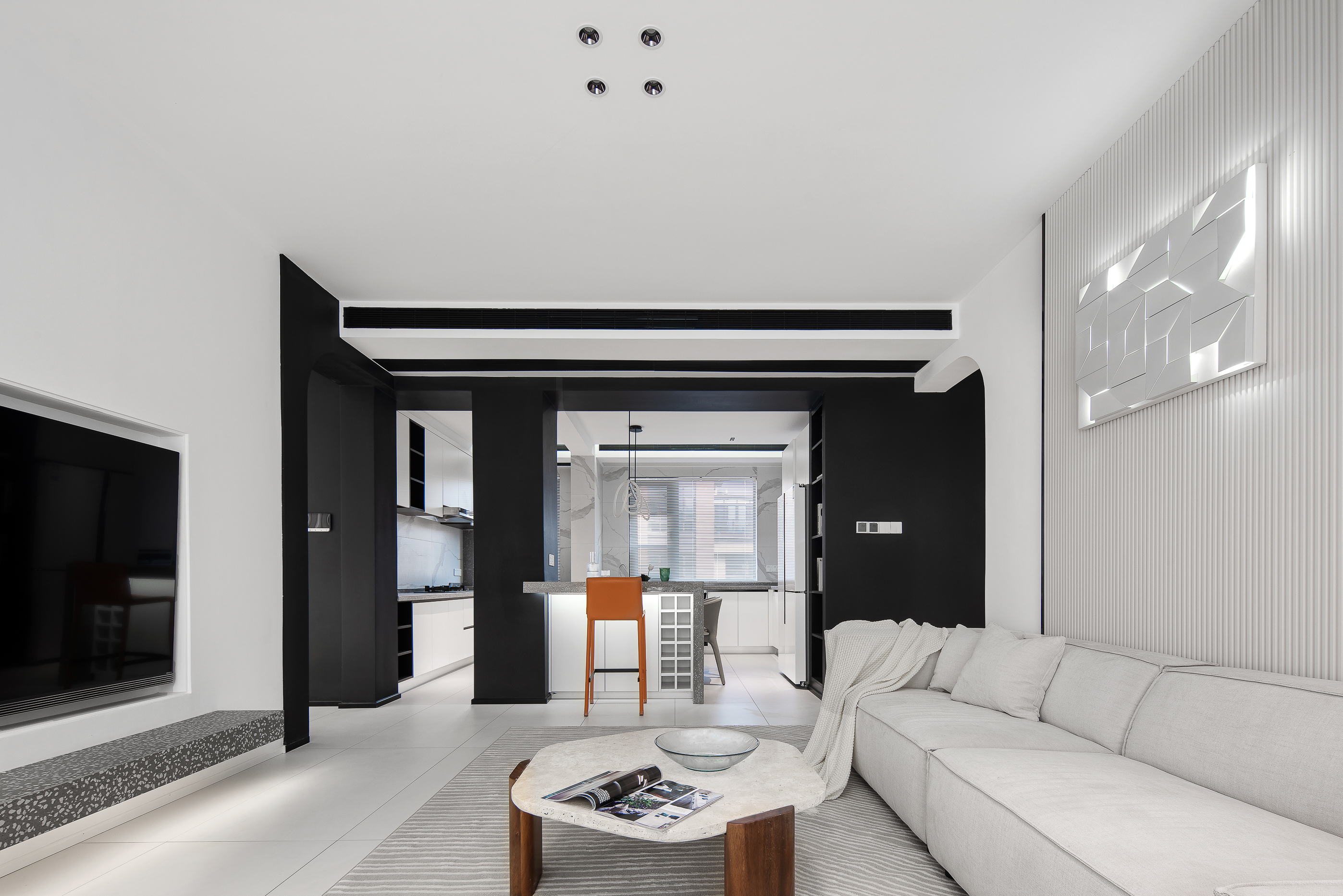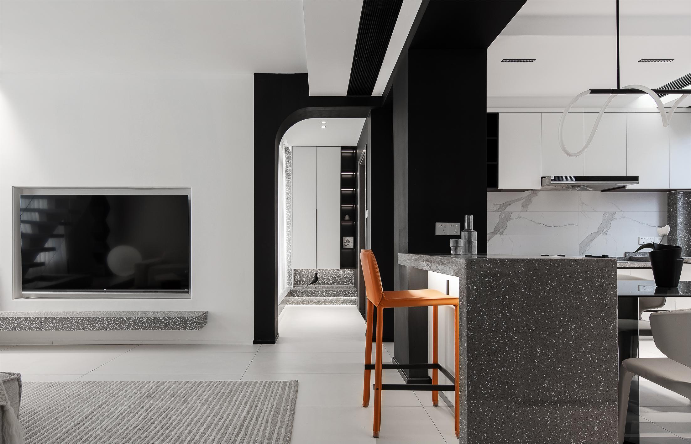 全屋通过空间结构来实现效果表现,设计师选择最为传统的白色乳胶漆,依靠层次细节表达。本案整体设计使用黑白灰色系给予了空间理性简约的基调,通过黑白灰的碰撞打造出极简又极具时尚感的空间氛围。