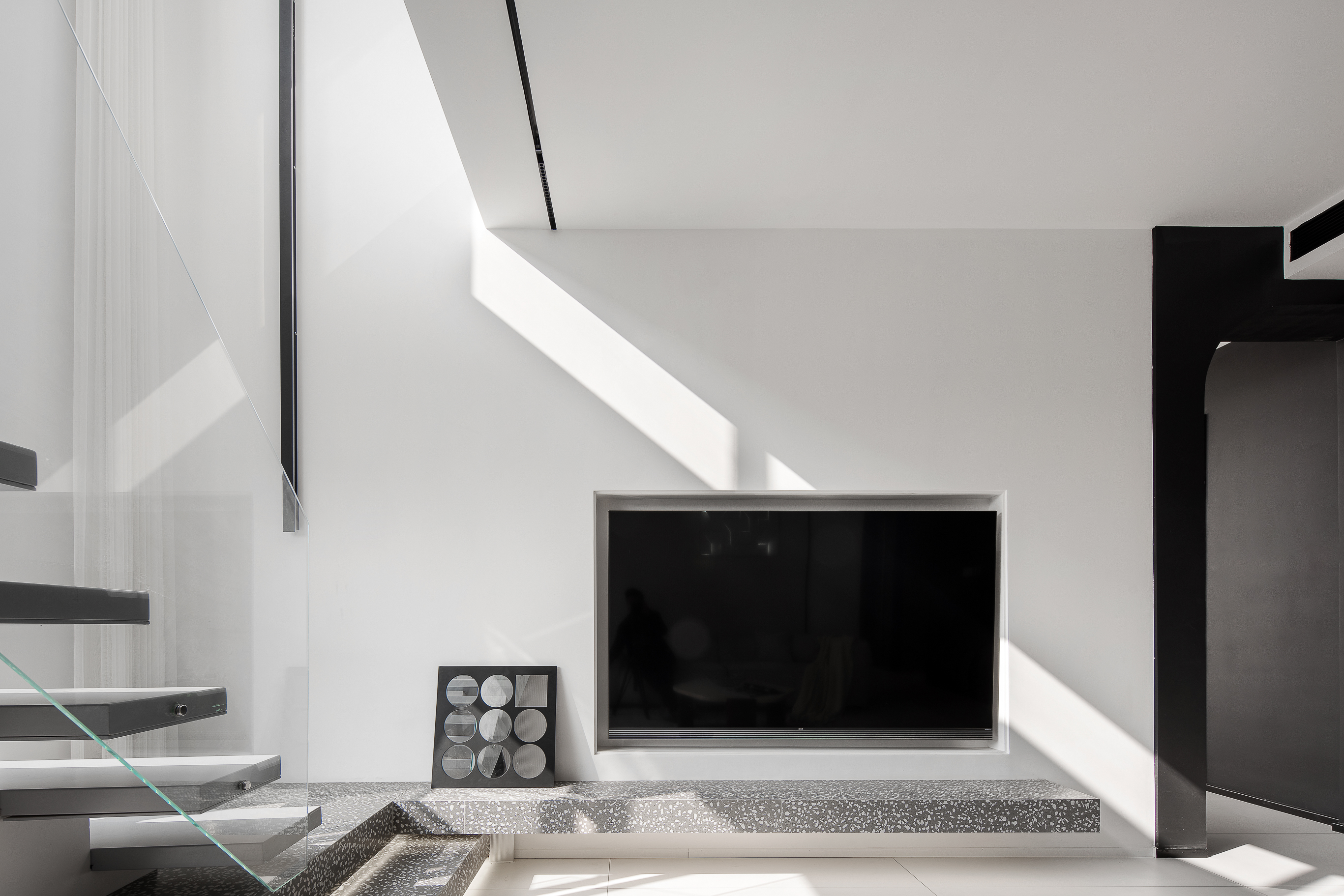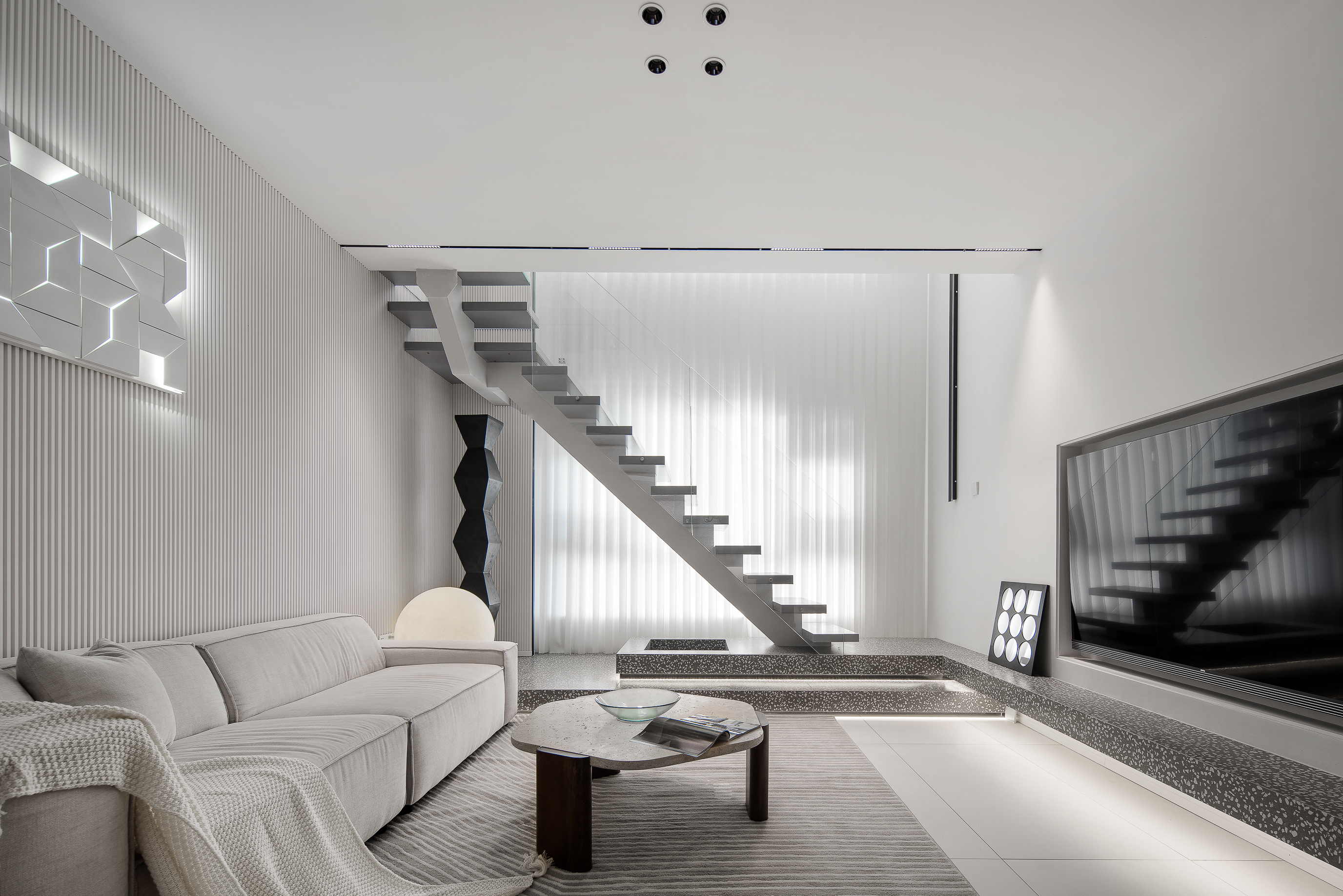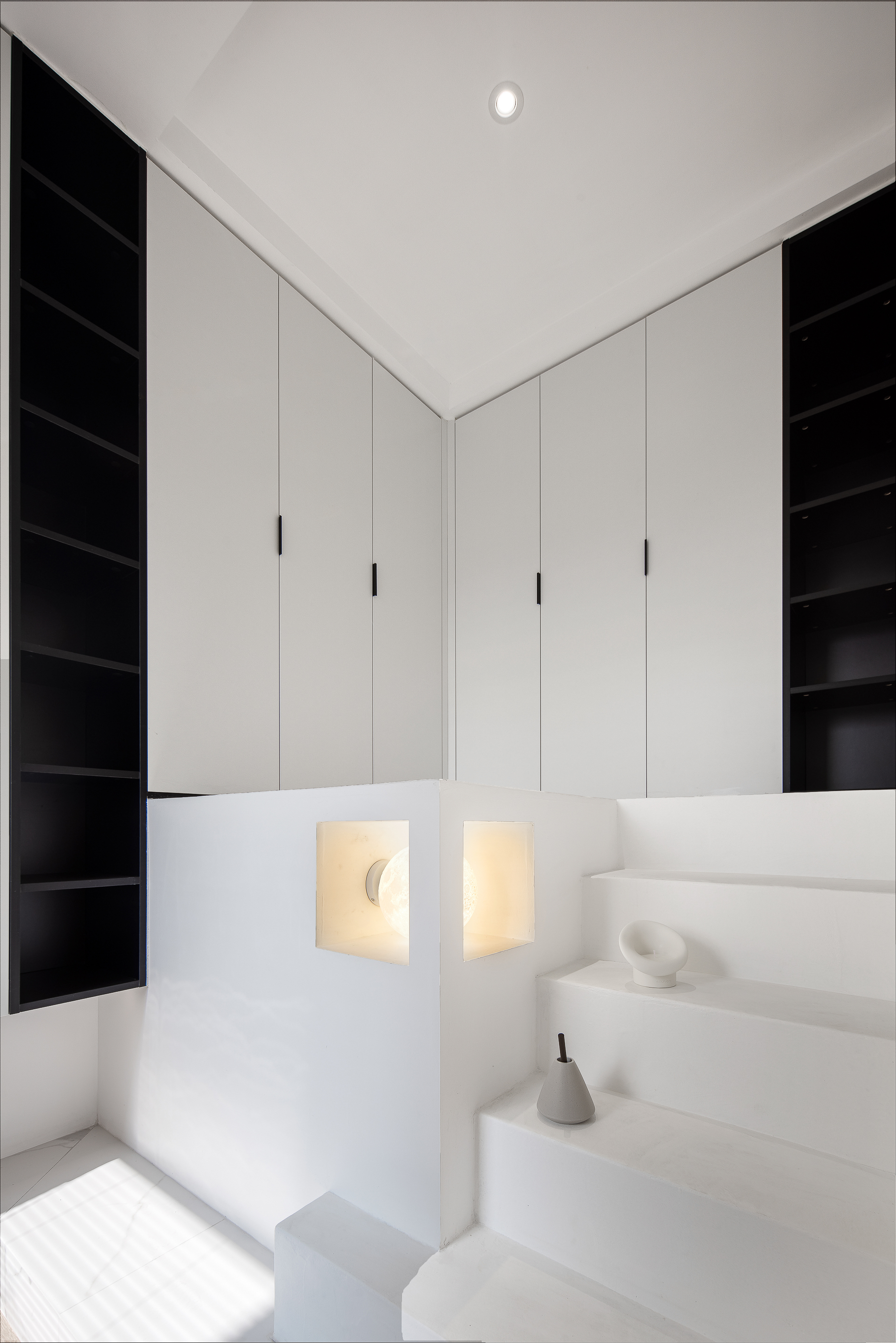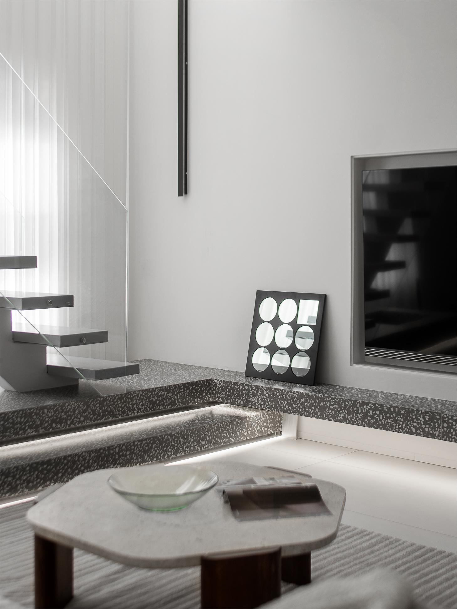 全屋通过空间结构来实现效果表现,设计师选择最为传统的白色乳胶漆,依靠层次细节表达。本案整体设计使用黑白灰色系给予了空间理性简约的基调,通过黑白灰的碰撞打造出极简又极具时尚感的空间氛围。