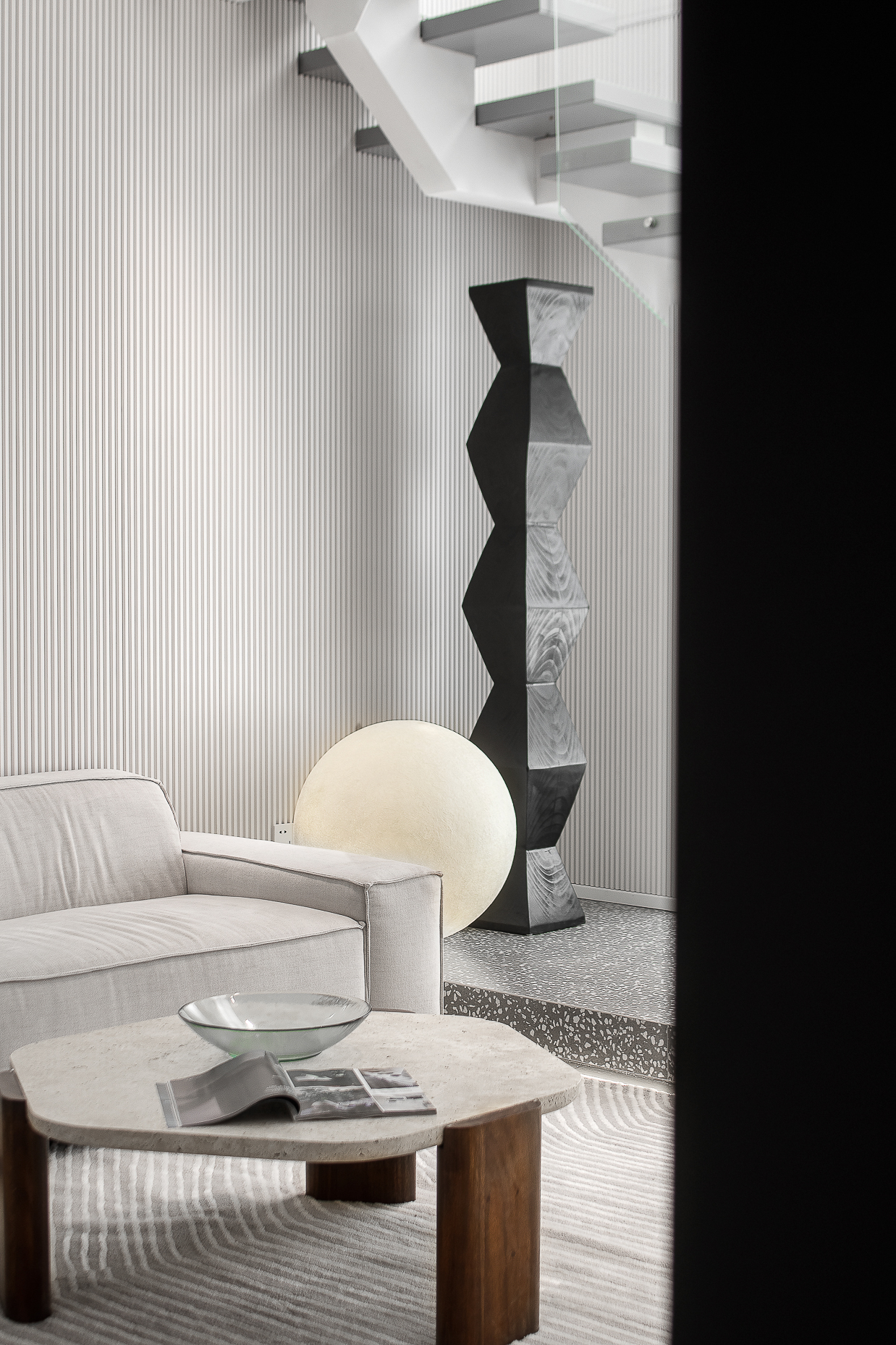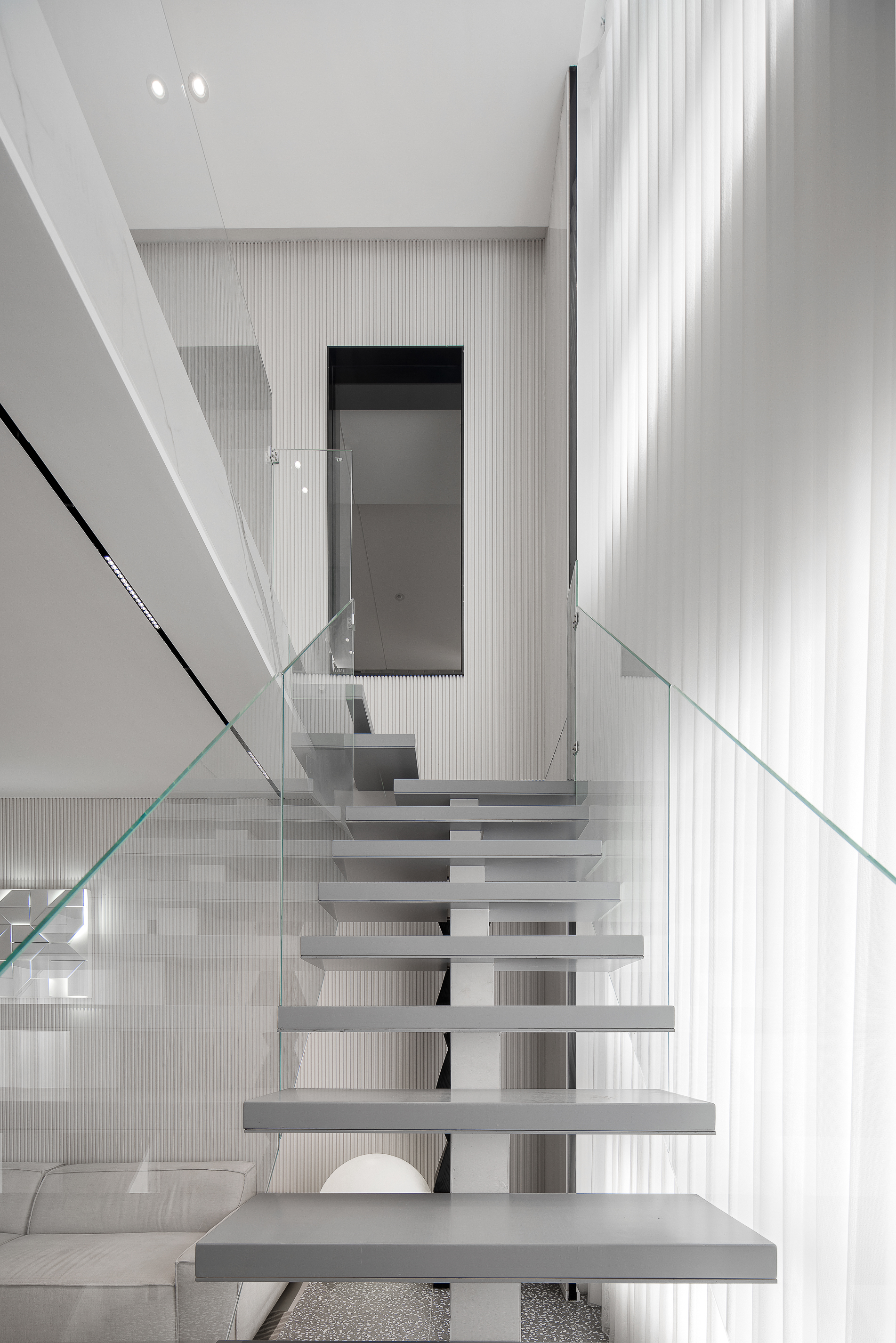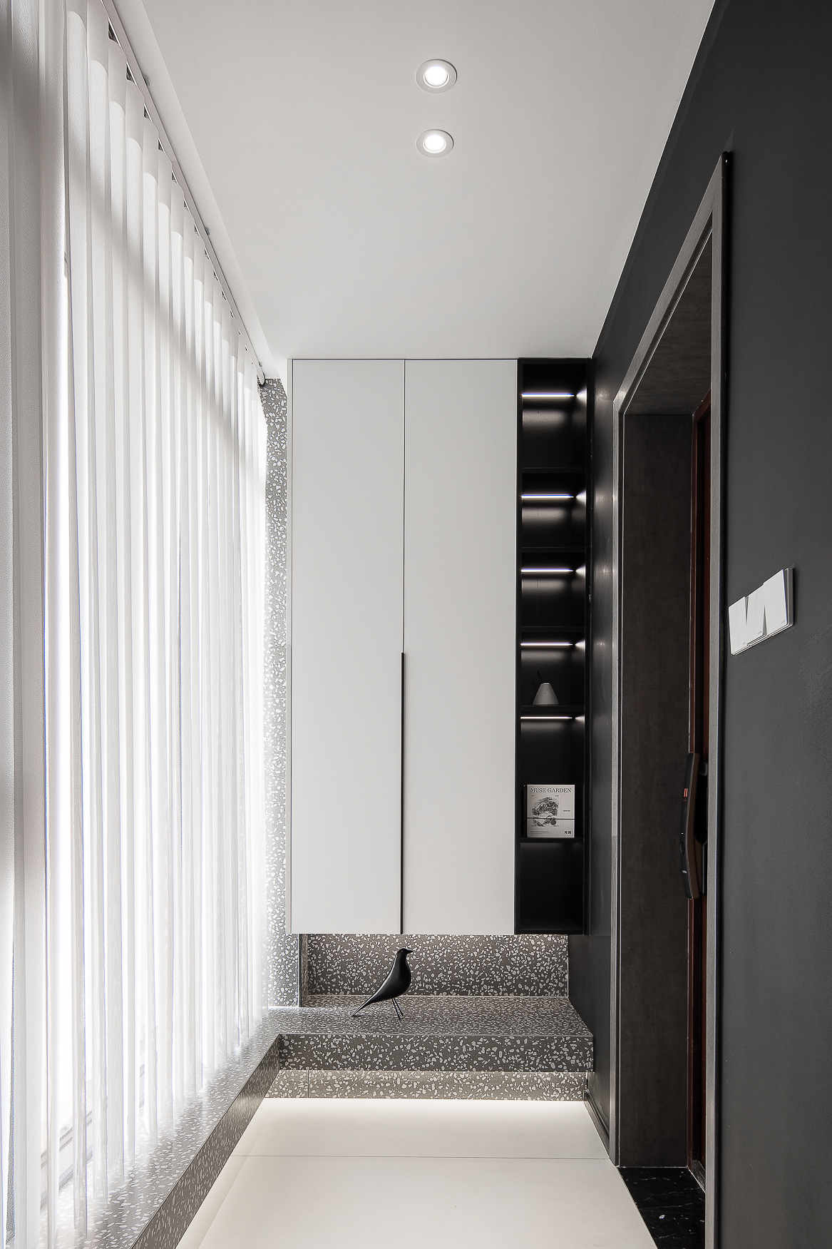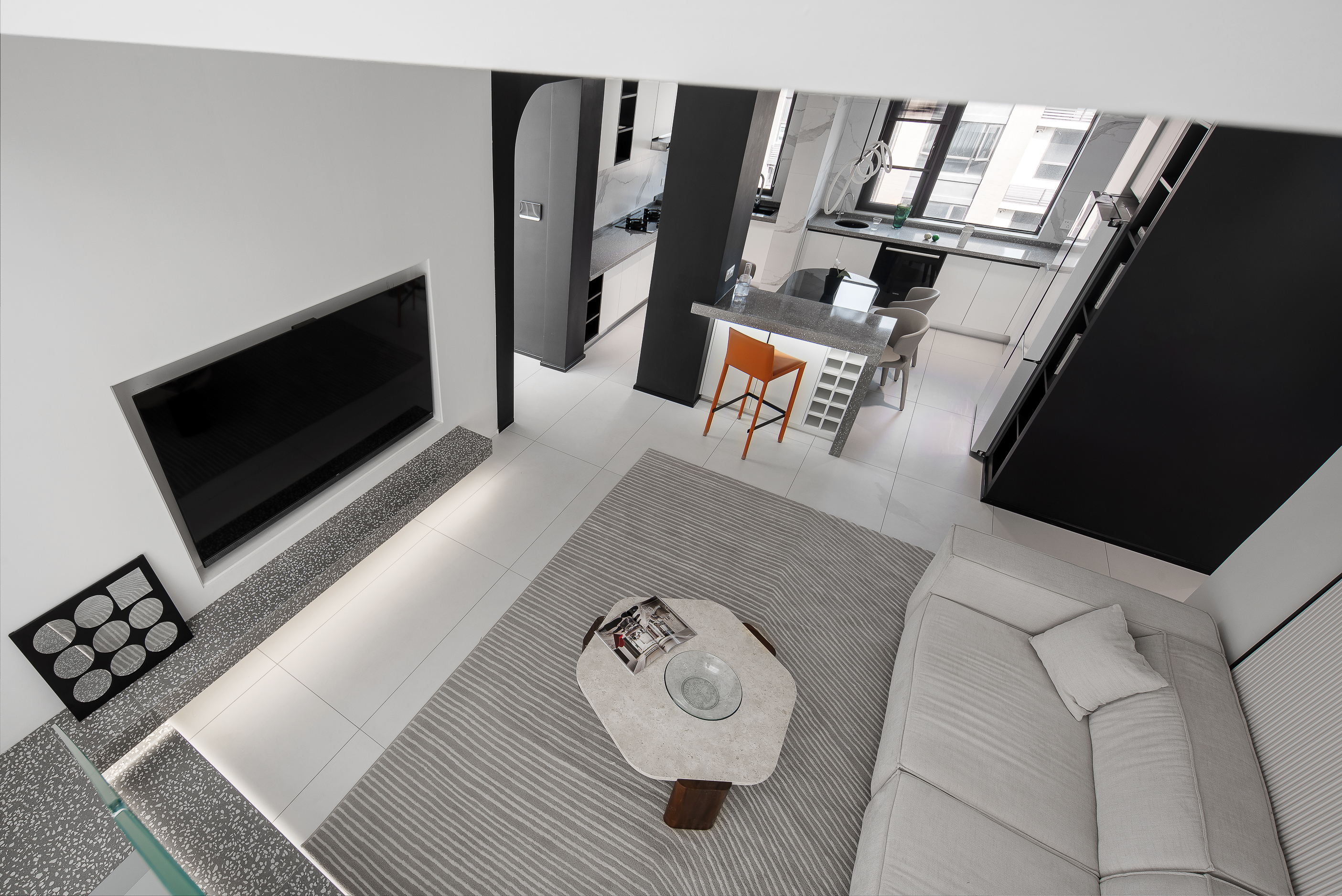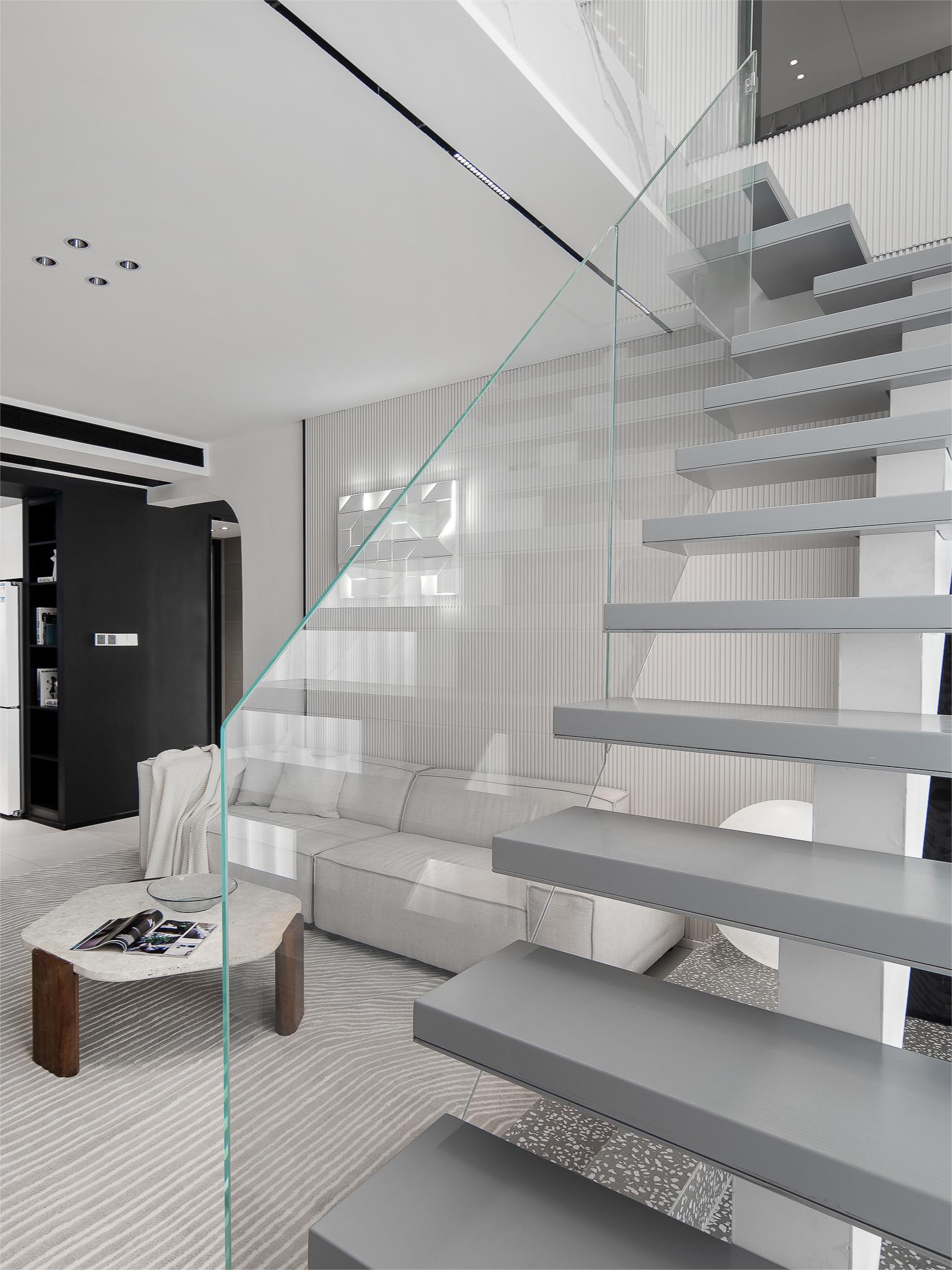全屋通过空间结构来实现效果表现,设计师选择最为传统的白色乳胶漆,依靠层次细节表达。本案整体设计使用黑白灰色系给予了空间理性简约的基调,通过黑白灰的碰撞打造出极简又极具时尚感的空间氛围。