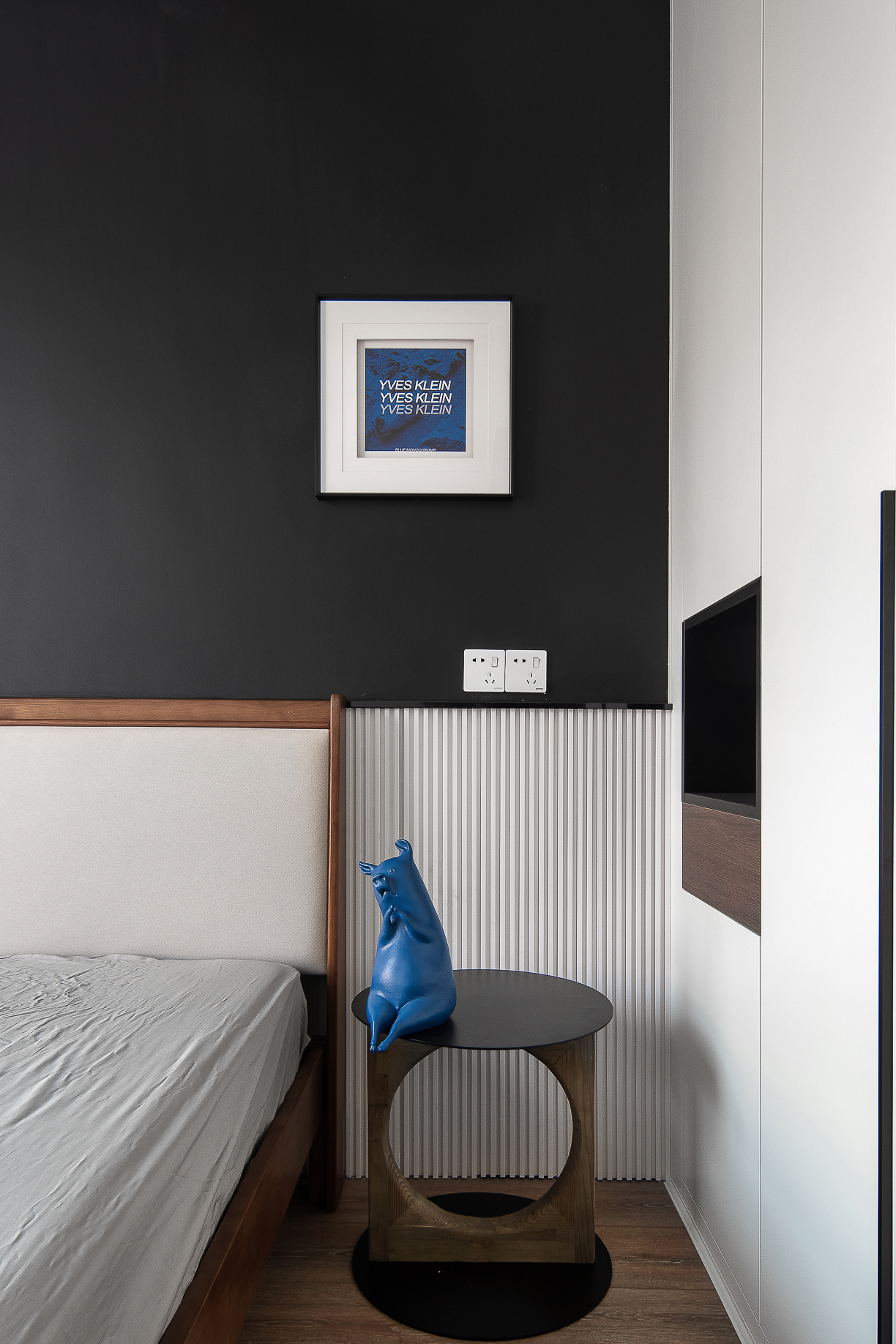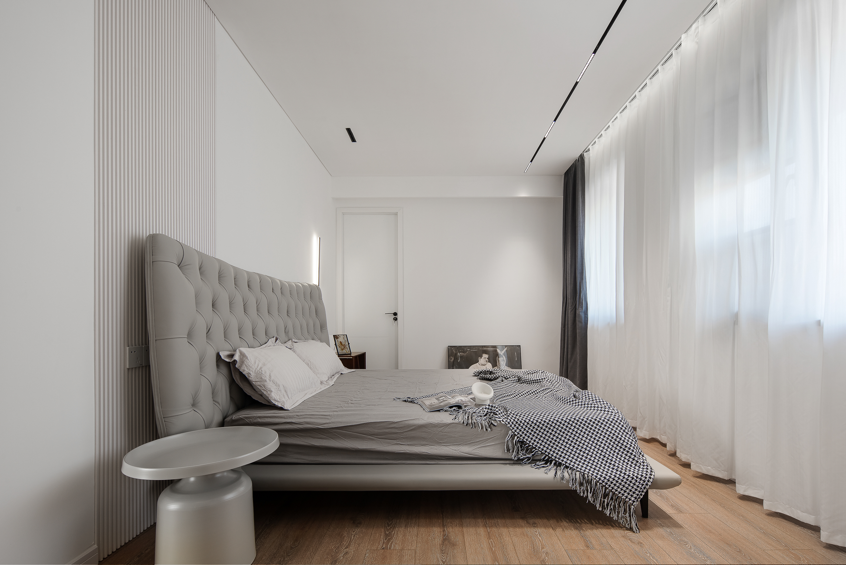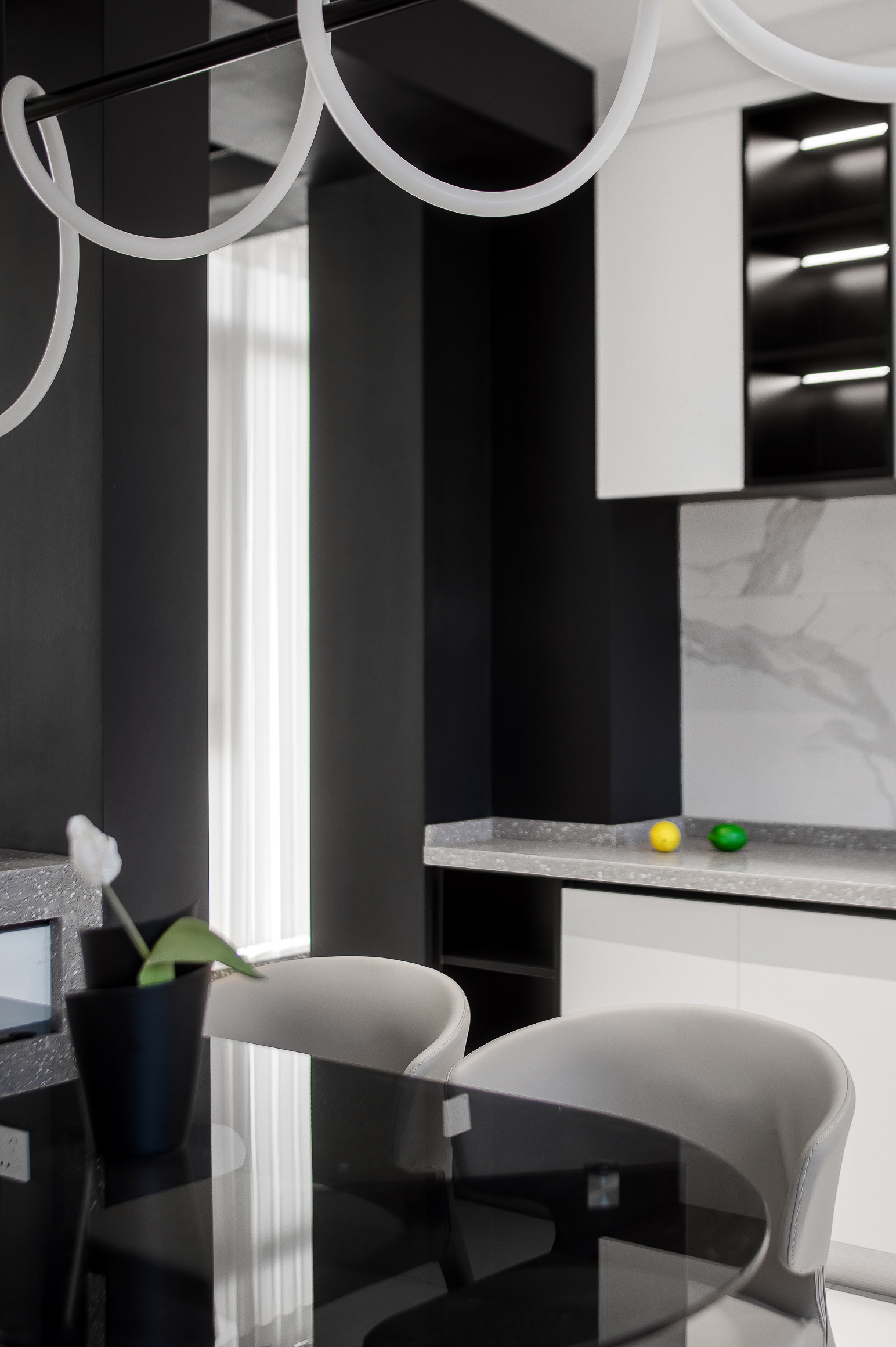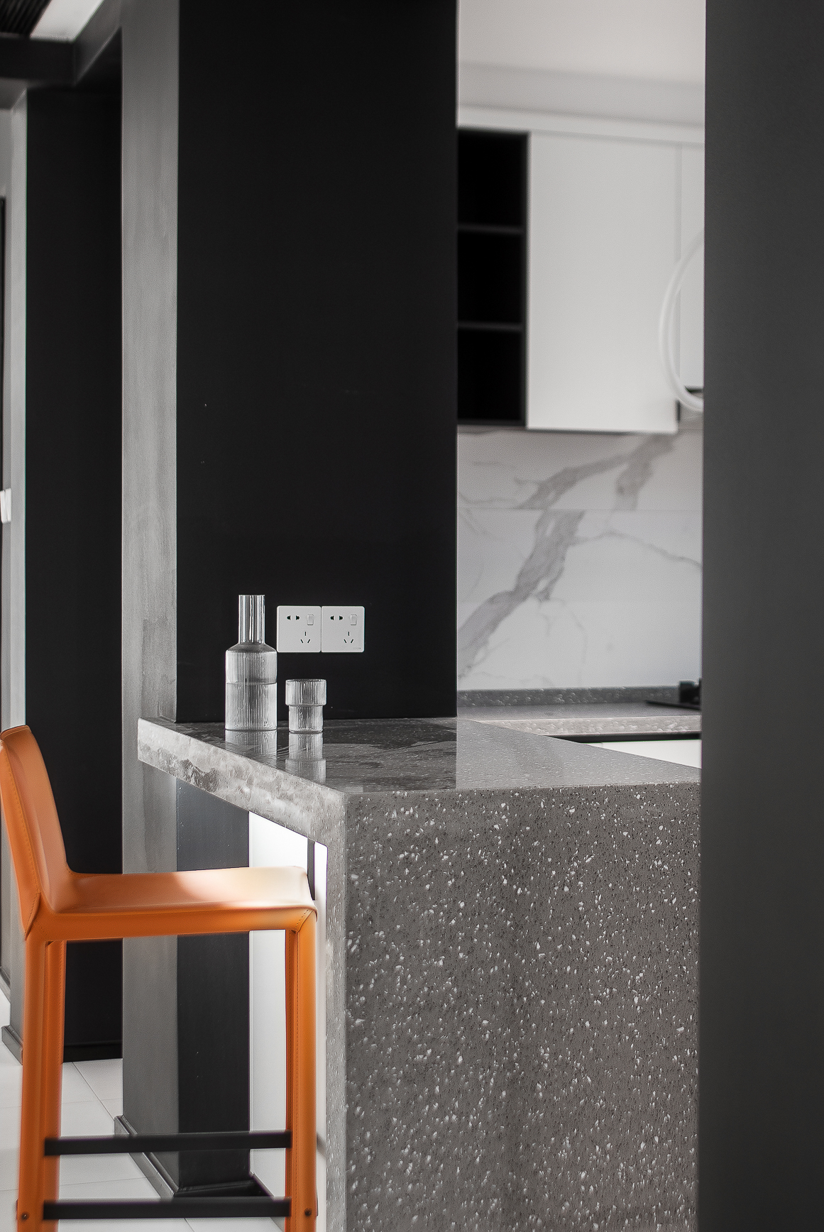 全屋通过空间结构来实现效果表现,设计师选择最为传统的白色乳胶漆,依靠层次细节表达。本案整体设计使用黑白灰色系给予了空间理性简约的基调,通过黑白灰的碰撞打造出极简又极具时尚感的空间氛围。