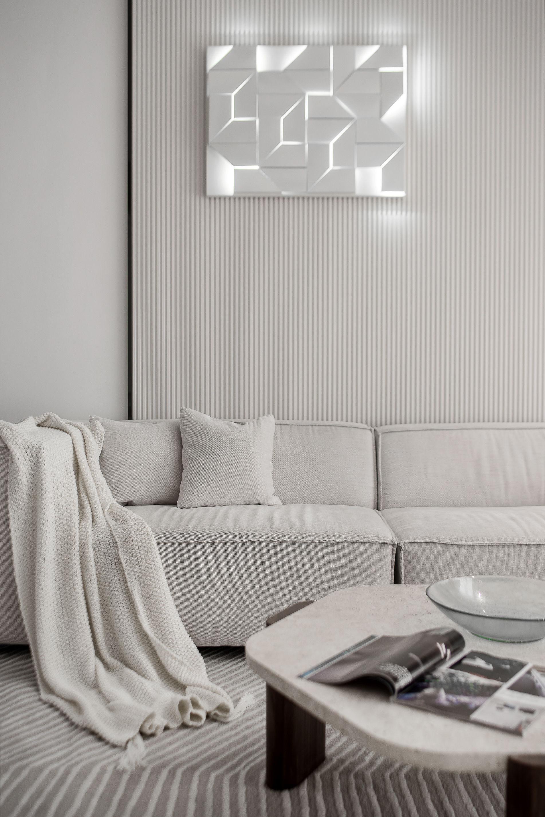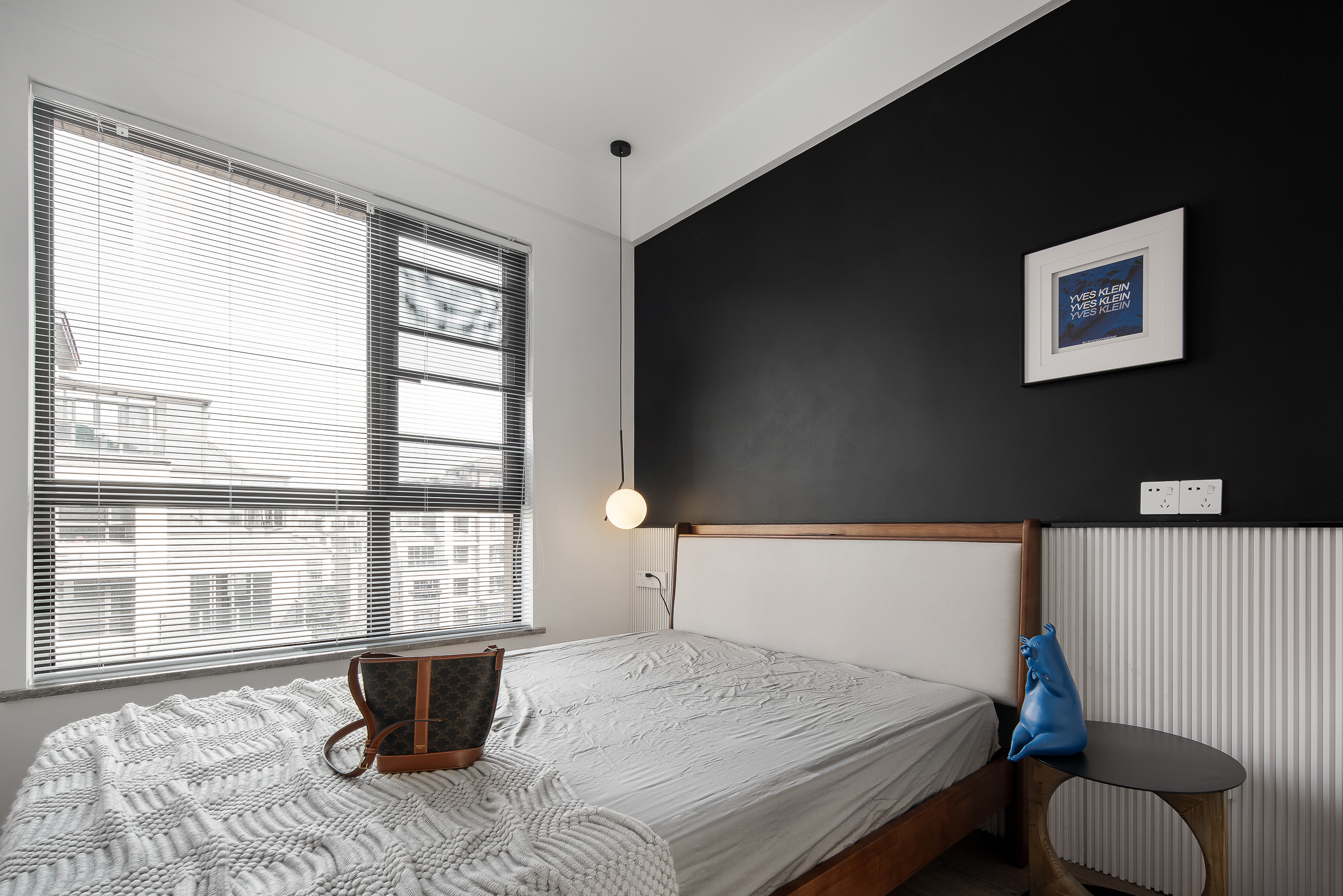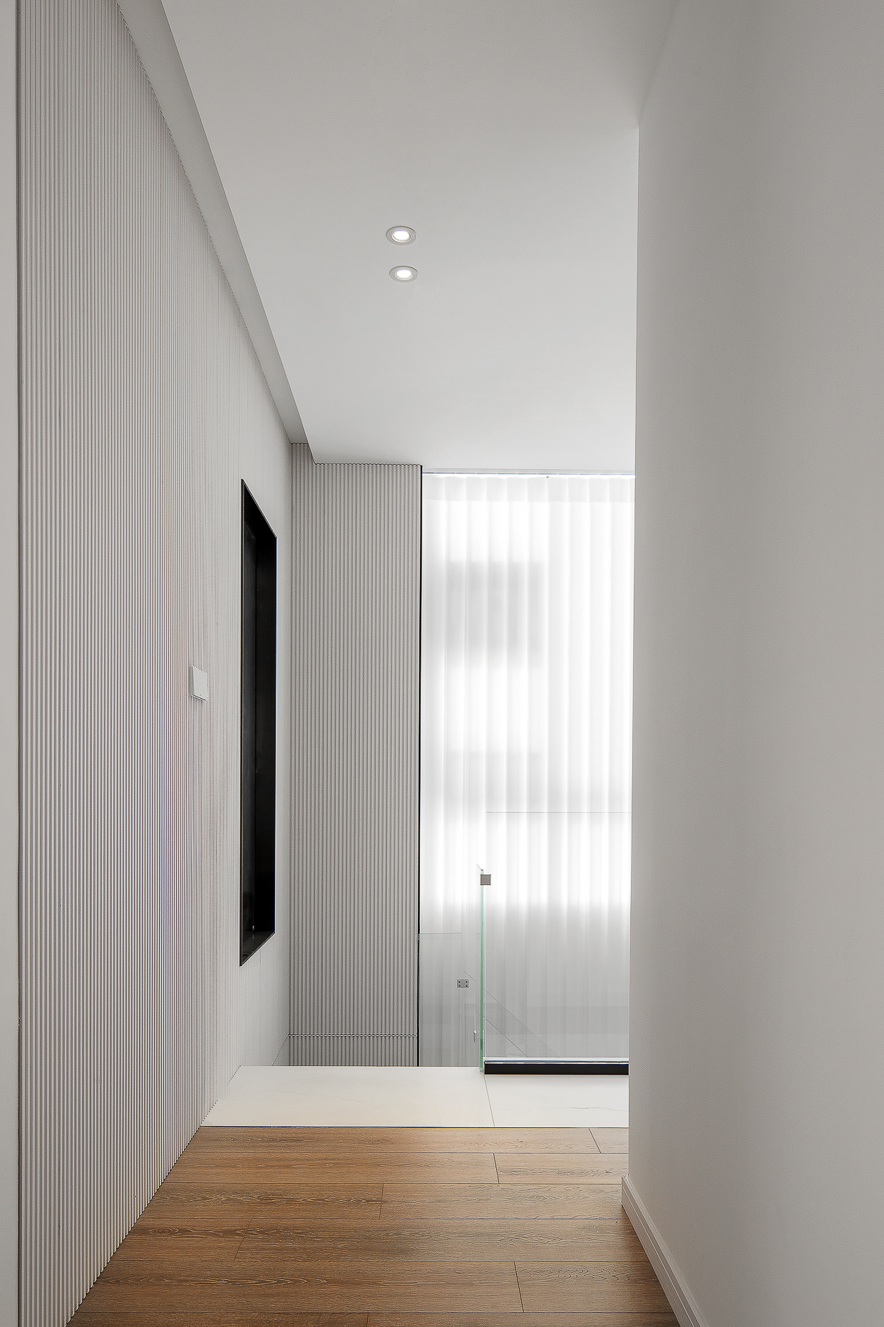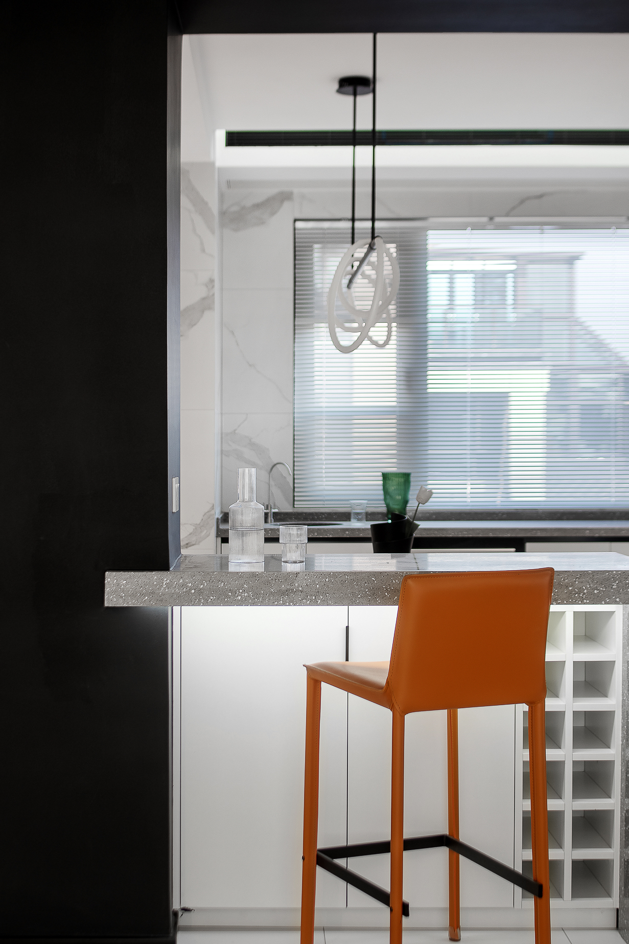 全屋通过空间结构来实现效果表现,设计师选择最为传统的白色乳胶漆,依靠层次细节表达。本案整体设计使用黑白灰色系给予了空间理性简约的基调,通过黑白灰的碰撞打造出极简又极具时尚感的空间氛围。