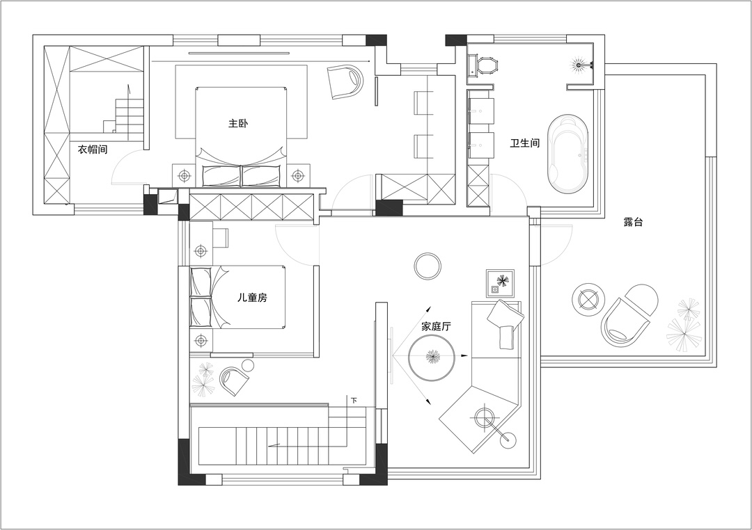 业主之前对赠送的屋顶并没有兴趣,现在通过楼梯的结构加强两层空间的联系,让他们重新认识这套新房,设计师给二楼增加了屋顶露天露台和游戏休闲空间,业主每天都迫不及待的想在二层找回那充满激情的年轻岁月!