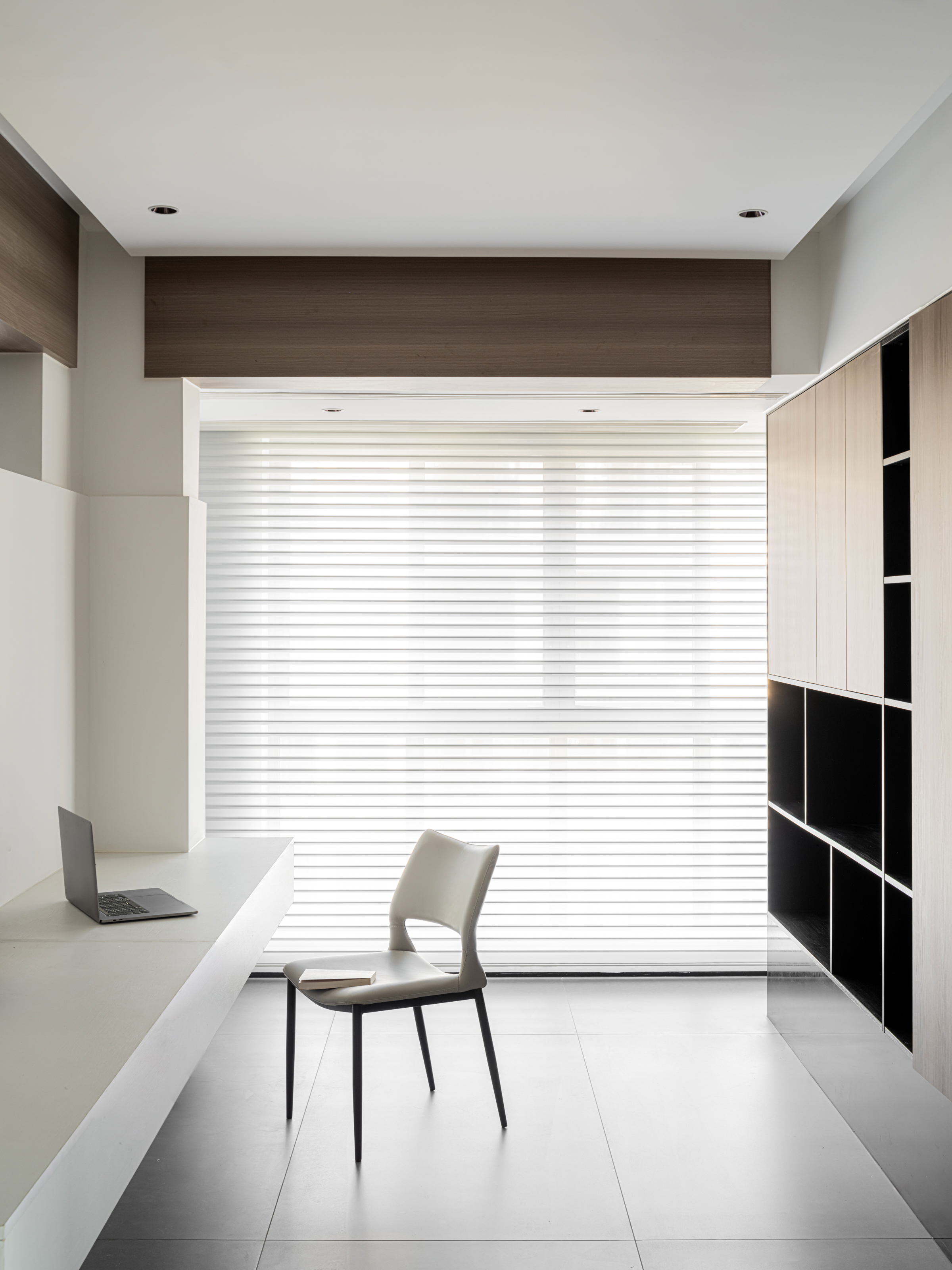 空间意境:秉持木元素的自然调性,完成书房的透景意趣,交融各式各样的功能区,抒发自然浪漫又理性沉稳的空间张力,共创理想的精神岛屿。模糊场域的分隔感,于进出之间,串联静谧的美好与亲密的互动。
