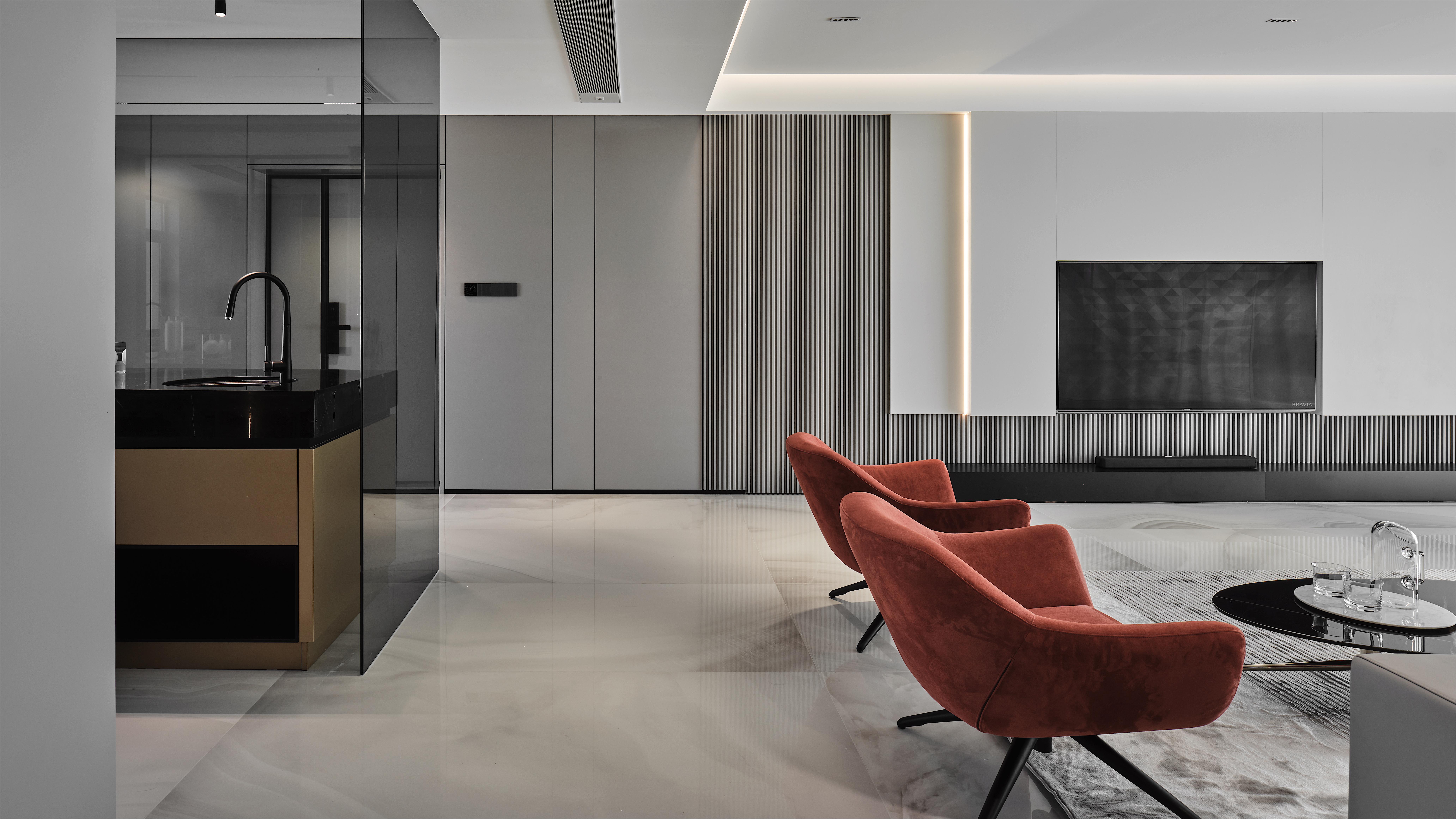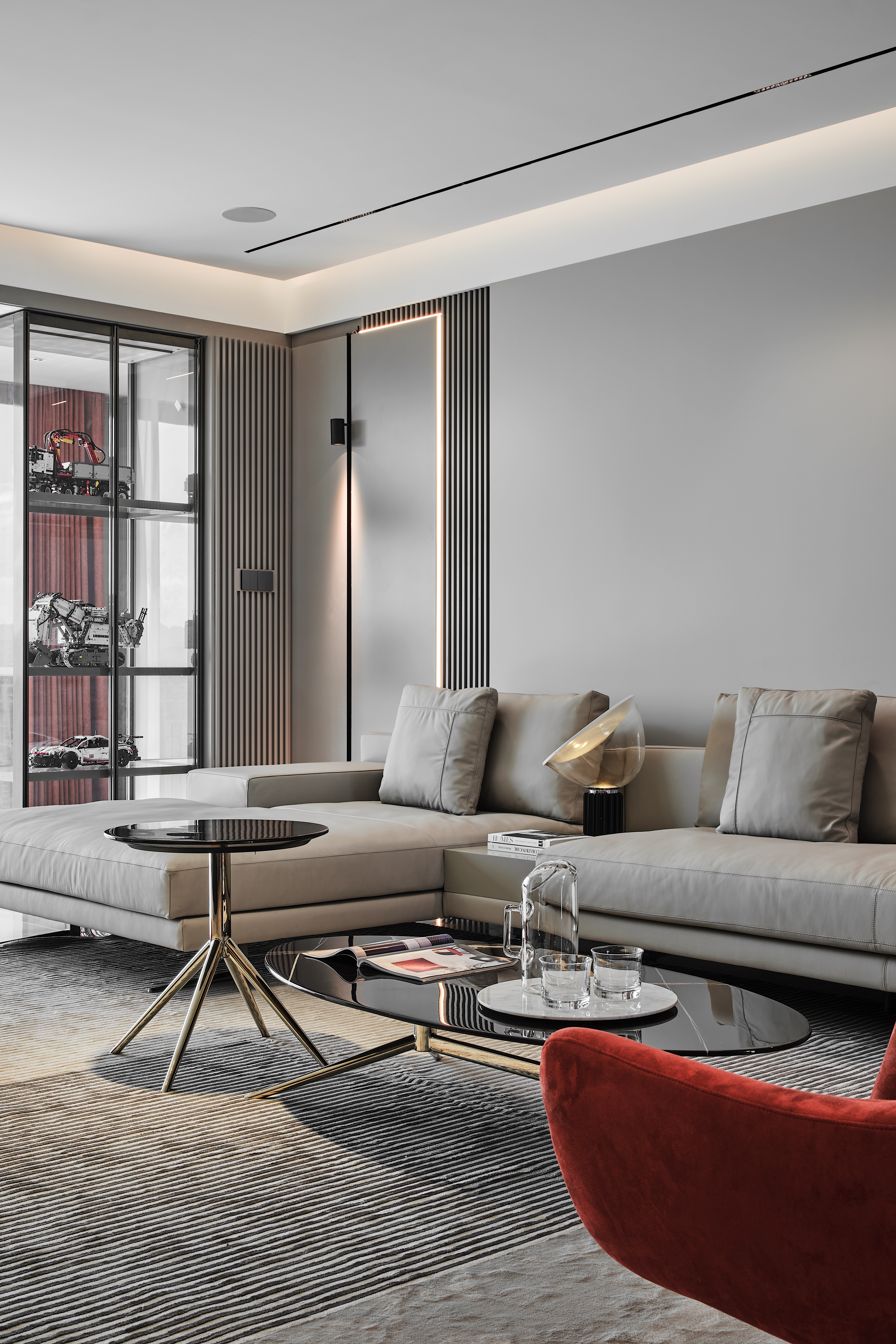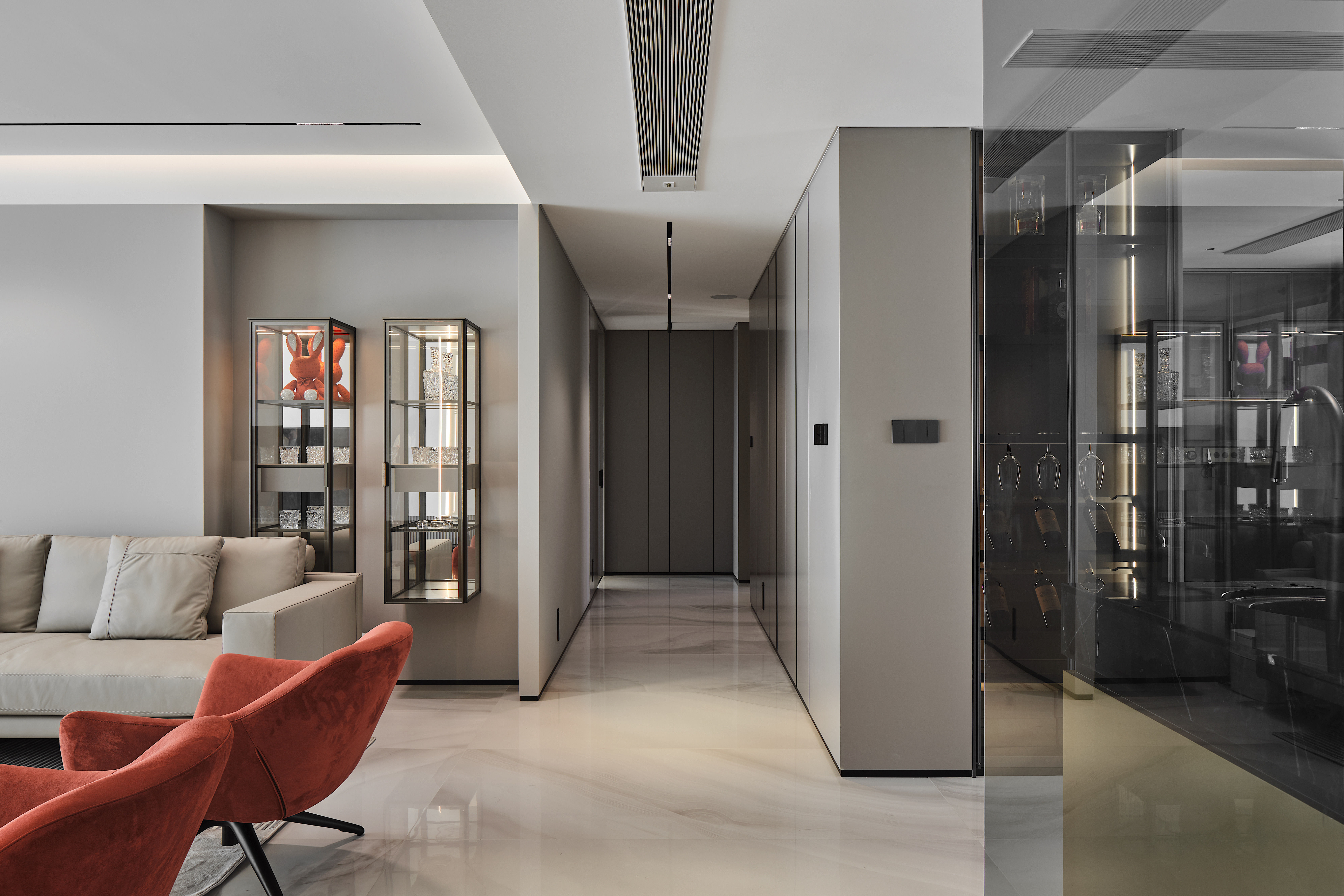 我们选用暖灰色作为空间的主色调,以艺术漆、木饰面、玻璃及大理石等材质为载体,传达出不同的空间质感,低饱和度的色彩让空间在温馨的同时也更加高级耐看。红色绒面的单椅增加空间层次,赋予一种都市生活的精致和年轻的调性。