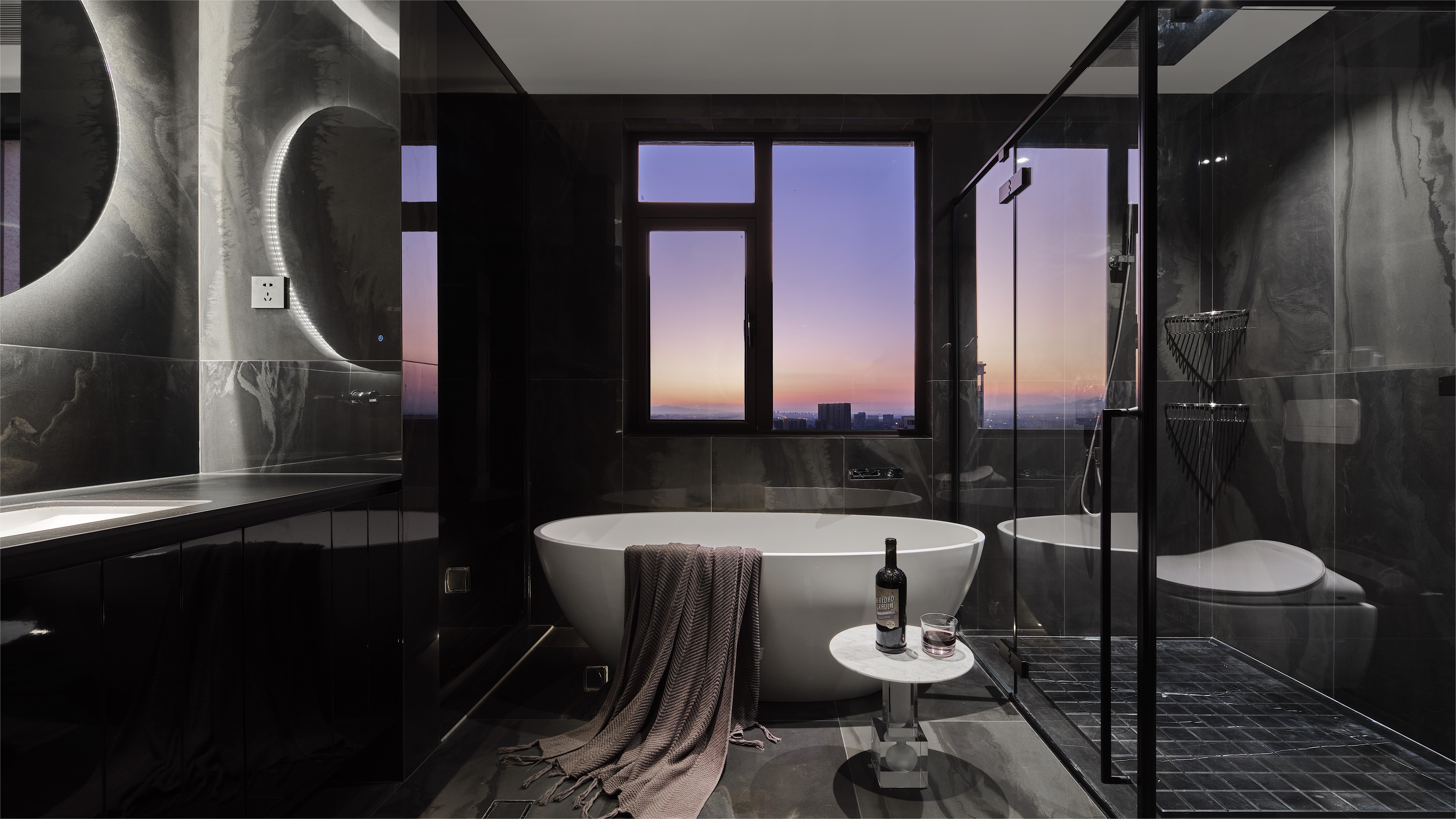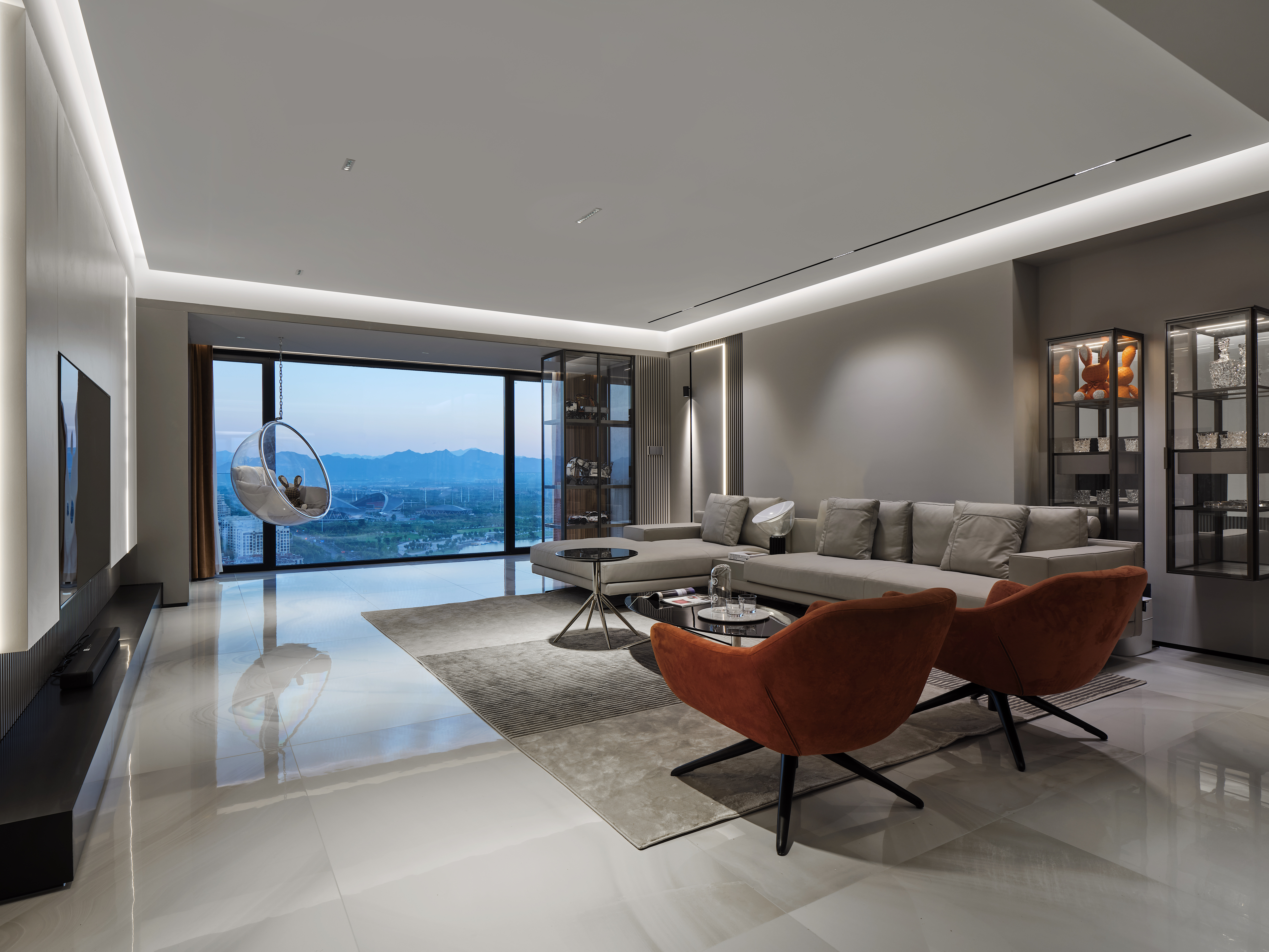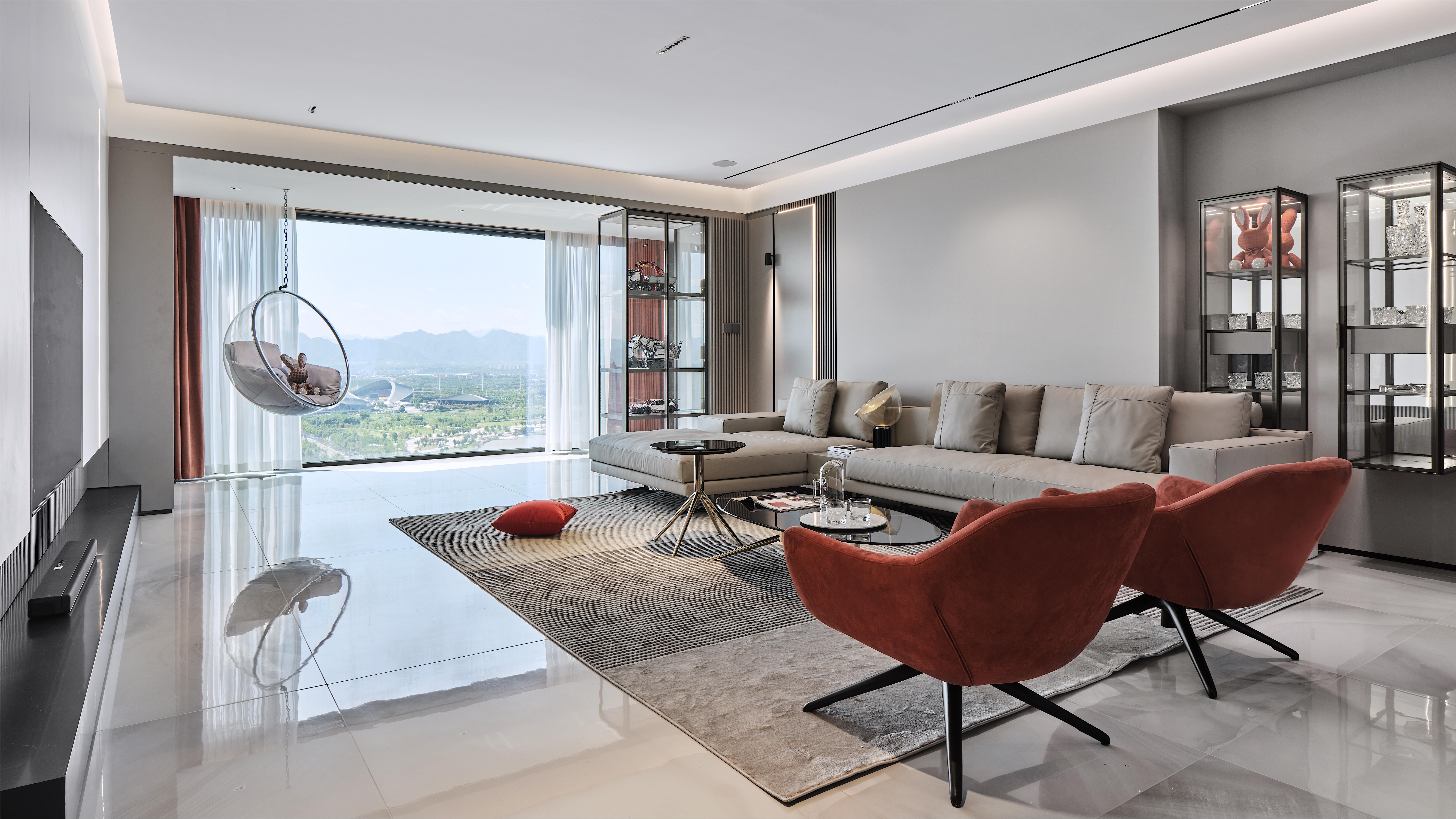 我们选用暖灰色作为空间的主色调,以艺术漆、木饰面、玻璃及大理石等材质为载体,传达出不同的空间质感,低饱和度的色彩让空间在温馨的同时也更加高级耐看。红色绒面的单椅增加空间层次,赋予一种都市生活的精致和年轻的调性。