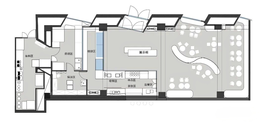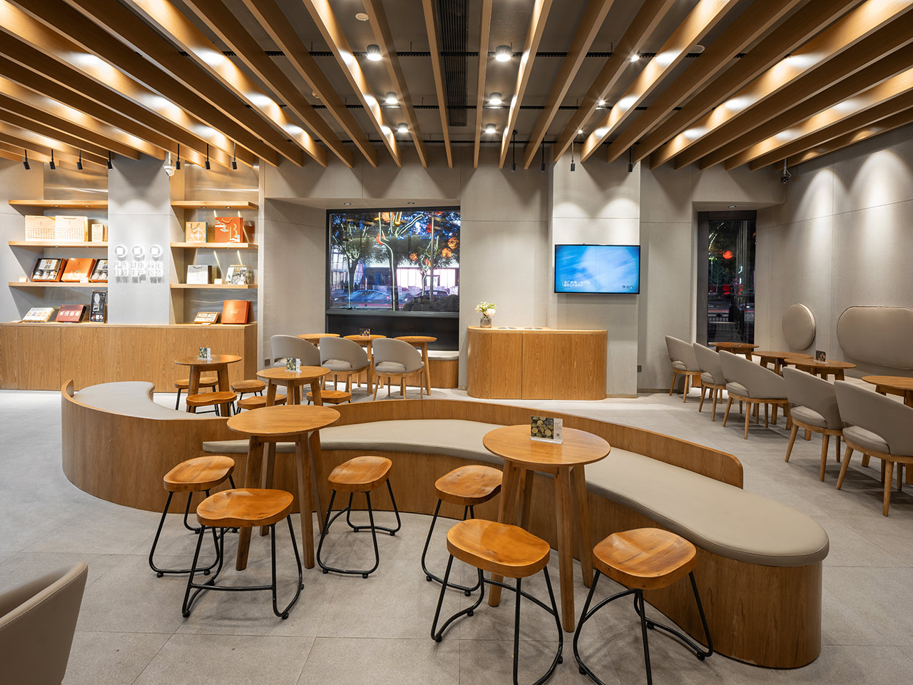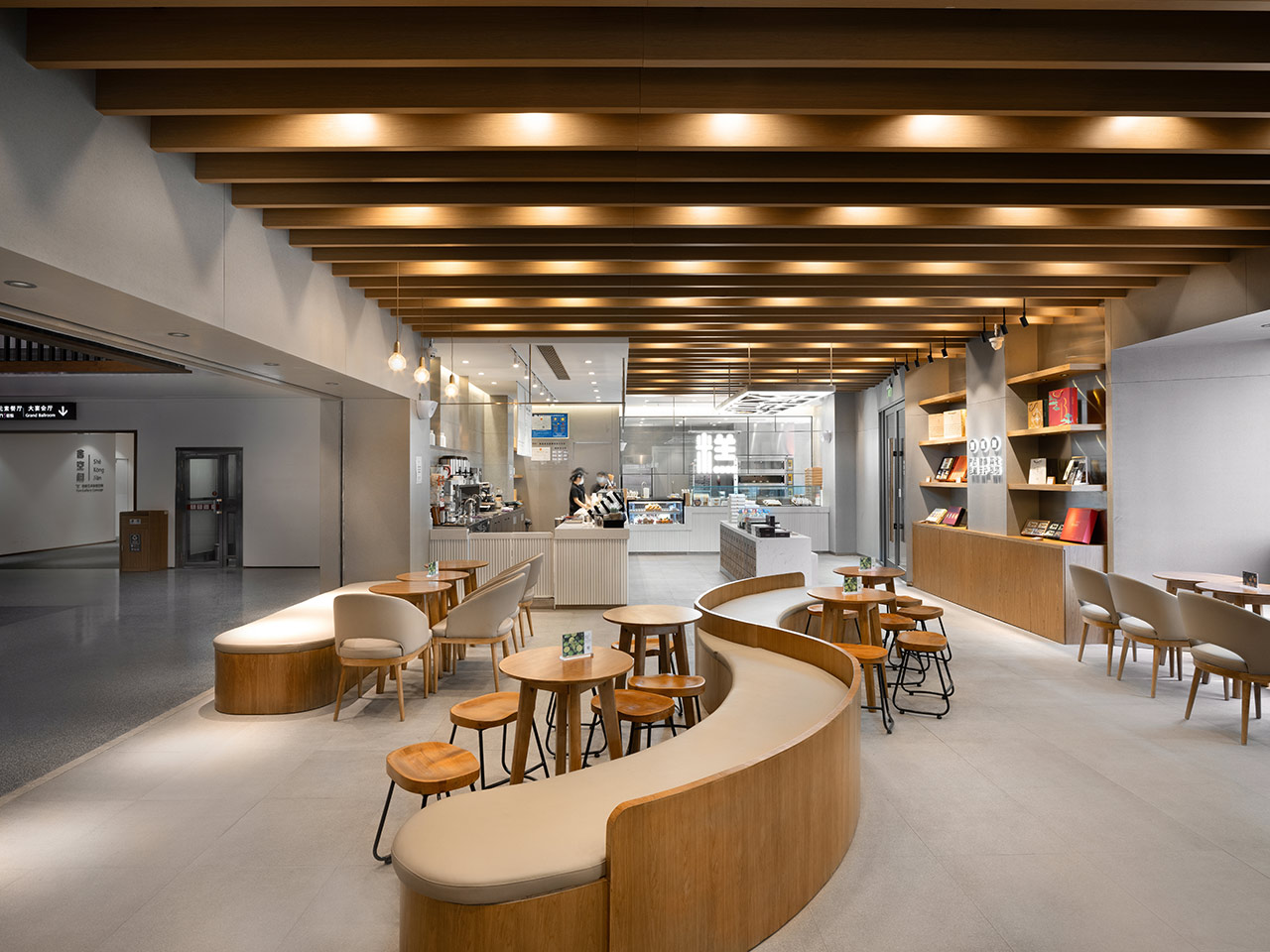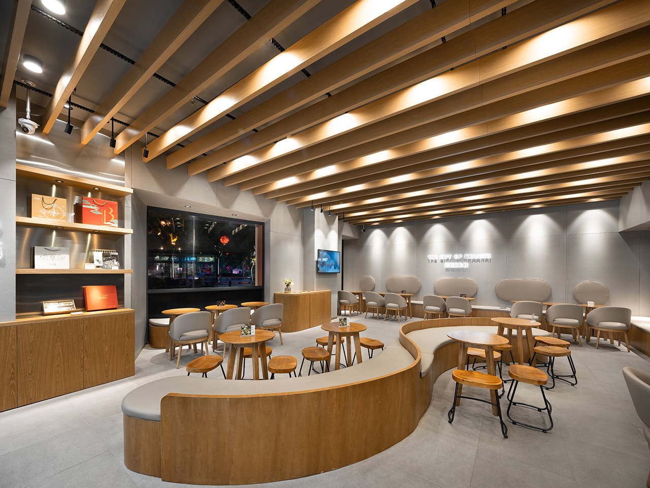 空间布局:在空间布局上,巧妙地运用了弧线与角度的变化,使得整个空间显得宽敞而又不失私密感。从入口到坐席区,每一个转角都经过精心设计,旨在为顾客带来流畅的动线体验。舒适的坐席区空间设计是餐厅的一大亮点,S型座椅采用弧线精美造型,实现空间的交流与融合,让顾客在品尝美食的同时,也能享受到一段悠闲的时光。无论是家庭聚会还是朋友小聚,这里都能提供一个温馨、愉悦的氛围。