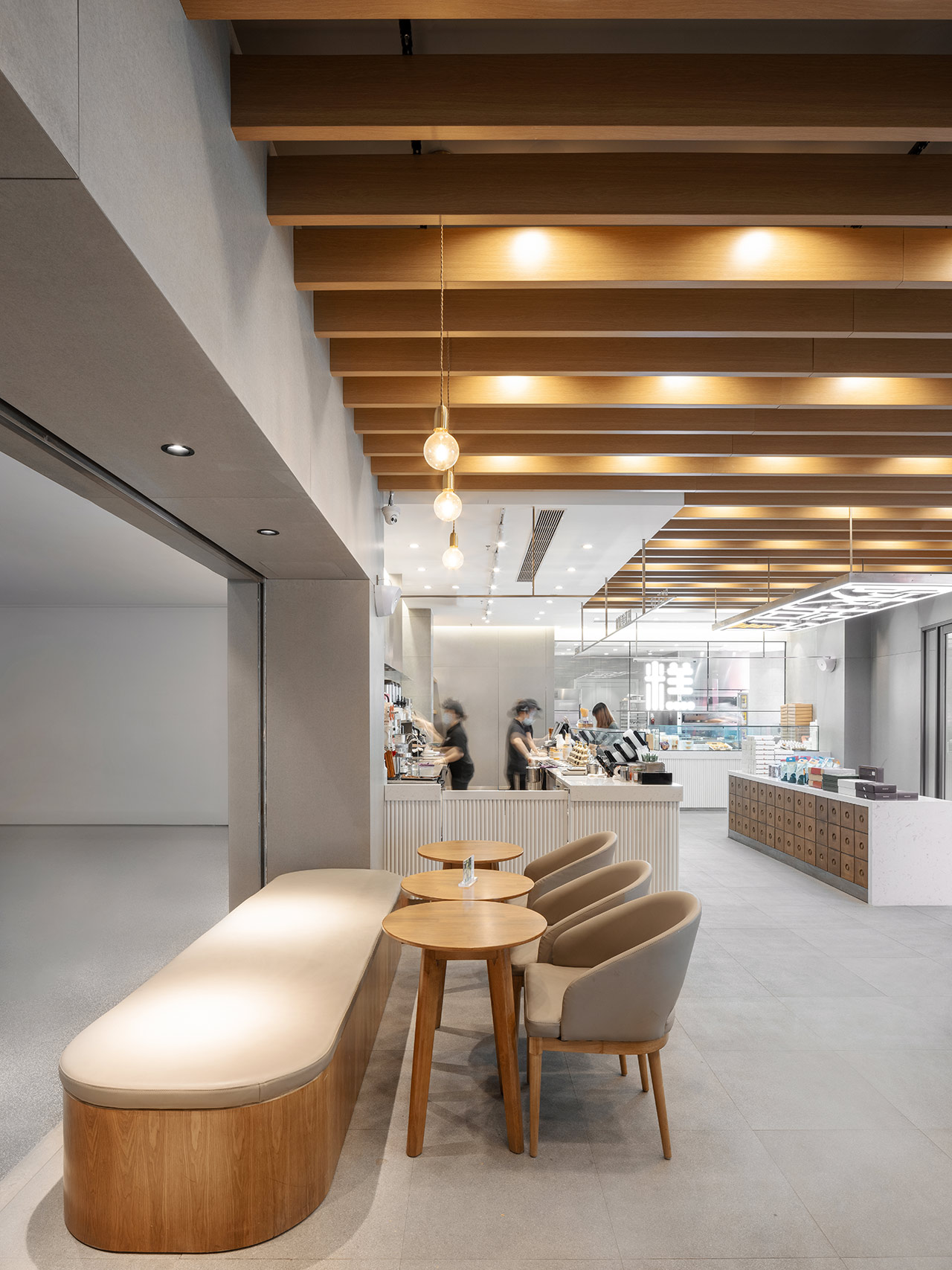 设计选材:整体色调搭配温暖明亮,统一的色调带给人们更加舒适的环境体验感。S型座椅采用连续弧线的精美造型,在兼具了顾客用餐的私密性,实现空间的交流与融合的同时,独特的造型又使得整体空间隔而不断,更显灵活通透。利用光影、木质感、水泥墙、高质感的纹理以及细致的收口品质,打造出陕拾叁午后温暖的下午茶空间,感受岁月静好。