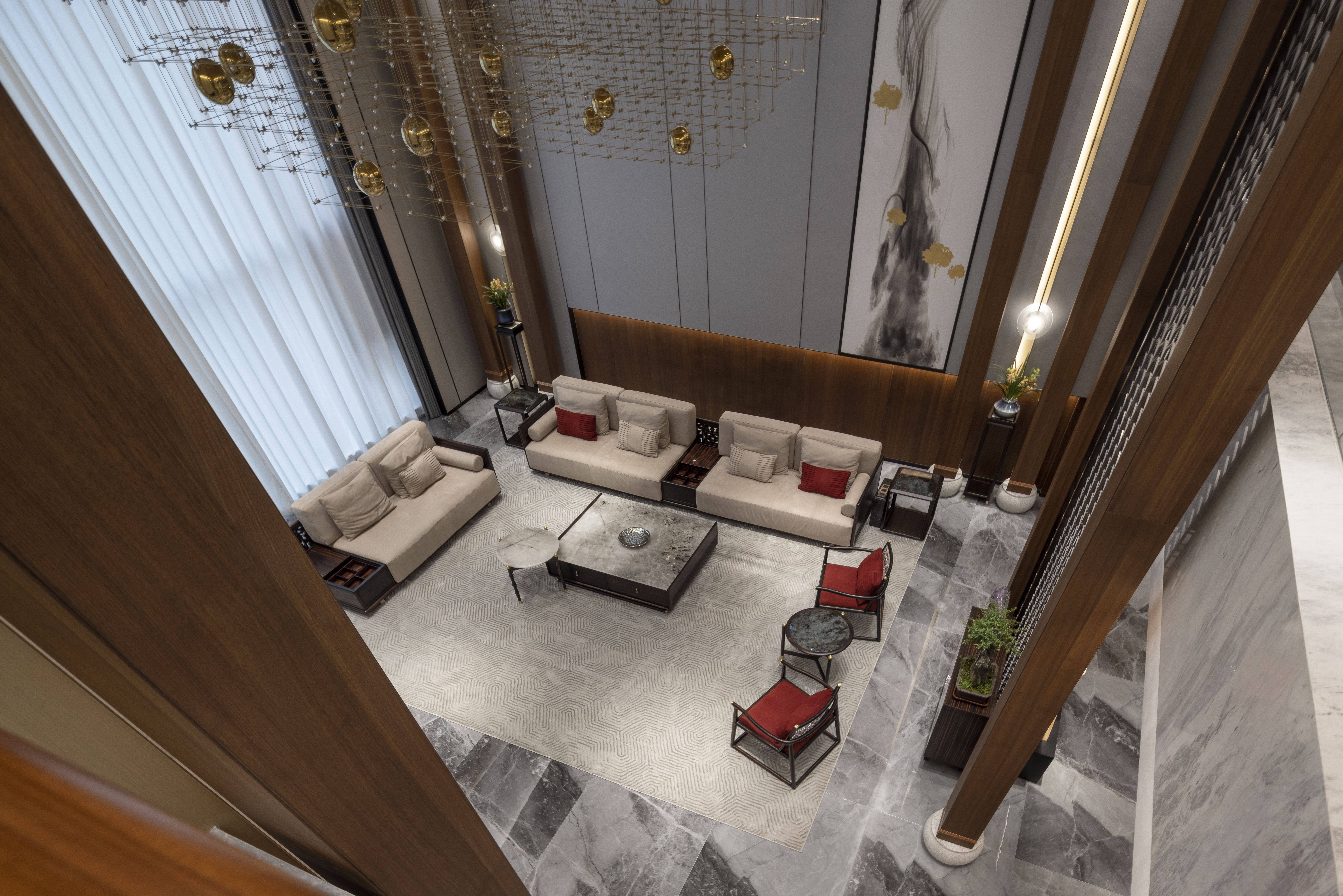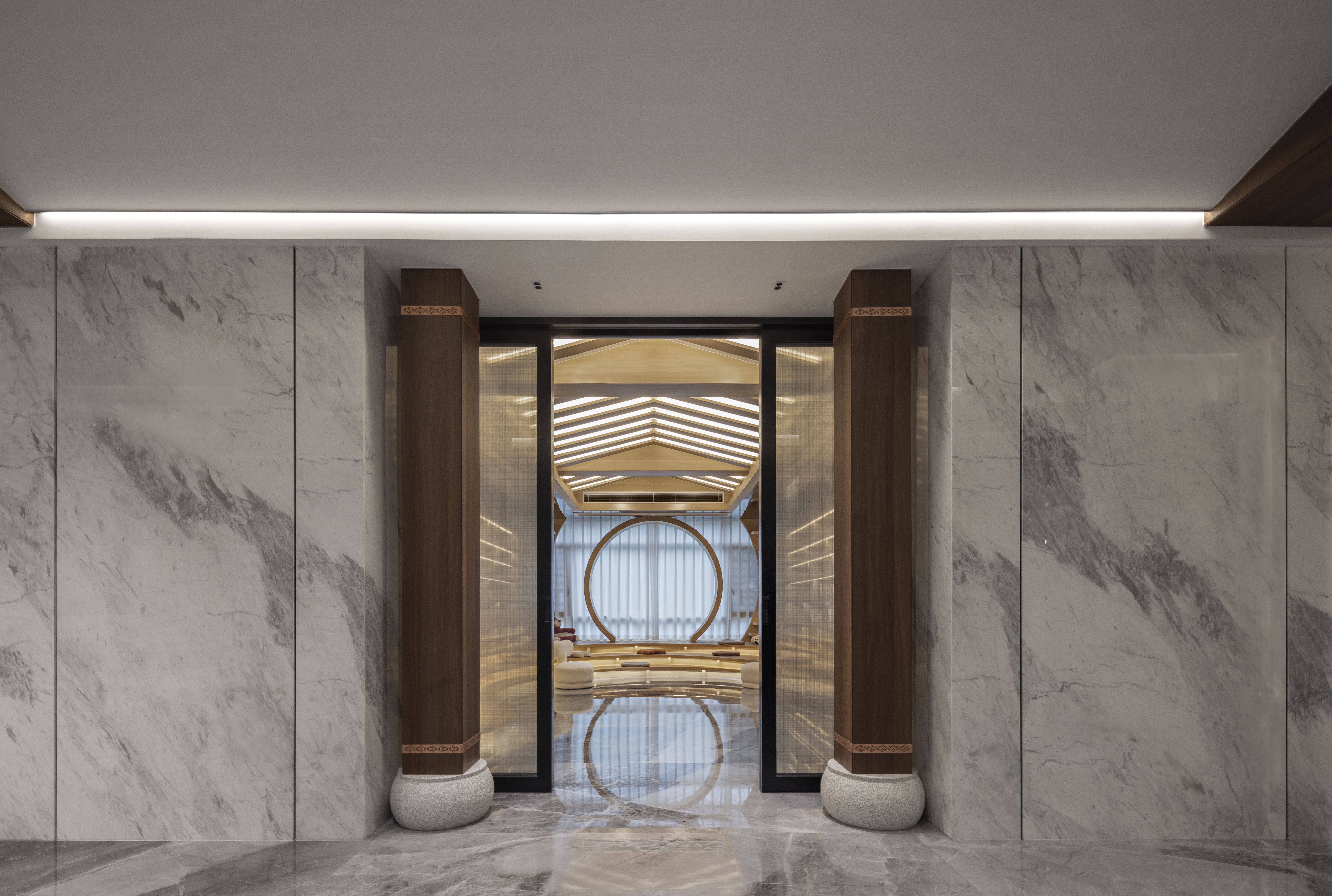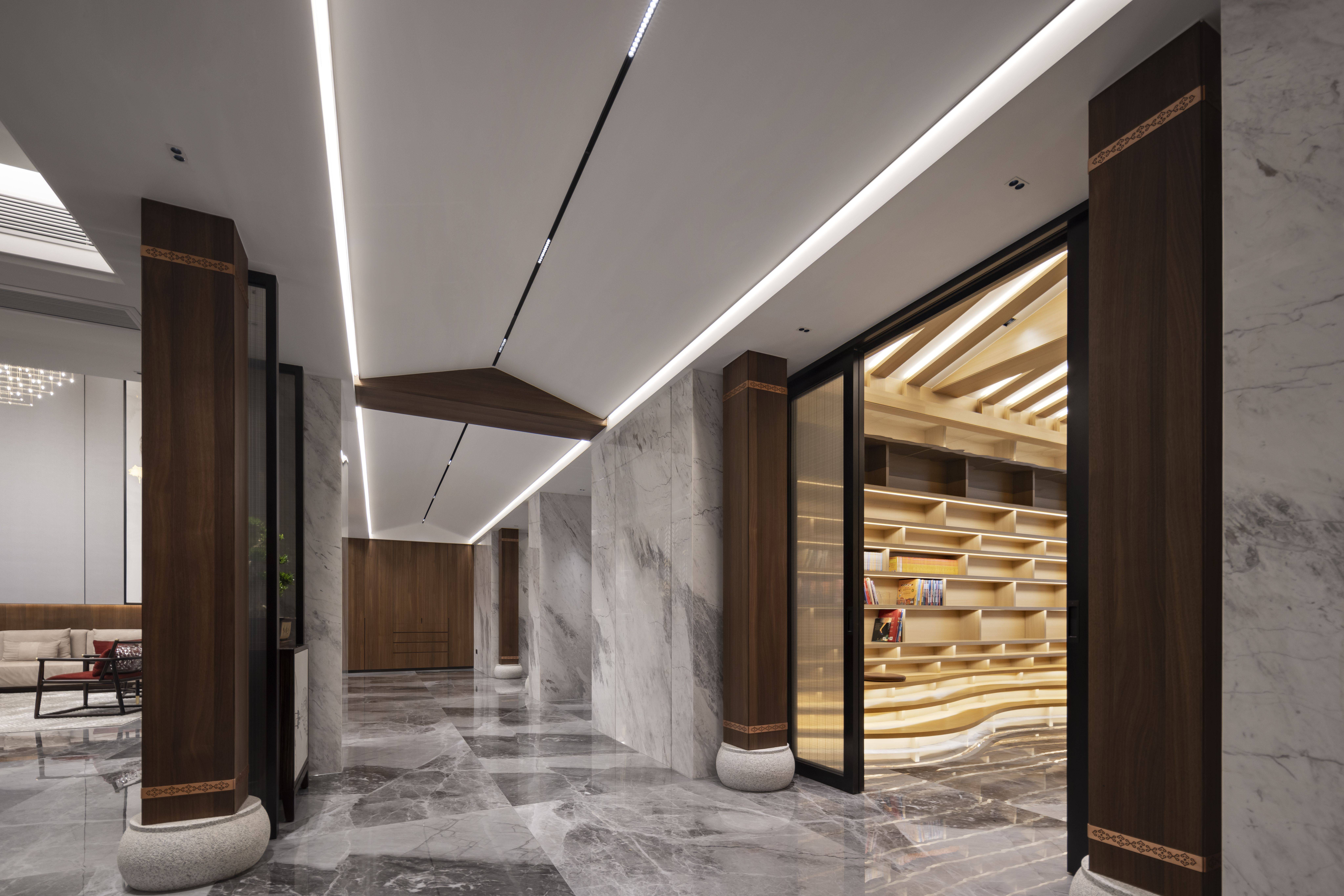 文脉创承,在地觉醒 整个大宅在横梁处的设计作出了灵活的改造,运用“瓦脊概念”将原本冷冰冰的横梁,塑造出古韵十足且充满力量感、安全感的“龙脊”形状,构造出美感与功能结合的空间场域。