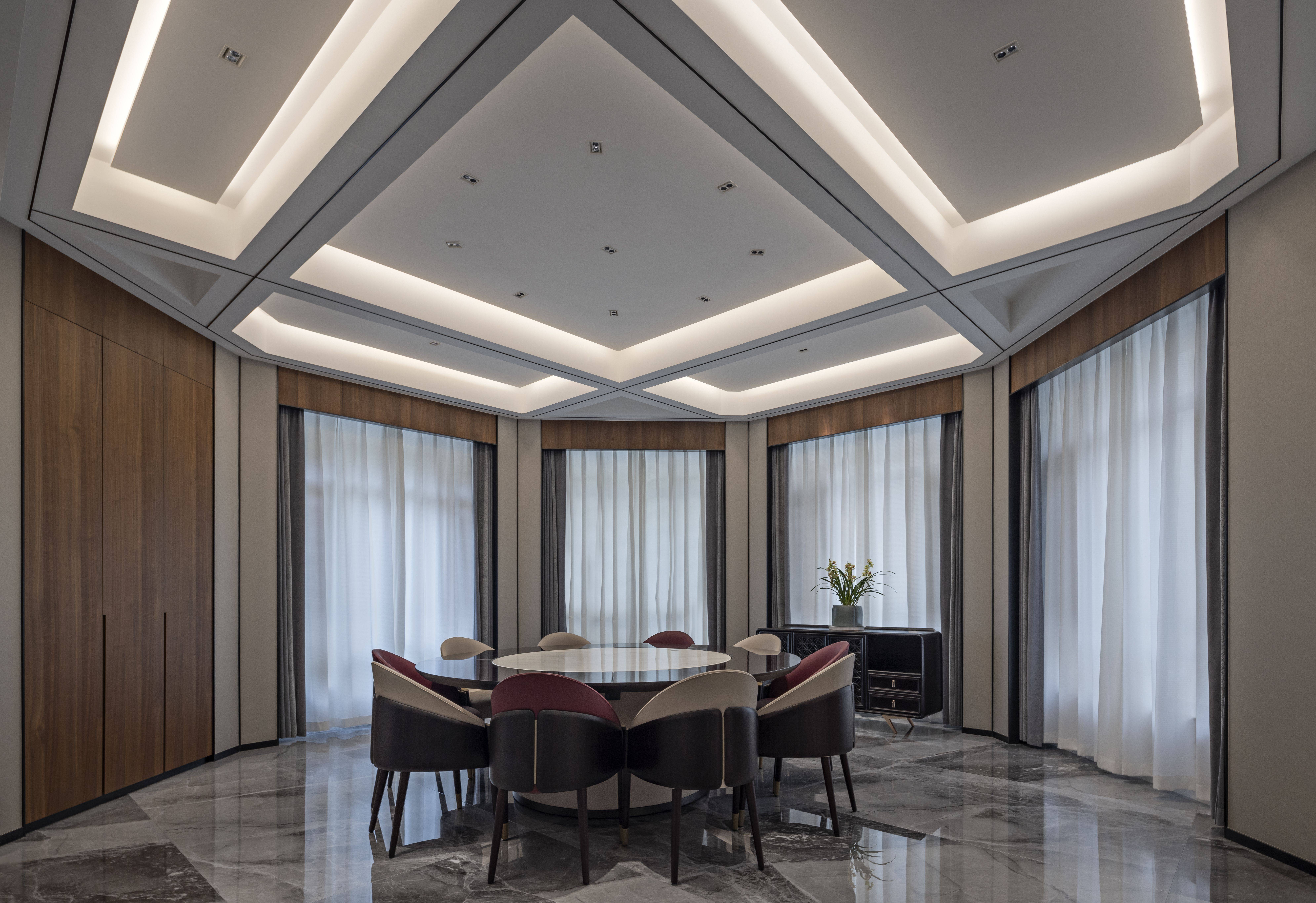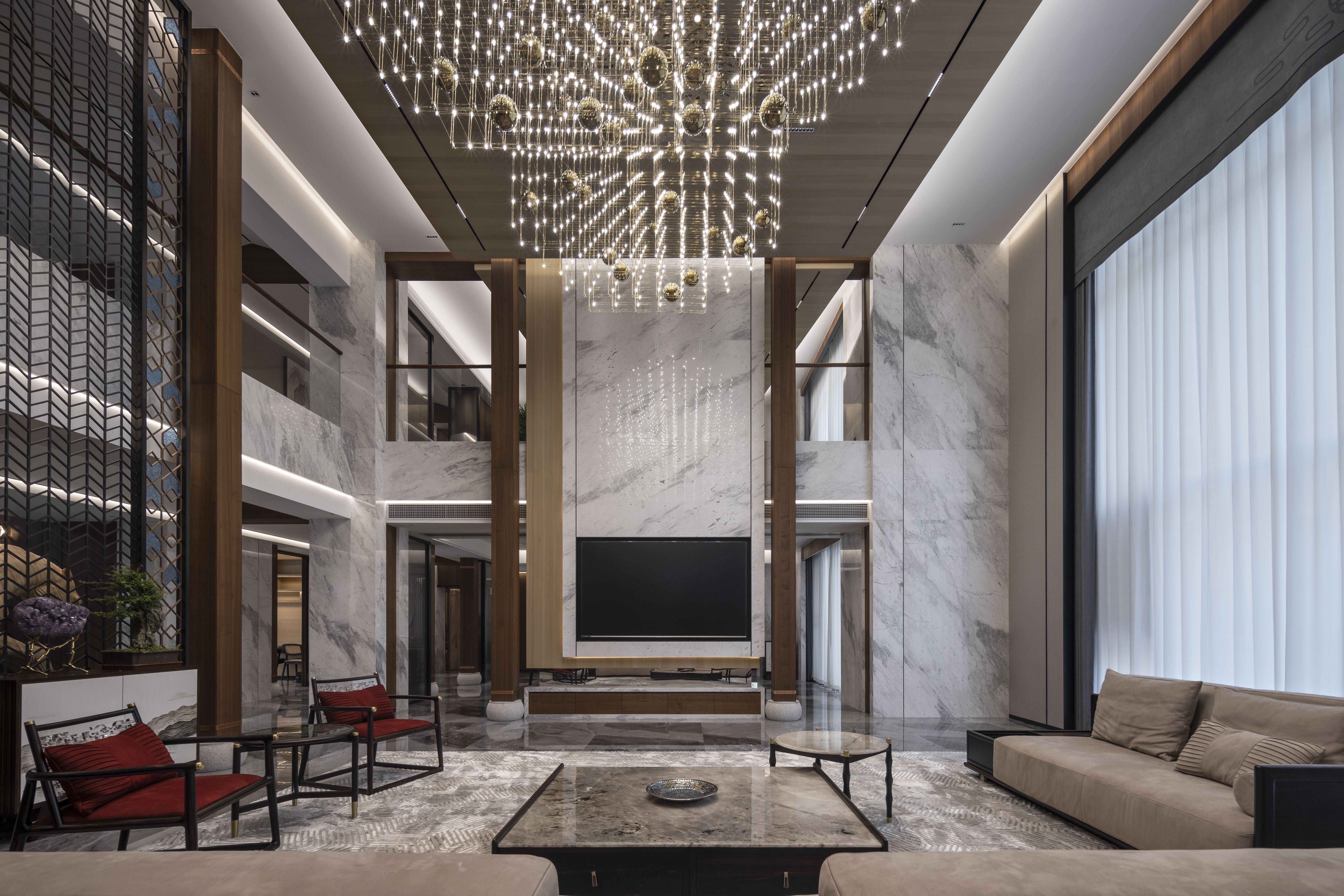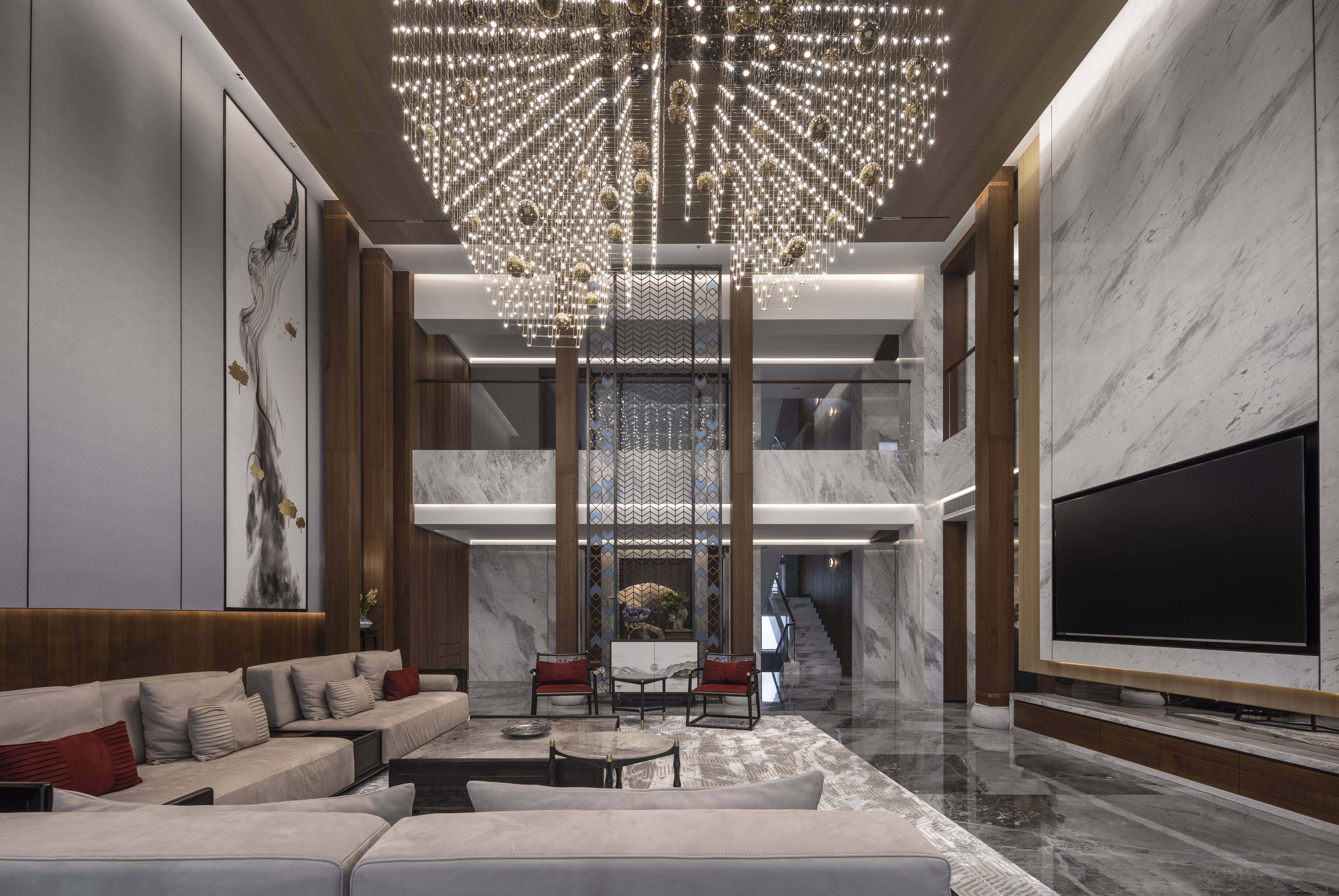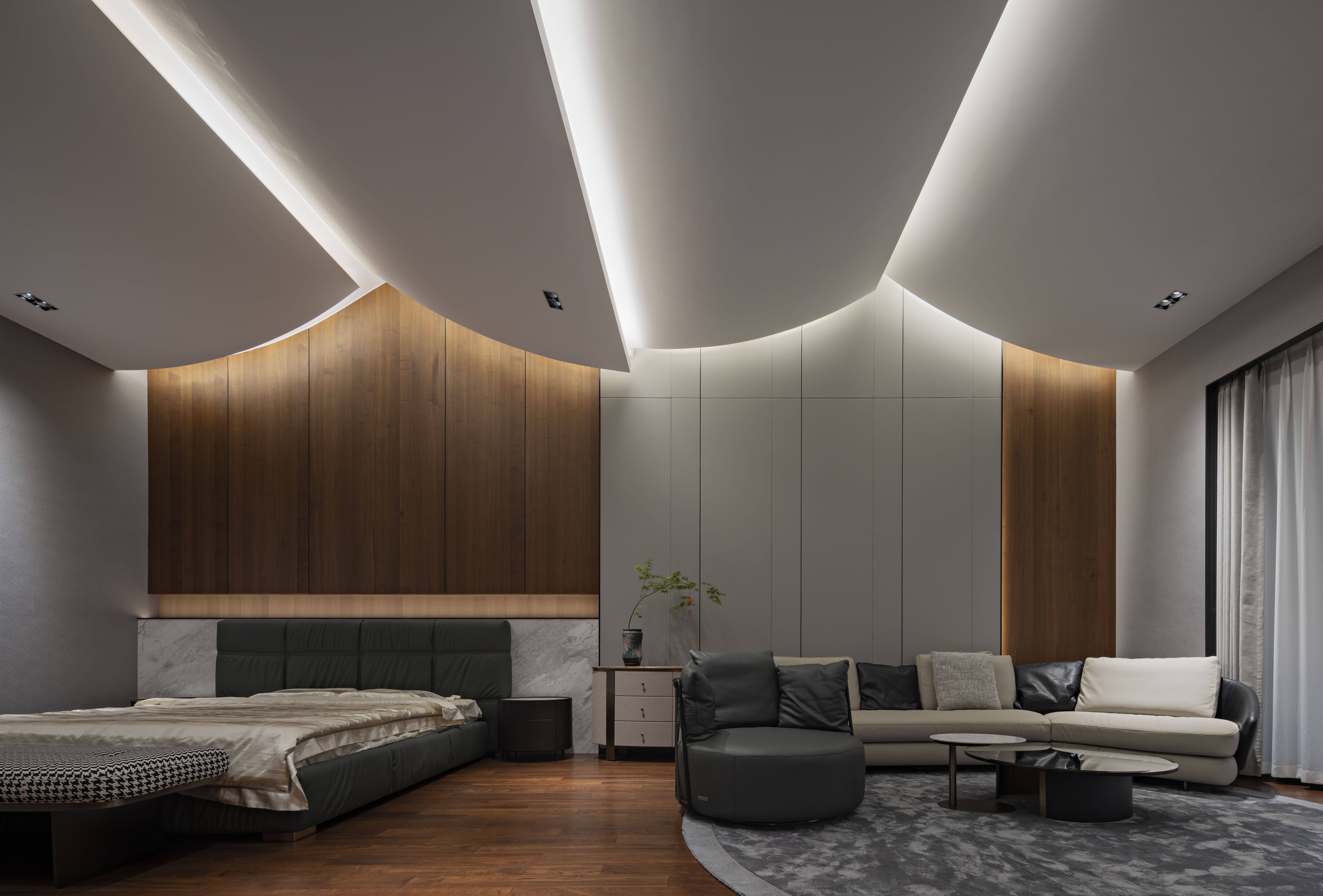 文脉创承,在地觉醒 整个大宅在横梁处的设计作出了灵活的改造,运用“瓦脊概念”将原本冷冰冰的横梁,塑造出古韵十足且充满力量感、安全感的“龙脊”形状,构造出美感与功能结合的空间场域。