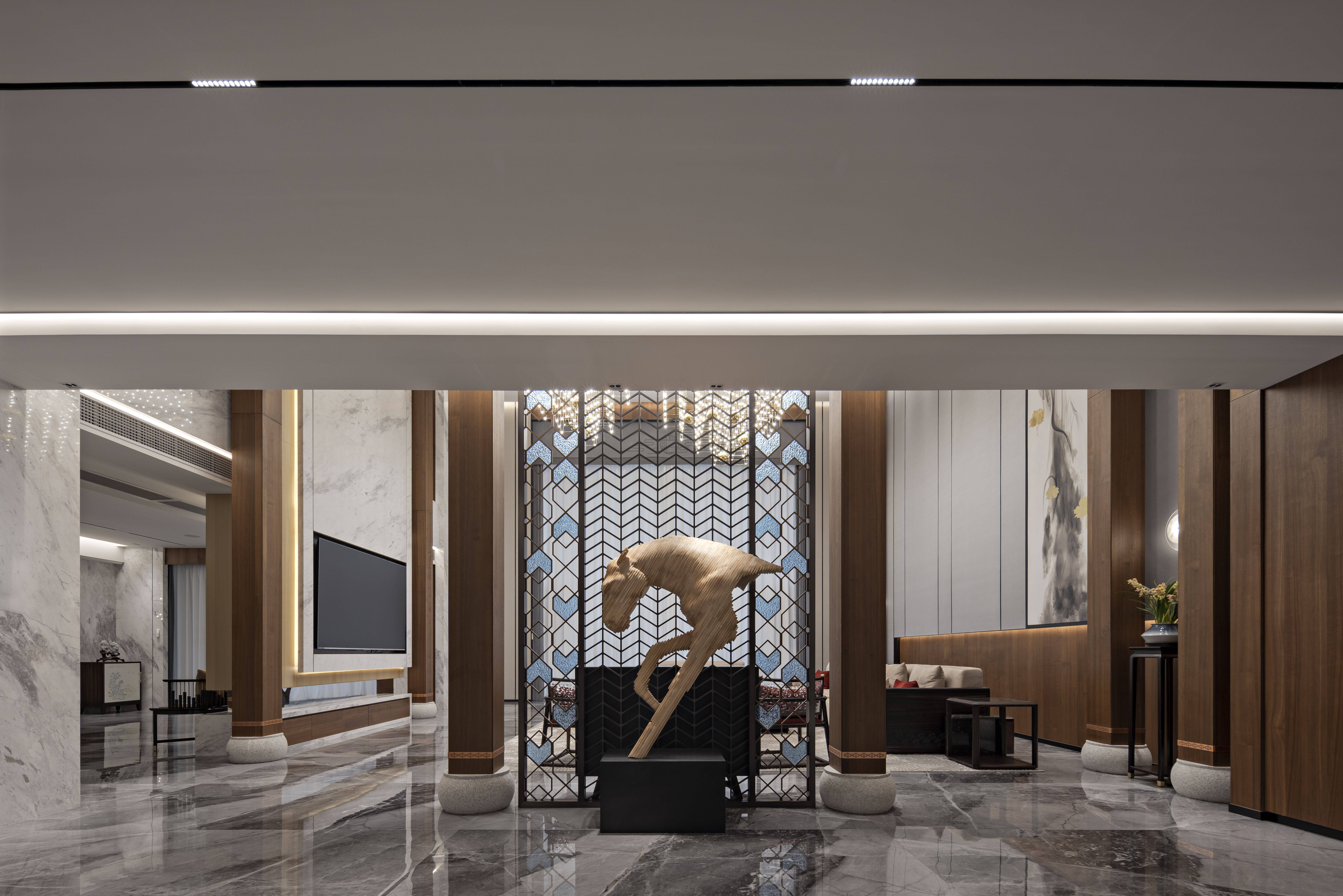 玄关为马,一马当先 入门玄关处摆放“马”肖像,蕴有马到功成,招财生旺之意。 客厅与玄关之间的屏风运用雅黑钢与蓝色琉璃作细节处区分,大胆采用冷暖色调对比,形成动态感觉,打破入门处的寂静氛围,建立出人物与空间的关联、交融与共情。