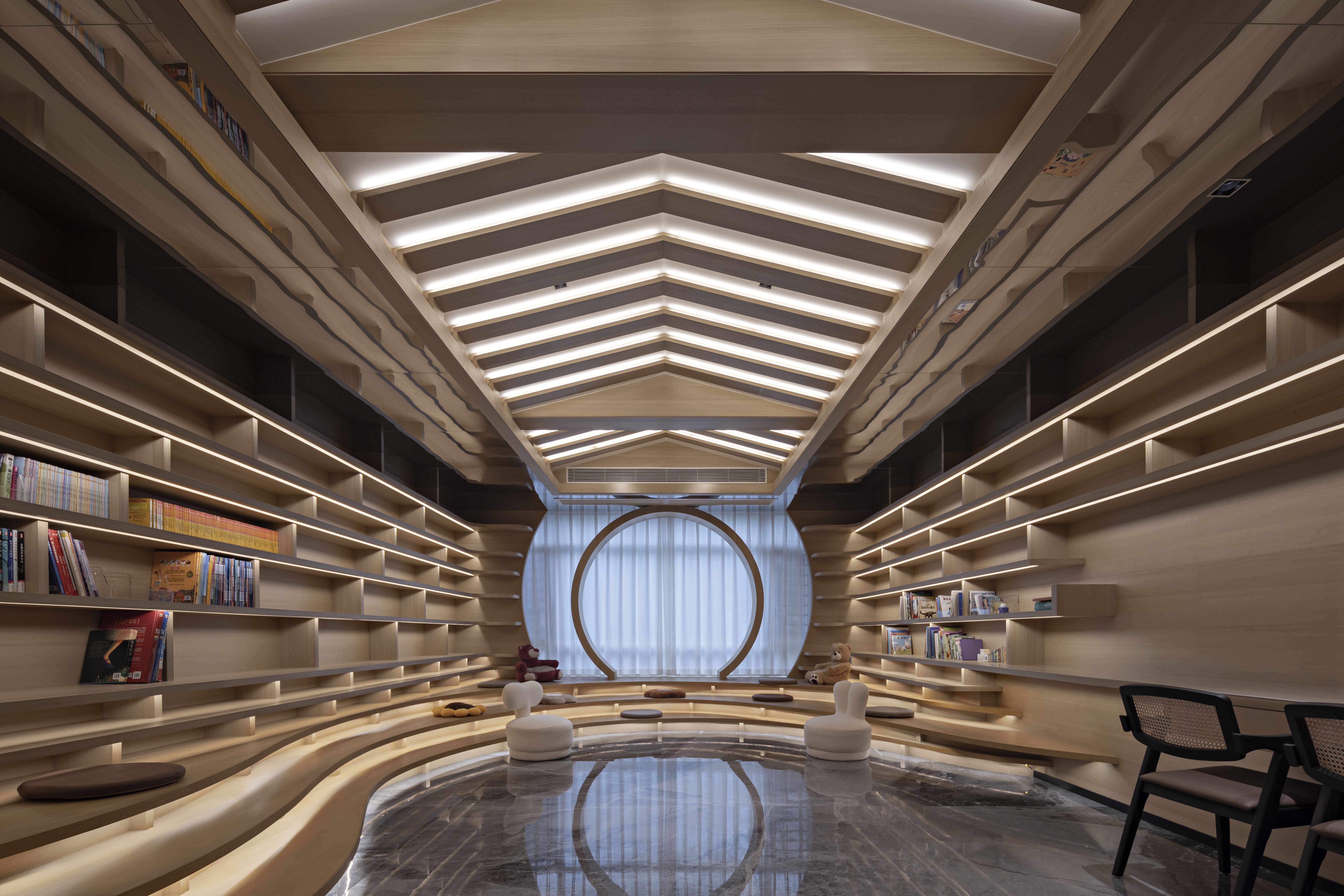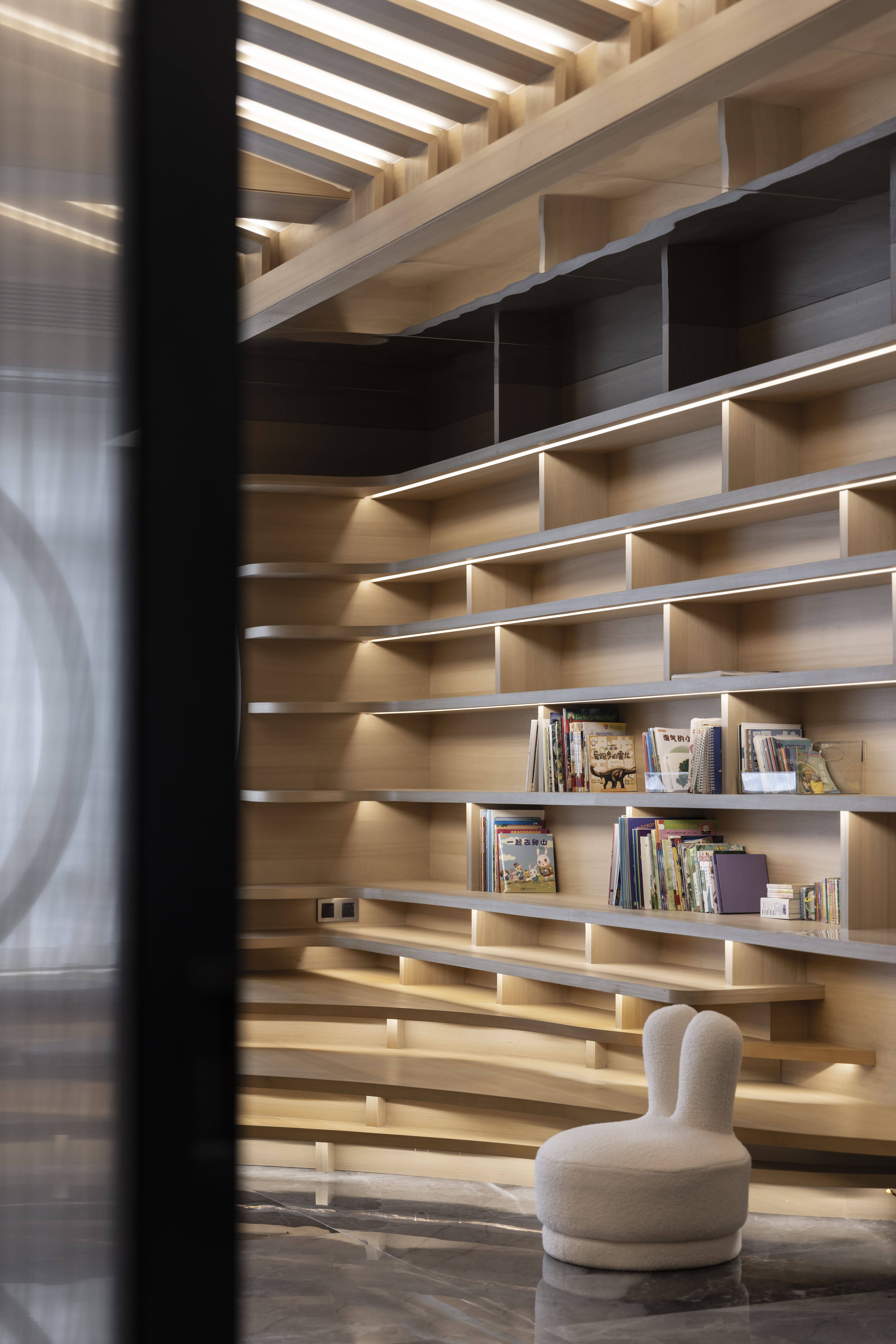 品百态,悦享人生 小型图书馆采用木材与镜钢做结合,整个空间充满书香气息。设计灵感取自徽派古韵,进门映入眼帘的便是有着“通向成功大道”美好寓意的如意门,不仅具有极简徽派建筑的优雅,又为图书馆增添一处功能性的用途。顶部巧妙运用“瓦脊概念”化解横梁的厚重与无趣感,搭配曲线台阶设计,整体空间释放出放松、随心之感,同时台阶的错落也为书籍拿放提供了安全、便捷的实用性功能。