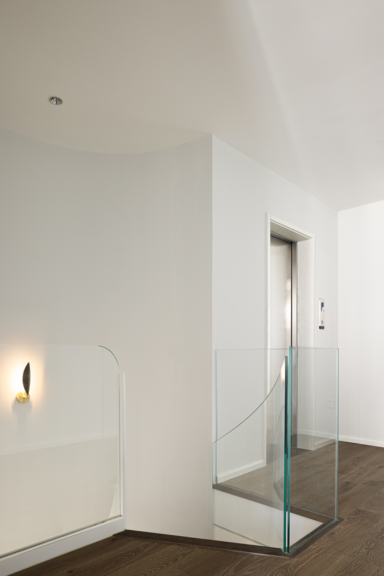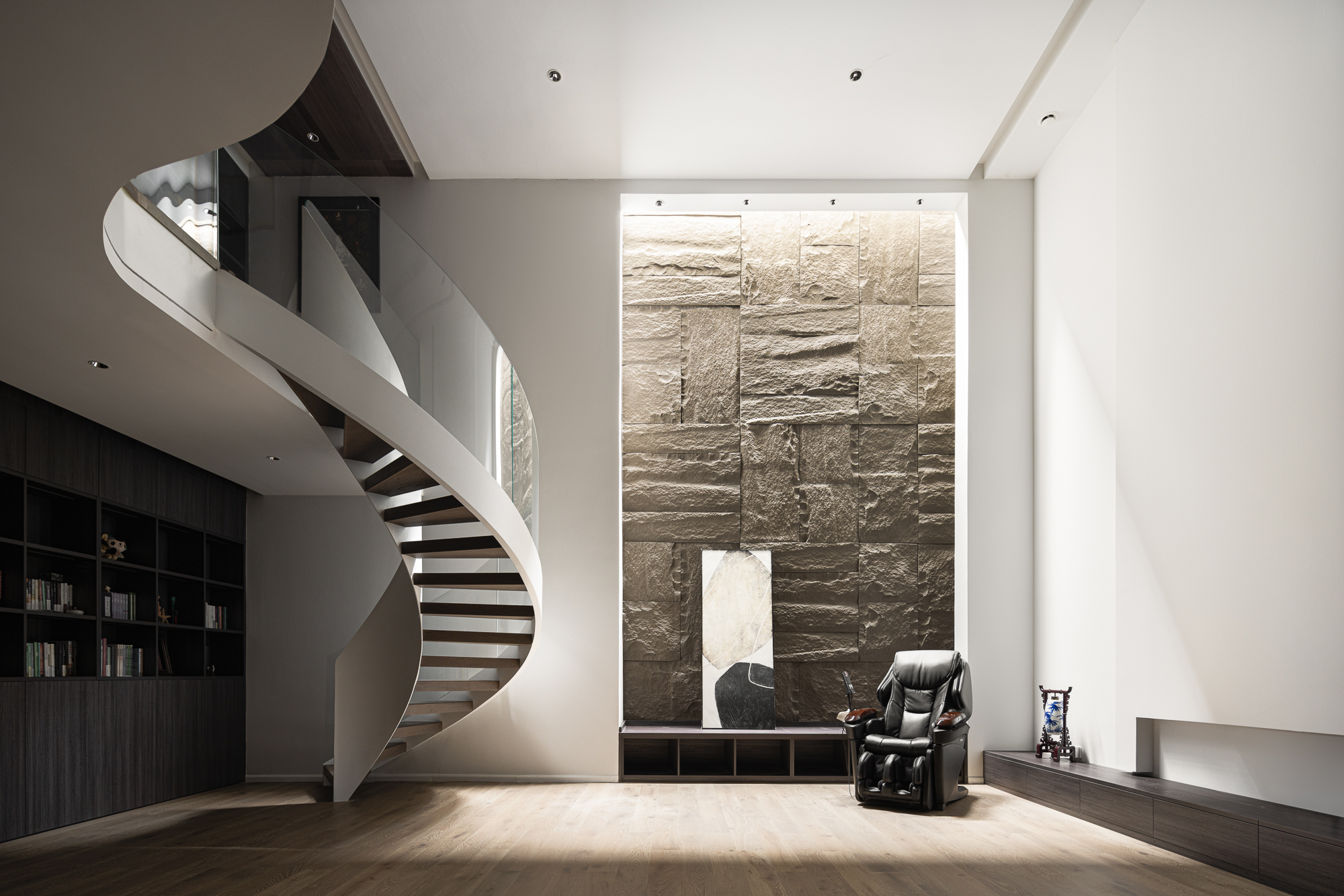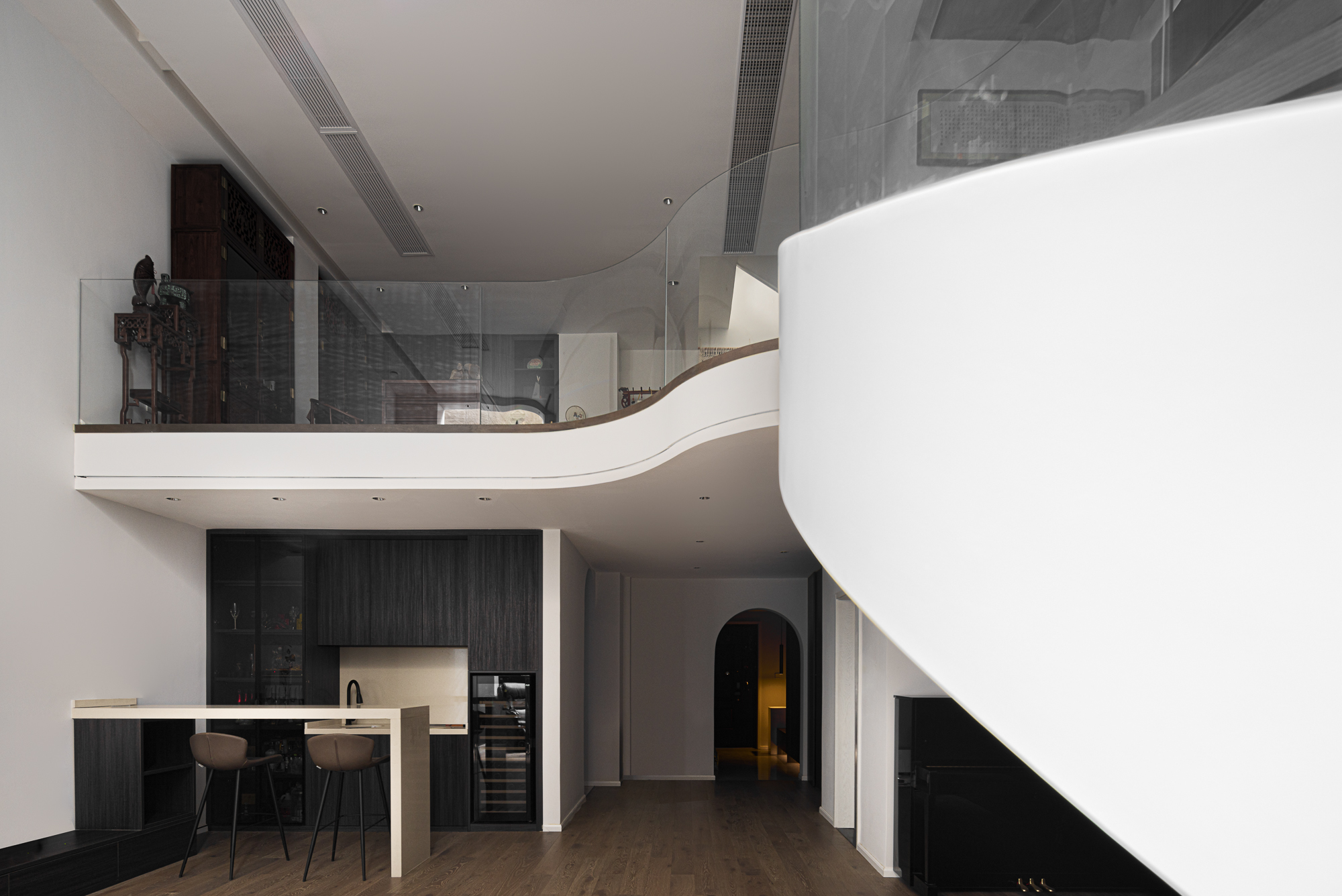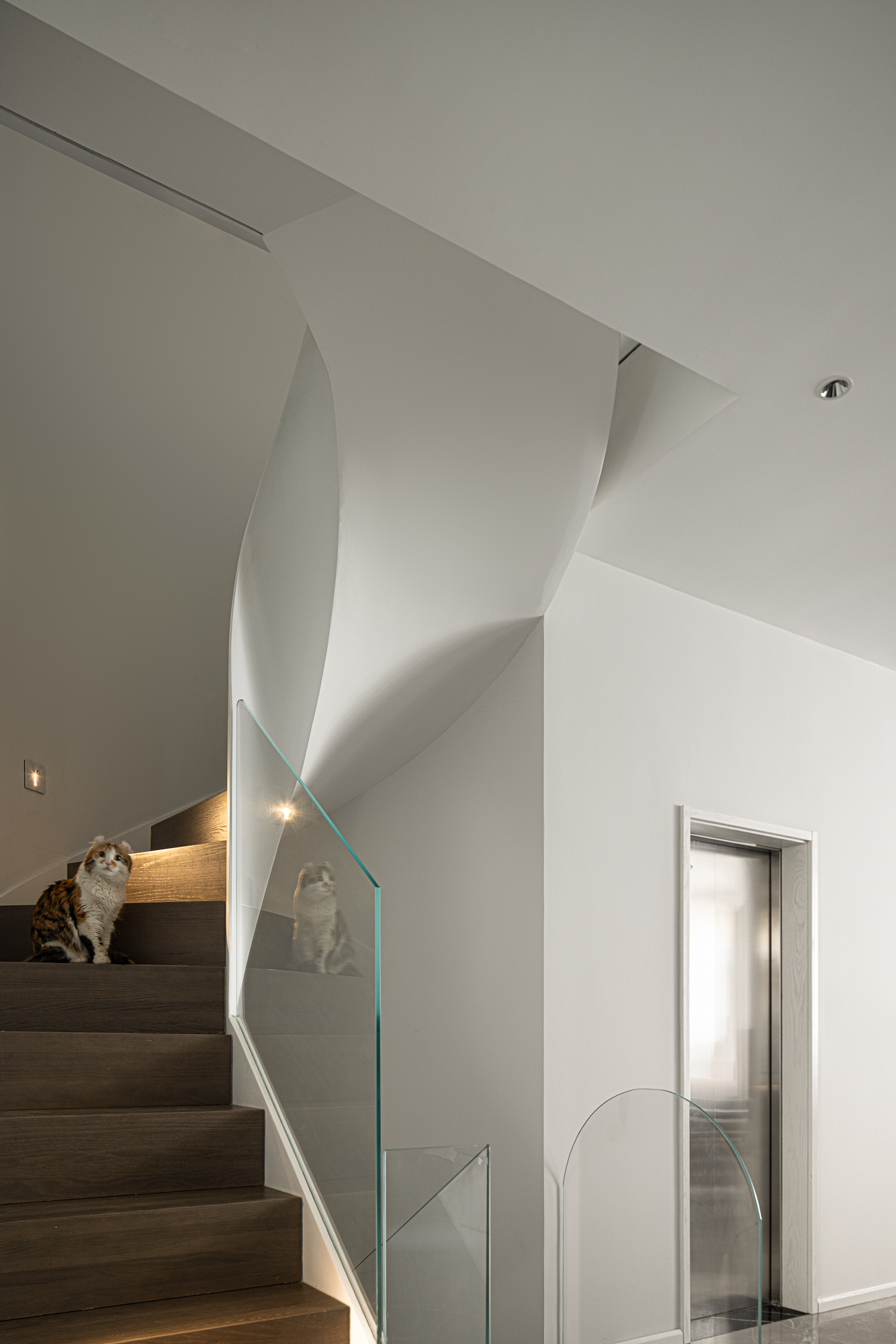 3.将整屋楼梯位移至走廊区,“腾出”面积增设电梯便利四层空间的上下楼梯,贯穿全屋以此做空间的造型,以建筑的手法结合弧形的结构,木质踏步与透明玻璃,旋转而上虚实之间,元素处处呼应丰富空间观赏性,或站立、或行走,视觉的停留点总会发现建筑感魅力。 -