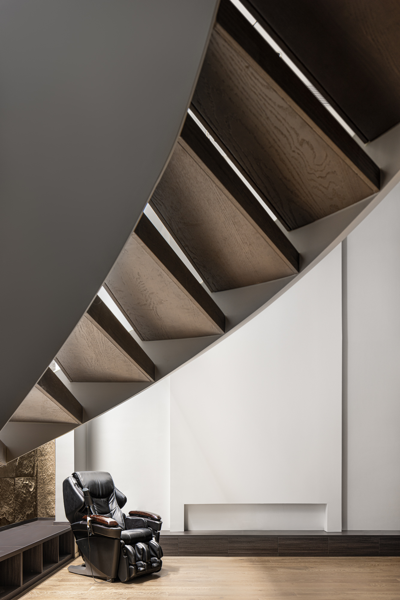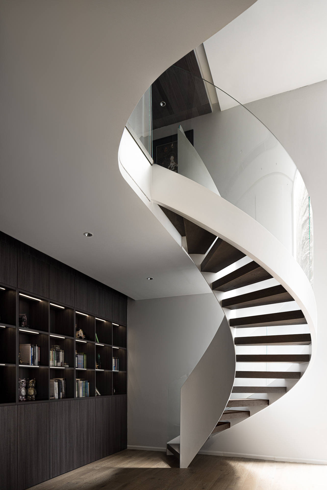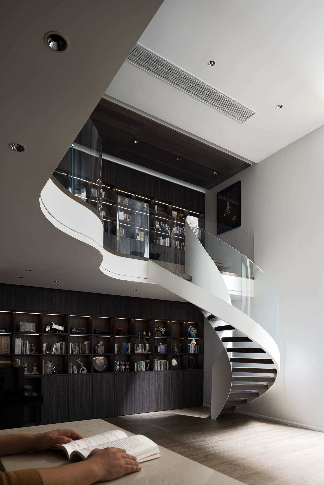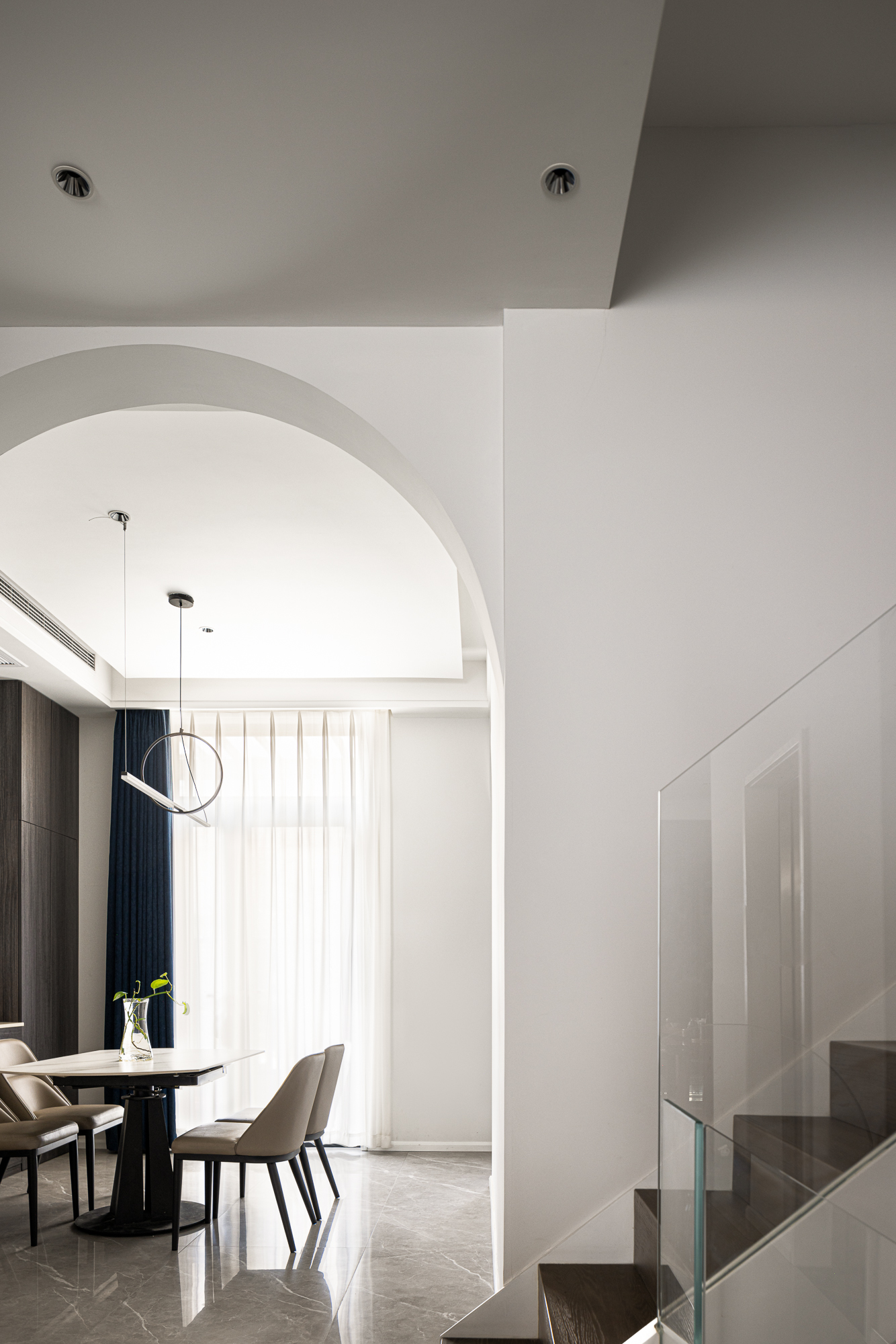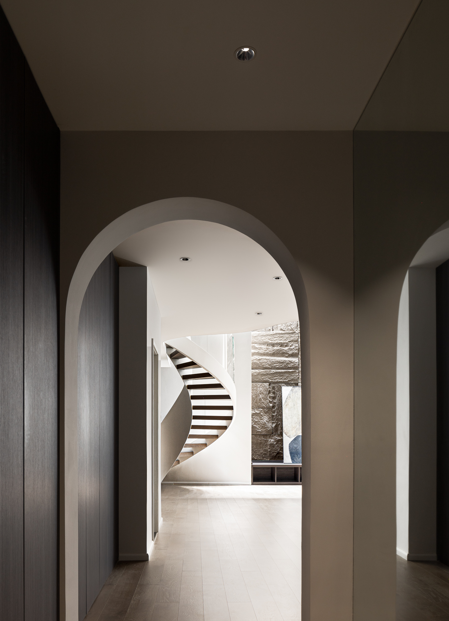 3.将整屋楼梯位移至走廊区,“腾出”面积增设电梯便利四层空间的上下楼梯,贯穿全屋以此做空间的造型,以建筑的手法结合弧形的结构,木质踏步与透明玻璃,旋转而上虚实之间,元素处处呼应丰富空间观赏性,或站立、或行走,视觉的停留点总会发现建筑感魅力。 -