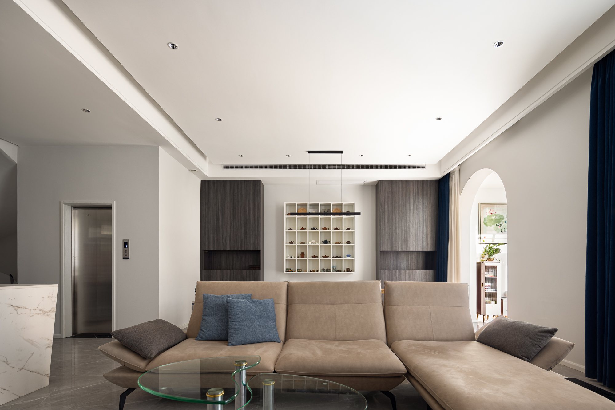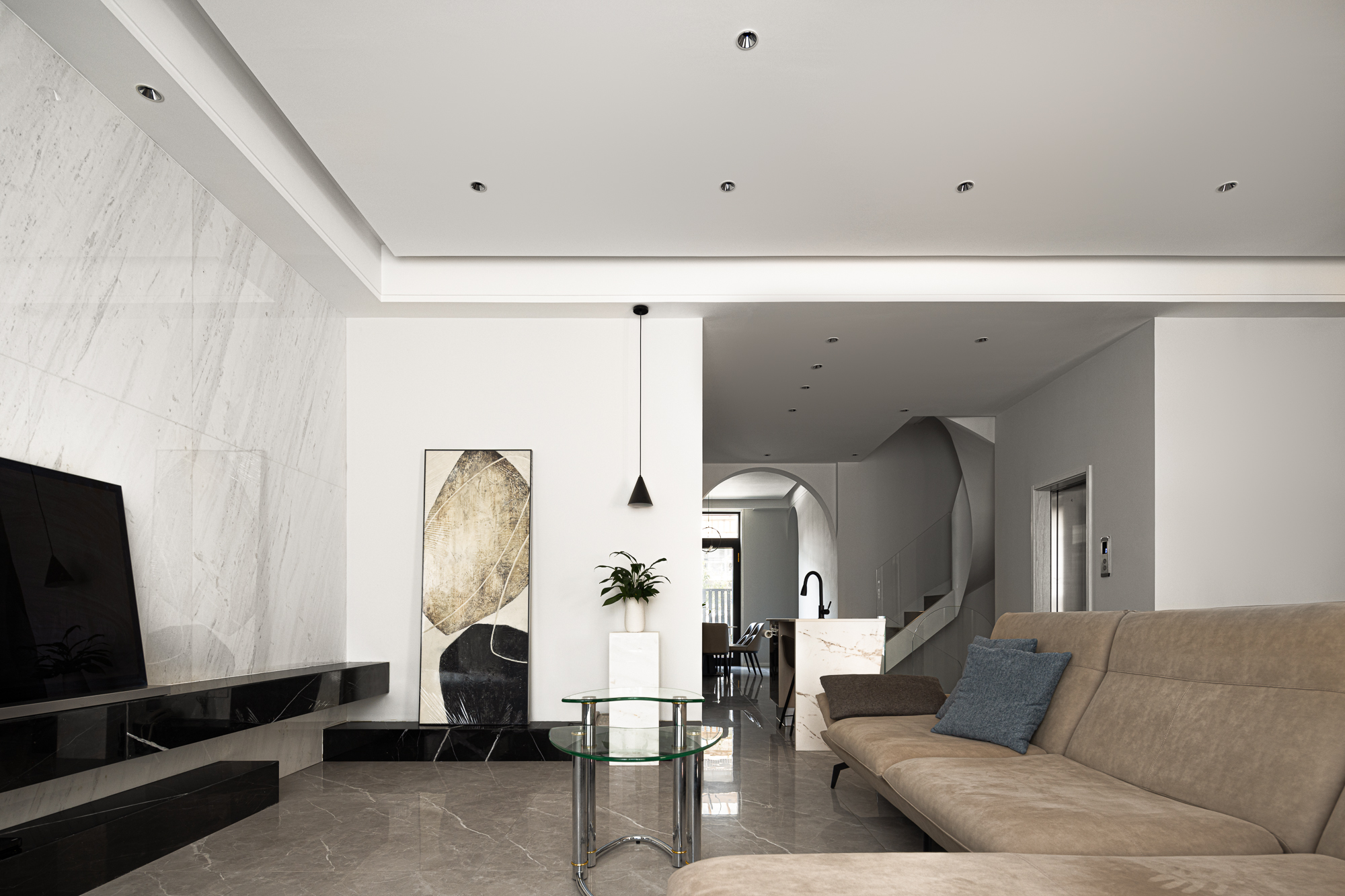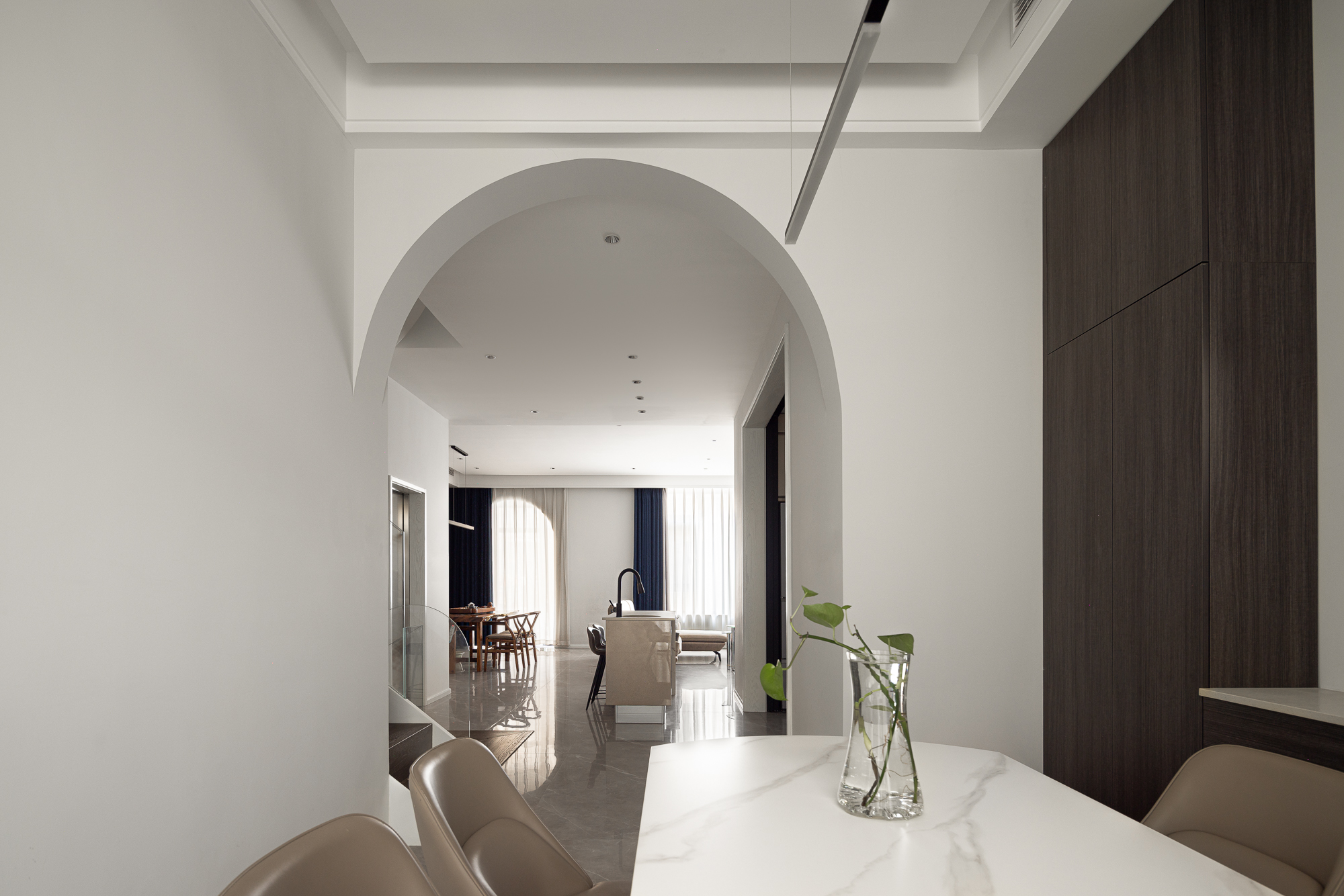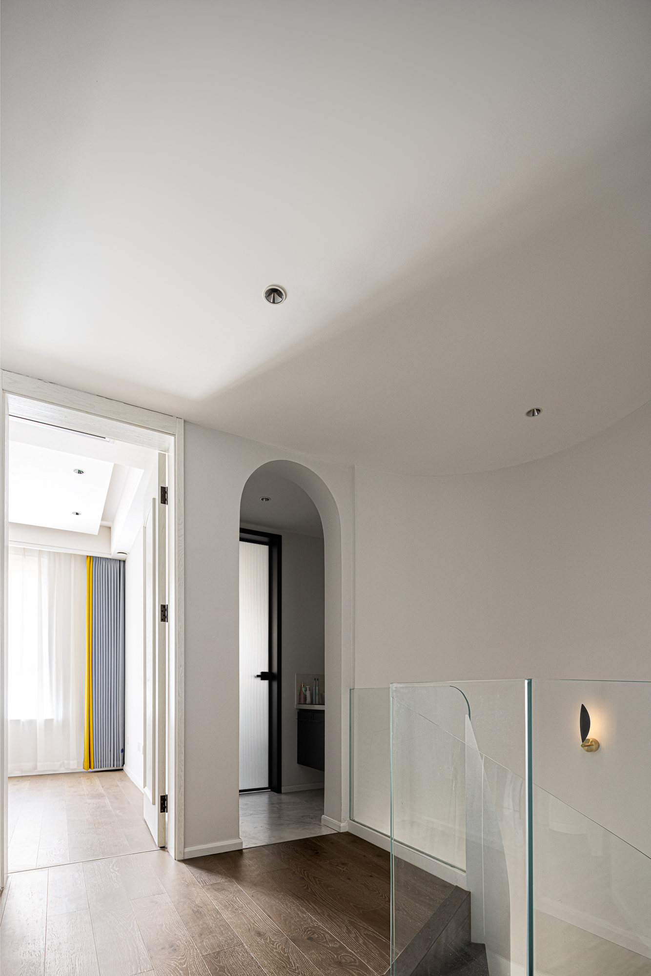 3.将整屋楼梯位移至走廊区,“腾出”面积增设电梯便利四层空间的上下楼梯,贯穿全屋以此做空间的造型,以建筑的手法结合弧形的结构,木质踏步与透明玻璃,旋转而上虚实之间,元素处处呼应丰富空间观赏性,或站立、或行走,视觉的停留点总会发现建筑感魅力。 -