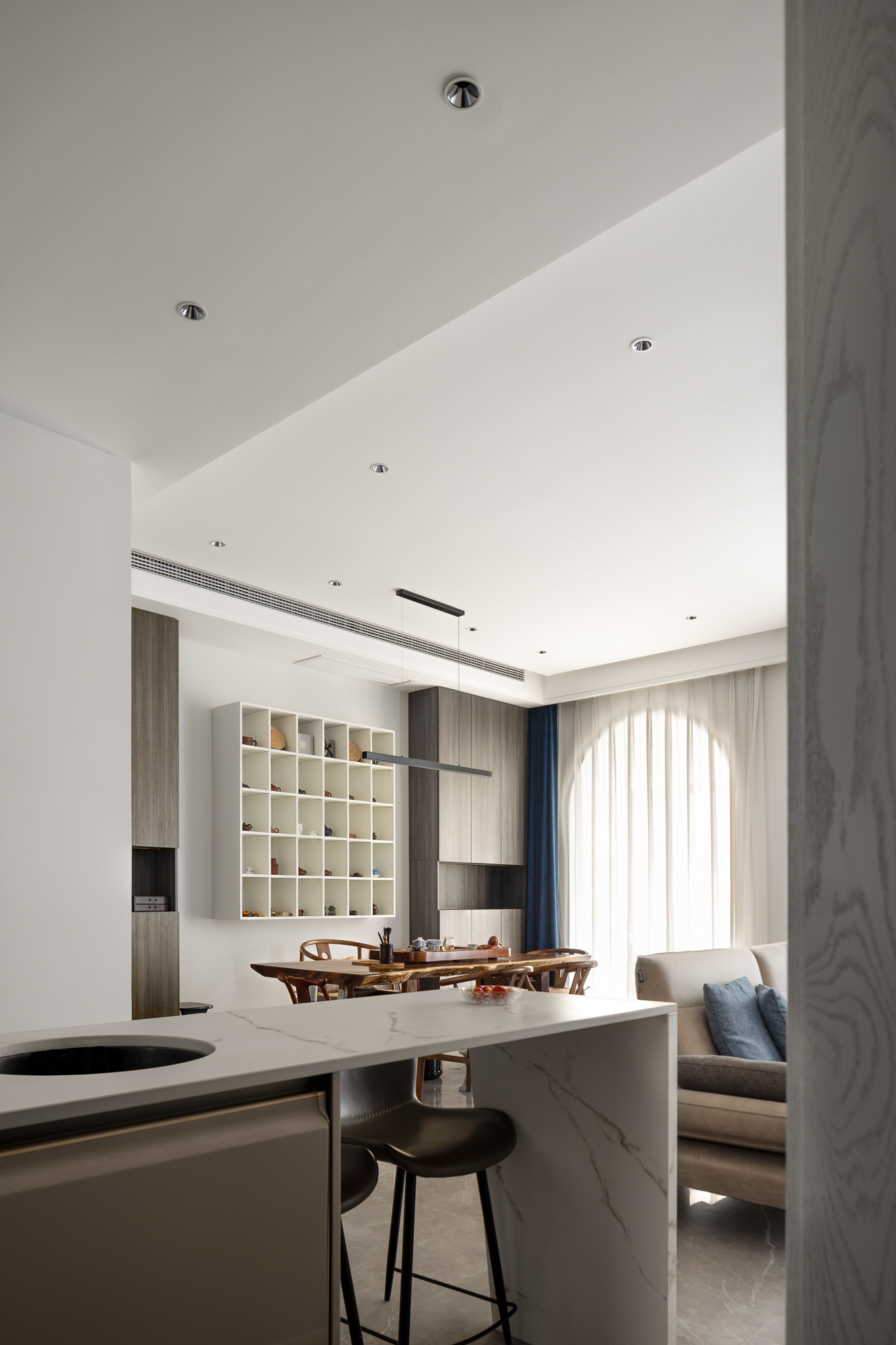 2.拆除原始长而狭小的厨房让客厅方正,客卫拆除让出面积给厨房与岛台,将一体化的思维切入实现化零为整餐厨一体,交往是空间性的,设计语言与元素亦在彼此交互,借助设计的表达,让人与空间自由对话。